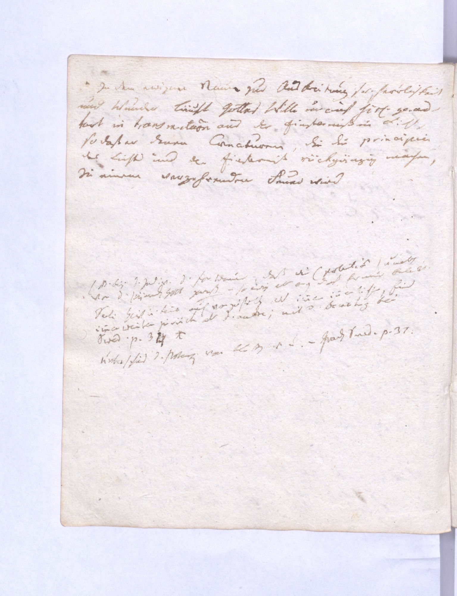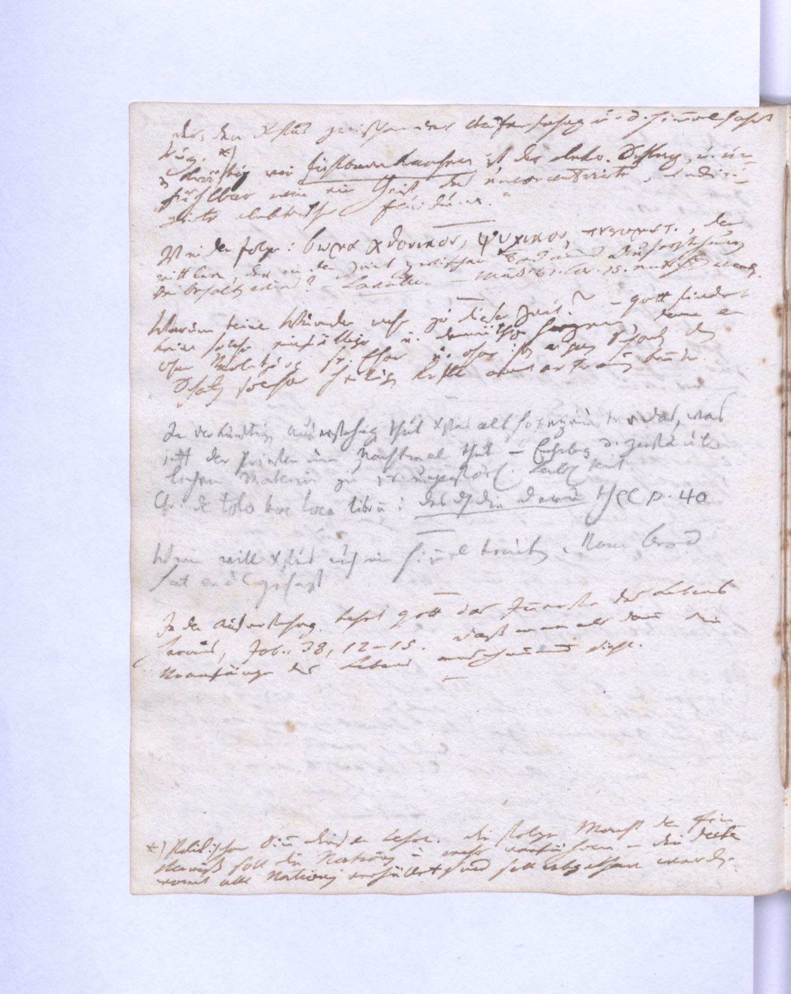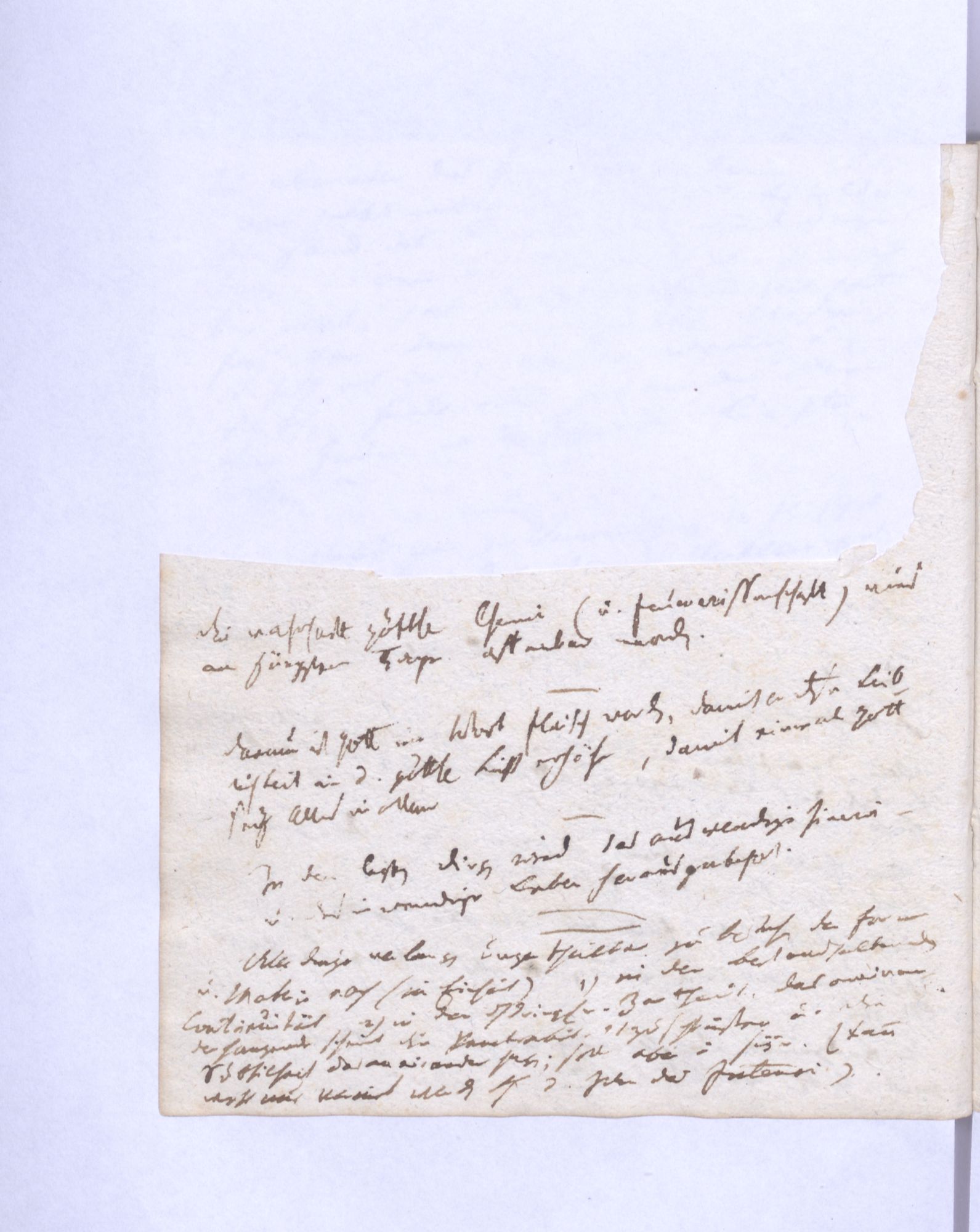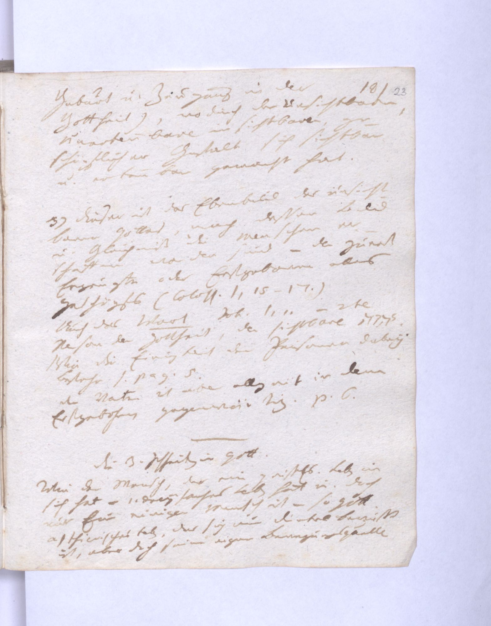 NB. Auch könnte Gott aus diesen drey verschiedenen Lebensquellen, die mit ihm gleich ewig und göttlich sind, ein mittleres gemildertes Lichtwesen, das von allen seinen Kräften theilnimmt, und weder Gott noch Geschöpf, sondern der Anfang des Geschöpfes ist, aussprechen – der Abglanz seiner Herrlichkeit das Ebenbild seines Wesens. Cfr. 1. Cor. 15, 47. 49.