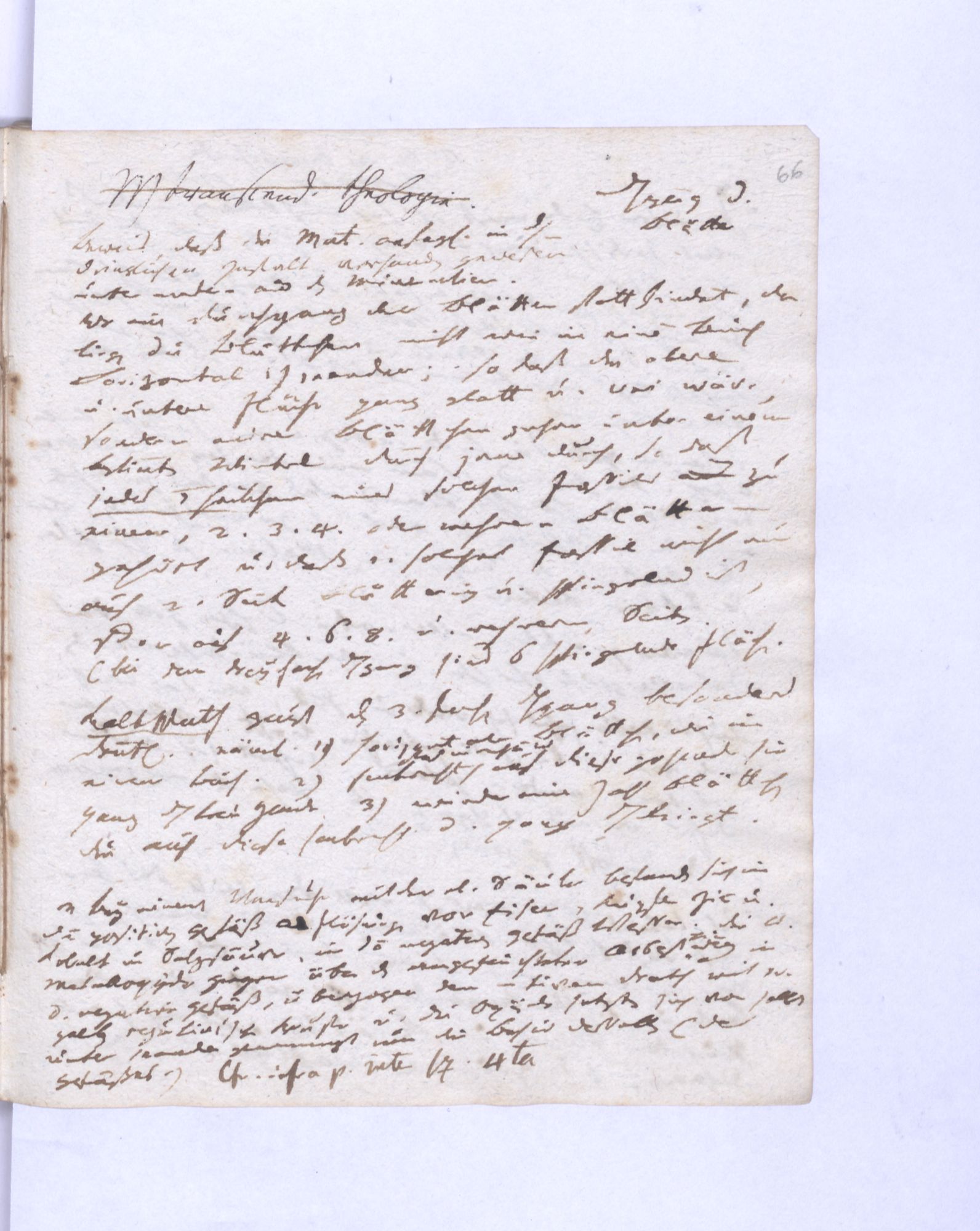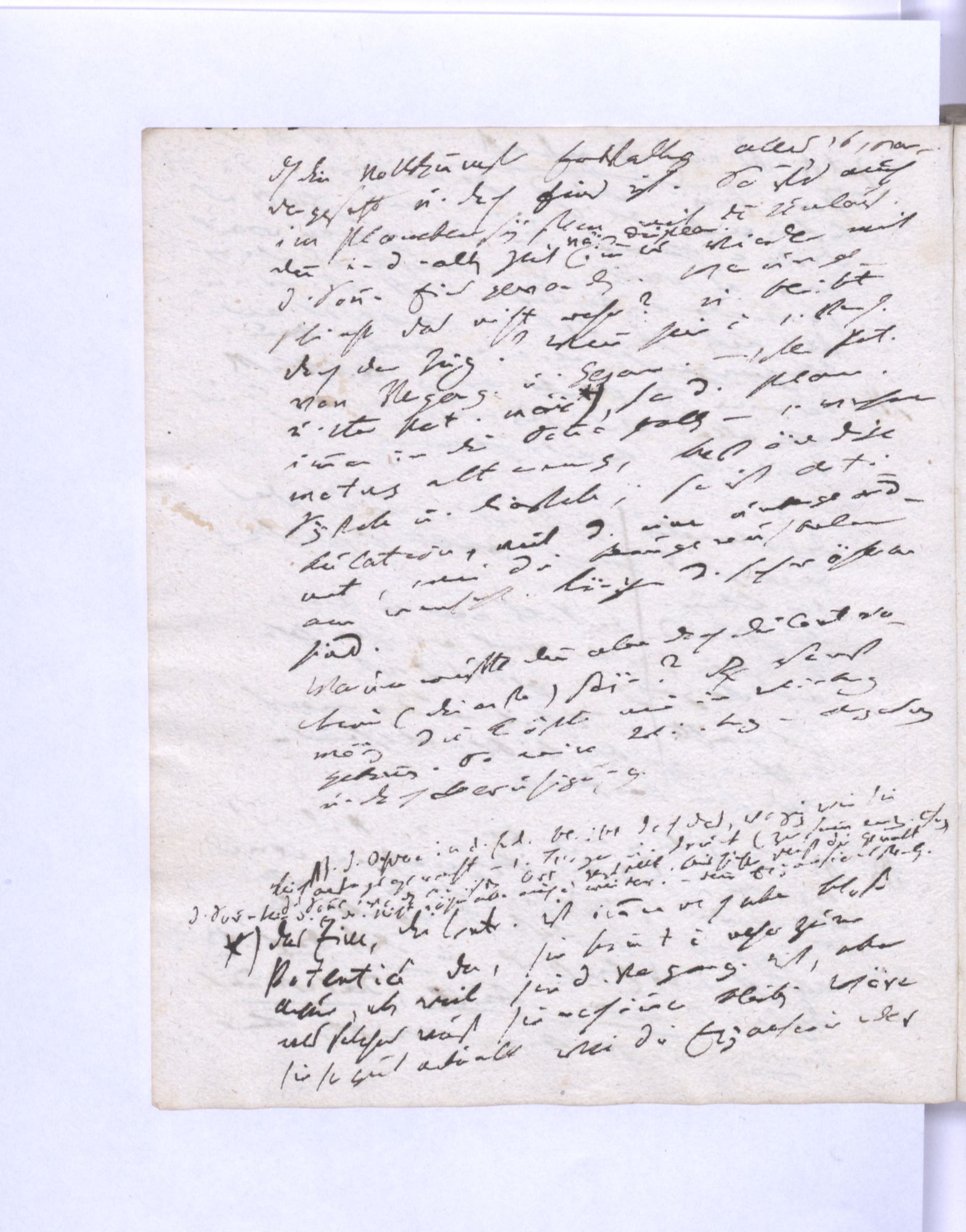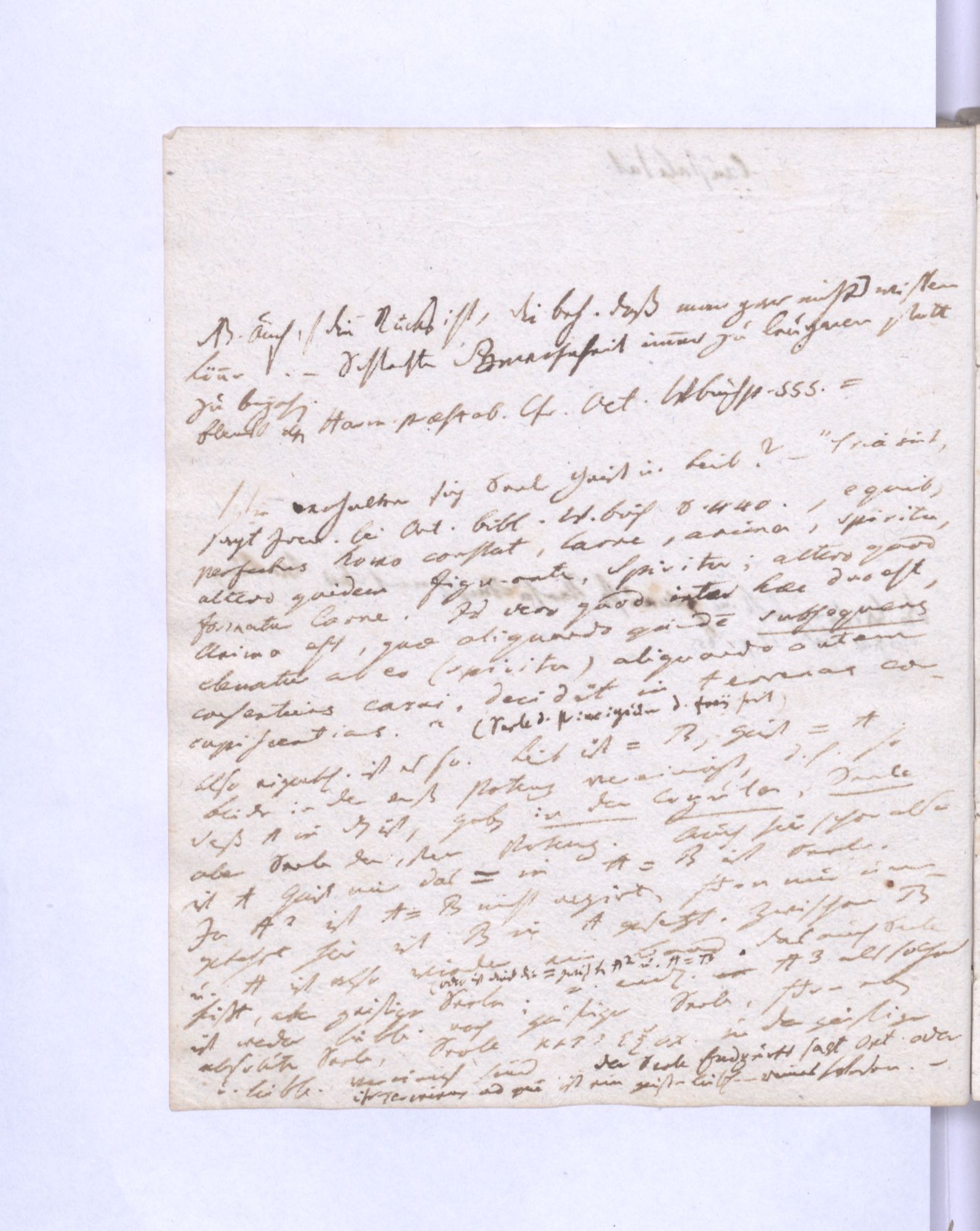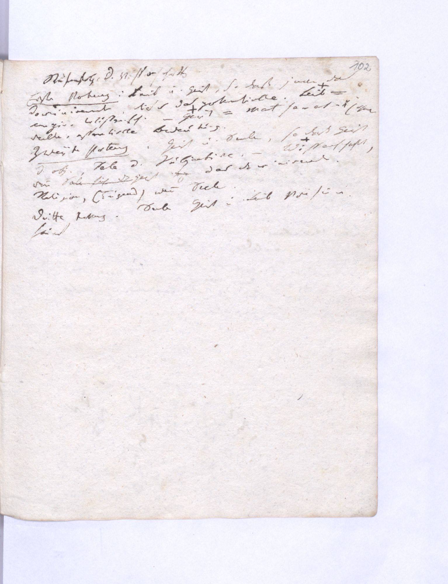 Erste Potenz: Leib und Geist, so daß jener das Dominirende, dieser das potentielle. Leib = empirische Wissensch˖[aft] – Geist = Mathematik (ohne reelle, essentielle Bedeutung.