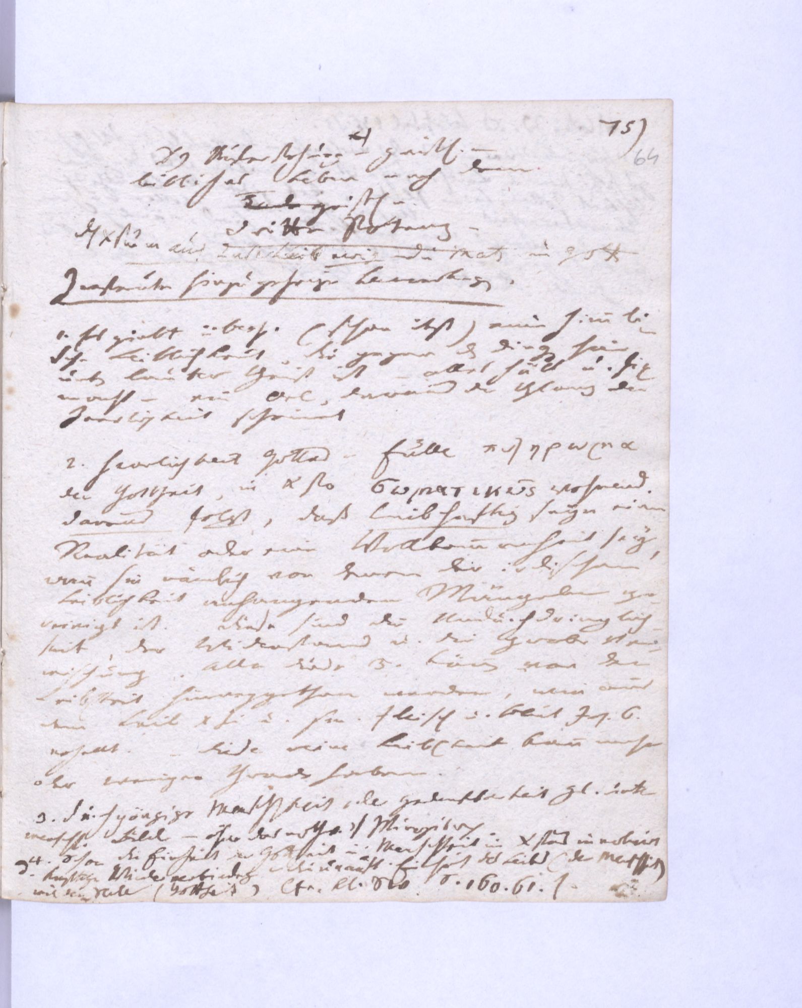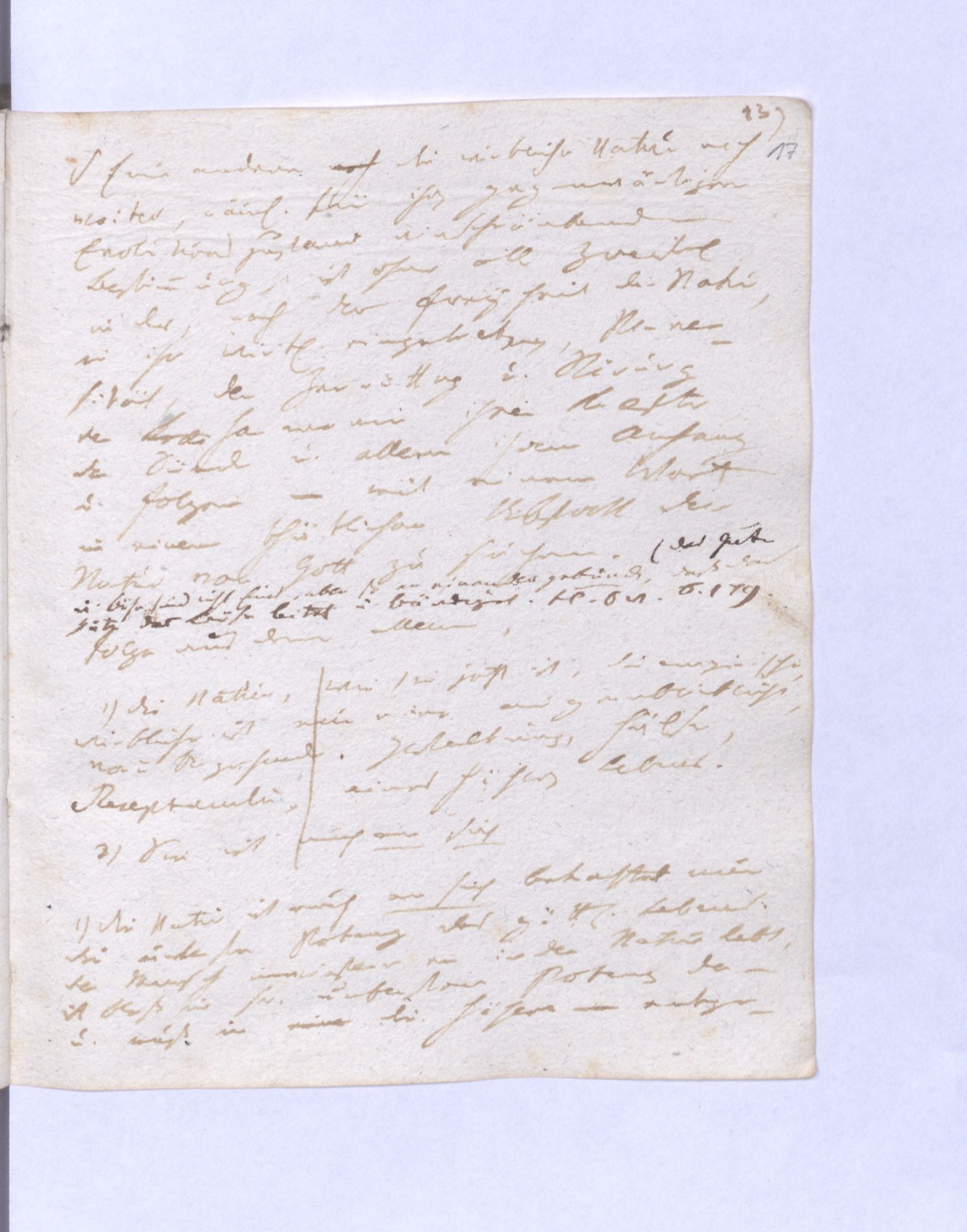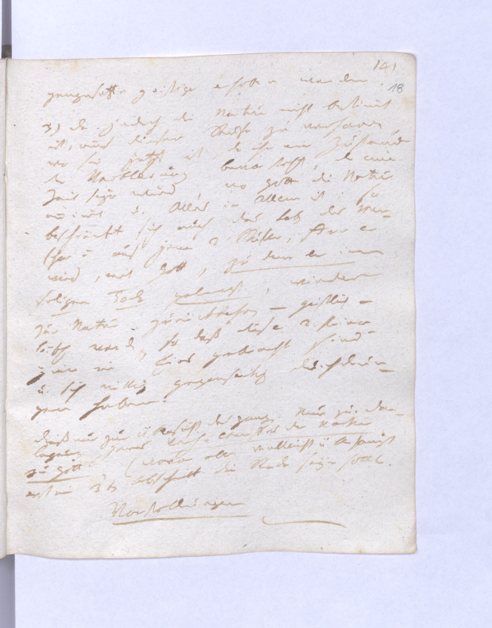 1) Die Natur ist auch an sich betrachtet nur die unterste Potenz des göttlichen Lebens. Der Mensch inwiefern er in der Natur lebt, ist bloß in seiner untersten Potenz da – und muß in die Höhere entge14)gengesetzte geistige erhoben werden.