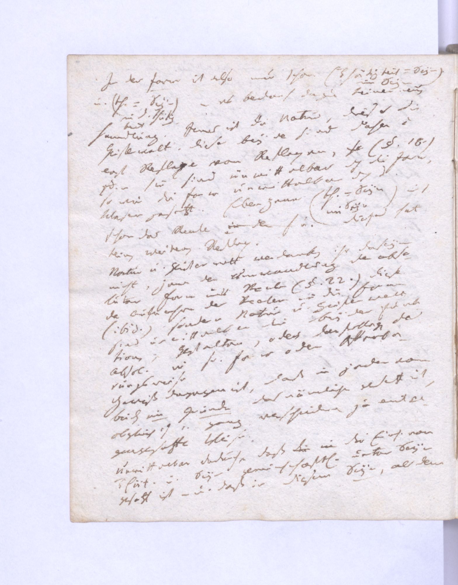In der Form ist also nun schon (Thätigkeit = Seyn im Seyn) und (Th˖[ätigkeit] = Seyn in der Thätigkeit) – es bedarf dazu keiner neuen Handlung. Jenes ist die Natur, dieses die Geisterwelt. Diese beyde sind daher nicht erst Reflexe von Reflexen, so (§.18.) sondern sie sind unmittelbar durch die Form, so wie die Form unmittelbar durch das Wesen gesetzt. Eben jene (Th˖[ätigkeit] = Seyn im Seyn) ist schon das Reale und dieses hat keinen weiteren Reflex.