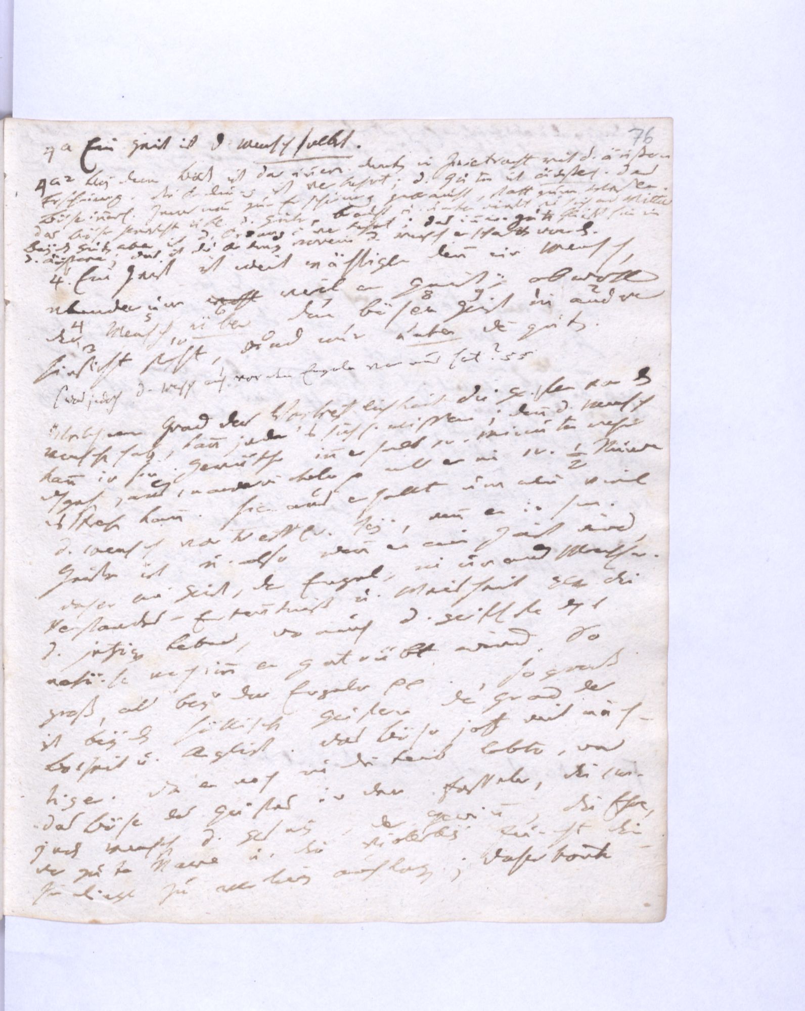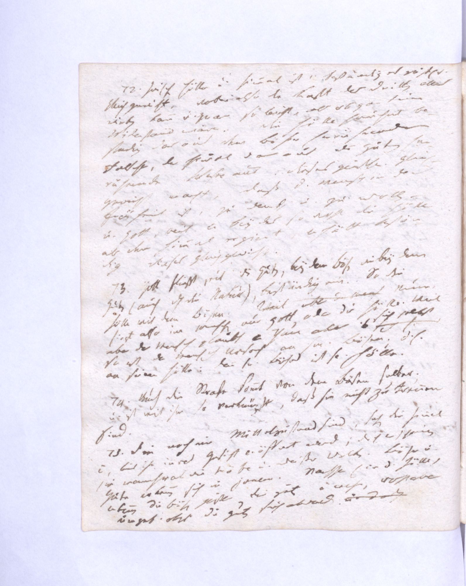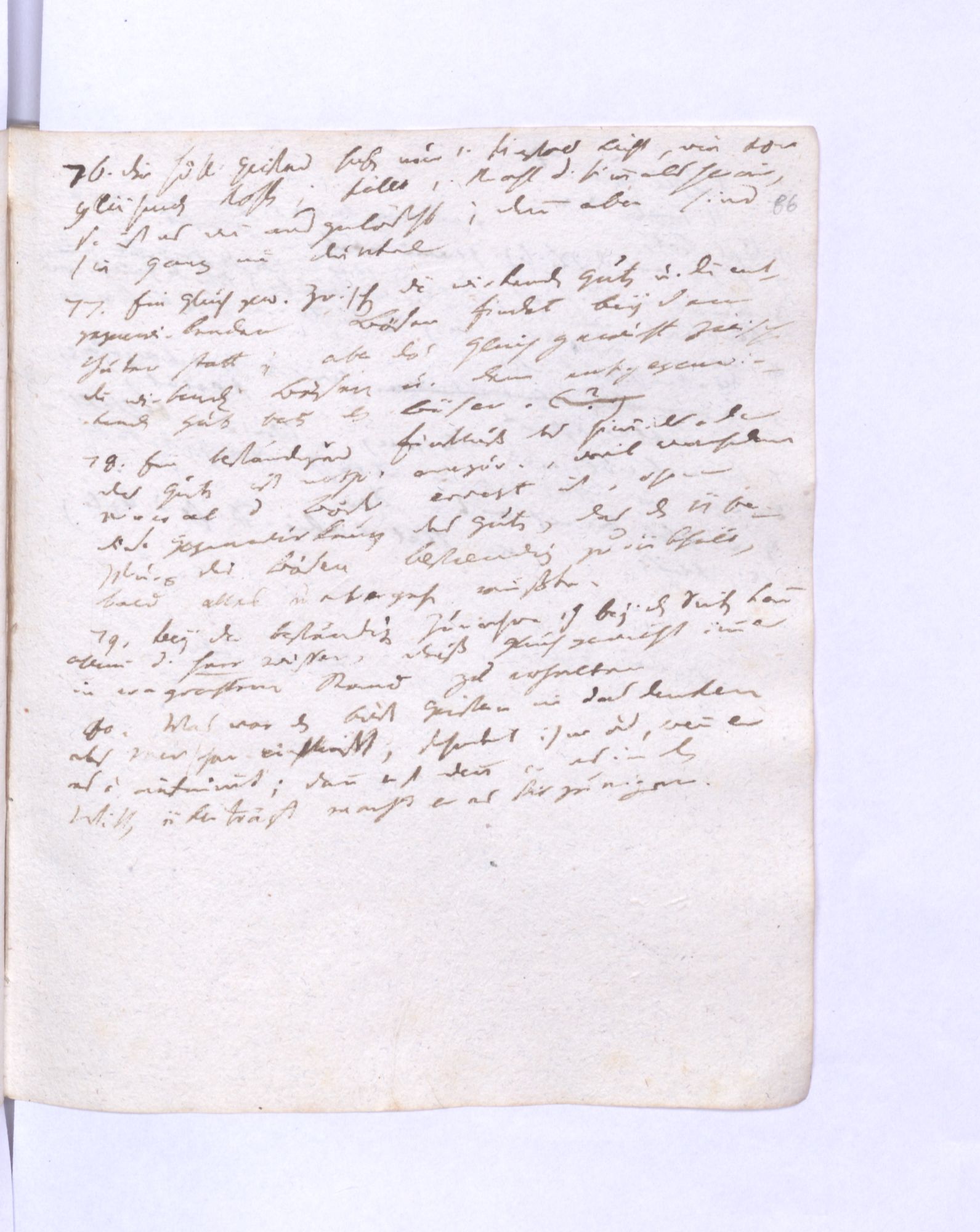 77. Ein Gleichgew˖[icht] zwischen dem wirkenden Guten und dem entgegenwirkenden Bösen findet bey den Guten statt; aber das Gleichgewicht zwischen dem wirkenden Bösen und dem entgegenwirkenden Guten bey den Bösen.