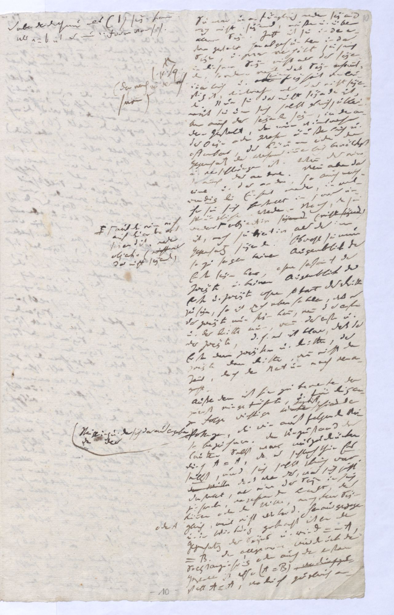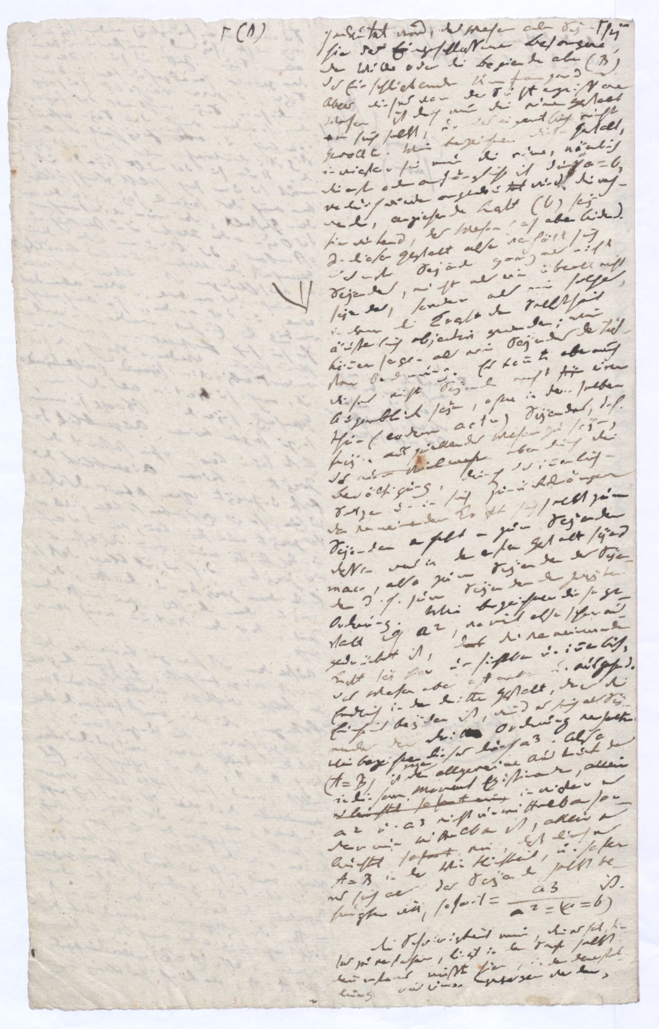 NB. Das bleibt auch bey der jetzigen Ansicht daß 1 oder A0=B erst bestimmt, was ist. Denn ist es –A0 so ist das Absolute ist A=B so dieß nicht. Also dieses das Wissen bestimmende – ihm nachgehen. Oder wir können nur in dem Verh˖[ältniß] wissen,