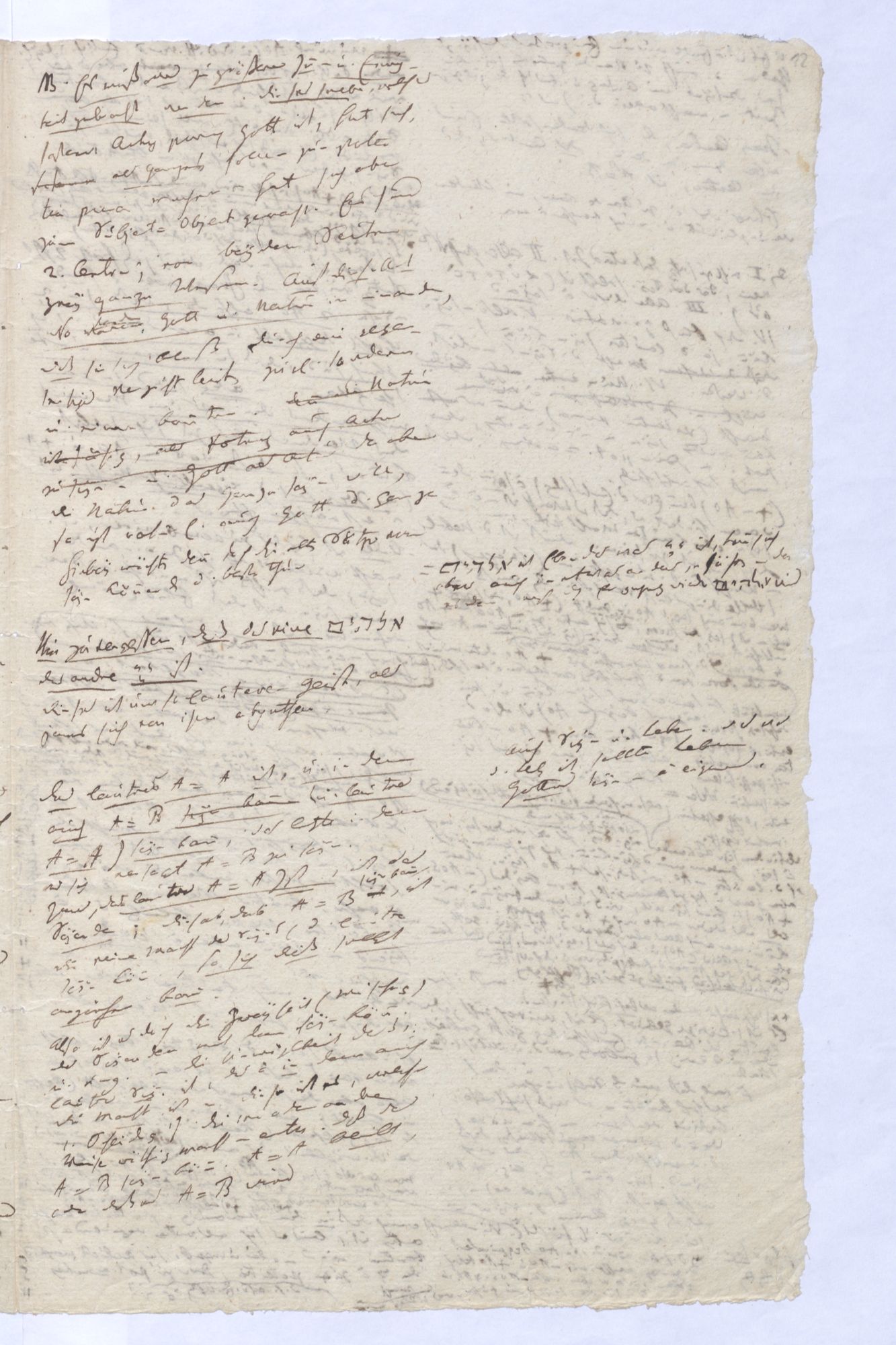 Nun entsteht die Frage, ob es diese Macht ist, um seyend zu seyn, oder eben nur um die Macht zu seyn. Es wurde oben gesagt, daß ihm eben die Macht das Seyn ist. In diesem ist es vollendet (absolut), dieses ist sein unbedingtes Seyn, vermöge dessen es eben das ist, dem nichts vorgeht. In diesem soll es also bleiben, und nicht ein anderes suchen. Denn lüstete es nach einem andern Seyn, so würde es die Macht, die ihm das Seyn ist und die es sich selbst zum Seyn rechnen soll, zum nicht Seyn machen, aus dem unbedingten (absoluten) Verhältniß, da die Macht (potentia) gleich dem Seyn (actui) ist würde nur Bedingtes (relatives), da die Macht nicht mehr das Seyn (A=A) sondern von dem Seyn verschieden (A=B) wäre. Offenbar also ist es die Macht zu seyn, an sich und um ihrer selbst willen, nicht um des seyend-Seyns willen; jenes ist das Wesentliche, dieses das Zufällige; es ist die Macht zu seyn aber als wär’ es sie nicht; es ist das lautre Seyn-Können, soll sich aber dieses nicht anziehen; sich nicht Etwas, nämlich ein vom Seyn verschiedenes Princip, daraus machen.