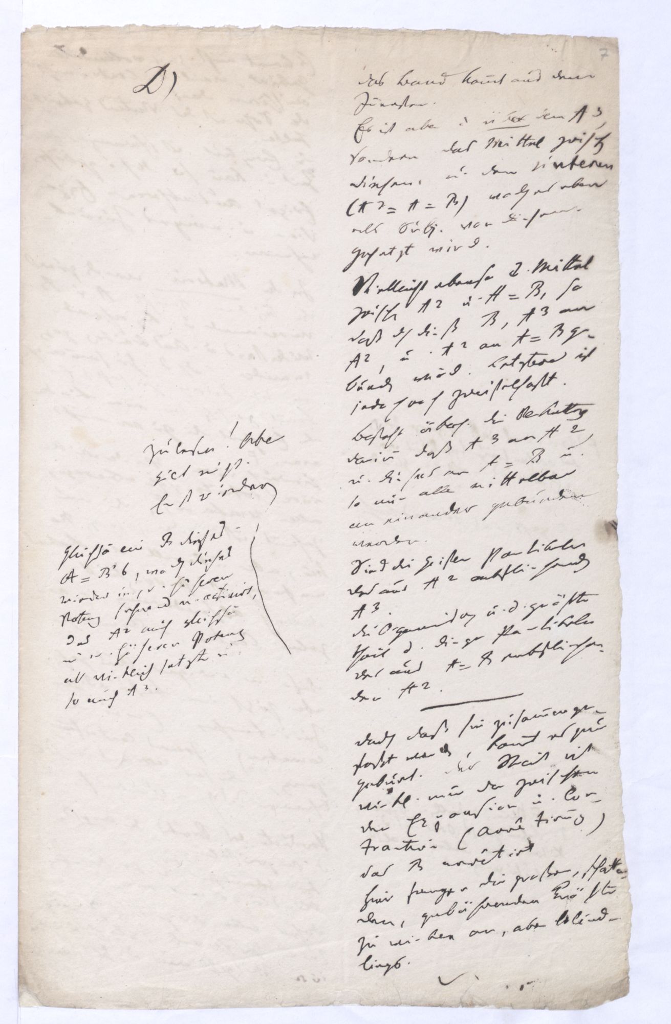 Da aber eine Progression vom Innerlichen in’s Äußerliche und wieder von diesem in’s Innerliche ist, wobey A3 als das Innerste erscheint, so eben jenes Aussprechende noch innerlicher als A3 noch tiefer drinn (nachher wieder in die Tiefe? nicht A3 scheidet sich aus als das allgemein Geistige von Gott (dem göttlichen Wesen) und endlich tritt an die Stelle da zuerst B war, der Geist (das aussprechende A3) das erst Äußerste wird das Innerste, das Innerste das Äußerlichste.