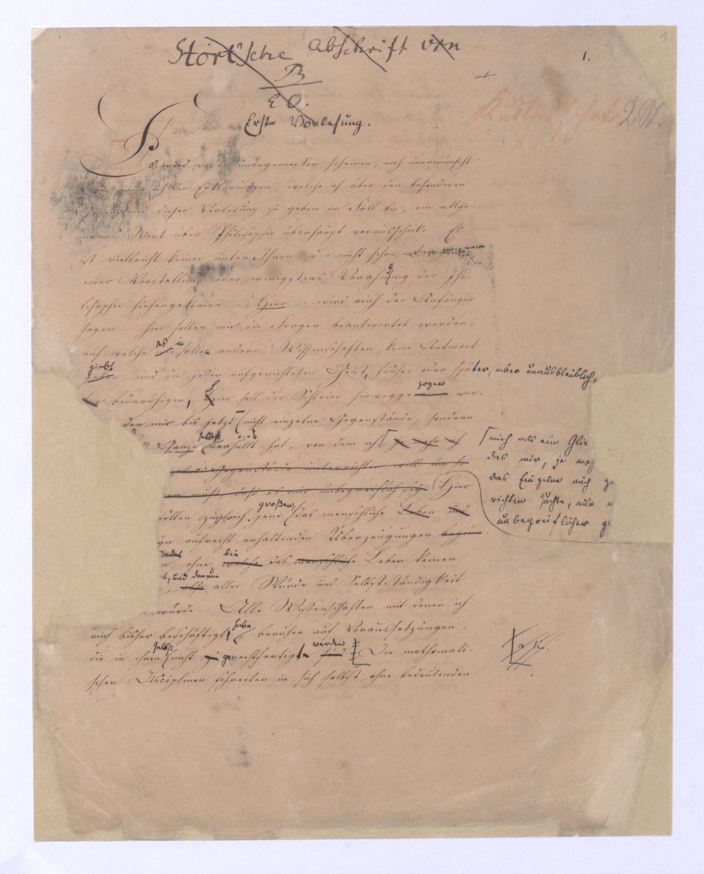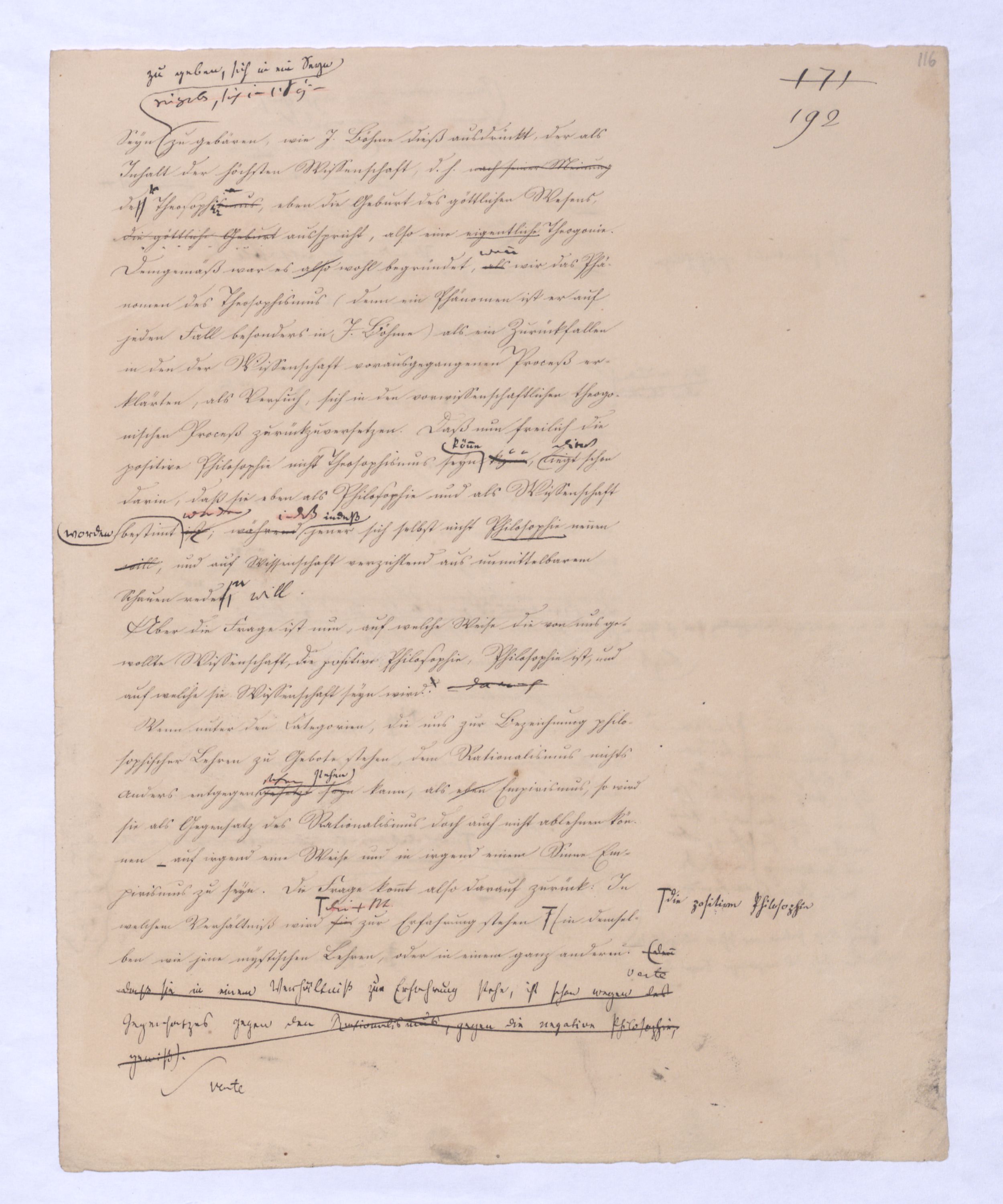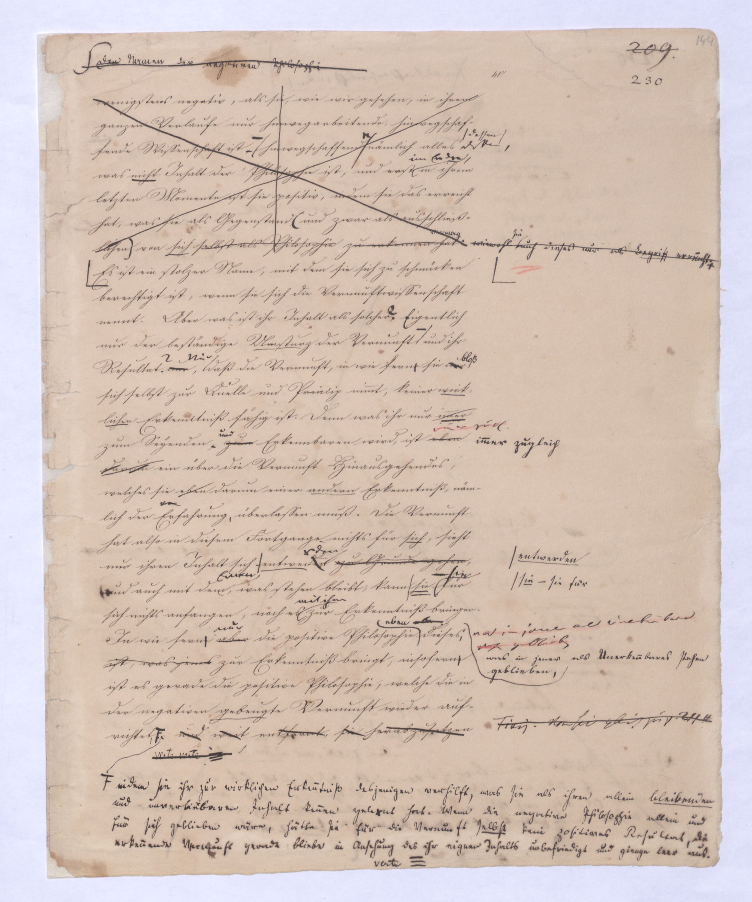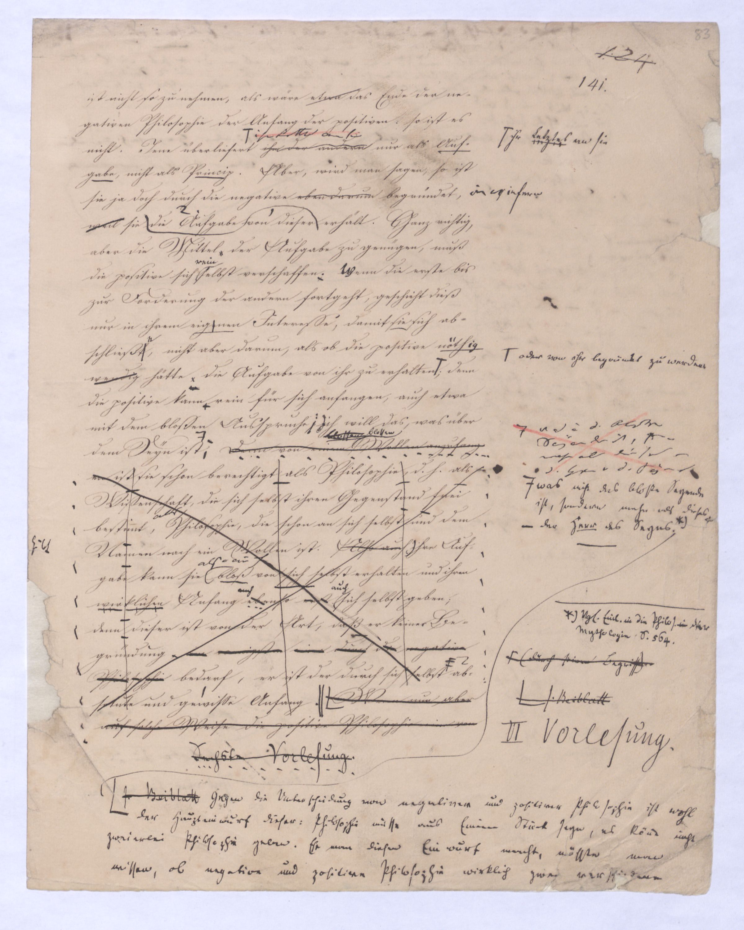 Es geschieht noch jetzt häufig, daßAls eine SinnesändernungWer die + Phil. als Forderung der (-) ansah hatte Recht hat man ferner die wenn er von positive zu sprechen Philosophie erklärt. Aber wenn Unwi Halbunterrichtete meinen, es soll an d. Stelle derich habe die frühere Philos. – die sog. Ident. Ph – als (-) erklärt, um die + an ihre Stelle zu setzen. Dieß wäre Da könnte man dann wohl auch von einer Sinnesänderung sprechen die Rede seyn. Wenn zu einer Sache zwei Elemente, a und b erforderlich sind, und ich befinde mich zunächsterst bloß im Besitze des einen, a, so wird dadurch, daß zu a bA B hinzutritt, a eigentlich nicht verändert, nur das wird verhindertverhindert nur wird daß ich glaube, durch a schon zu besitzen, oder erreichen zu können, was erst durch das Hinzukommen von b möglich ist. So verhält es sich mit der negativen und positiven Philosophie es ist keine Veränderung, die mit der ersten vorgeht, wenn die zweite zu ihr hinzugefügt wird, im Gegentheil wird sie dadurch erst in ihr wahres Wesen eingesetzt, daß sie nicht mehr versucht seyn kann, über ihre Gränzen auszuschweifen, d. h. selbst positiv zu seyn zu wollen. Es Schon bald nachdemist hierwird übrigens zur zu bemerkenzu meinen, daß man, wie ich Bekanntwerdung die Kantische Kr. d. r. V. durchgedrungen war, fing man anfing von einer krit. Philos. zu sprechen: Man fand doch daß eine Kritik d. r. V. noch bald aber fragte man sich auch ob denn nun diese krit. Ph. alles sey, was von Ph. übrig ob es außer dieser nichts mehr von Philos. gebe.seybleibe. So So kann ich nun wohl sagen, daß Was mich betrifft, so erlaube ich mir zu bemerken, daßmir bald nach vollendeten Studium der Kantischen Philosophie empfunden habemir ¿¿¿ einleuchtete, daß diese sogenannte kritische Philosophie unmöglich die ganze seyn könne, ich zweifele sogar, ob sie die eigentliche Philosophie seyn könne; in diesem Gefühle habtte ich schon 1795 in den Briefen über Dogmatismus und Critismus die im ersten Bande meiner Schriften wieder abgedruckt sind