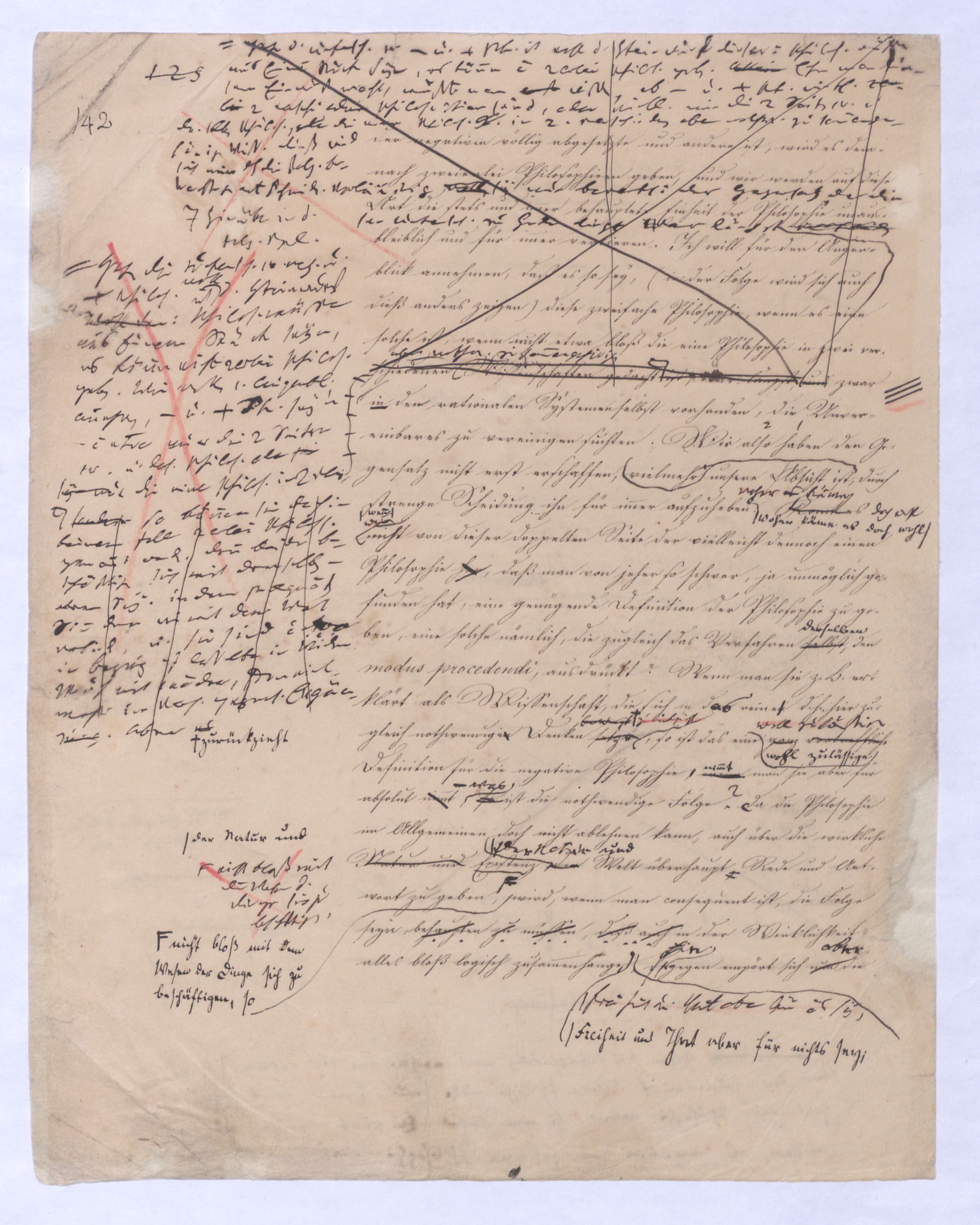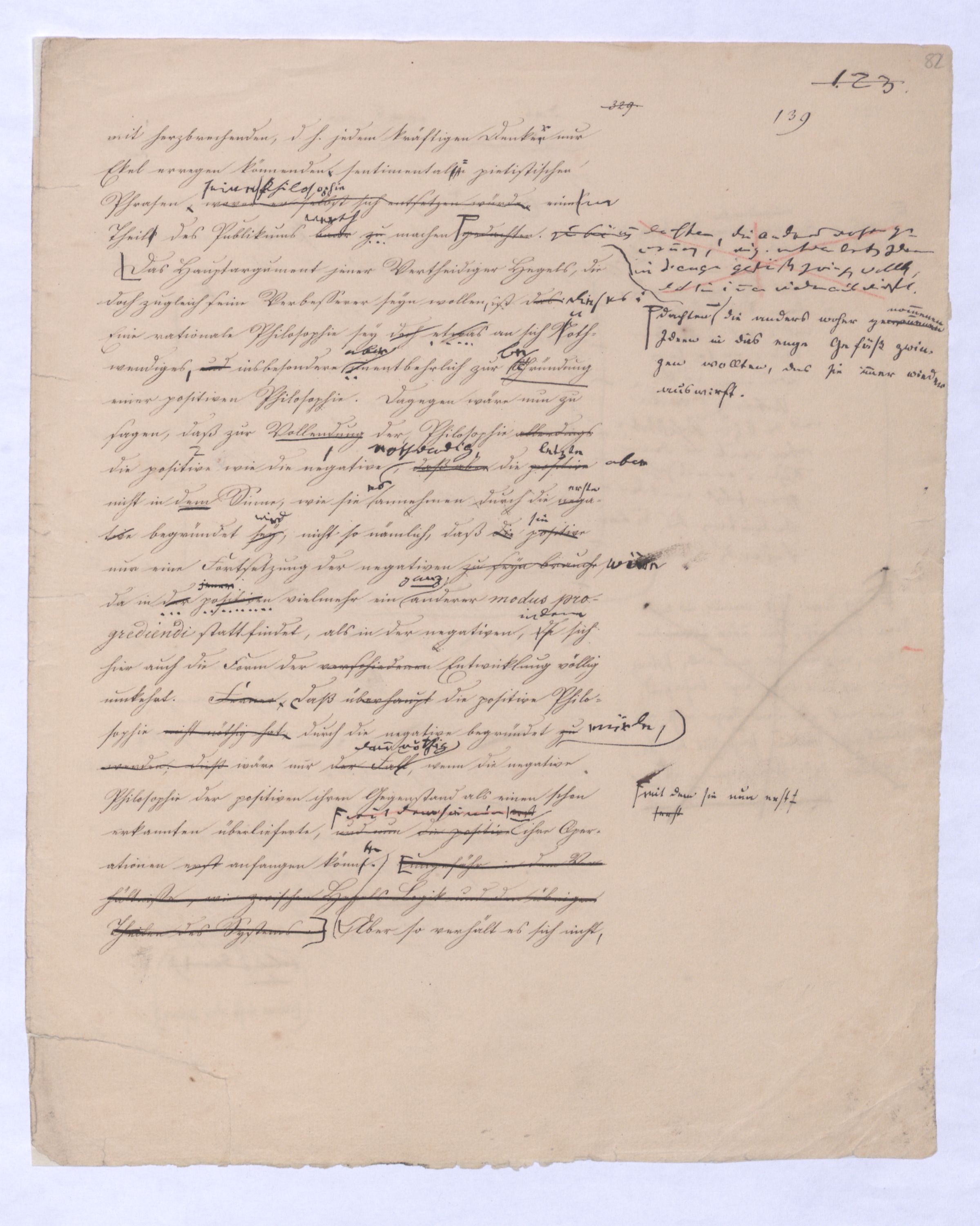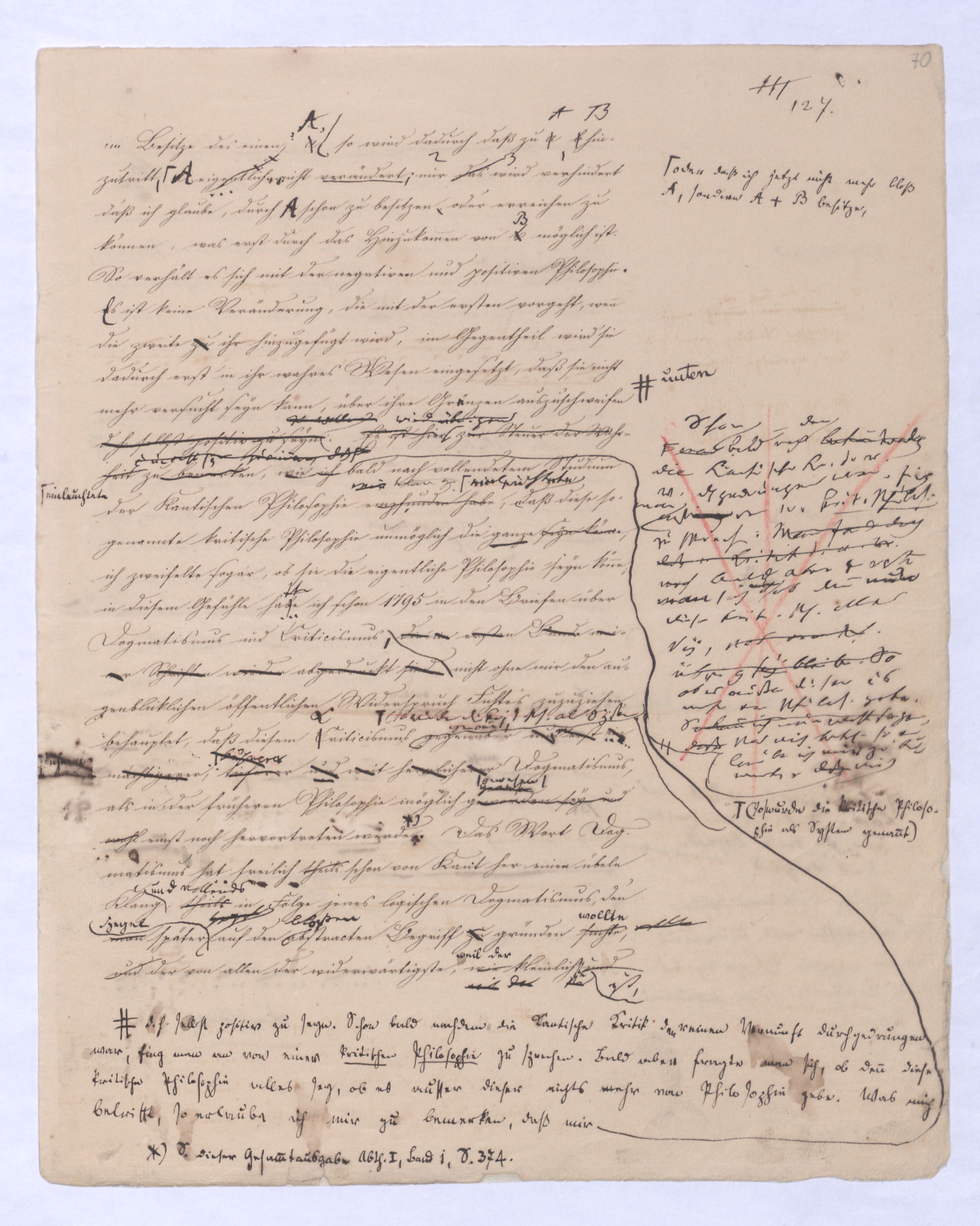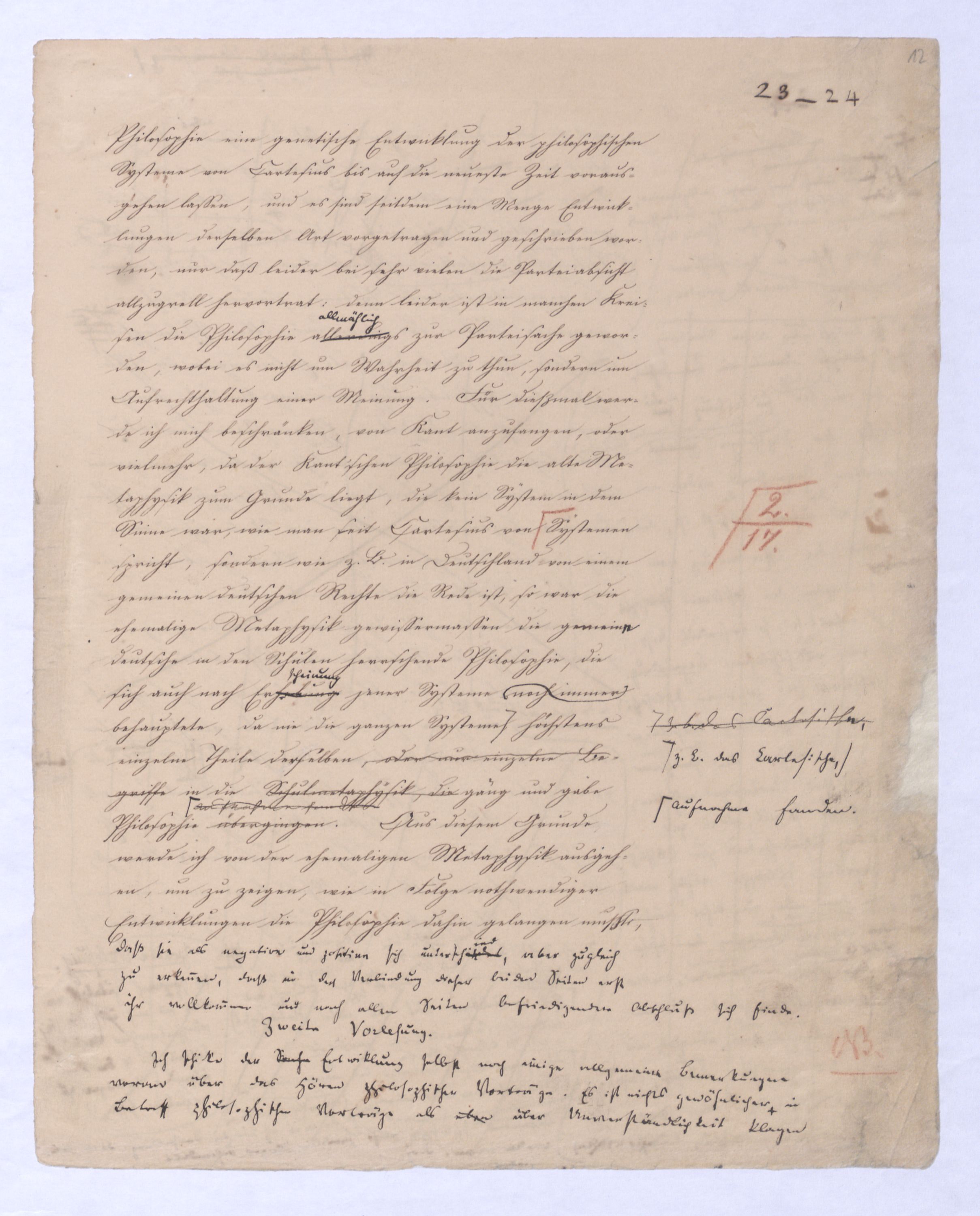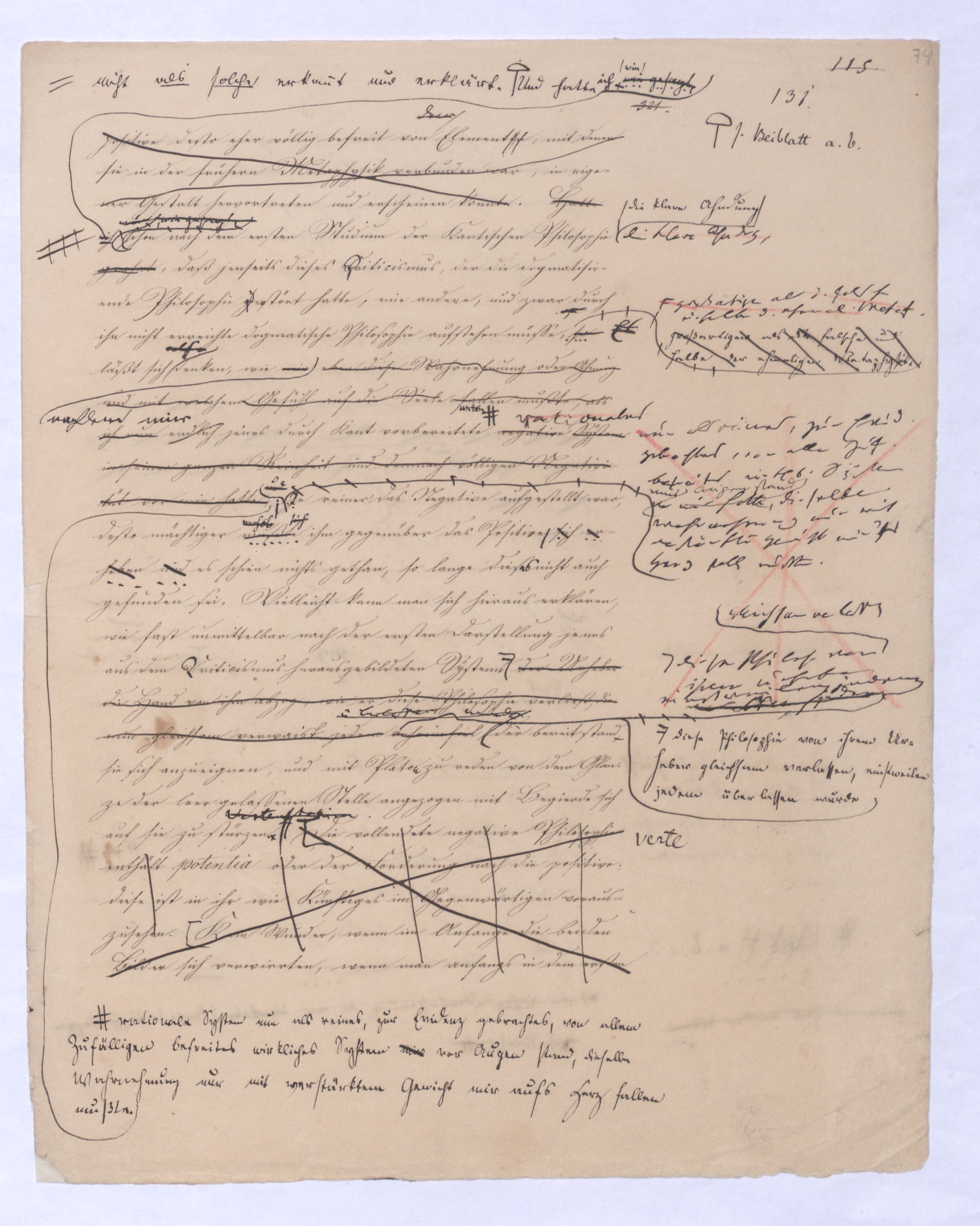 Es geschieht noch jetzt häufig, daßAls eine SinnesändernungWer die + Phil. als Forderung der (-) ansah hatte Recht hat man ferner die wenn er von positive zu sprechen Philosophie erklärt. Aber wenn Unwi Halbunterrichtete meinen, es soll an d. Stelle derich habe die frühere Philos. – die sog. Ident. Ph – als (-) erklärt, um die + an ihre Stelle zu setzen. Dieß wäre Da könnte man dann wohl auch von einer Sinnesänderung sprechen die Rede seyn. Wenn zu einer Sache zwei Elemente, a und b erforderlich sind, und ich befinde mich zunächsterst bloß im Besitze des einen, a, so wird dadurch, daß zu a bA B hinzutritt, a eigentlich nicht verändert, nur das wird verhindertverhindert nur wird daß ich glaube, durch a schon zu besitzen, oder erreichen zu können, was erst durch das Hinzukommen von b möglich ist. So verhält es sich mit der negativen und positiven Philosophie es ist keine Veränderung, die mit der ersten vorgeht, wenn die zweite zu ihr hinzugefügt wird, im Gegentheil wird sie dadurch erst in ihr wahres Wesen eingesetzt, daß sie nicht mehr versucht seyn kann, über ihre Gränzen auszuschweifen, d. h. selbst positiv zu seyn zu wollen. Es Schon bald nachdemist hierwird übrigens zur zu bemerkenzu meinen, daß man, wie ich Bekanntwerdung die Kantische Kr. d. r. V. durchgedrungen war, fing man anfing von einer krit. Philos. zu sprechen: Man fand doch daß eine Kritik d. r. V. noch bald aber fragte man sich auch ob denn nun diese krit. Ph. alles sey, was von Ph. übrig ob es außer dieser nichts mehr von Philos. gebe.seybleibe. So So kann ich nun wohl sagen, daß Was mich betrifft, so erlaube ich mir zu bemerken, daßmir bald nach vollendeten Studium der Kantischen Philosophie empfunden habemir ¿¿¿ einleuchtete, daß diese sogenannte kritische Philosophie unmöglich die ganze seyn könne, ich zweifele sogar, ob sie die eigentliche Philosophie seyn könne; in diesem Gefühle habtte ich schon 1795 in den Briefen über Dogmatismus und Critismus die im ersten Bande meiner Schriften wieder abgedruckt sind
