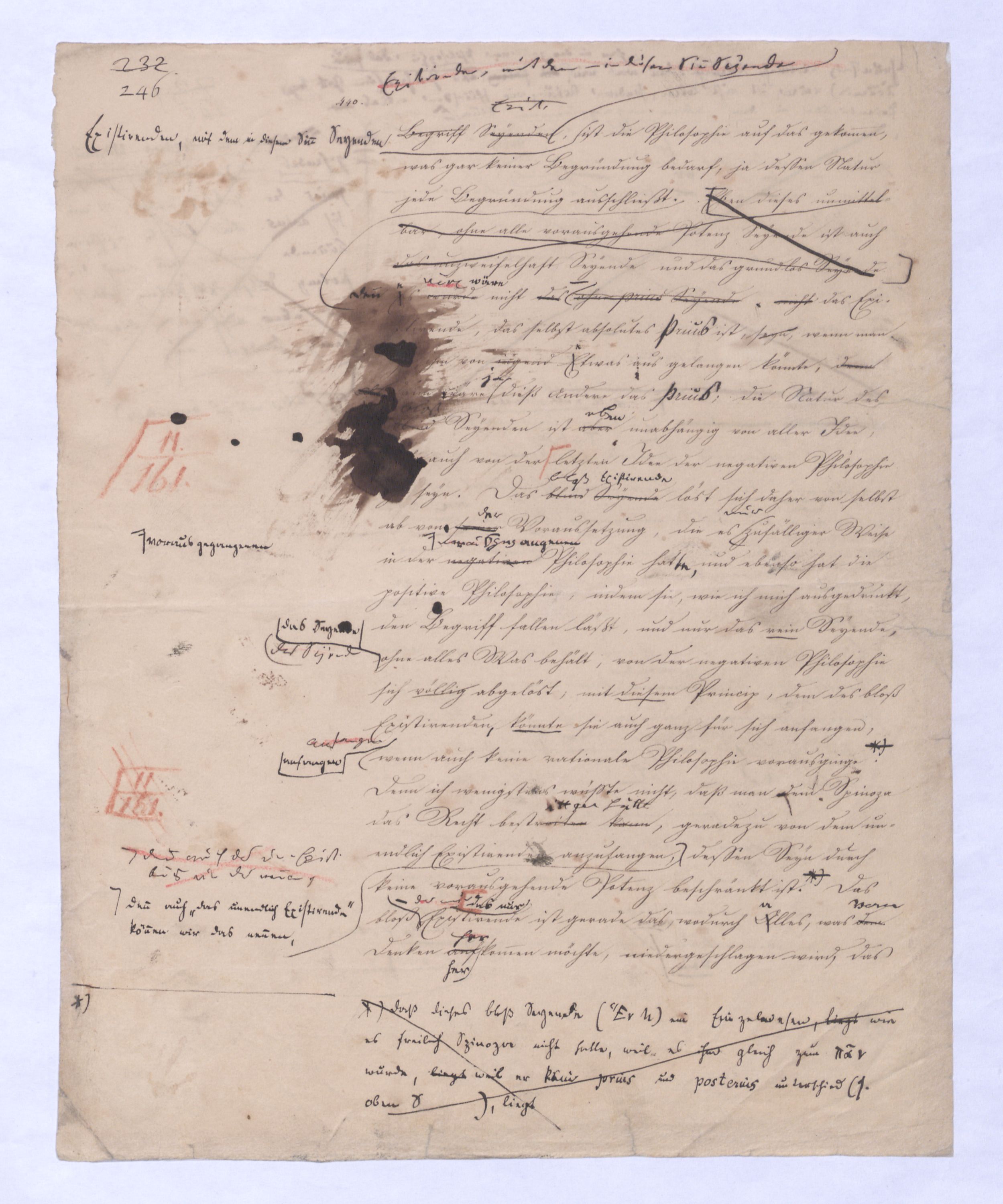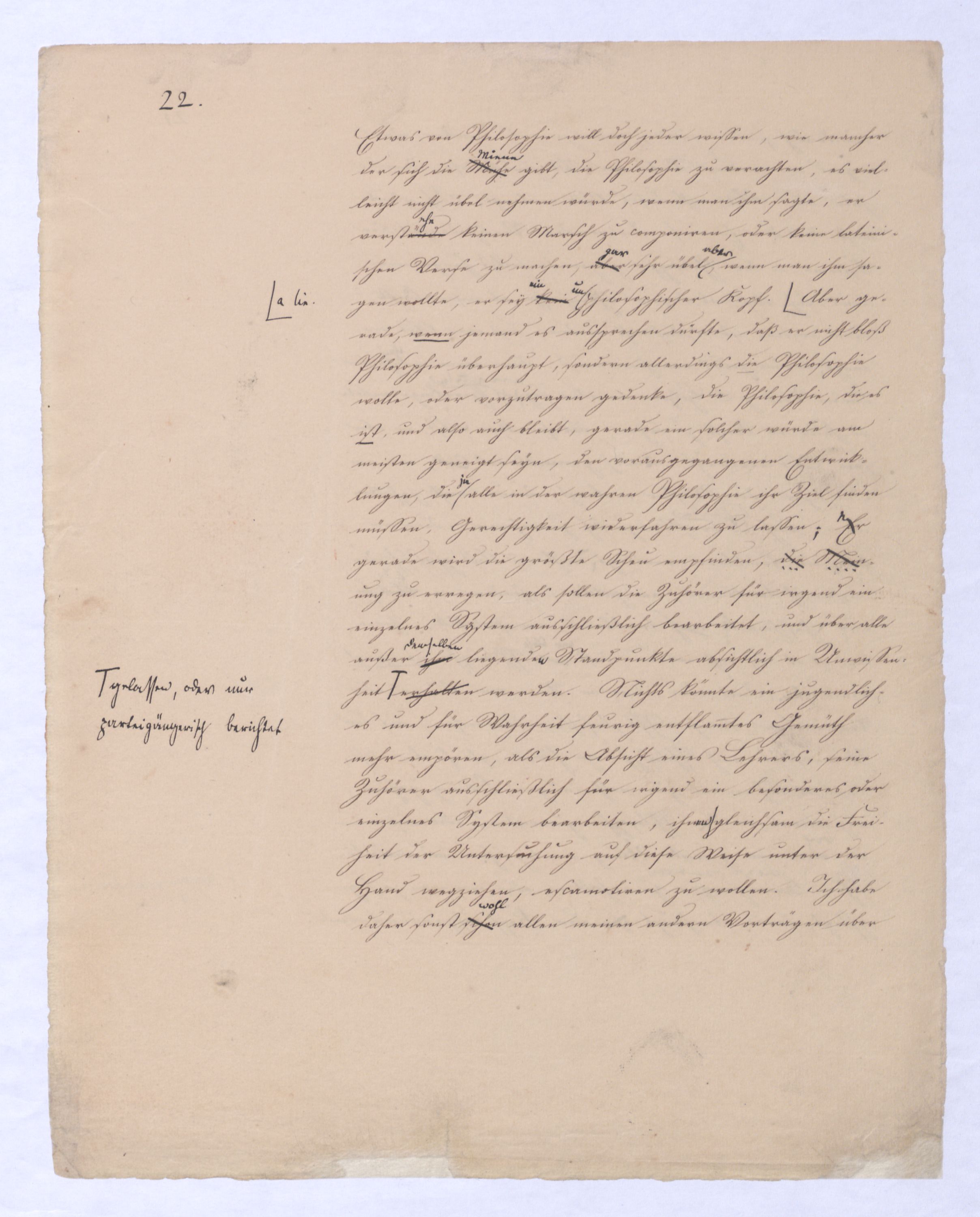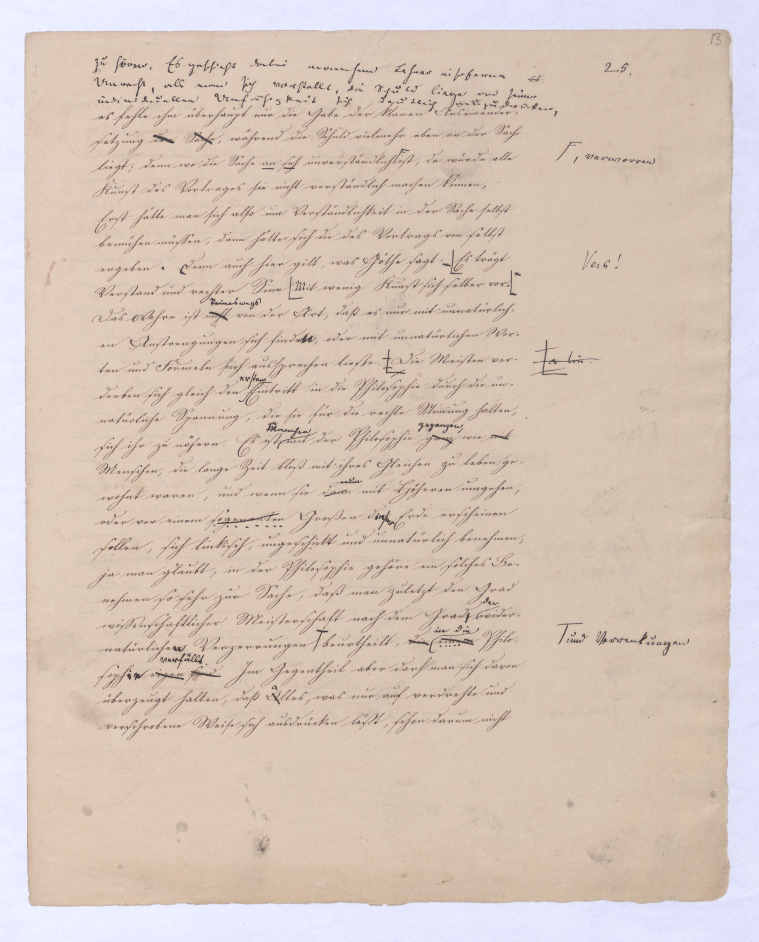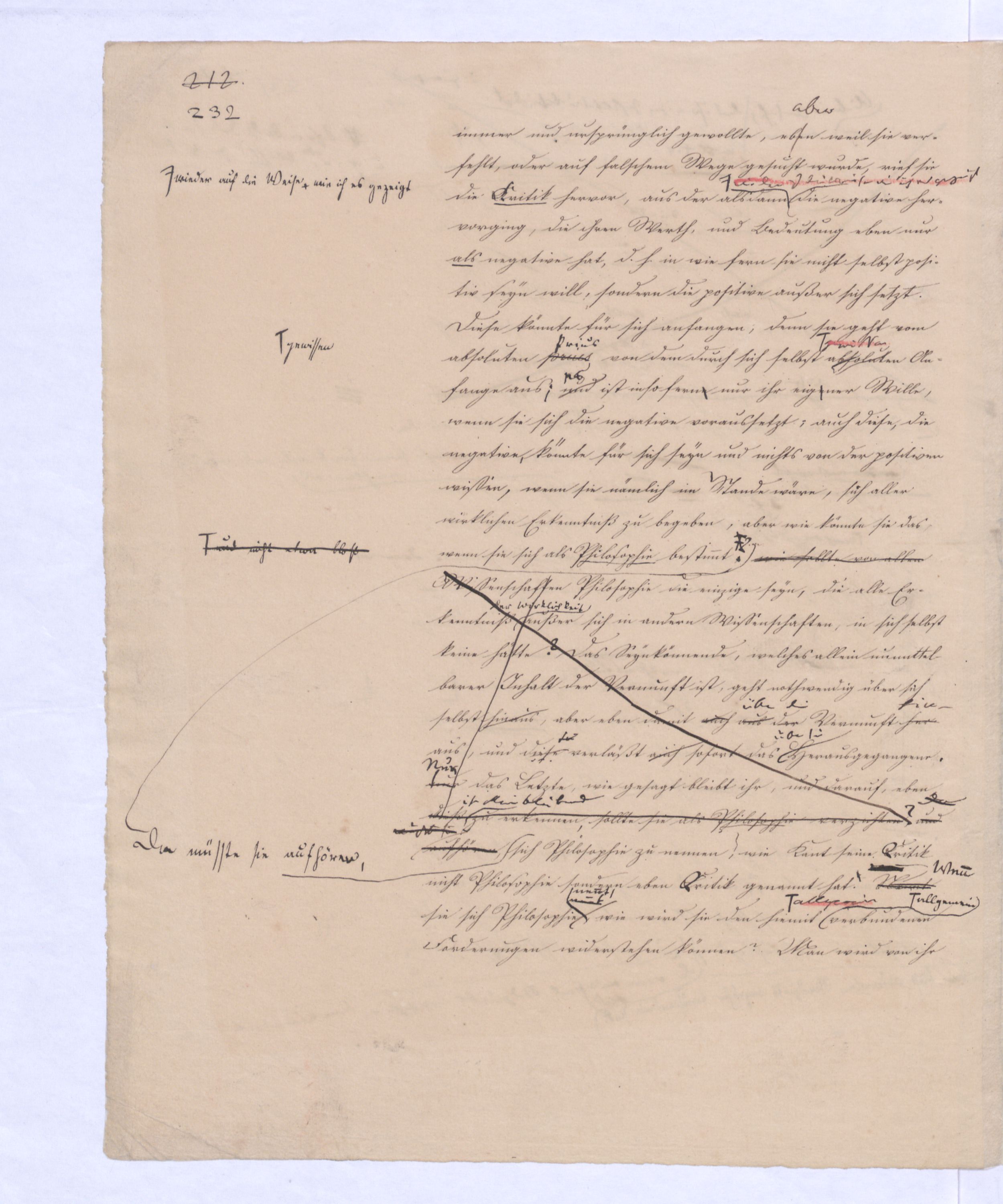 Es geschieht noch jetzt häufig, daßAls eine SinnesändernungWer die + Phil. als Forderung der (-) ansah hatte Recht hat man ferner die wenn er von positive zu sprechen Philosophie erklärt. Aber wenn Unwi Halbunterrichtete meinen, es soll an d. Stelle derich habe die frühere Philos. – die sog. Ident. Ph – als (-) erklärt, um die + an ihre Stelle zu setzen. Dieß wäre Da könnte man dann wohl auch von einer Sinnesänderung sprechen die Rede seyn. Wenn zu einer Sache zwei Elemente, a und b erforderlich sind, und ich befinde mich zunächsterst bloß im Besitze des einen, a, so wird dadurch, daß zu a bA B hinzutritt, a eigentlich nicht verändert, nur das wird verhindertverhindert nur wird daß ich glaube, durch a schon zu besitzen, oder erreichen zu können, was erst durch das Hinzukommen von b möglich ist. So verhält es sich mit der negativen und positiven Philosophie es ist keine Veränderung, die mit der ersten vorgeht, wenn die zweite zu ihr hinzugefügt wird, im Gegentheil wird sie dadurch erst in ihr wahres Wesen eingesetzt, daß sie nicht mehr versucht seyn kann, über ihre Gränzen auszuschweifen, d. h. selbst positiv zu seyn zu wollen. Es Schon bald nachdemist hierwird übrigens zur zu bemerkenzu meinen, daß man, wie ich Bekanntwerdung die Kantische Kr. d. r. V. durchgedrungen war, fing man anfing von einer krit. Philos. zu sprechen: Man fand doch daß eine Kritik d. r. V. noch bald aber fragte man sich auch ob denn nun diese krit. Ph. alles sey, was von Ph. übrig ob es außer dieser nichts mehr von Philos. gebe.seybleibe. So So kann ich nun wohl sagen, daß Was mich betrifft, so erlaube ich mir zu bemerken, daßmir bald nach vollendeten Studium der Kantischen Philosophie empfunden habemir ¿¿¿ einleuchtete, daß diese sogenannte kritische Philosophie unmöglich die ganze seyn könne, ich zweifele sogar, ob sie die eigentliche Philosophie seyn könne; in diesem Gefühle habtte ich schon 1795 in den Briefen über Dogmatismus und Critismus die im ersten Bande meiner Schriften wieder abgedruckt sind