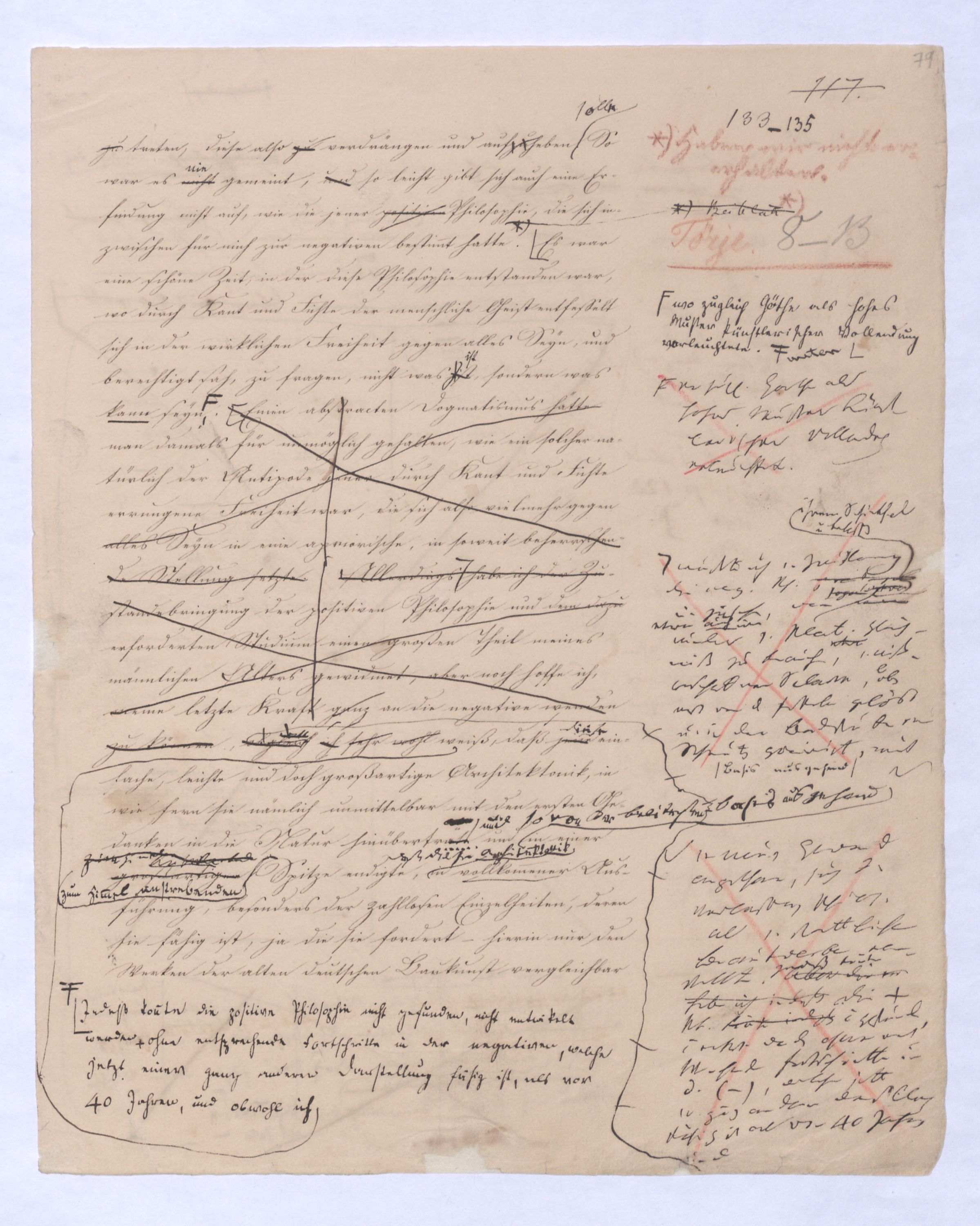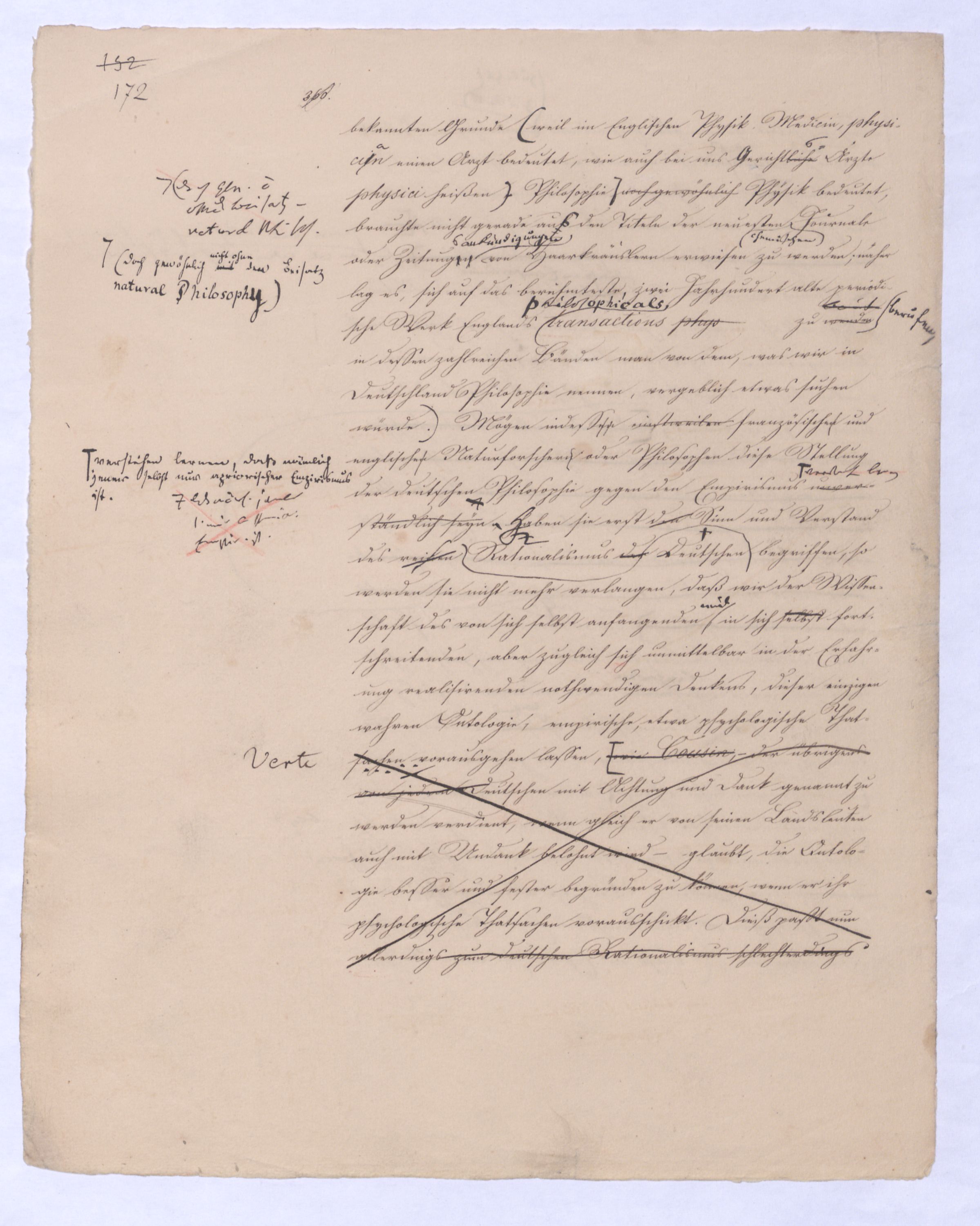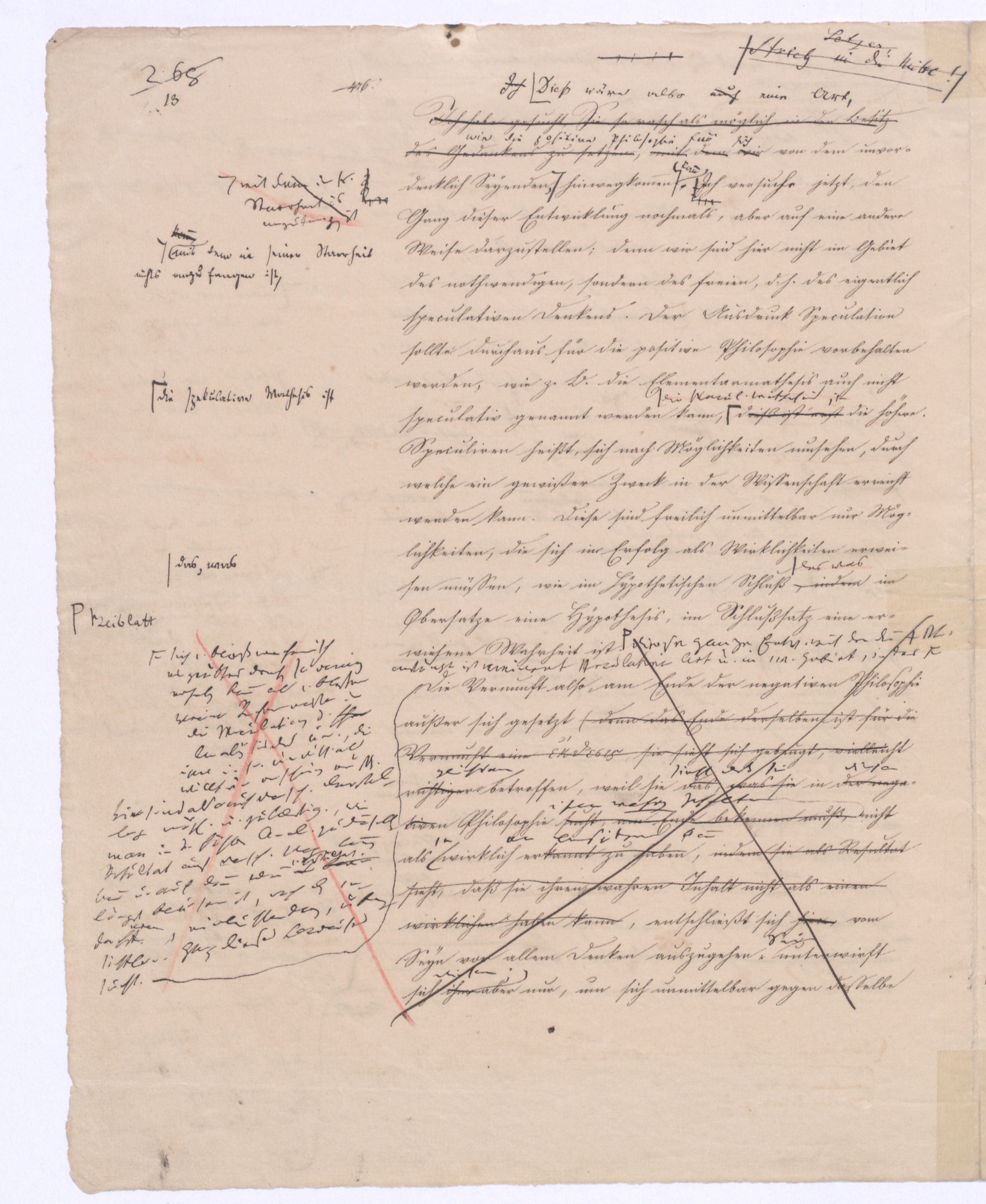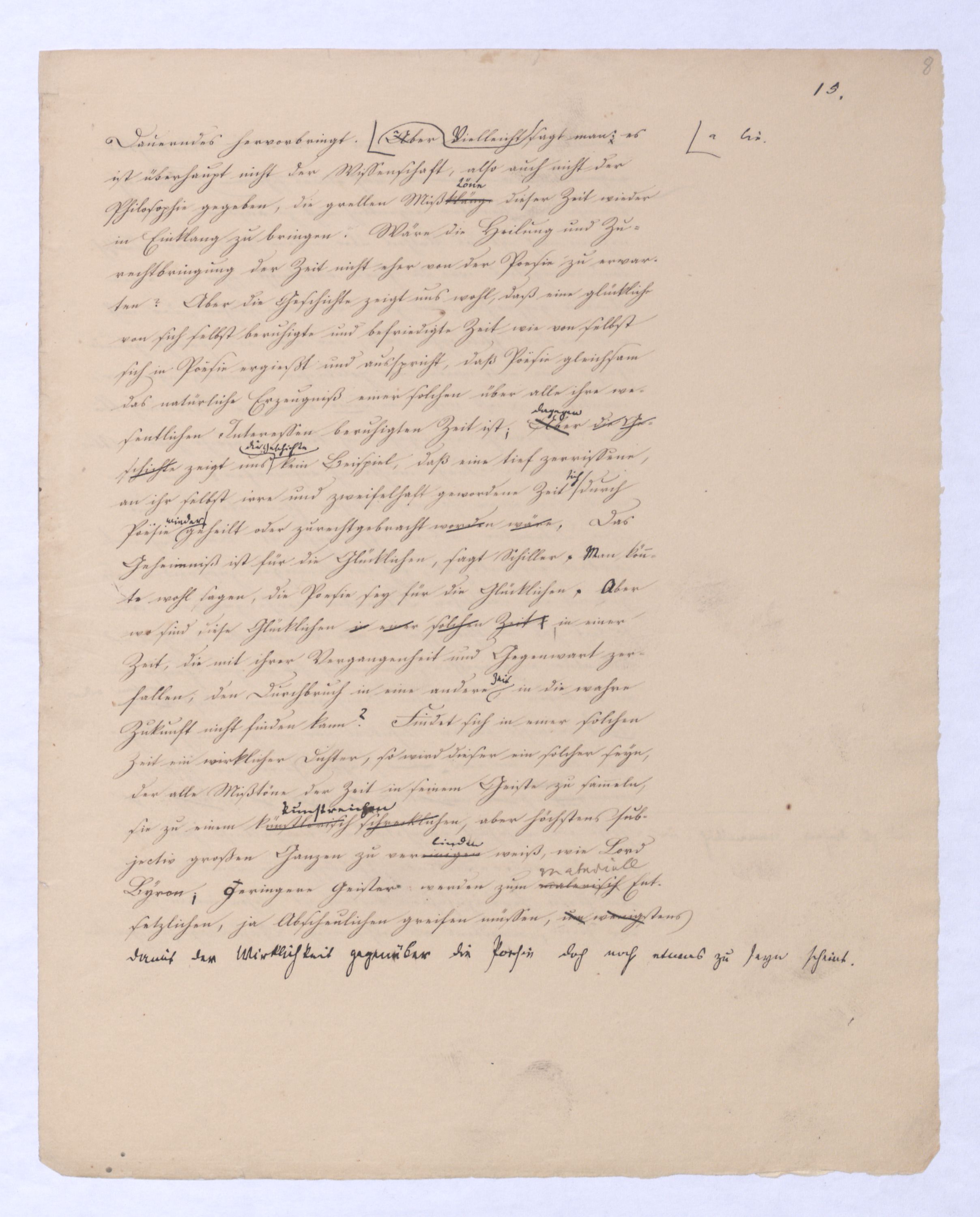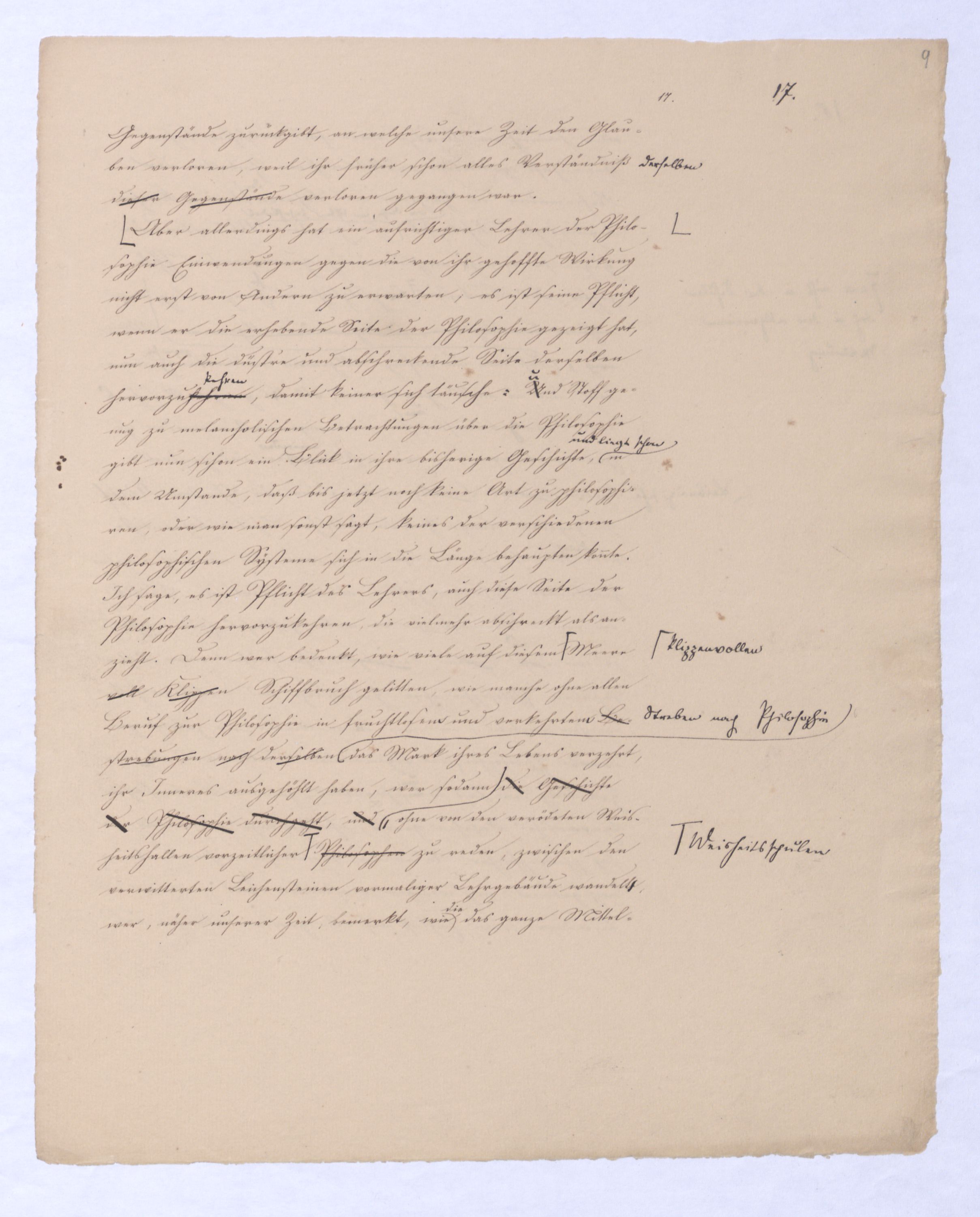 Es geschieht noch jetzt häufig, daßAls eine SinnesändernungWer die + Phil. als Forderung der (-) ansah hatte Recht hat man ferner die wenn er von positive zu sprechen Philosophie erklärt. Aber wenn Unwi Halbunterrichtete meinen, es soll an d. Stelle derich habe die frühere Philos. – die sog. Ident. Ph – als (-) erklärt, um die + an ihre Stelle zu setzen. Dieß wäre Da könnte man dann wohl auch von einer Sinnesänderung sprechen die Rede seyn. Wenn zu einer Sache zwei Elemente, a und b erforderlich sind, und ich befinde mich zunächsterst bloß im Besitze des einen, a, so wird dadurch, daß zu a bA B hinzutritt, a eigentlich nicht verändert, nur das wird verhindertverhindert nur wird daß ich glaube, durch a schon zu besitzen, oder erreichen zu können, was erst durch das Hinzukommen von b möglich ist. So verhält es sich mit der negativen und positiven Philosophie es ist keine Veränderung, die mit der ersten vorgeht, wenn die zweite zu ihr hinzugefügt wird, im Gegentheil wird sie dadurch erst in ihr wahres Wesen eingesetzt, daß sie nicht mehr versucht seyn kann, über ihre Gränzen auszuschweifen, d. h. selbst positiv zu seyn zu wollen. Es Schon bald nachdemist hierwird übrigens zur zu bemerkenzu meinen, daß man, wie ich Bekanntwerdung die Kantische Kr. d. r. V. durchgedrungen war, fing man anfing von einer krit. Philos. zu sprechen: Man fand doch daß eine Kritik d. r. V. noch bald aber fragte man sich auch ob denn nun diese krit. Ph. alles sey, was von Ph. übrig ob es außer dieser nichts mehr von Philos. gebe.seybleibe. So So kann ich nun wohl sagen, daß Was mich betrifft, so erlaube ich mir zu bemerken, daßmir bald nach vollendeten Studium der Kantischen Philosophie empfunden habemir ¿¿¿ einleuchtete, daß diese sogenannte kritische Philosophie unmöglich die ganze seyn könne, ich zweifele sogar, ob sie die eigentliche Philosophie seyn könne; in diesem Gefühle habtte ich schon 1795 in den Briefen über Dogmatismus und Critismus die im ersten Bande meiner Schriften wieder abgedruckt sind