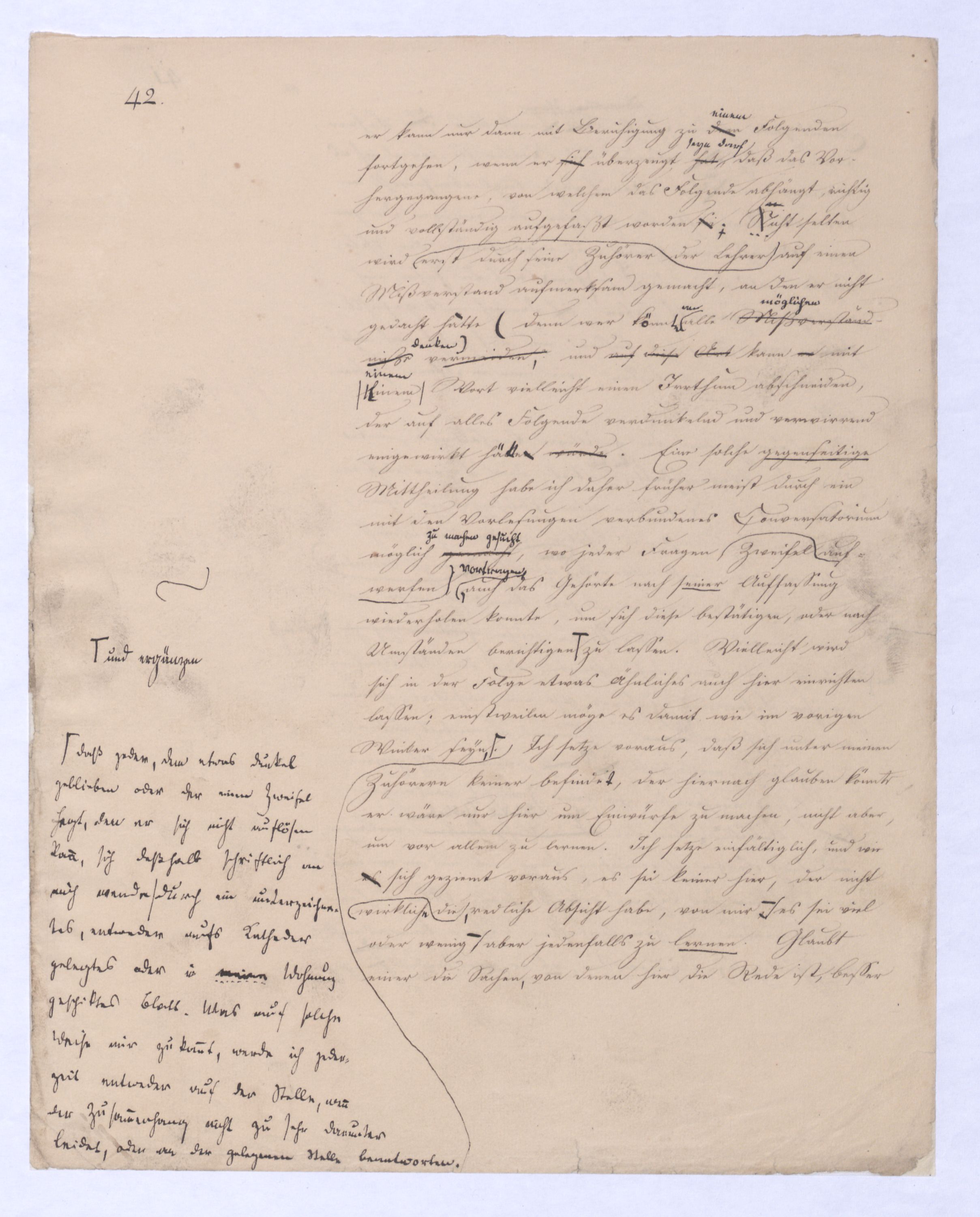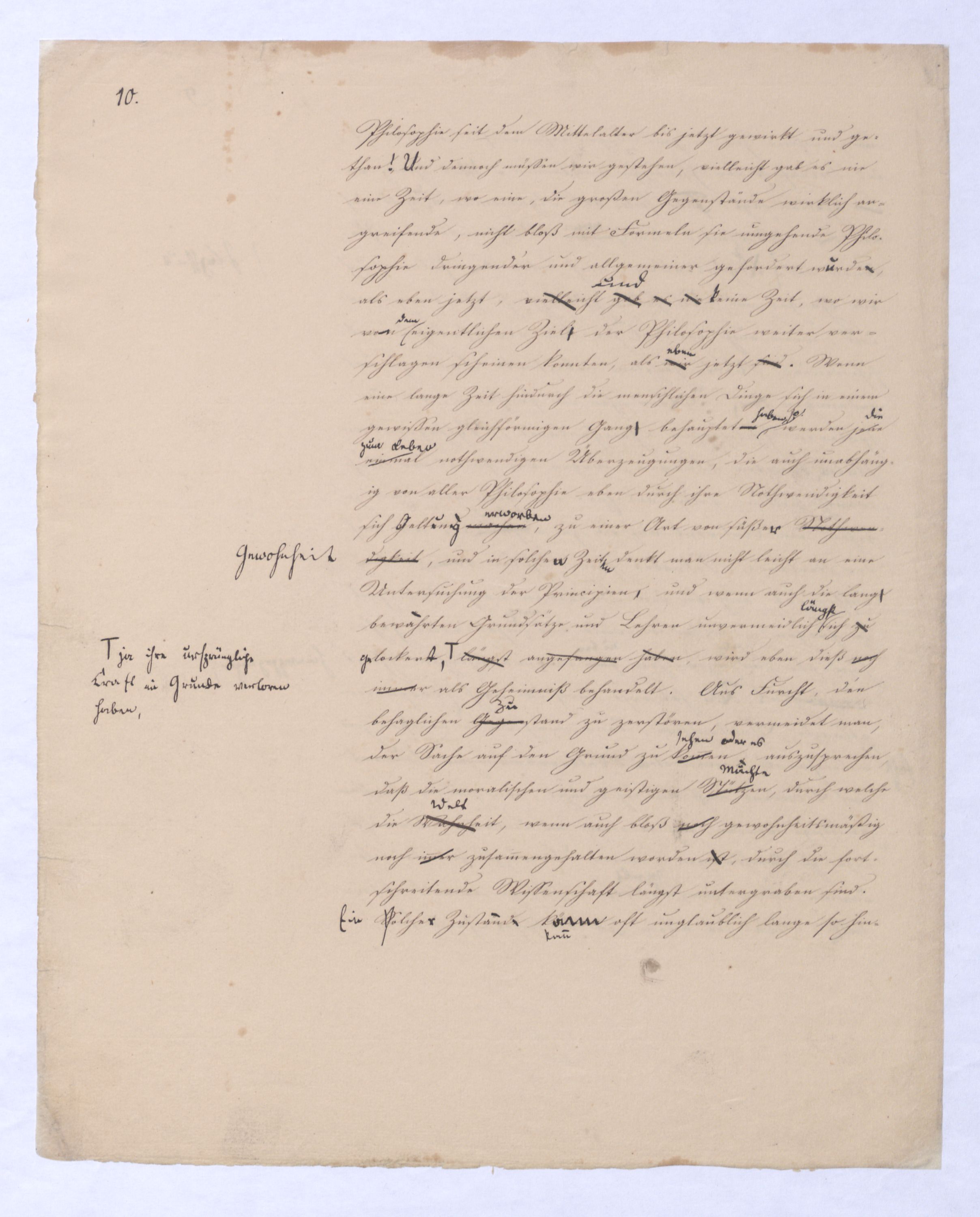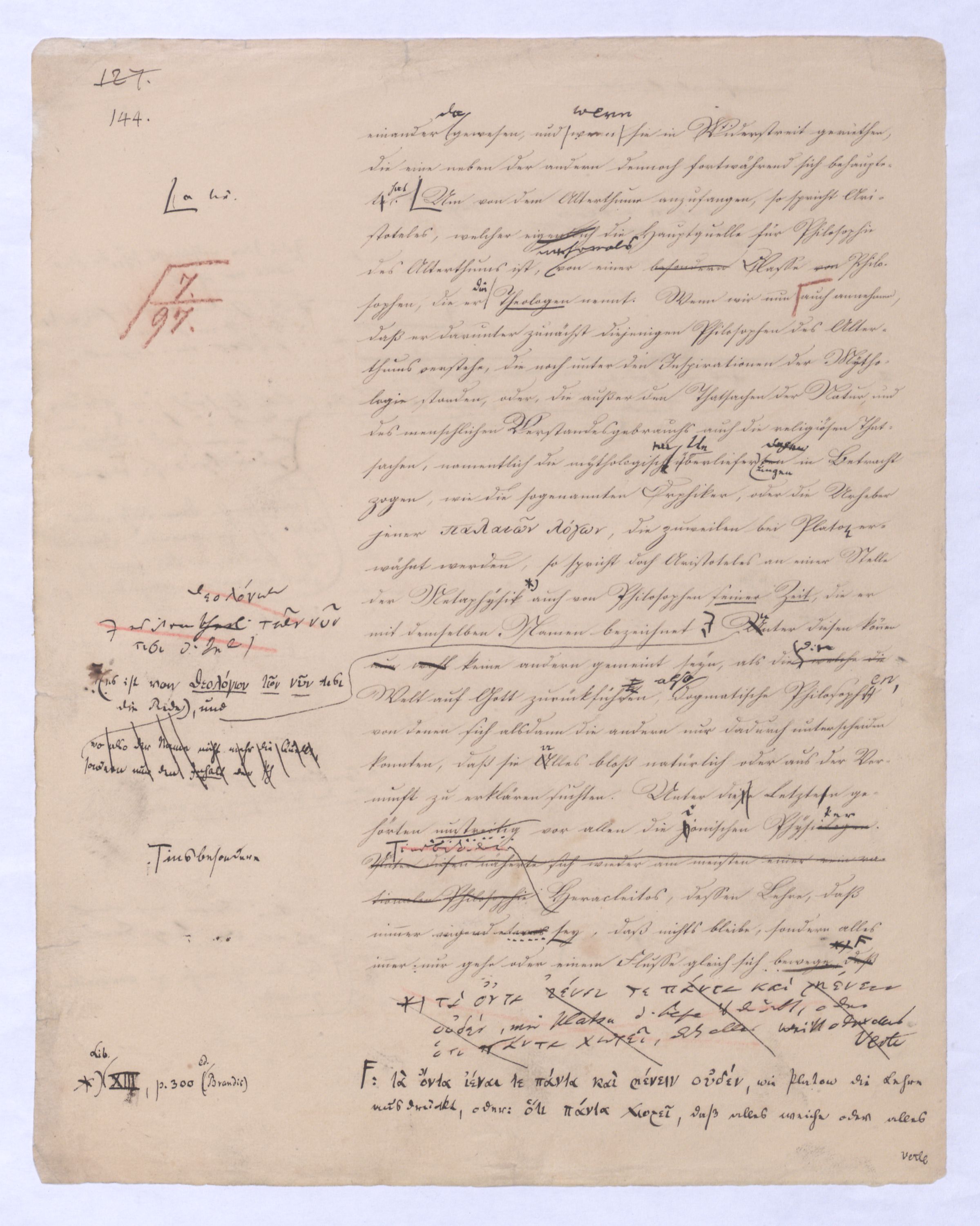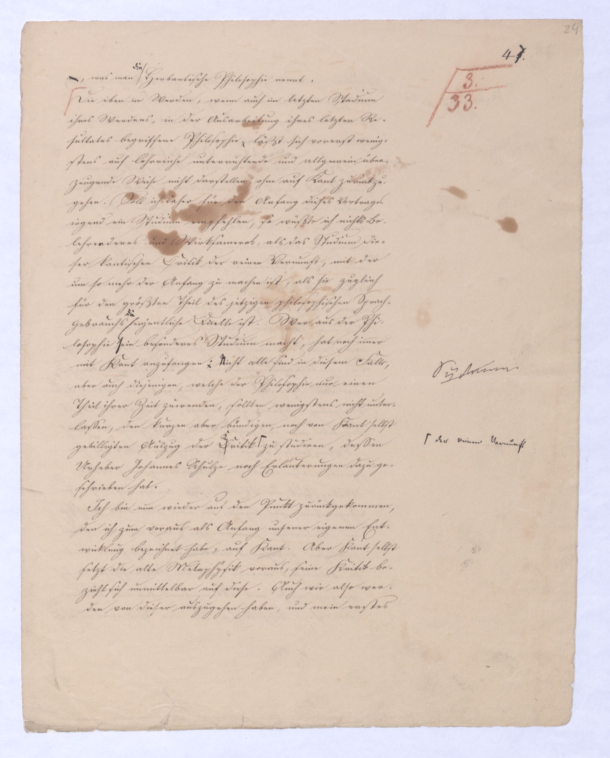 Es geschieht noch jetzt häufig, daßAls eine SinnesändernungWer die + Phil. als Forderung der (-) ansah hatte Recht hat man ferner die wenn er von positive zu sprechen Philosophie erklärt. Aber wenn Unwi Halbunterrichtete meinen, es soll an d. Stelle derich habe die frühere Philos. – die sog. Ident. Ph – als (-) erklärt, um die + an ihre Stelle zu setzen. Dieß wäre Da könnte man dann wohl auch von einer Sinnesänderung sprechen die Rede seyn. Wenn zu einer Sache zwei Elemente, a und b erforderlich sind, und ich befinde mich zunächsterst bloß im Besitze des einen, a, so wird dadurch, daß zu a bA B hinzutritt, a eigentlich nicht verändert, nur das wird verhindertverhindert nur wird daß ich glaube, durch a schon zu besitzen, oder erreichen zu können, was erst durch das Hinzukommen von b möglich ist. So verhält es sich mit der negativen und positiven Philosophie es ist keine Veränderung, die mit der ersten vorgeht, wenn die zweite zu ihr hinzugefügt wird, im Gegentheil wird sie dadurch erst in ihr wahres Wesen eingesetzt, daß sie nicht mehr versucht seyn kann, über ihre Gränzen auszuschweifen, d. h. selbst positiv zu seyn zu wollen. Es Schon bald nachdemist hierwird übrigens zur zu bemerkenzu meinen, daß man, wie ich Bekanntwerdung die Kantische Kr. d. r. V. durchgedrungen war, fing man anfing von einer krit. Philos. zu sprechen: Man fand doch daß eine Kritik d. r. V. noch bald aber fragte man sich auch ob denn nun diese krit. Ph. alles sey, was von Ph. übrig ob es außer dieser nichts mehr von Philos. gebe.seybleibe. So So kann ich nun wohl sagen, daß Was mich betrifft, so erlaube ich mir zu bemerken, daßmir bald nach vollendeten Studium der Kantischen Philosophie empfunden habemir ¿¿¿ einleuchtete, daß diese sogenannte kritische Philosophie unmöglich die ganze seyn könne, ich zweifele sogar, ob sie die eigentliche Philosophie seyn könne; in diesem Gefühle habtte ich schon 1795 in den Briefen über Dogmatismus und Critismus die im ersten Bande meiner Schriften wieder abgedruckt sind