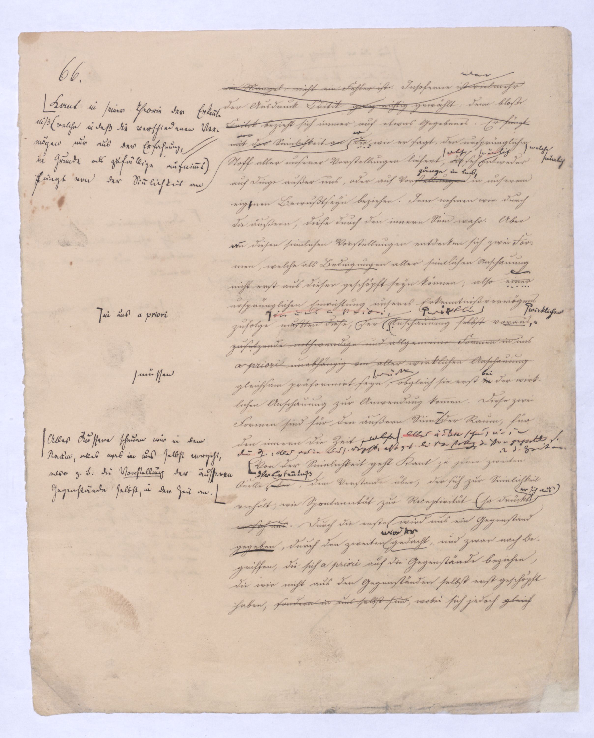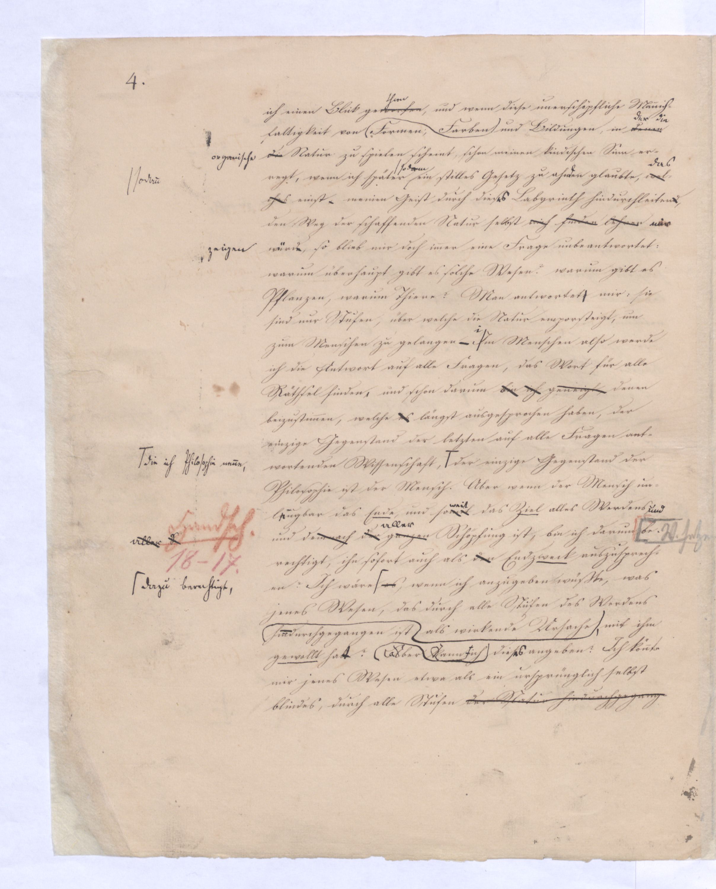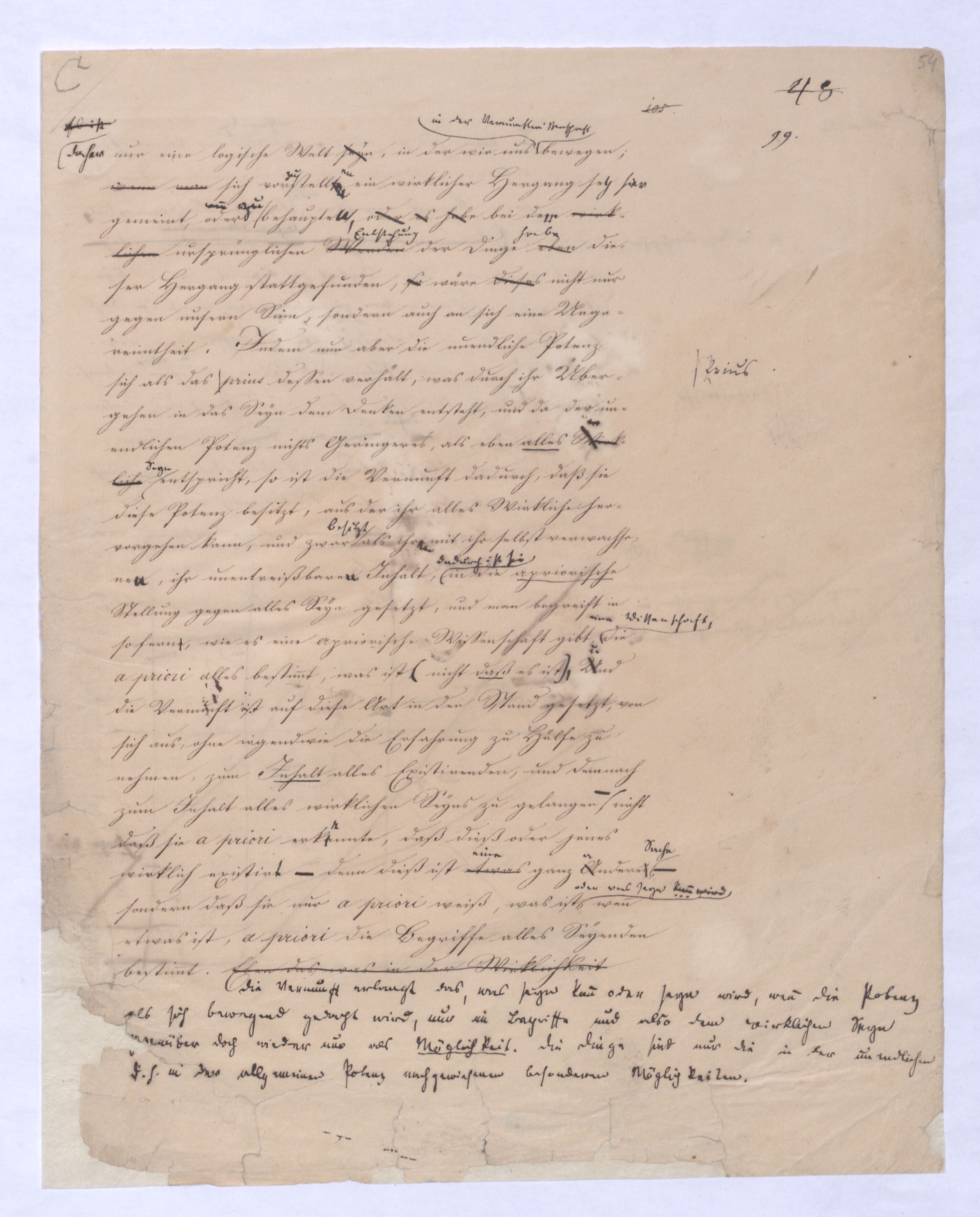 eingeräumt vomdes Idealismus, eingeschaltet. Kant ist also bei ihm derdiesem Widersp. als einem für ihn wie es scheint ein unüberwindliches warn stehen geblieben. Klar ist aber hiedurch, daß die wissenschaftliche Entwicklung nicht ebenso bei dieser Theorie nicht sich begnügenstehen bleiben konnte. Kant behauptete, daß es eine Erkenntniß der Dinge a priori gebe, aber von dieser Erkenntniß a priori nimmt er gerade die Hauptsache, nemlich das Existirende selbst weg, das Ansich, das Wesen der Dinge aus, was eigentlich in ihnen ist, denn das was in den Dingen erscheint, vermöge der angeblichen Bestimmungen unseres Erkenntnißvermögens, ist nicht eigentlich in ihnen, was ist aber dasjenige, was zuletzt auch unabhängig von den Bestimmungen unseres Erkenntnißvermögens in ihnen ist? Hierauf hat Kant keine Antwort,, weil also von der Erkenntniß a priori gerade die Hauptsache, das Existirende selbst aus, der unvermeidlich nächste Schritt war daher die Einsicht, daß wenn es überhaupt eine Erkenntniß der Dinge a priori gebe, auch das Existirende selbst sich a priori einsehen lasse, daß Materie und Form der Dinge miteinander und von (hier zu einem neuen, womit also Fragen bleiben. Nicht ders.lassenmüssen.