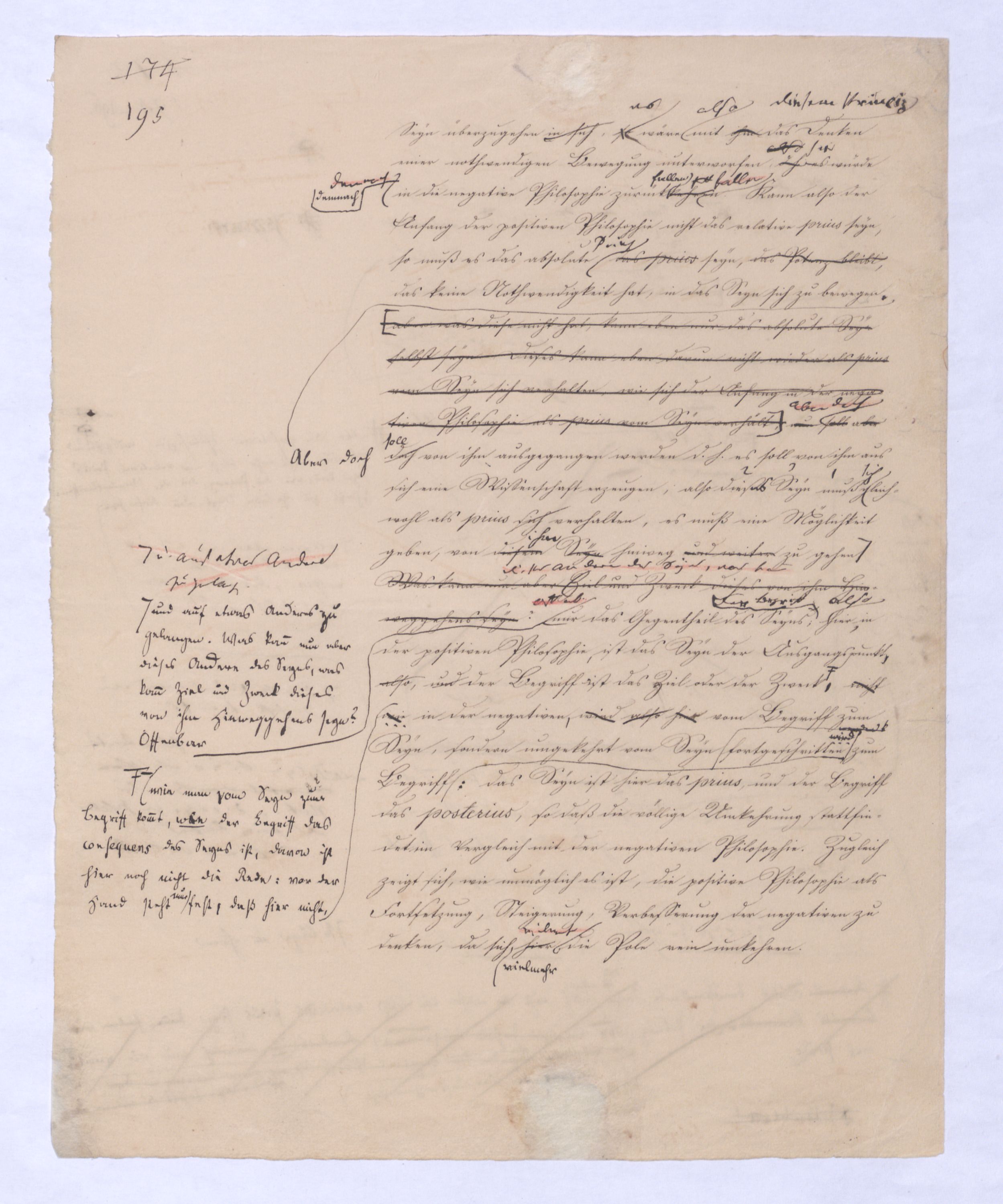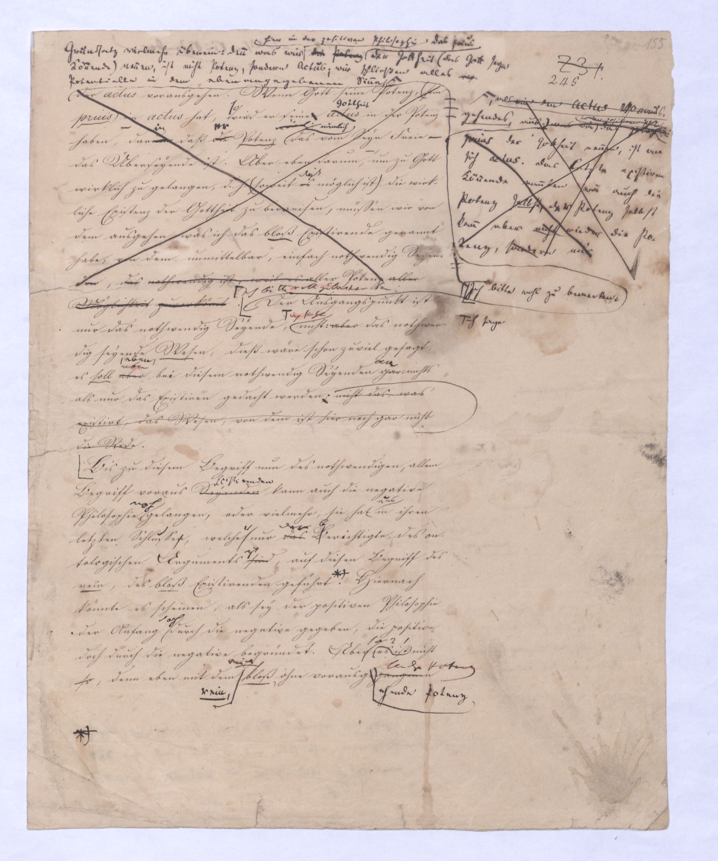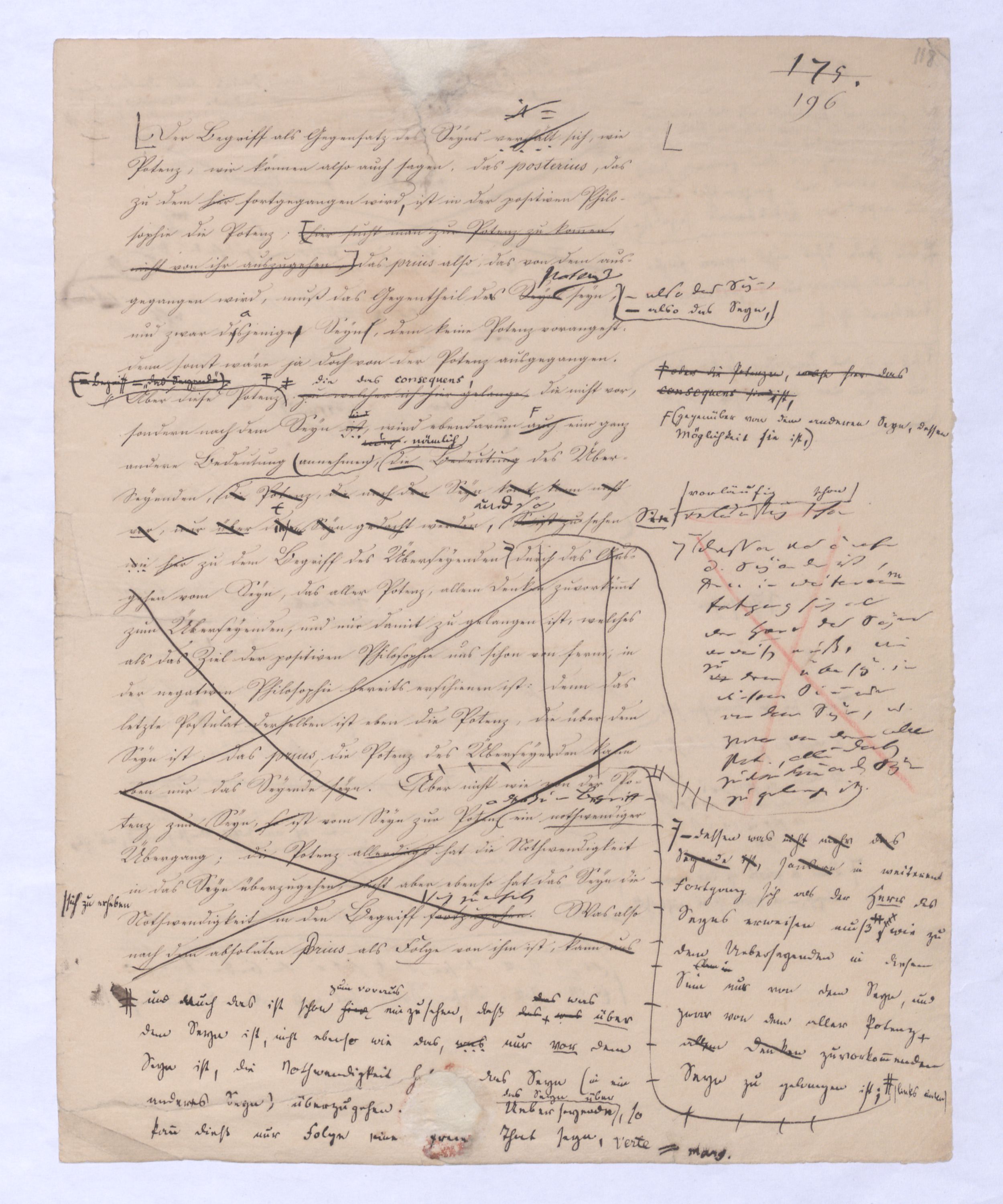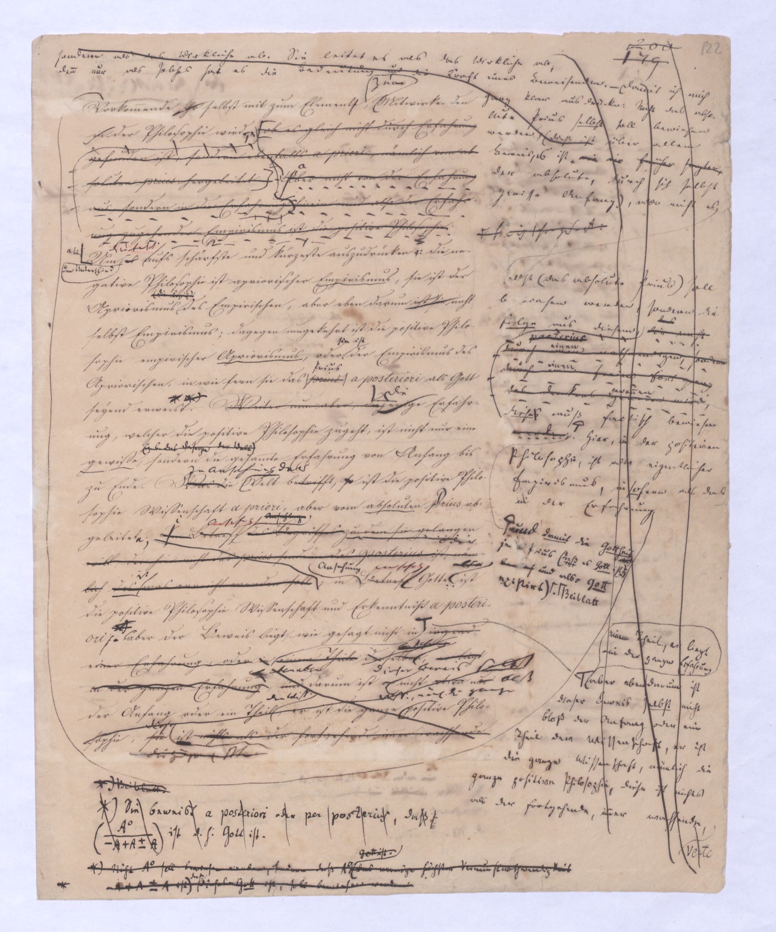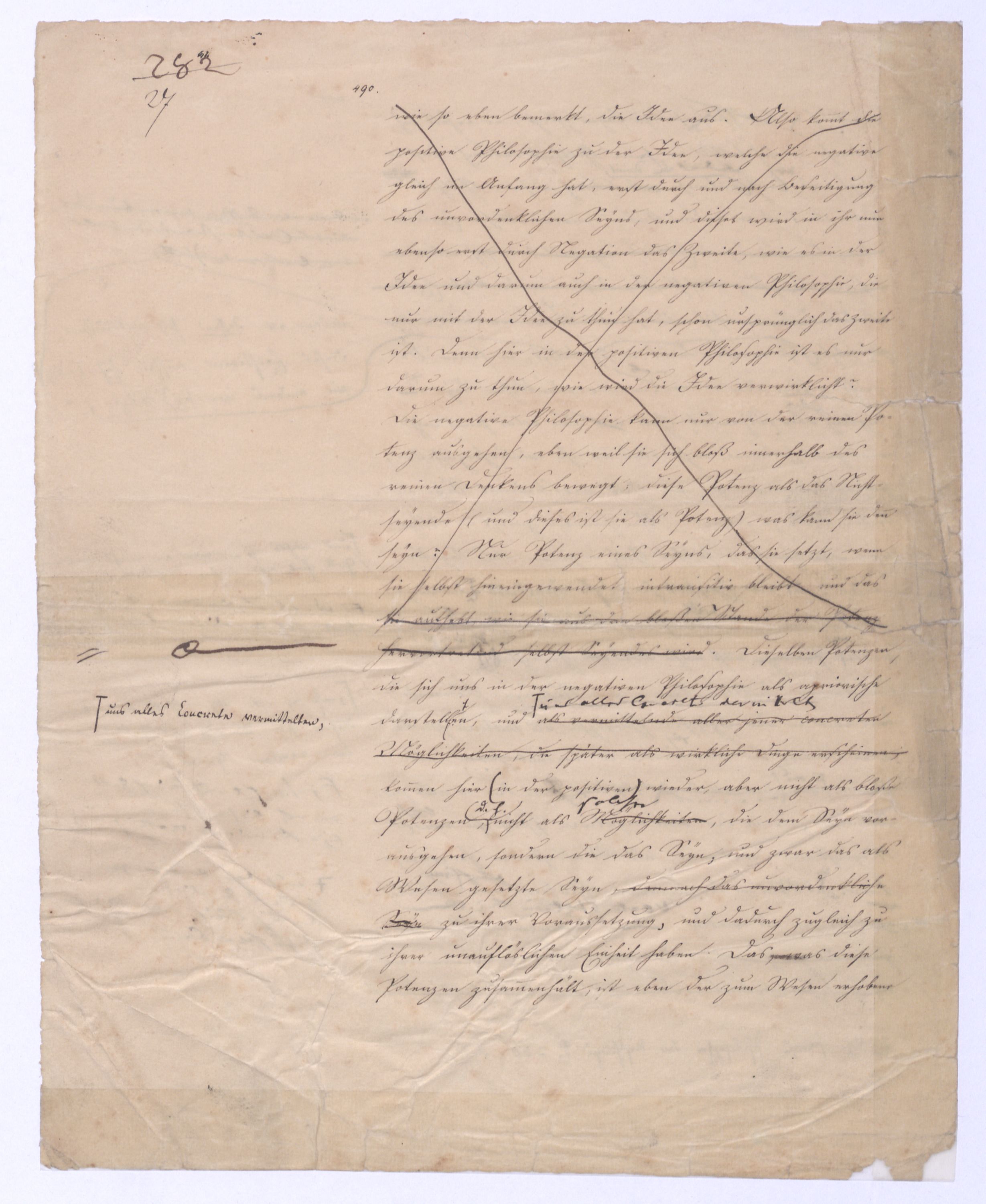 Der Begriff als Gegensatz des Seyns ist verhält hier fortgegangen wird ist in der positiven Philosophie die Potenz; hier sucht man zur Potenz zu kommen, nicht von ihr auszugehen, das prius also, das von dem ausgegangen wird, muß das Gegentheil des Seynsr Potenz seyn, – also das Seyn, und zwar deasjenigen Seyns, dem keine Potenz vorangeht, denn sonst wäre ja doch von der Potenz ausgegangen. Aber diese Potenz, zu welcher ich hier gelange, die nicht vor, sondern nach dem Seyn ist, wird ebendarum auch eine ganz andere Bedeutung annehmen, näml. die Bedeutung des Über-Seyenden, die Potenz, die nach dem Seyn kommt, kann nicht vor, nur über das Seyn gedacht werden. So ist zu , so sehen Sie vorläufig schon wie hier zu dem Begriff des Überseyenden durch das Ausgehen vom Seyn, das aller Potenz, allem Denken zuvorkommt zum Überseyenden, und nur damit zu gelangen ist, welches als das Ziel der positiven Philosophie aus schon von ferne, in der negativen Philosophie bereits erschienen ist: denn das letzte Postulat derselben ist eben die Potenz, die über dem Seyn ist, das prius, die Potenz des Überseyenden kann eben nur das Seyende seyn.– dessen was nicht mehr d. Seyende ist, sondern in weiterem Fortgang sich als der Herr des Seyns erweisen muß, wie demzu dem Übersey. in diesem Sinn nur von dem Seyn, u. zwar von dem aller Pot., allem Denken zuvorkommenden Seyn zu gelangen ist. Aber nicht wie von der Potenz zum Seyn, so ist vom Seyn zur Potenz oder zum Begriff – ein nothwendiger Übergang; die Potenz allerdings hat die Nothwendigkeit in das Seyn überzugehen, nicht aber ebenso hat das Seyn die Nothwendigkeit in den Begriff fortzugehensich zu erheben. Was also nach dem absoluten prius als Folge von ihm ist, kann aus ihm nicht mit Nothwendigkeit folgen, kann wie die Folge einer freien, das Seyn und dessen Unbeweglichkeit überwindende That seyn, die dann ferner selbst nur etwas rein Empirisches, durchaus nur a posteriori erkennbar seyn kann., wie ja jede That nichts a priori einzusehendes sondern nur a post. erkennbares ist.