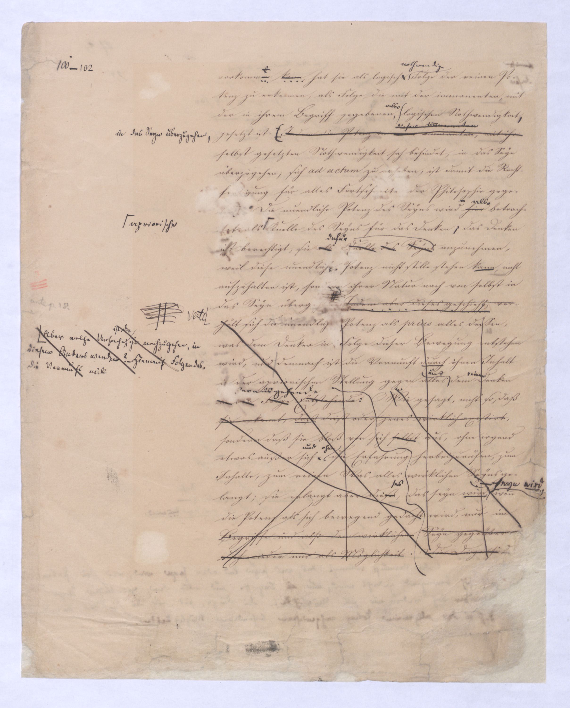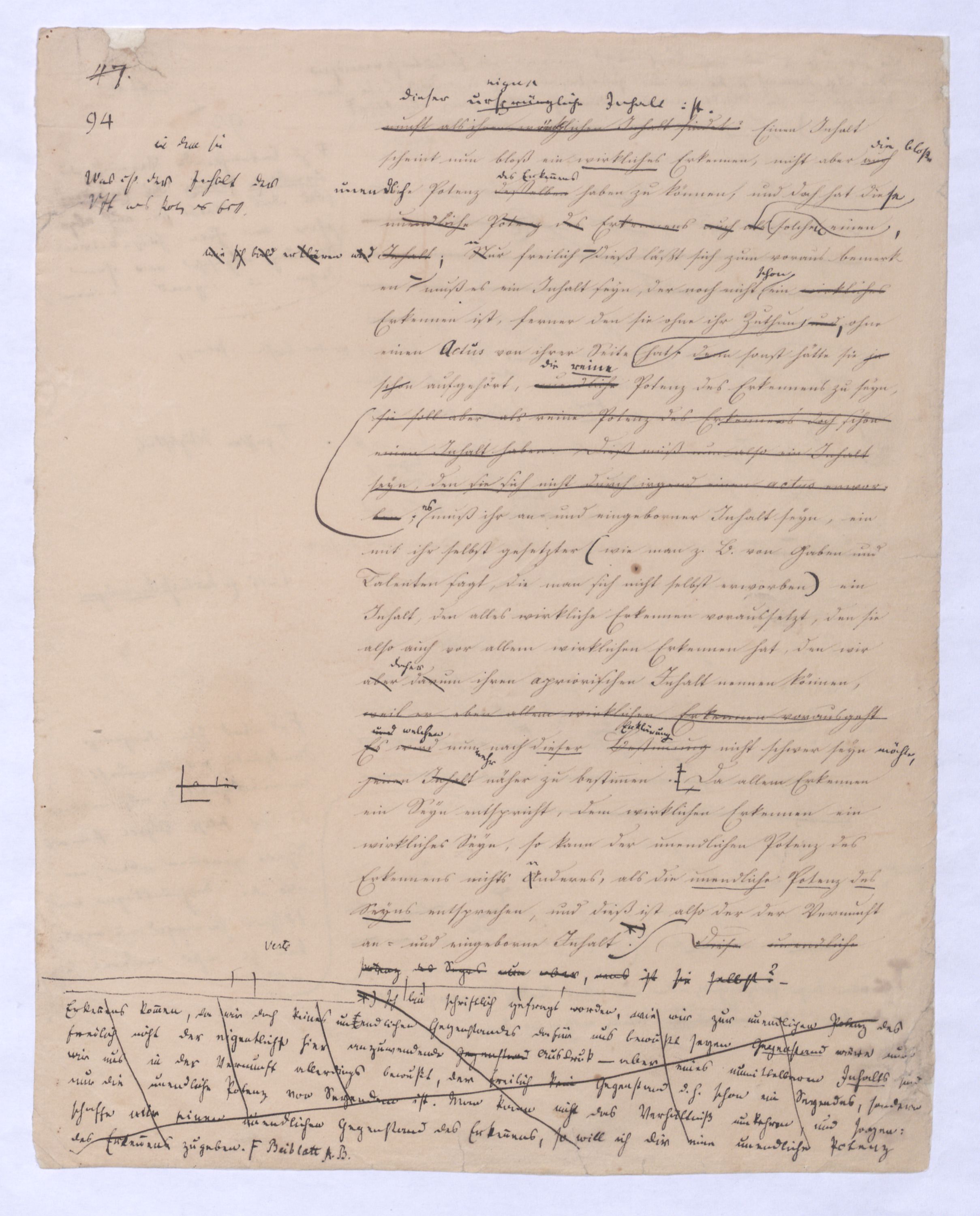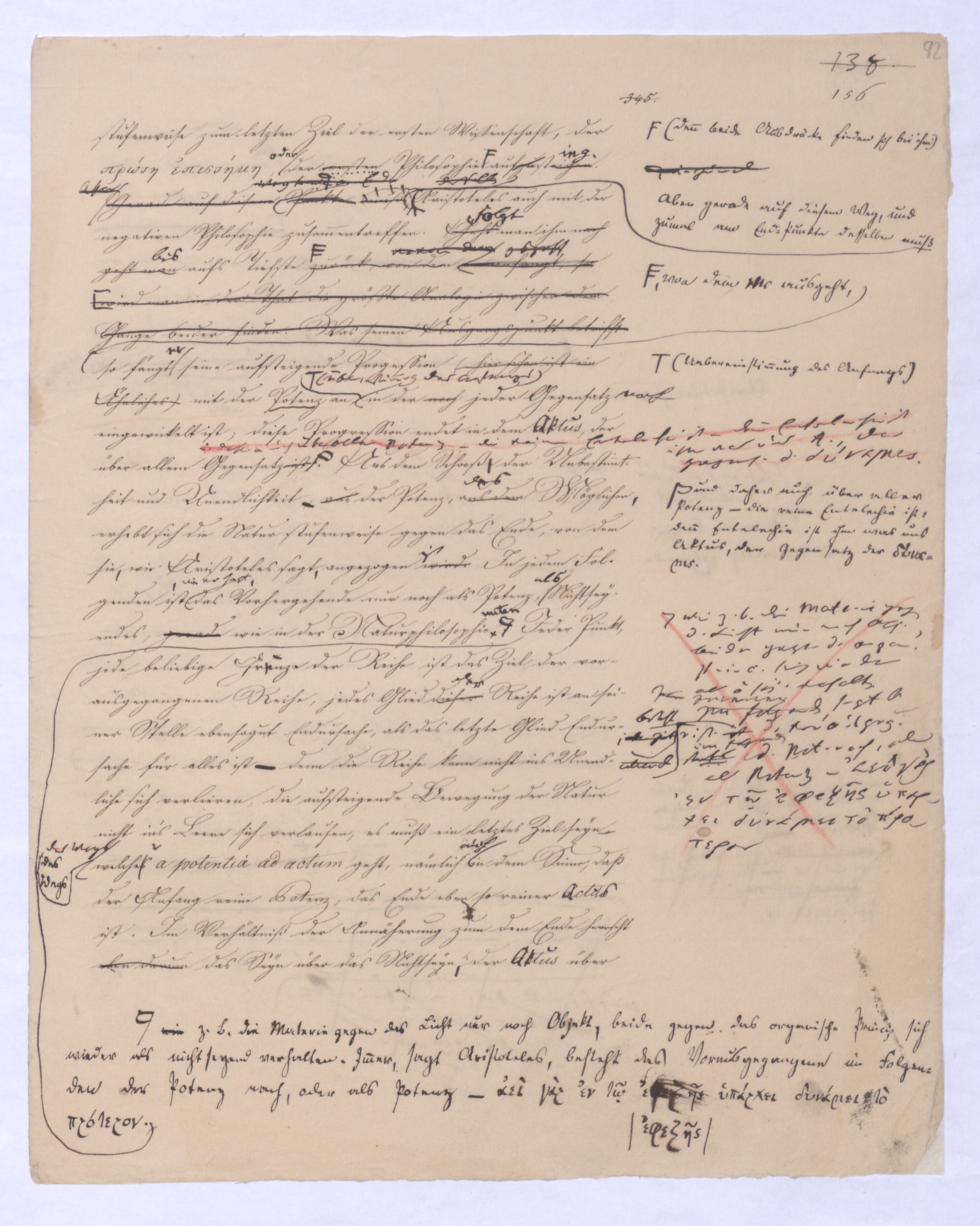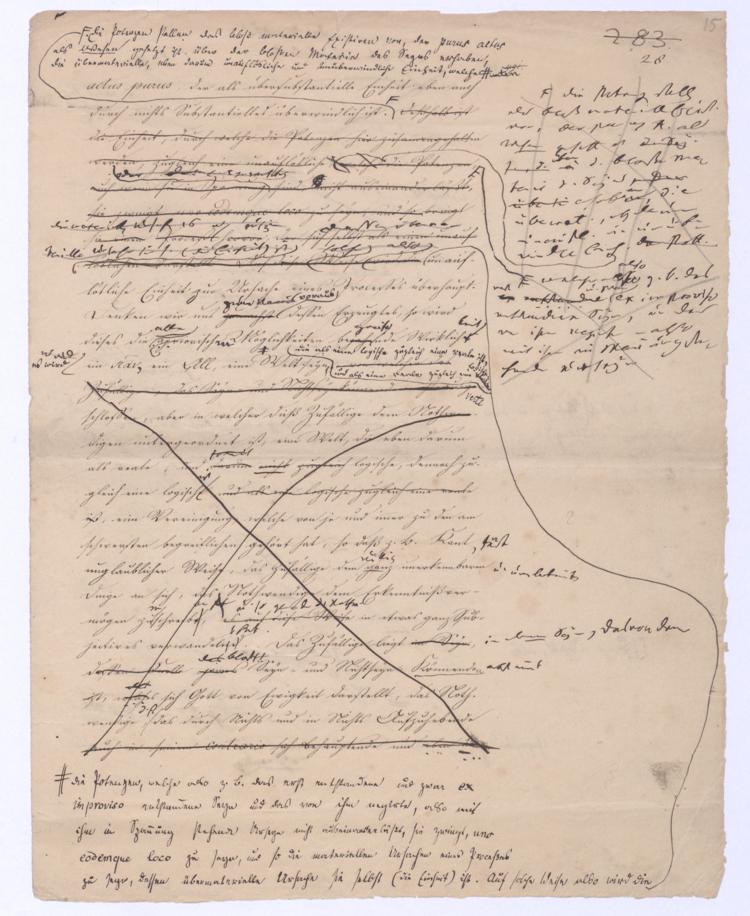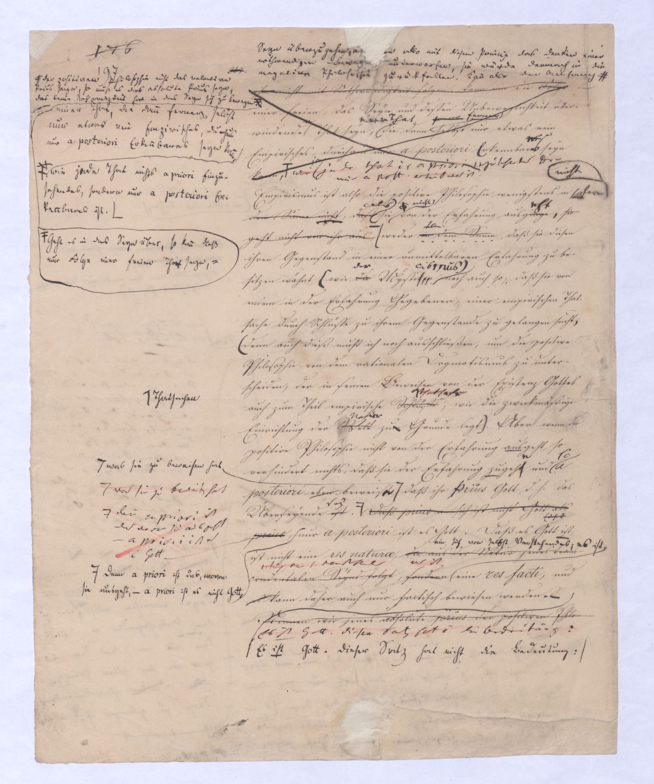 Der Begriff als Gegensatz des Seyns ist verhält hier fortgegangen wird ist in der positiven Philosophie die Potenz; hier sucht man zur Potenz zu kommen, nicht von ihr auszugehen, das prius also, das von dem ausgegangen wird, muß das Gegentheil des Seynsr Potenz seyn, – also das Seyn, und zwar deasjenigen Seyns, dem keine Potenz vorangeht, denn sonst wäre ja doch von der Potenz ausgegangen. Aber diese Potenz, zu welcher ich hier gelange, die nicht vor, sondern nach dem Seyn ist, wird ebendarum auch eine ganz andere Bedeutung annehmen, näml. die Bedeutung des Über-Seyenden, die Potenz, die nach dem Seyn kommt, kann nicht vor, nur über das Seyn gedacht werden. So ist zu , so sehen Sie vorläufig schon wie hier zu dem Begriff des Überseyenden durch das Ausgehen vom Seyn, das aller Potenz, allem Denken zuvorkommt zum Überseyenden, und nur damit zu gelangen ist, welches als das Ziel der positiven Philosophie aus schon von ferne, in der negativen Philosophie bereits erschienen ist: denn das letzte Postulat derselben ist eben die Potenz, die über dem Seyn ist, das prius, die Potenz des Überseyenden kann eben nur das Seyende seyn.– dessen was nicht mehr d. Seyende ist, sondern in weiterem Fortgang sich als der Herr des Seyns erweisen muß, wie demzu dem Übersey. in diesem Sinn nur von dem Seyn, u. zwar von dem aller Pot., allem Denken zuvorkommenden Seyn zu gelangen ist. Aber nicht wie von der Potenz zum Seyn, so ist vom Seyn zur Potenz oder zum Begriff – ein nothwendiger Übergang; die Potenz allerdings hat die Nothwendigkeit in das Seyn überzugehen, nicht aber ebenso hat das Seyn die Nothwendigkeit in den Begriff fortzugehensich zu erheben. Was also nach dem absoluten prius als Folge von ihm ist, kann aus ihm nicht mit Nothwendigkeit folgen, kann wie die Folge einer freien, das Seyn und dessen Unbeweglichkeit überwindende That seyn, die dann ferner selbst nur etwas rein Empirisches, durchaus nur a posteriori erkennbar seyn kann., wie ja jede That nichts a priori einzusehendes sondern nur a post. erkennbares ist.