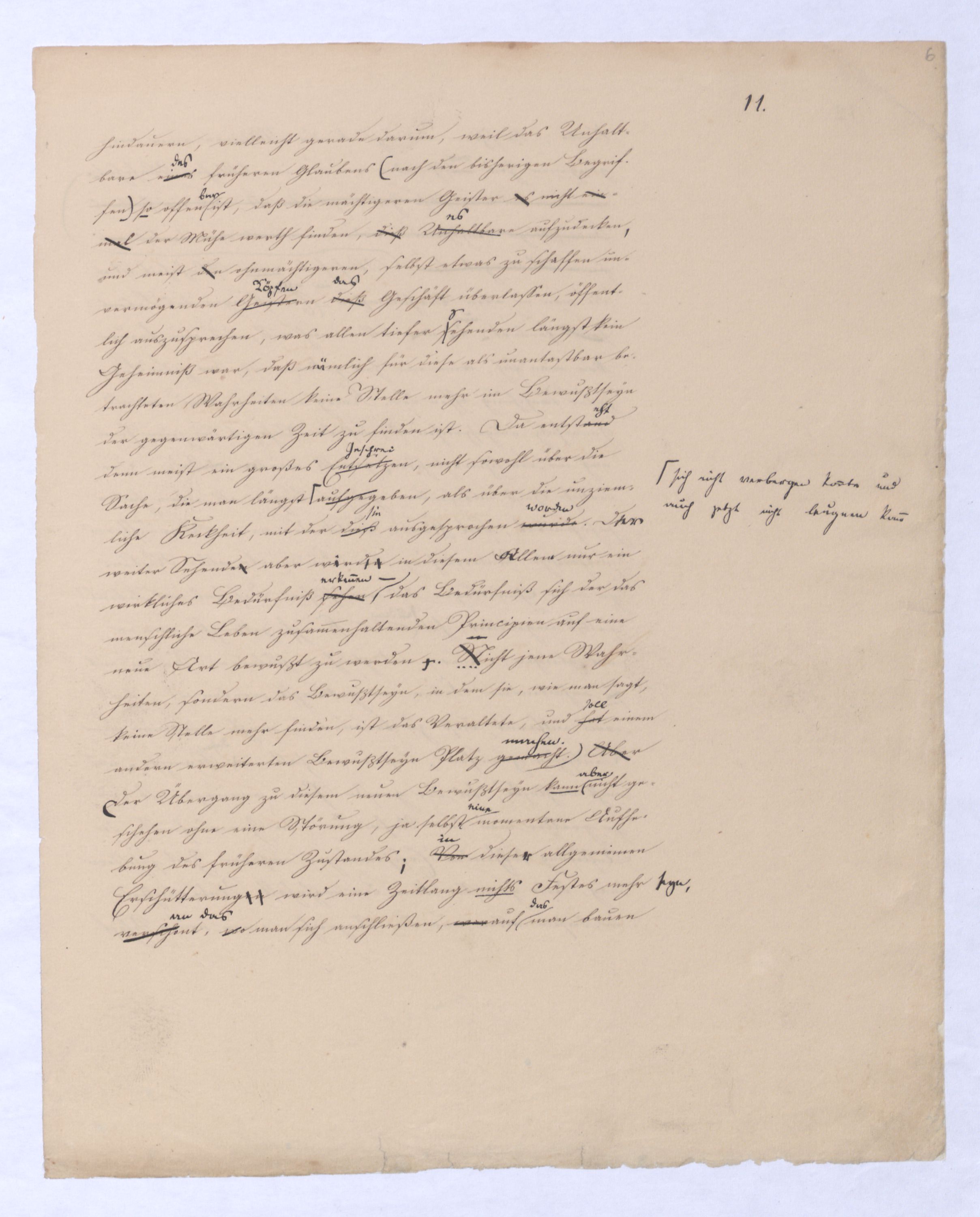 , was also ganz übereinstimmt mit Kants Satz, daß die Vernunft über die Erfahrung hinaus nichts zu wissen vermöge. Aber auch hier heißt es, wer sich selbst erniedriget, wird erhöhet werden. Die Critik u. in Folge derselben die negative Philosophie allerdings erniedrigt die Vernunft, diewenn man will, der sie d. Vernunft, welche d. Erfahrung in d. Metaph. überfliegen wollte zum Niveau der Erfahrung herabsetzt, die positive dagegen ist die Erhebung der Vernunft, denn d. Resultat u. Cr. in Bezug auf d. Vernunft, daß sie wirkl. Erk. nur in Ansehung desjen. findet, was außer ihr ist, in d. Erfahrung, wogegen ihm die + Ph. zur wirkl. Erk. desj. verhilft, was sie als ihren allein bleibenden u. unverlierbaren Inhalt kennen gelernt hat. Wenn die - Ph. allein und für sich wäre, hätte sie für dieindem sie dieser ihren nothwendigen Inhalt, den sie ebenweil sie ihn eben dieses, was sie durch die negative gewals eine solche als ionnen mußhat, noch einemeinenihm allein bleibenden u. unverlierbaren Inhalt durch die - Ph. gewonnen hat, ohne daß diese s. es mit ihr zur Erk. bringen konnte, weil sie dieses davor als wirklich Erkanntesn gibt., s. während sie wirkl. Erk. für sie sonst nur in dem hielt, was außer ihr ist. Wenn die negative Philosophie erkennende Vernunft s. kein ¿¿ positives Resultat; die erkenennde Vernunft gerade ginge bei der negativen Philosophiebliebe in Ansehung des ihm eigenen Inhalts unbefriedrigt u. ginge leer aus. A, aber schon dadurch daß sie selbst nicht + in aber Wiss. der + Ph. ist die sie außer sich setzt und fordert, schon da schon dadurch, daß sie s. nicht + in Wissenschaft der eigentlichen, wirklichen, (der positiven) Philosophie ist,mitdurch hat siedie - Ph. selbst wieder ein positives Resultat gewonnen, insofernu. gehört sie mit zu der positiven, u. in soferne gibt es nur eine Philosophie, die in der negativen nach sich selbst suchtstrebt, in der positiven sich selbst hat, in der ersten erst den Begriff ihrens Inhalts sucht, in der zweiten ihndiesen als wirklichen existirenden sich erwirbt. eigentlich das Denken eigentlich seinen Zweck nun erst wirkl. erreicht, und nachindem es sich von seinem unmittelbaren, d. h. zufälligen Inhalt befreit hat, dadurch seines nothwendigen Inhalts mächtig geworden ist, und den es diesen es zwischen der Philosophie zwischen der Vernunft und ihrem zufälligennothw. Inhalte stand. In ihrer Wahrheit d. h. also, d. h. inwiefern sie Philosophie ist, ist die negative selbst positiv, weil sie diese außer sich setzt, und es ist demnach keine Zweiheit mehr. Die erste Absicht ging von Anfang an auf positive Philosophie, die Geschichte zeigt, wie späteren Ursprungs alle rein rationellen Untersuchungen sind, und wie früh sich der menschliche Geist mit Vorstellungen des Positiven beschäftigte, die vom reinbloß rat. Standpunkt angesehen transscendente sind. dDie positive Philosophie ist die immer und ursprünglich gewollte, ebenaber weil sie verfehlt, oder auf falschem Wege gesucht wurde, rief sie die Critik hervor, aus der alsdann wieder auf die Weise wie ich es gezeigt die negative hervorging, die ihren Werth und Bedeutung eben nur als negative hat, d. h. in wie fern sie nicht selbst positiv seyn will, sondern die positive außer sich setzt. Diese könnte für sich anfangen; denn sie geht vom absoluten prius von dem durch sich selbst absolutengewissen Anfange aus, und ist insoferne nur ihr eigener Wille, wenn sie sich die negative voraussetzt, auch diese, die negative könnte für sich seyn und nichts von der positiven wissen, wenn sie nämlich im Stande wäre, sich aller wirklichen Erkenntniß zu begeben, aber wie könnte sie das, wenn sie sich als Philosophie bestimmt, wie sollte von allen Wissenschaften Philosophie die einzige seyn, die alle Erkenntniß außer sich in andere Wissenschaften, in sich selbst keine hätte? Das Seynkönnende, welches allein unmittelbarer Inhalt der Vernunft ist, geht nothwendig über sich selbst hinaus, aber eben damit auch aus derüber die Vernunft herhinaus, und diesees verläßt auch sofort das über sie Herausgegangene nur. Nur das Letzte, wie gesagt bleibt ihr, und darauf, eben dieß ihr allein bleibende zu erkennen, sollte sie als Philosophie verzichten, und. Dann müßte sie aufhören sich Philosophie zu nennen, wie Kant seine Critik nicht Philosophie, sondern eben Critik genannt hat? Nennt. Wenn sie sich Philosophie nennt, wie wird sie den hiemit allgemein verbundenen Forderungen widerstehen können? Man wird von ihr den wirklichen Gott fordern, nicht die bloße Idee Gottes, wie wird sie diesen, der ihr als unerkennbar stehen bleibt, sich verschaffen? Sie wirdWird sie zuerst vielleicht sagen: der Gott, der in der bloßen Vernunft auch bloße Idee sey, müsse nur durch individuelles Gefühl zum wirklichen werden, so bekanntlich Jakobi, der deßhalb als religöser, ja christlicher Philosoph gepriesen worden ist., der aber d. schlagendste Beispiel d. Unzulänglichkeit alles auf bloßes Gefühl sich berufende oder gar sich begründen wollende Wissen ist, da eben dieserderselbe Jacobi in d. letzten Zeit an d. Stelle des Gefühls die Vernunft zu setzen, u. sich für s. vernunftgläubige Philos. gelten wollte. Wie abernun ferner wenn nun einer, dem dieserPhilosophieVernunft eben recht ist, weil es ihm recht ist, auf die Sinnenwelt mit seinen Gedankenmit seinen Gedanken auf die Sinnenwelt wollendes beschränkt zu werden, wenn dieser die Berufung auf das Gefühl dazu benutzt zu zeigen, der wirkliche Gott sey eben nur ein Object, ein Geschöpf unseres Gefühles, unseres Herzens unserer Einbildungskraft, er seier sey durchaus nichts Objektives, sey wie dasnicht nur dem Christenthum sagt,– jeder religiösen Idee komme von nun anhöchst. nurnoch eine psychologische Bedeutung zu. Man wirdViele werden gegen ein solches Resultat schreien, u. doch ist es nur die nat. ErgebnißFolge dessen was sie bei Jacobi gut gefunden, ja gegen unsere haben. Oder wWird man die andere Art, wie die ausschließlich 