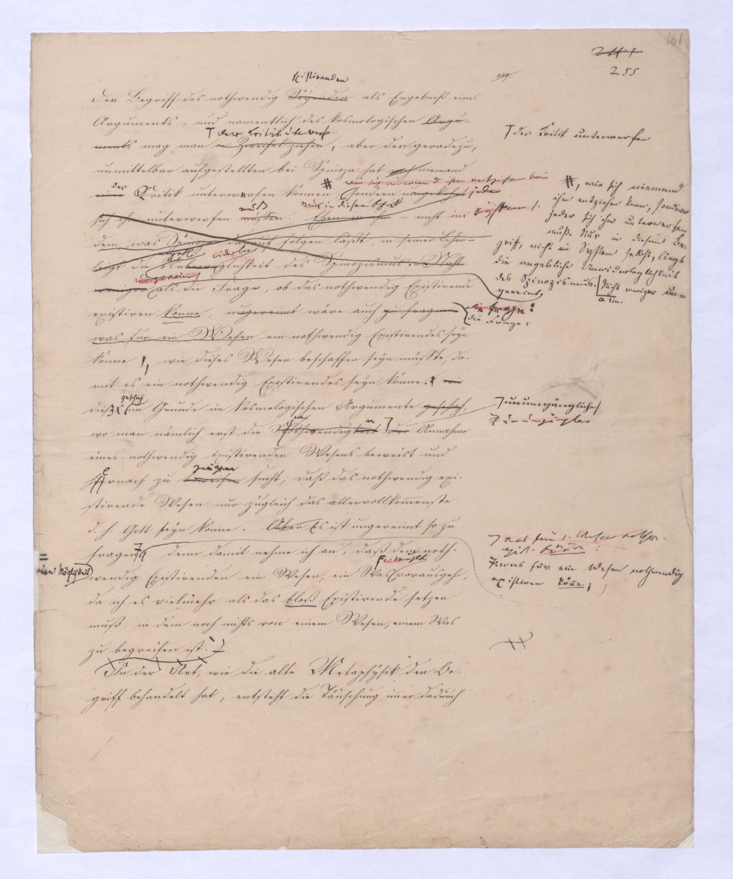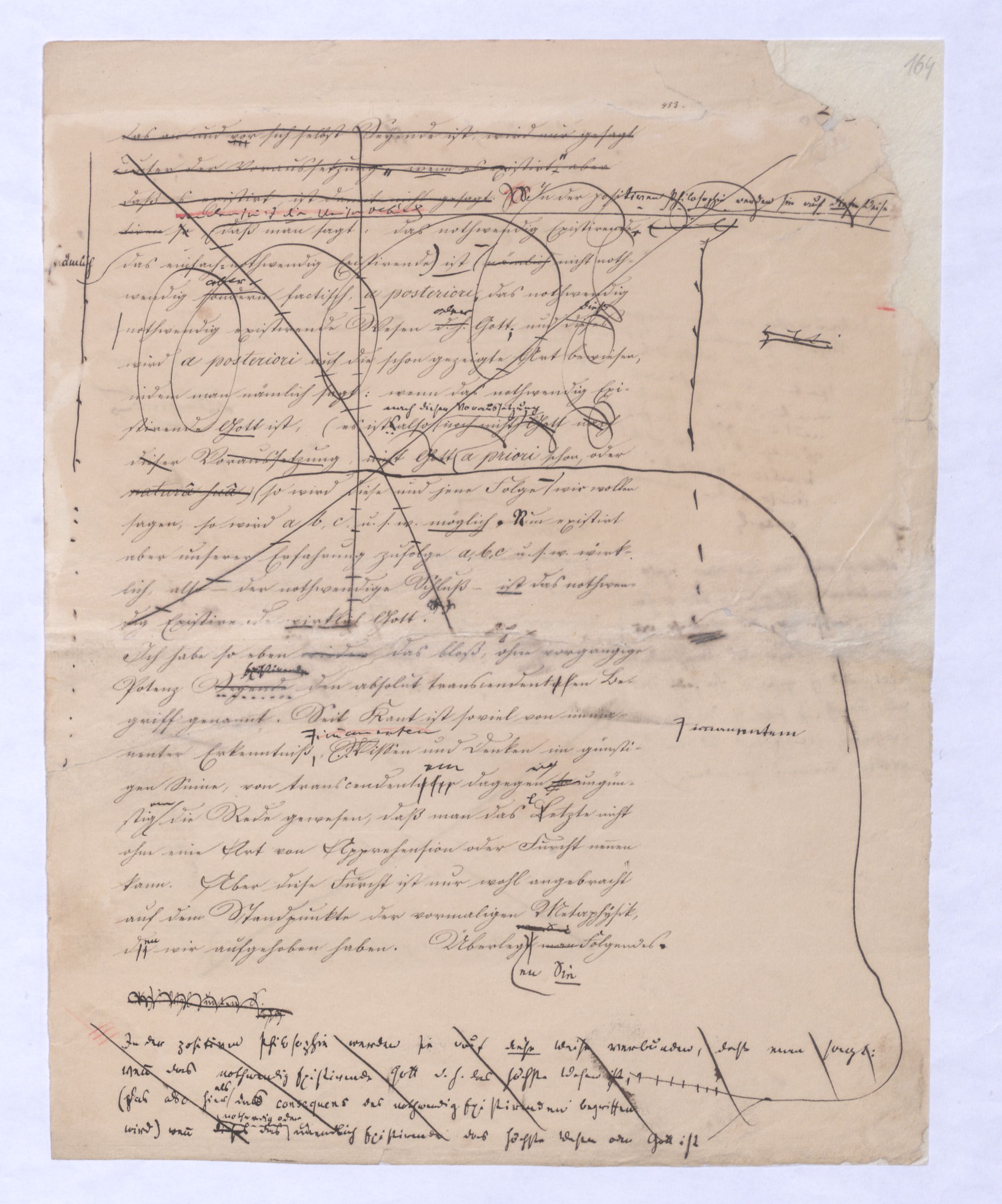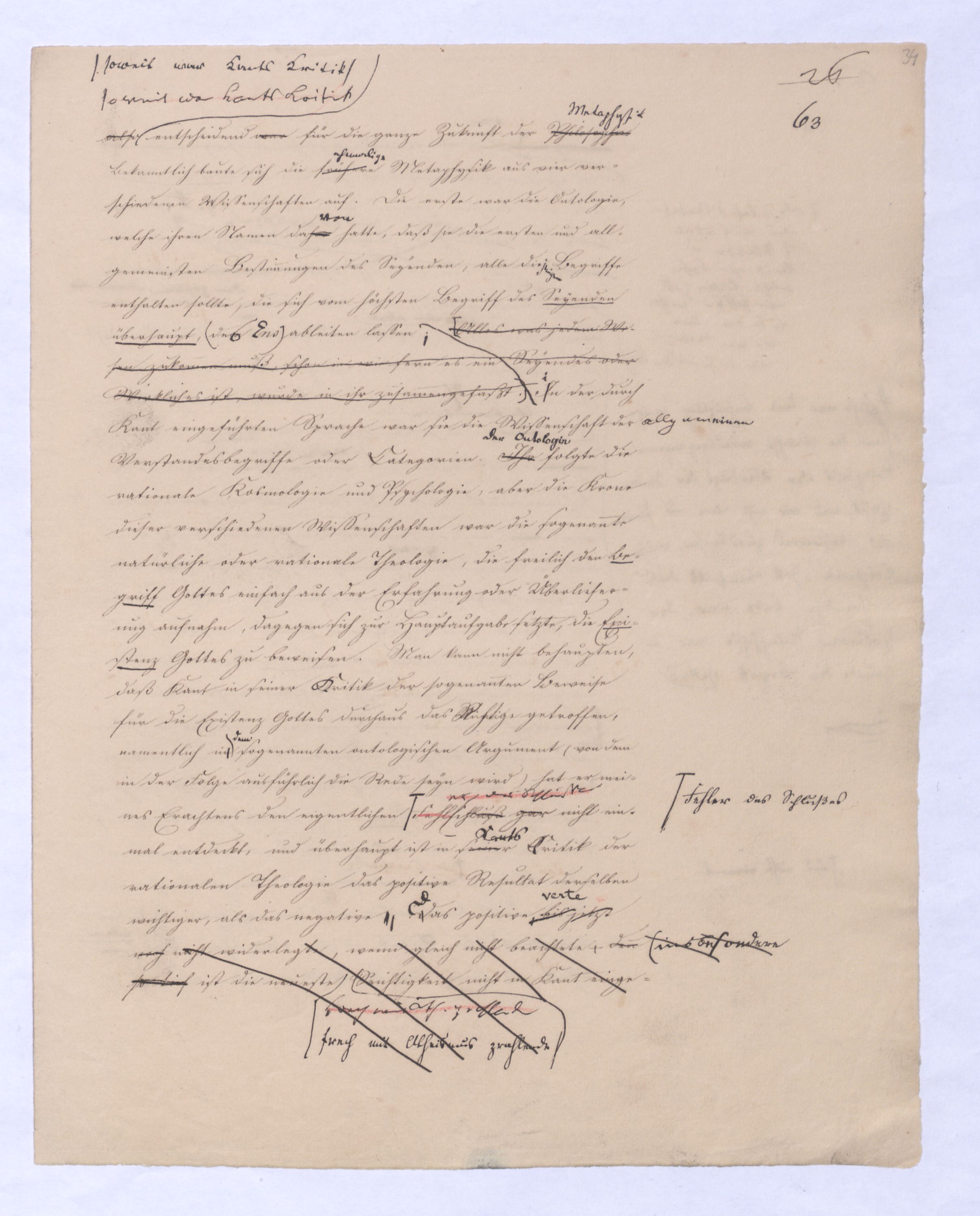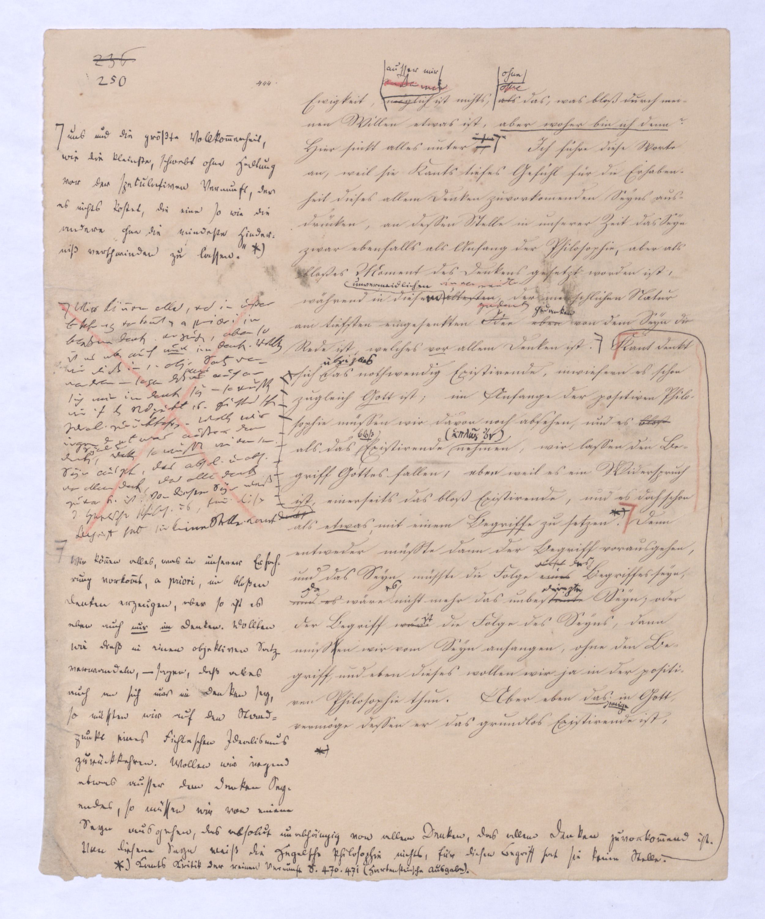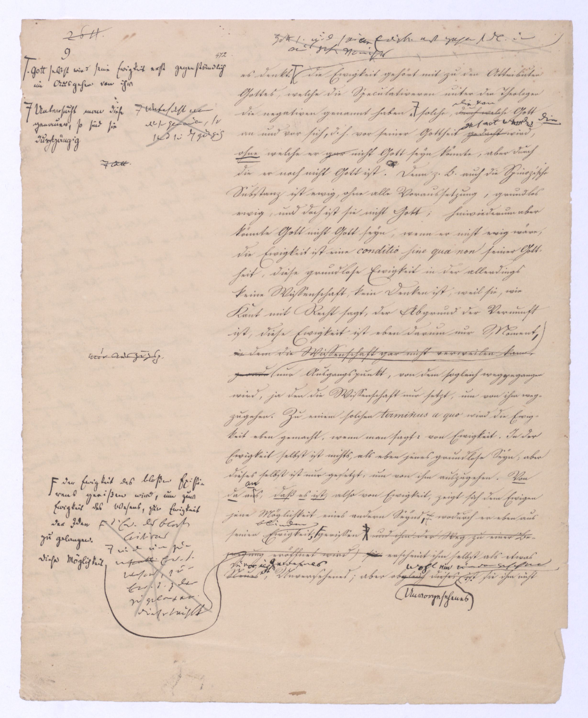 (von dem in der Folge ausführlich die Rede seyn wird) hat er meines Erachtens den eigentlichen Fehlschluß garer des Schlusses nicht einmal entdeckt, und überhaupt ist in seinerKants Critik der rationalen Theologie das positive Resultat derselben wichtiger, als das negative. Das positive bis jetzt noch nicht widerlegte, wenn gleich nicht beachtete – denn so tief ist die neueste frech mit Ath. prahlende Seichtigkeit nicht in Kant eingedrungen, dieß als Unwiderlegliches in ihm zu finden, ist war daß Gott nicht der zufällige, sondern der nothwendige Inhalt der letzten, höchsten Vernunftidee sei. (Dieß war keine Behauptung wen. der früherenzunächst vorausgegangenen Metaphysik, der im Grunde, was den Begriff Gottes betrifft, diesen Be oder überh. d. Metaph. wenn wir nicht etwa auf Platon und Arist. zurückgehen, welchem letzteren Gott ebenfalls d. nothw. Ende war. Der späteren Metaph. war im Grunde der Begriff Gottes ebenso zufällig wie alle andern waren.) Daran aberDem + schloß sich aber das negative Resultat an, daß die Vernunft das wirkliche Seyn Gottes nicht zu erkennen vermöge, Gott eben bloß höchste Idee, eben darum auch immer nur Ende bliebbleiben müsse das es nie wieder zum Anfang, also zum Princip irgend einer Wissenschaft bringen kannwerden könne, oder, wie er sich ausdrückt, daß diese Idee stets nur von regulativem,