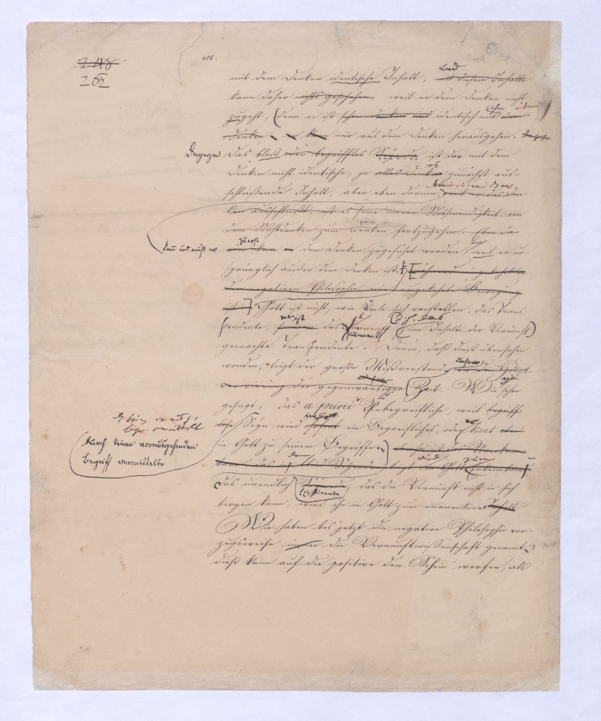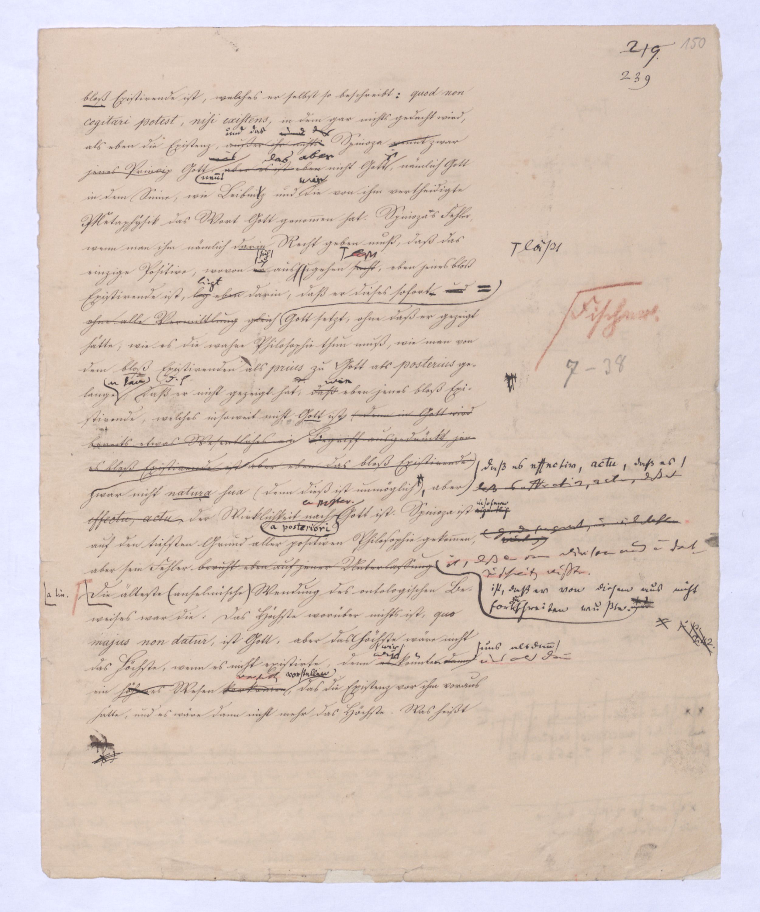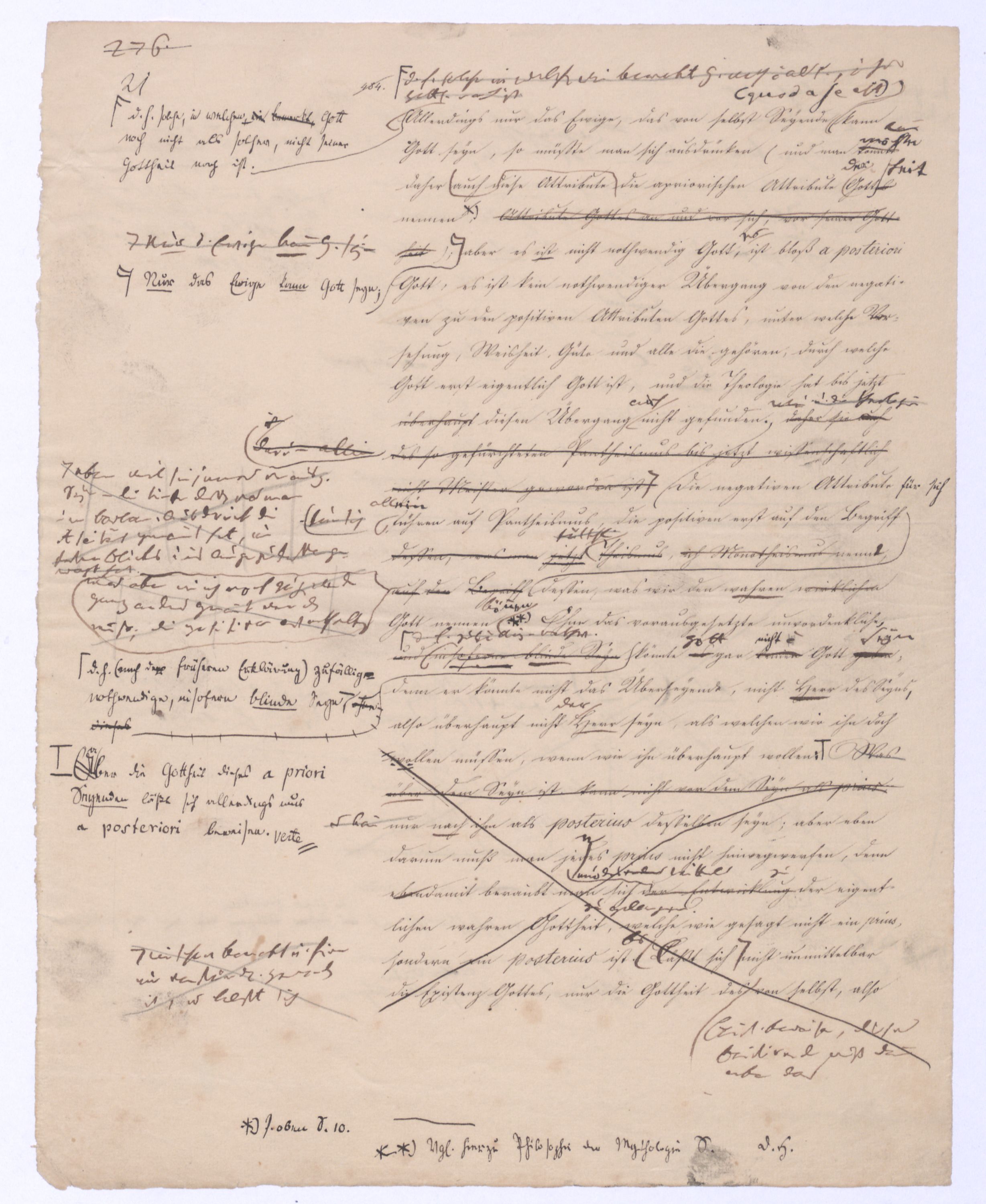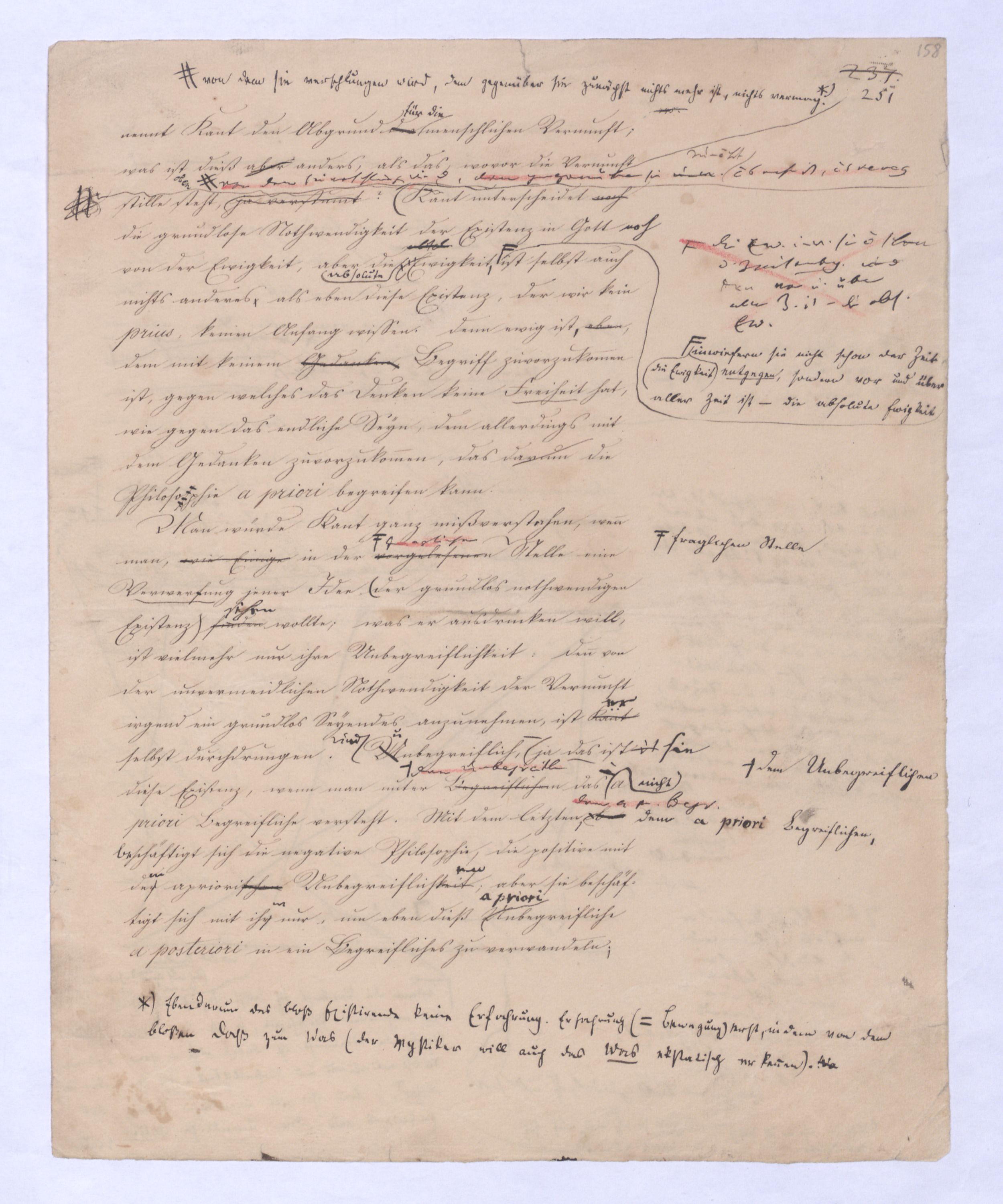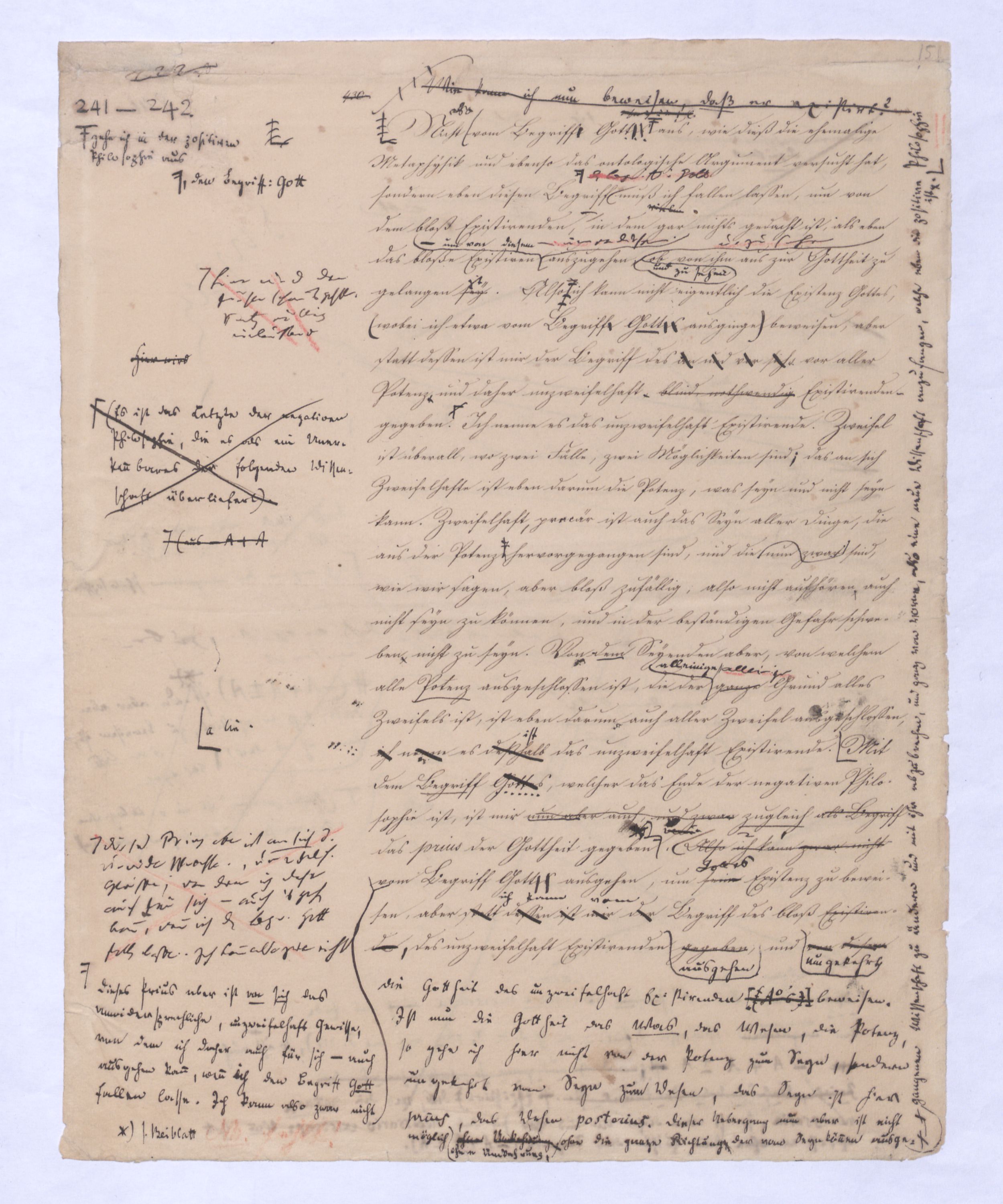 (von dem in der Folge ausführlich die Rede seyn wird) hat er meines Erachtens den eigentlichen Fehlschluß garer des Schlusses nicht einmal entdeckt, und überhaupt ist in seinerKants Critik der rationalen Theologie das positive Resultat derselben wichtiger, als das negative. Das positive bis jetzt noch nicht widerlegte, wenn gleich nicht beachtete – denn so tief ist die neueste frech mit Ath. prahlende Seichtigkeit nicht in Kant eingedrungen, dieß als Unwiderlegliches in ihm zu finden, ist war daß Gott nicht der zufällige, sondern der nothwendige Inhalt der letzten, höchsten Vernunftidee sei. (Dieß war keine Behauptung wen. der früherenzunächst vorausgegangenen Metaphysik, der im Grunde, was den Begriff Gottes betrifft, diesen Be oder überh. d. Metaph. wenn wir nicht etwa auf Platon und Arist. zurückgehen, welchem letzteren Gott ebenfalls d. nothw. Ende war. Der späteren Metaph. war im Grunde der Begriff Gottes ebenso zufällig wie alle andern waren.) Daran aberDem + schloß sich aber das negative Resultat an, daß die Vernunft das wirkliche Seyn Gottes nicht zu erkennen vermöge, Gott eben bloß höchste Idee, eben darum auch immer nur Ende bliebbleiben müsse das es nie wieder zum Anfang, also zum Princip irgend einer Wissenschaft bringen kannwerden könne, oder, wie er sich ausdrückt, daß diese Idee stets nur von regulativem,