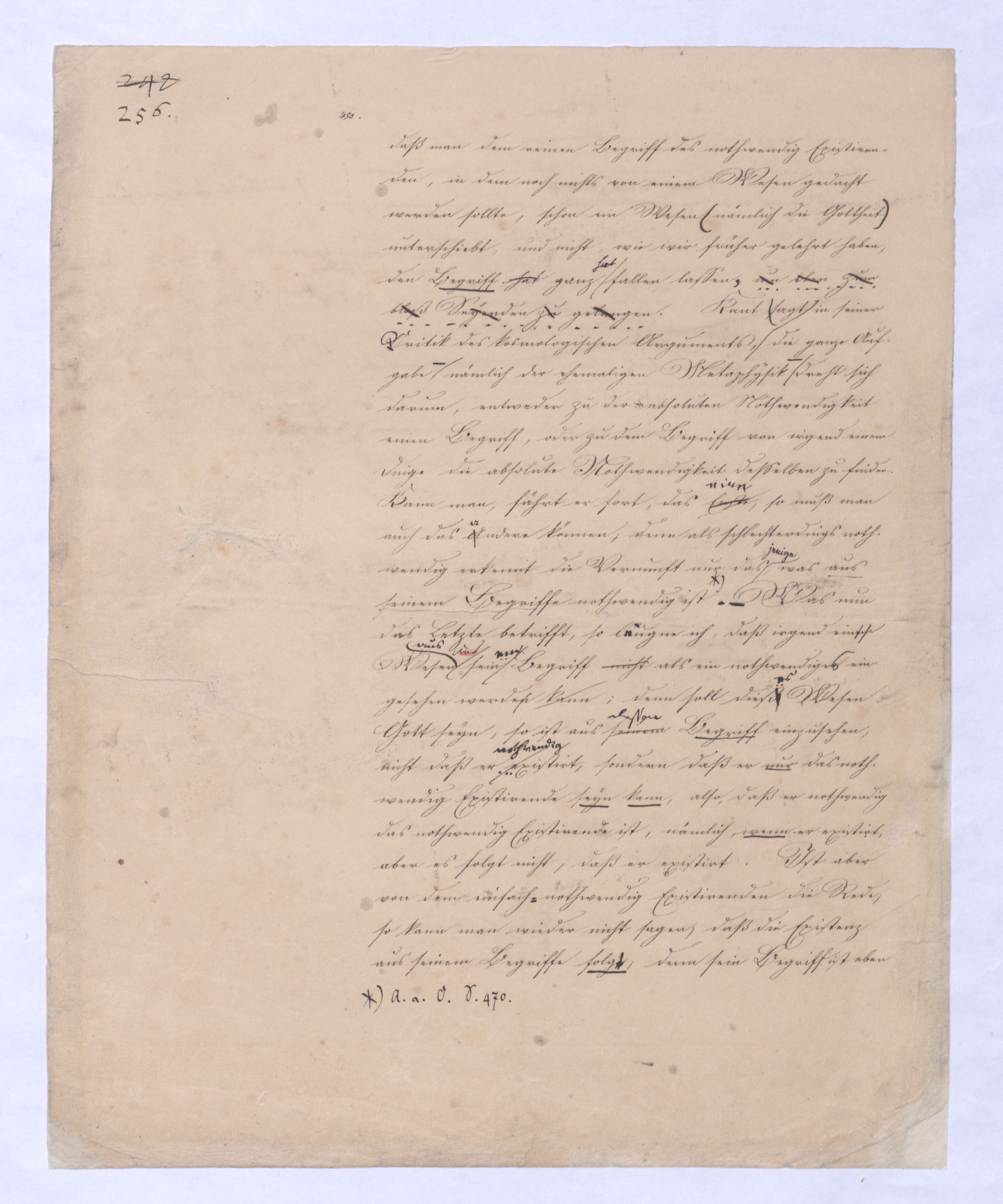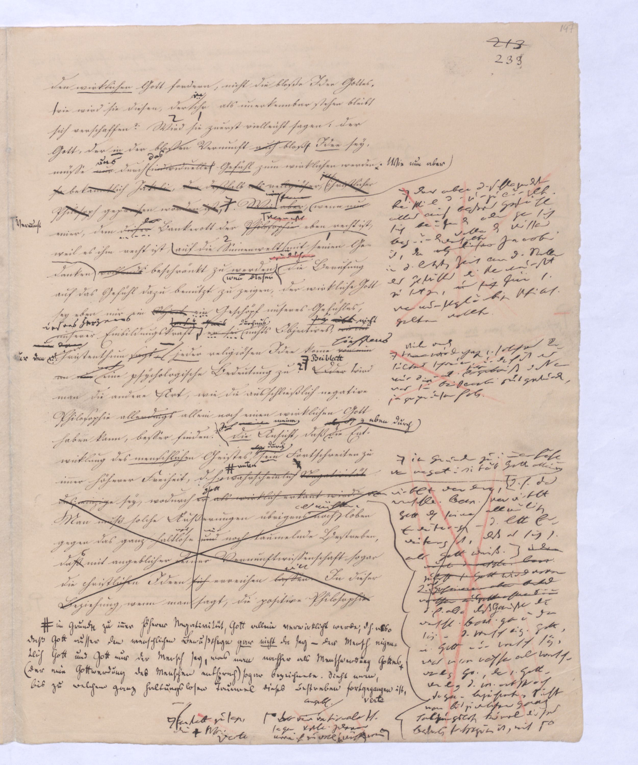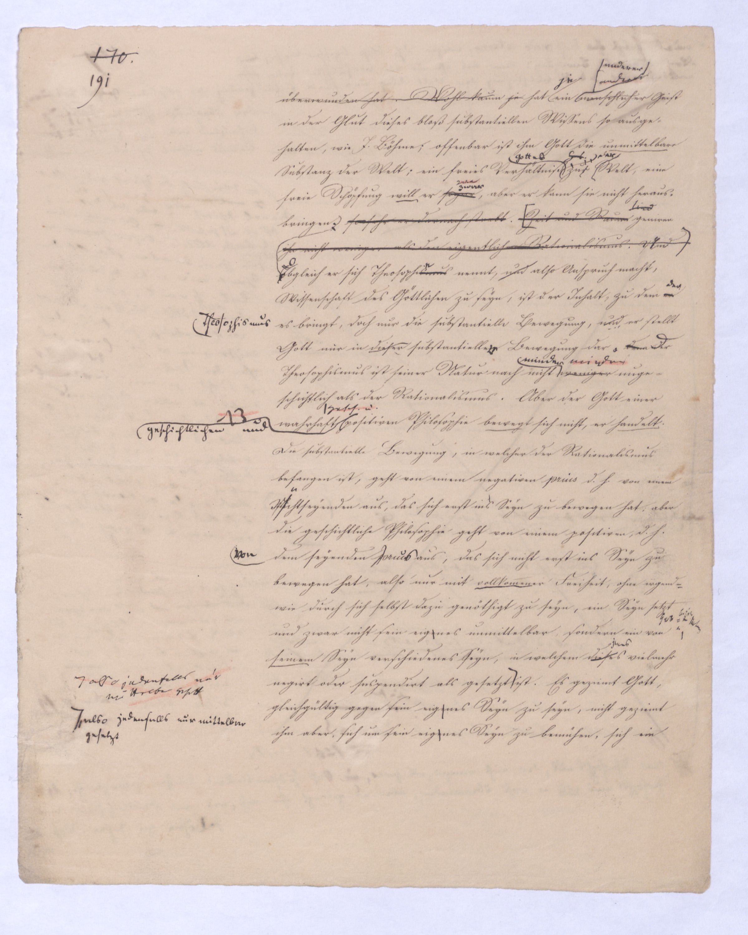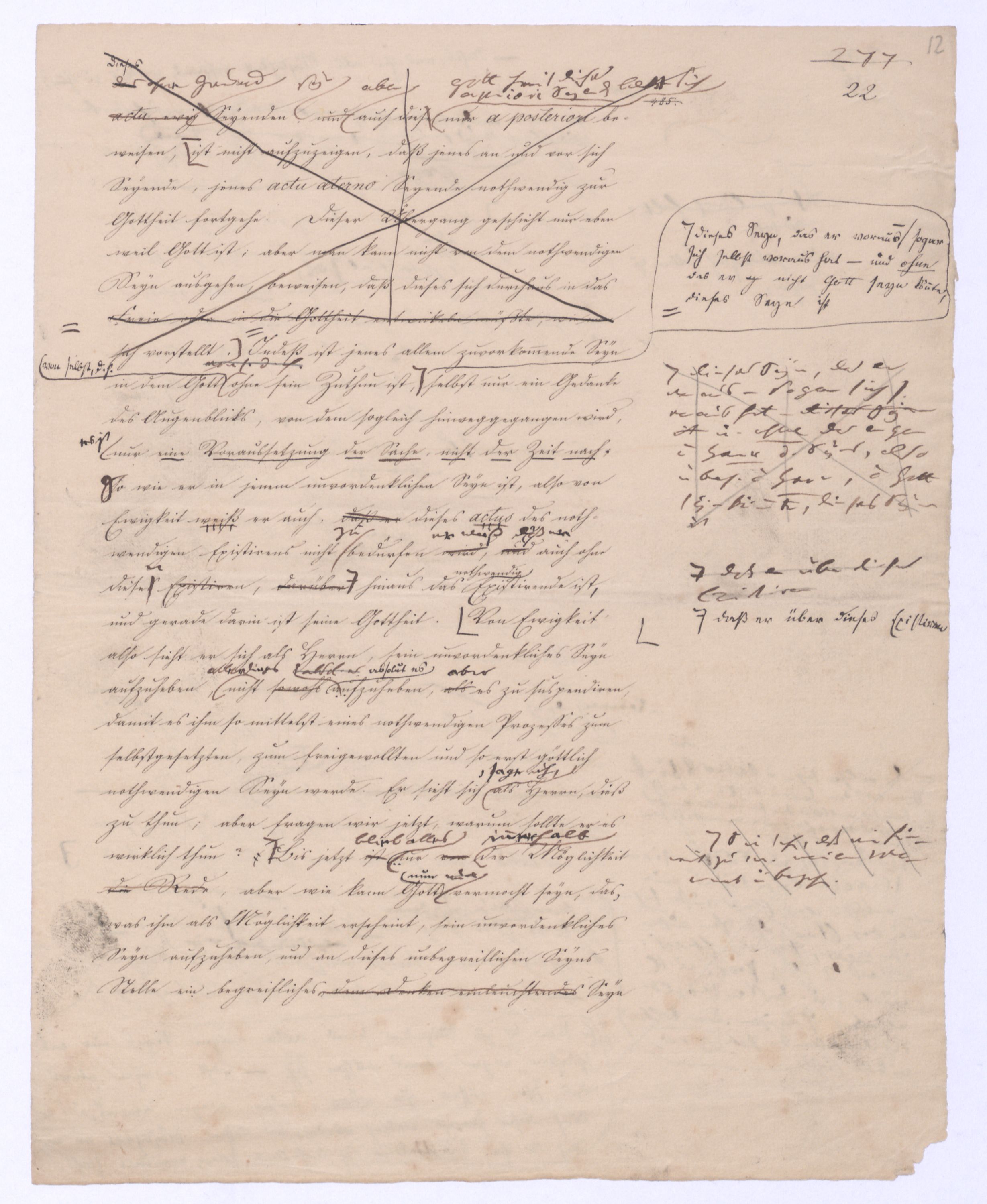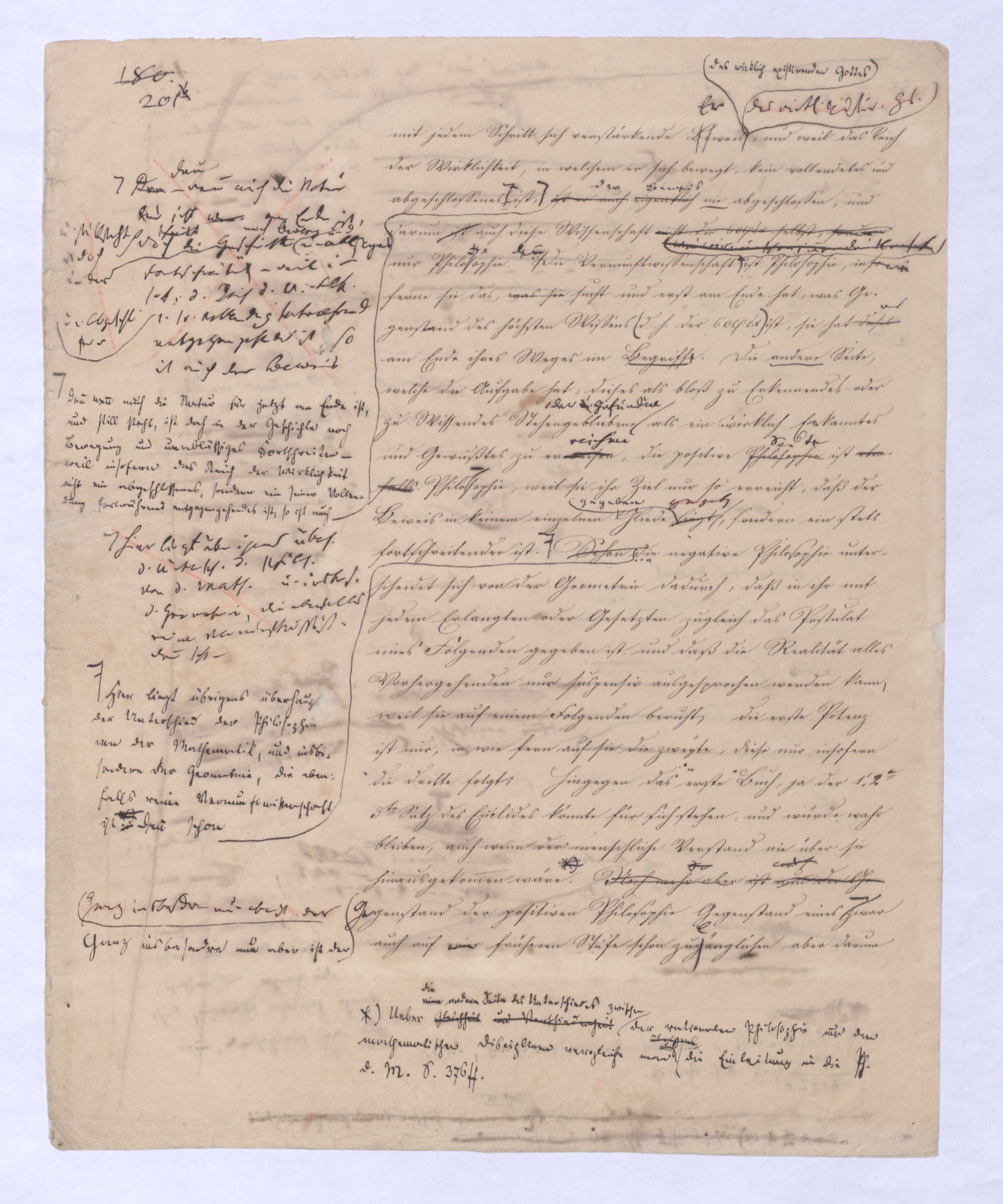 (von dem in der Folge ausführlich die Rede seyn wird) hat er meines Erachtens den eigentlichen Fehlschluß garer des Schlusses nicht einmal entdeckt, und überhaupt ist in seinerKants Critik der rationalen Theologie das positive Resultat derselben wichtiger, als das negative. Das positive bis jetzt noch nicht widerlegte, wenn gleich nicht beachtete – denn so tief ist die neueste frech mit Ath. prahlende Seichtigkeit nicht in Kant eingedrungen, dieß als Unwiderlegliches in ihm zu finden, ist war daß Gott nicht der zufällige, sondern der nothwendige Inhalt der letzten, höchsten Vernunftidee sei. (Dieß war keine Behauptung wen. der früherenzunächst vorausgegangenen Metaphysik, der im Grunde, was den Begriff Gottes betrifft, diesen Be oder überh. d. Metaph. wenn wir nicht etwa auf Platon und Arist. zurückgehen, welchem letzteren Gott ebenfalls d. nothw. Ende war. Der späteren Metaph. war im Grunde der Begriff Gottes ebenso zufällig wie alle andern waren.) Daran aberDem + schloß sich aber das negative Resultat an, daß die Vernunft das wirkliche Seyn Gottes nicht zu erkennen vermöge, Gott eben bloß höchste Idee, eben darum auch immer nur Ende bliebbleiben müsse das es nie wieder zum Anfang, also zum Princip irgend einer Wissenschaft bringen kannwerden könne, oder, wie er sich ausdrückt, daß diese Idee stets nur von regulativem,
