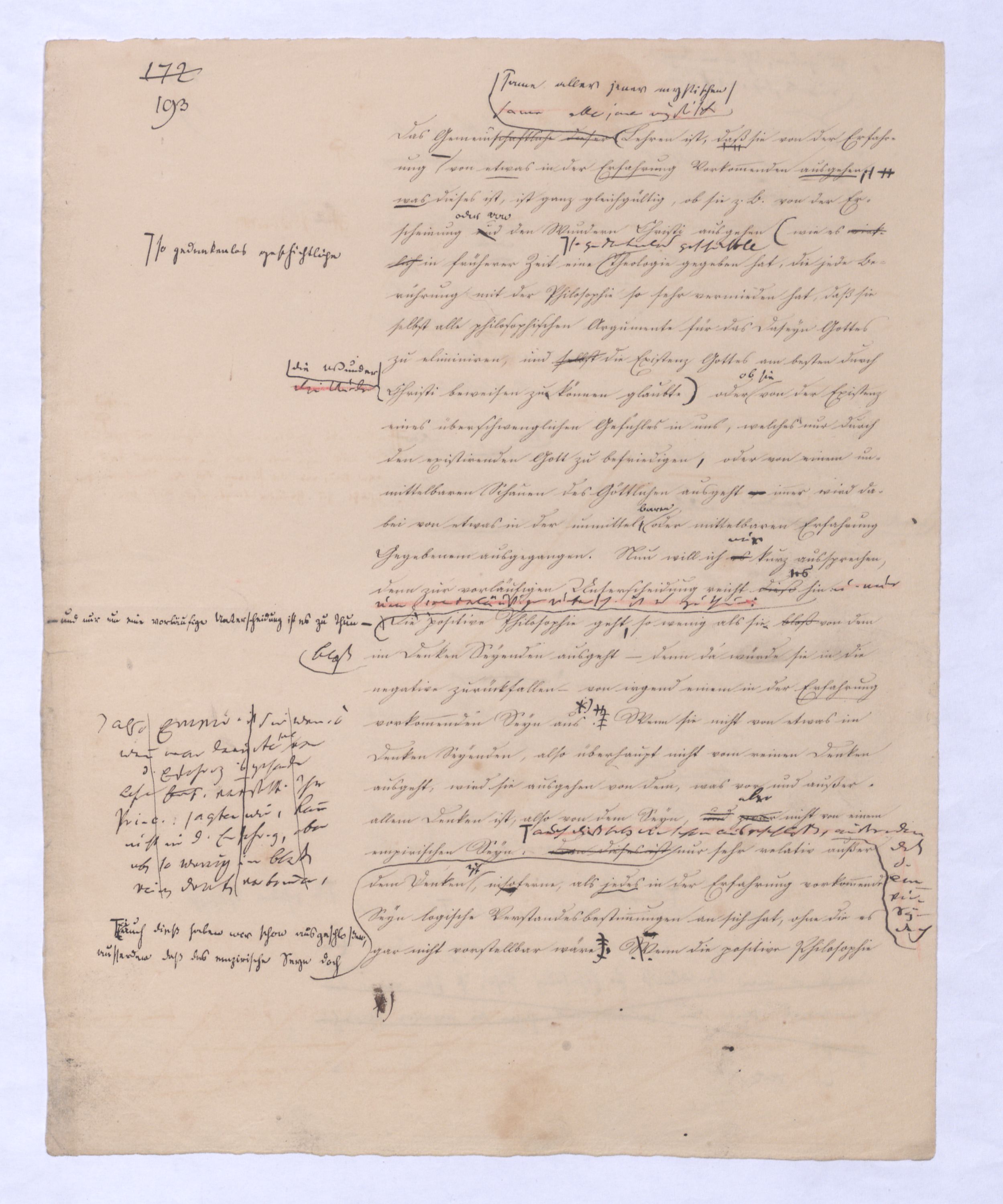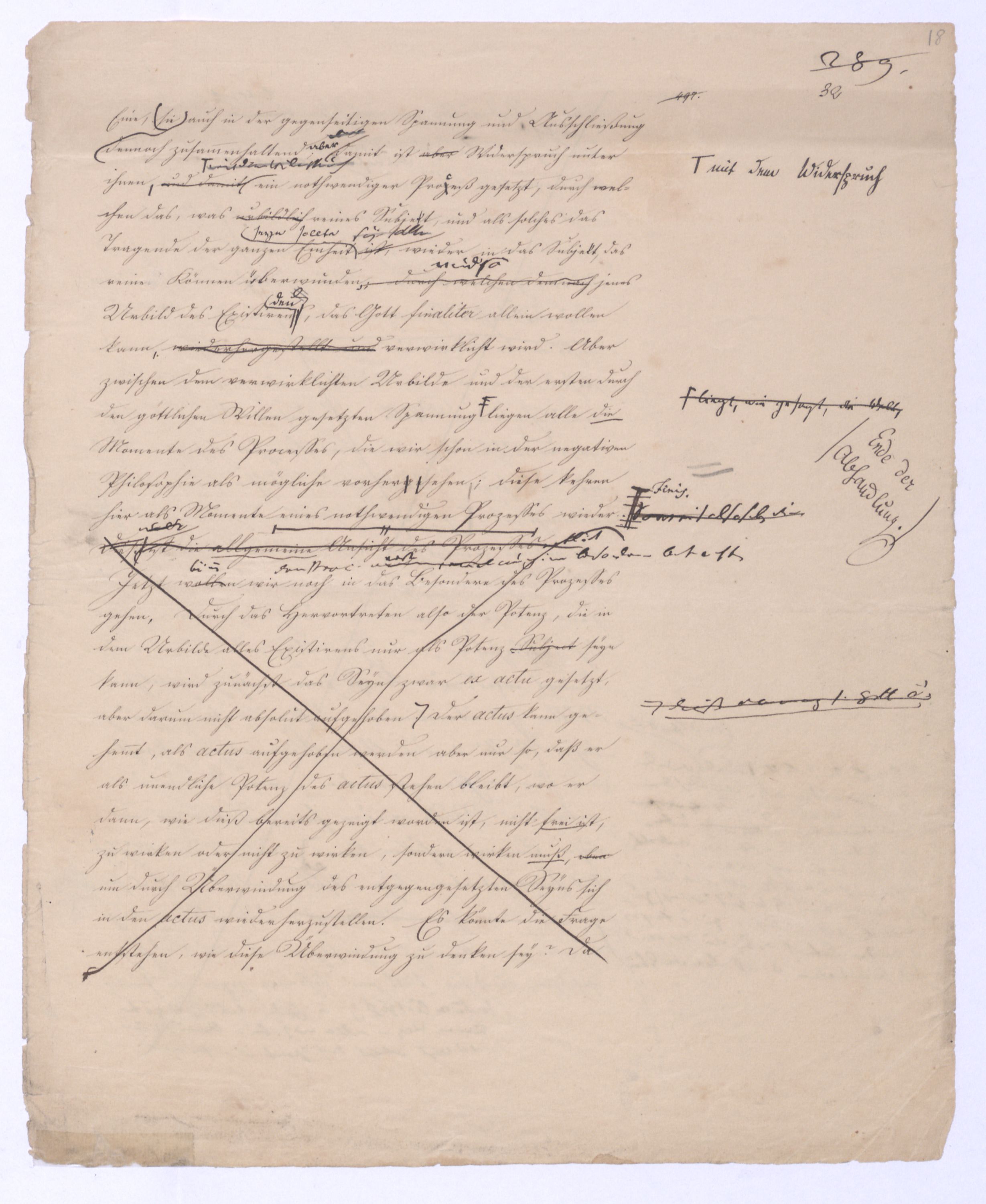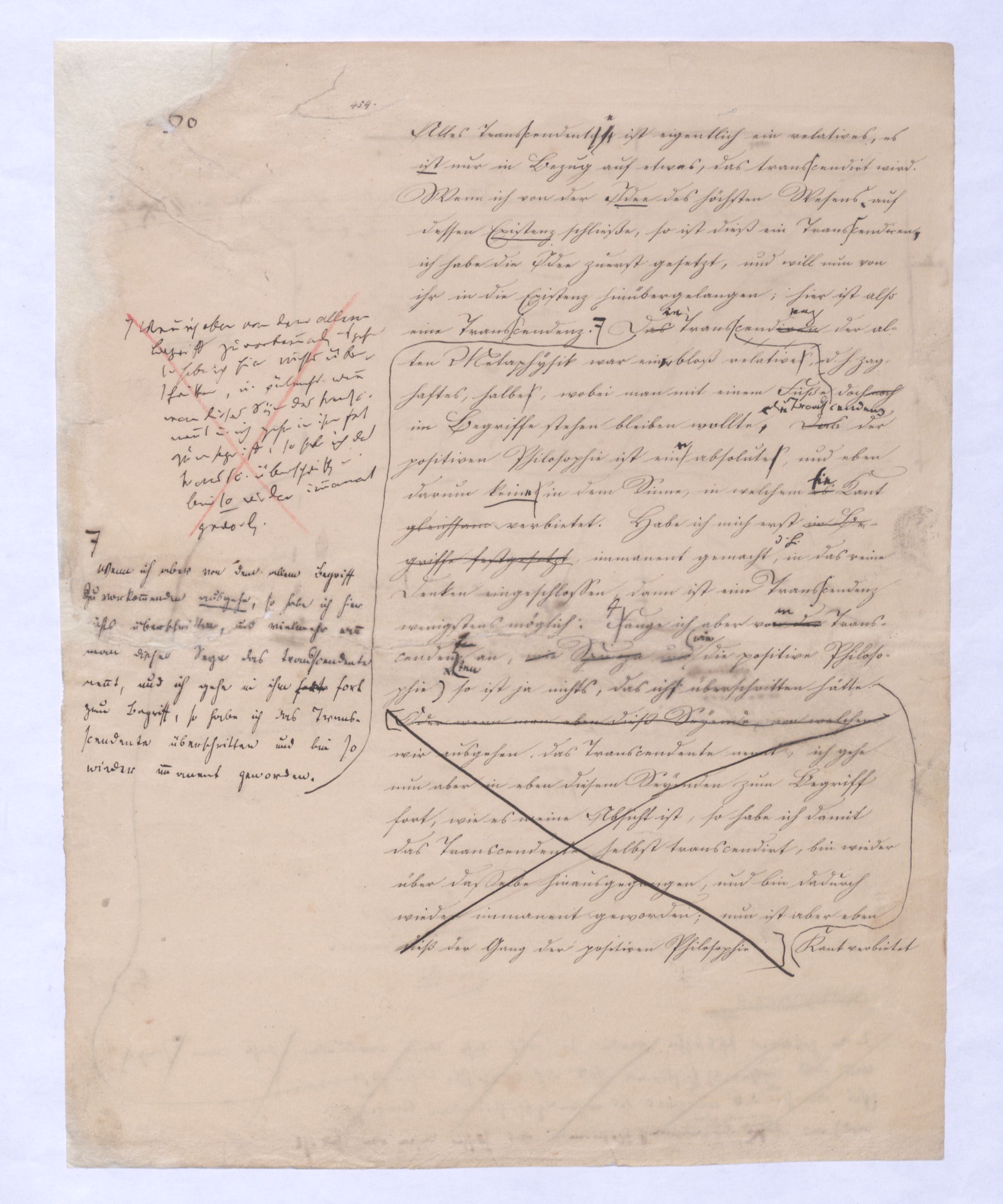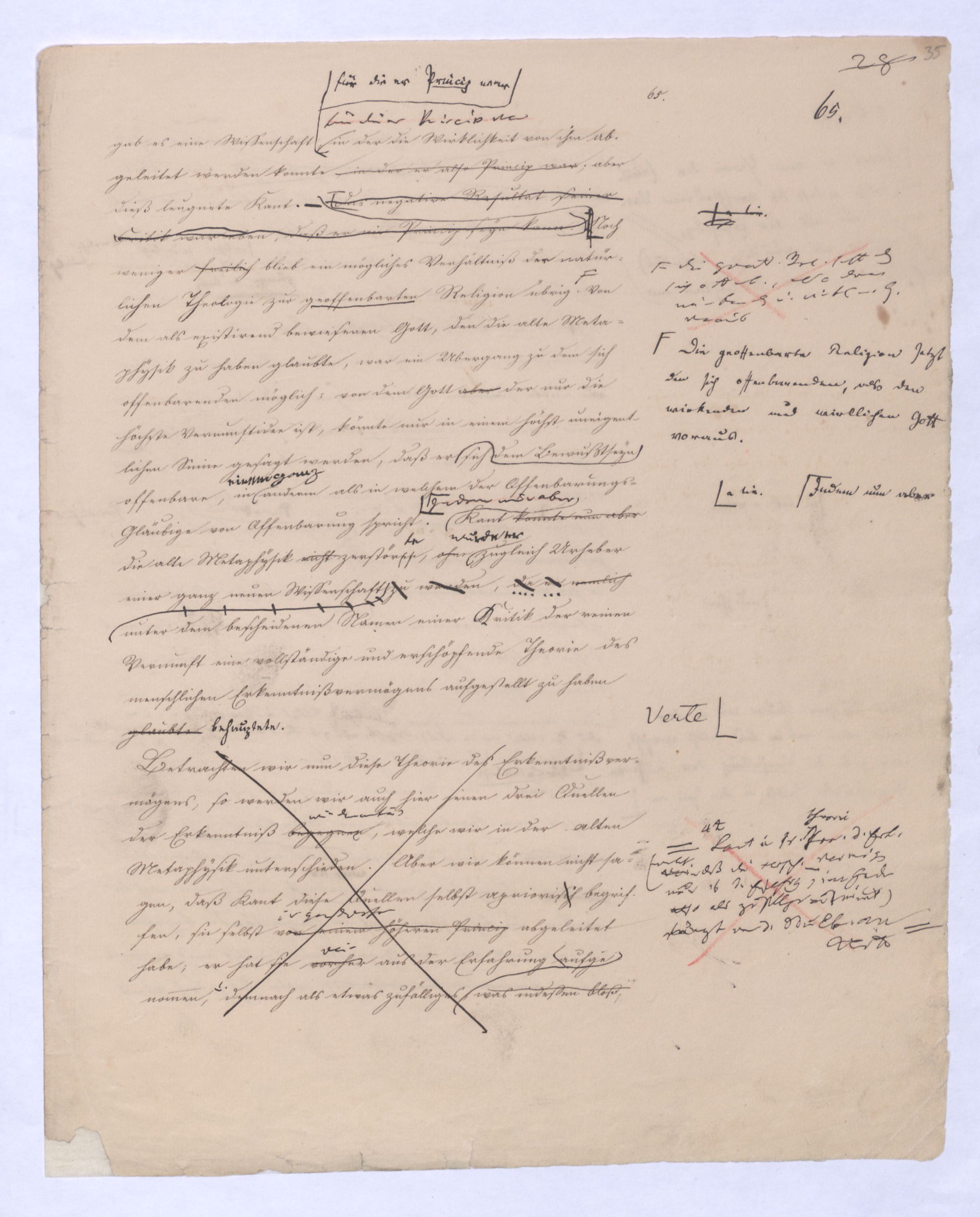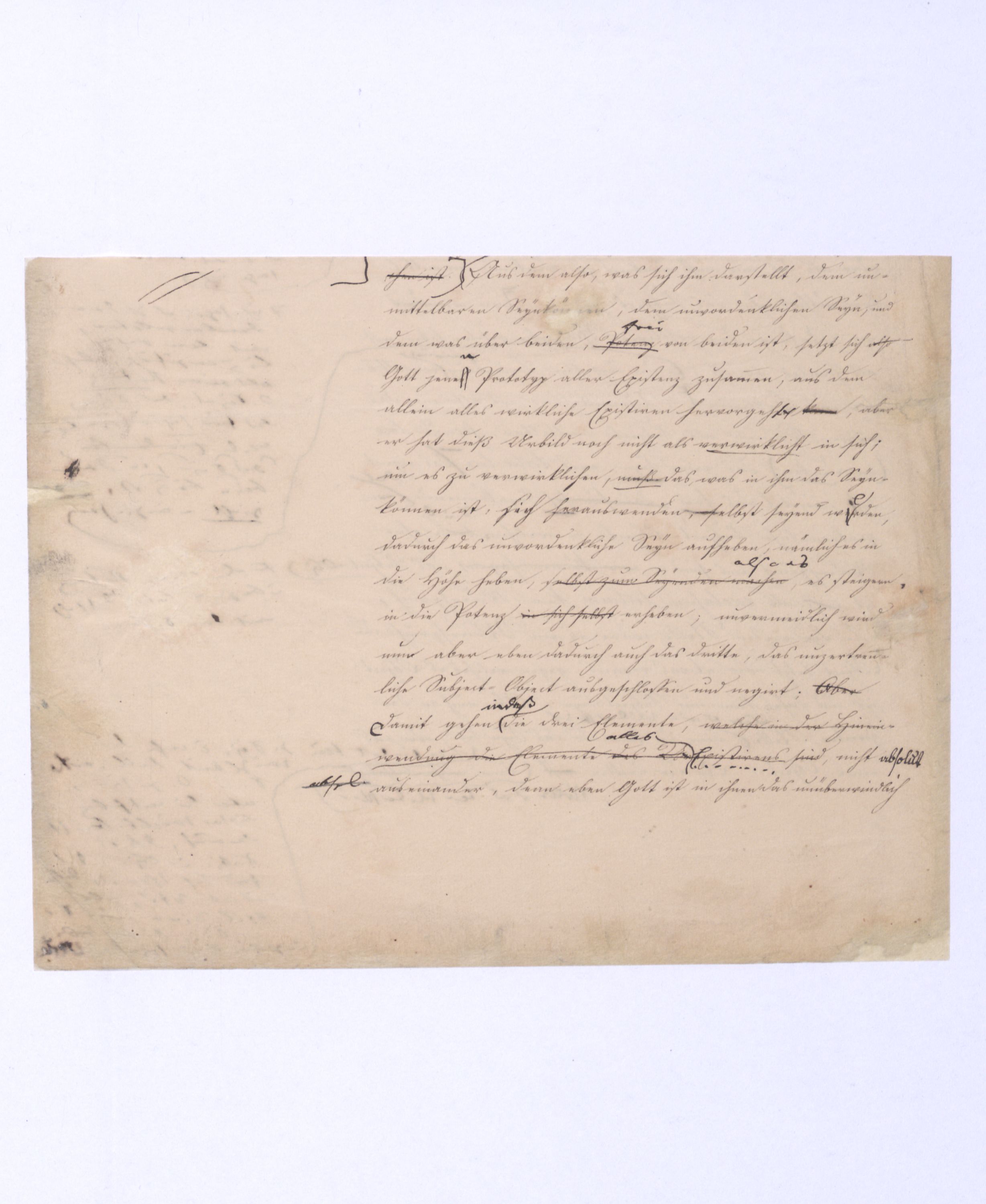 (von dem in der Folge ausführlich die Rede seyn wird) hat er meines Erachtens den eigentlichen Fehlschluß garer des Schlusses nicht einmal entdeckt, und überhaupt ist in seinerKants Critik der rationalen Theologie das positive Resultat derselben wichtiger, als das negative. Das positive bis jetzt noch nicht widerlegte, wenn gleich nicht beachtete – denn so tief ist die neueste frech mit Ath. prahlende Seichtigkeit nicht in Kant eingedrungen, dieß als Unwiderlegliches in ihm zu finden, ist war daß Gott nicht der zufällige, sondern der nothwendige Inhalt der letzten, höchsten Vernunftidee sei. (Dieß war keine Behauptung wen. der früherenzunächst vorausgegangenen Metaphysik, der im Grunde, was den Begriff Gottes betrifft, diesen Be oder überh. d. Metaph. wenn wir nicht etwa auf Platon und Arist. zurückgehen, welchem letzteren Gott ebenfalls d. nothw. Ende war. Der späteren Metaph. war im Grunde der Begriff Gottes ebenso zufällig wie alle andern waren.) Daran aberDem + schloß sich aber das negative Resultat an, daß die Vernunft das wirkliche Seyn Gottes nicht zu erkennen vermöge, Gott eben bloß höchste Idee, eben darum auch immer nur Ende bliebbleiben müsse das es nie wieder zum Anfang, also zum Princip irgend einer Wissenschaft bringen kannwerden könne, oder, wie er sich ausdrückt, daß diese Idee stets nur von regulativem,
