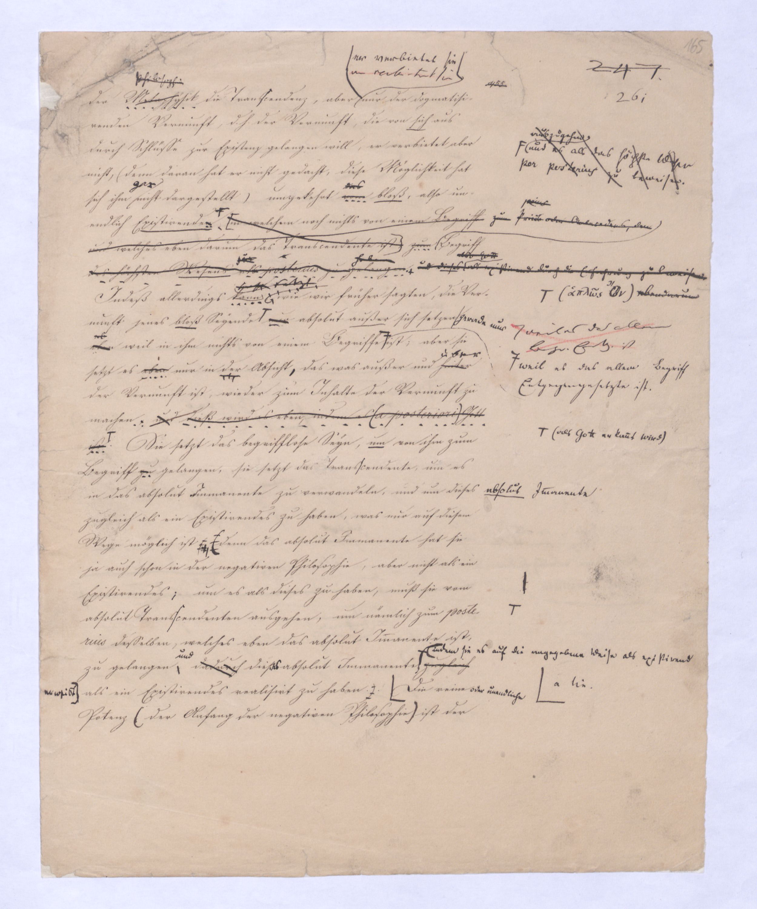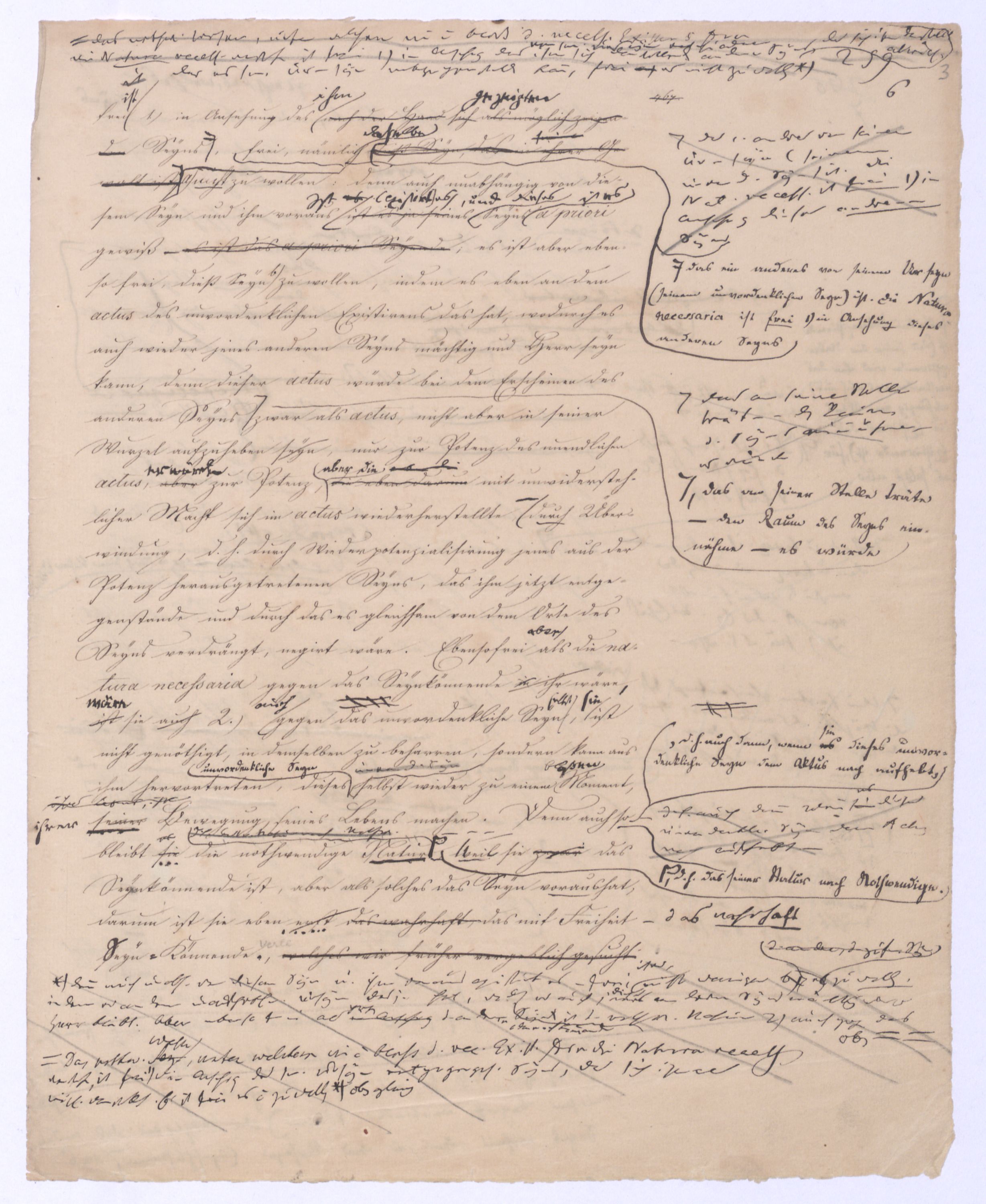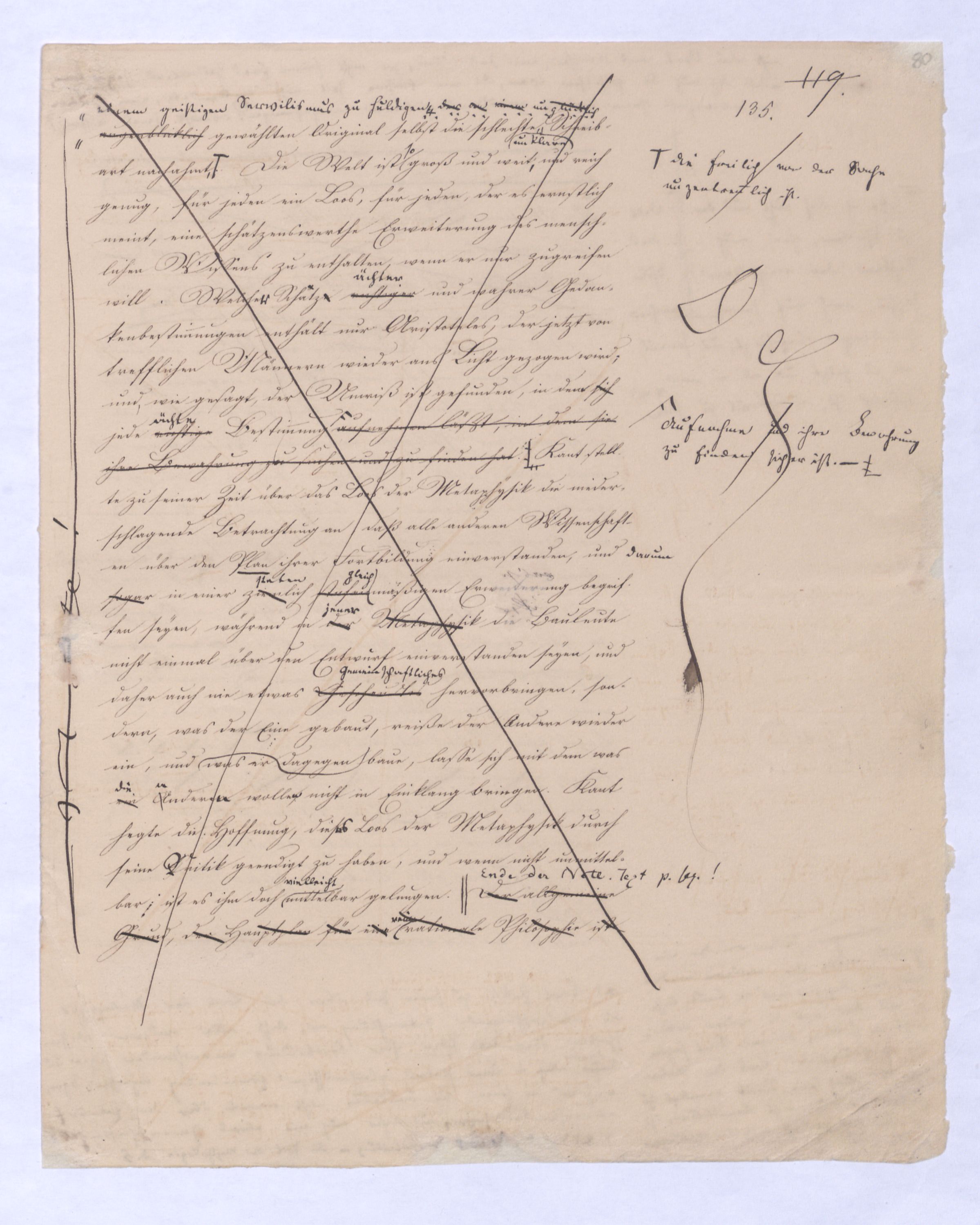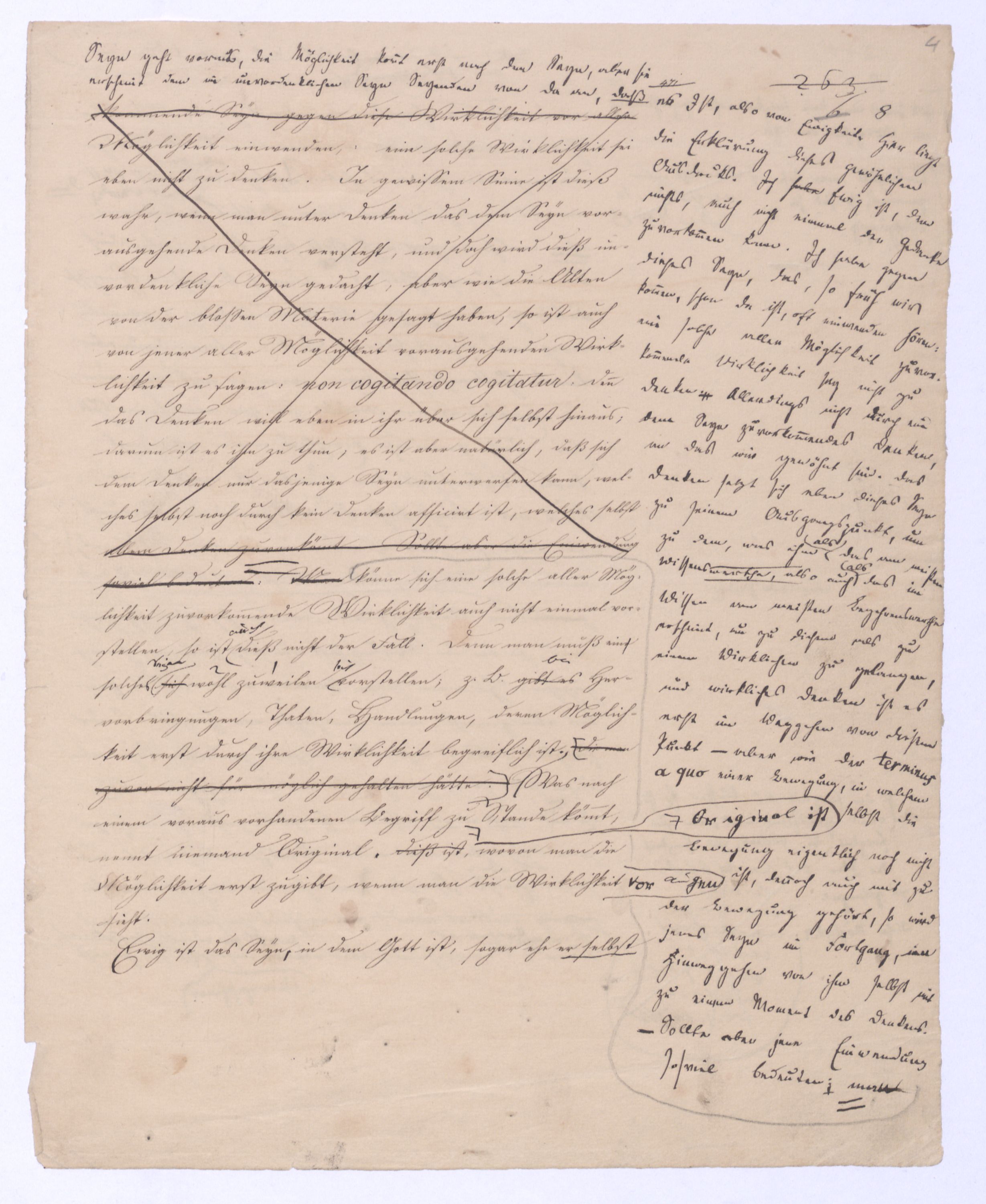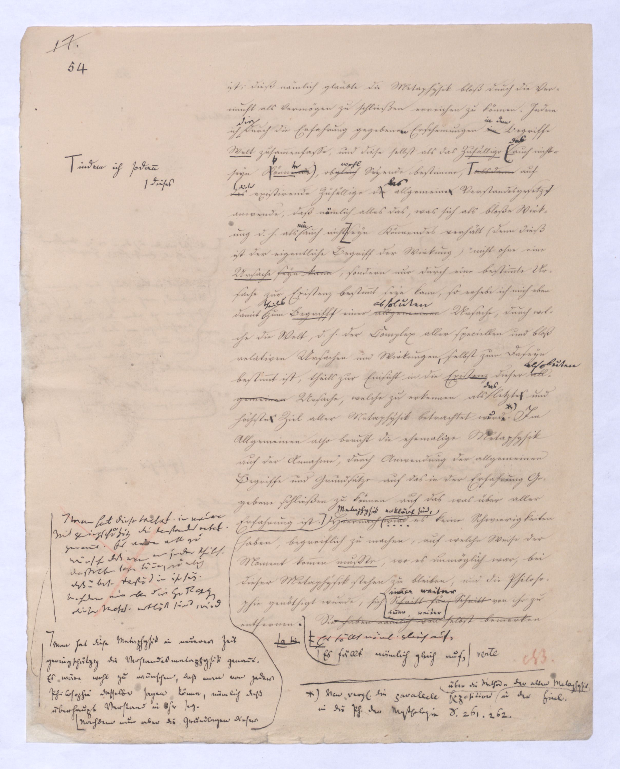 (von dem in der Folge ausführlich die Rede seyn wird) hat er meines Erachtens den eigentlichen Fehlschluß garer des Schlusses nicht einmal entdeckt, und überhaupt ist in seinerKants Critik der rationalen Theologie das positive Resultat derselben wichtiger, als das negative. Das positive bis jetzt noch nicht widerlegte, wenn gleich nicht beachtete – denn so tief ist die neueste frech mit Ath. prahlende Seichtigkeit nicht in Kant eingedrungen, dieß als Unwiderlegliches in ihm zu finden, ist war daß Gott nicht der zufällige, sondern der nothwendige Inhalt der letzten, höchsten Vernunftidee sei. (Dieß war keine Behauptung wen. der früherenzunächst vorausgegangenen Metaphysik, der im Grunde, was den Begriff Gottes betrifft, diesen Be oder überh. d. Metaph. wenn wir nicht etwa auf Platon und Arist. zurückgehen, welchem letzteren Gott ebenfalls d. nothw. Ende war. Der späteren Metaph. war im Grunde der Begriff Gottes ebenso zufällig wie alle andern waren.) Daran aberDem + schloß sich aber das negative Resultat an, daß die Vernunft das wirkliche Seyn Gottes nicht zu erkennen vermöge, Gott eben bloß höchste Idee, eben darum auch immer nur Ende bliebbleiben müsse das es nie wieder zum Anfang, also zum Princip irgend einer Wissenschaft bringen kannwerden könne, oder, wie er sich ausdrückt, daß diese Idee stets nur von regulativem,