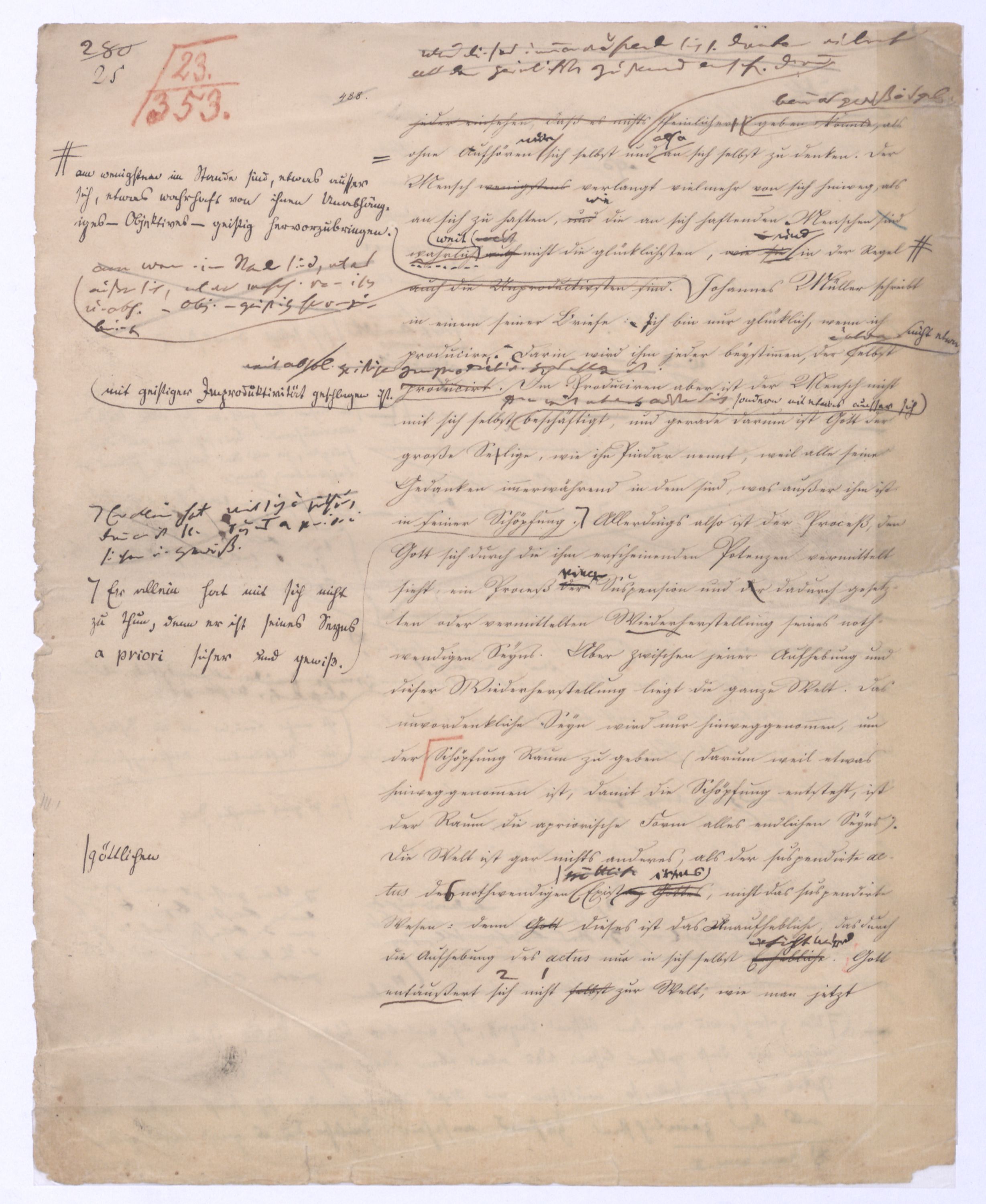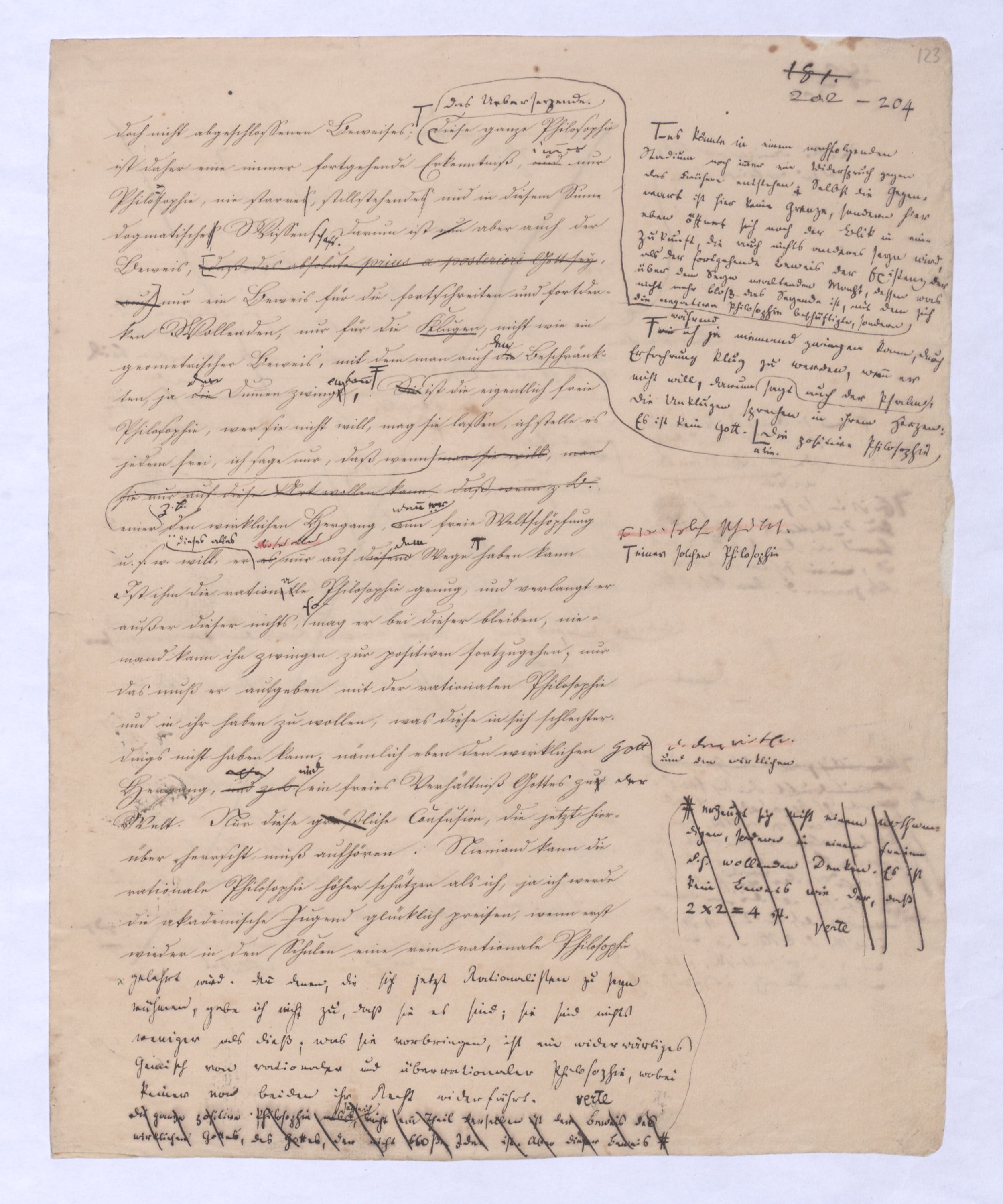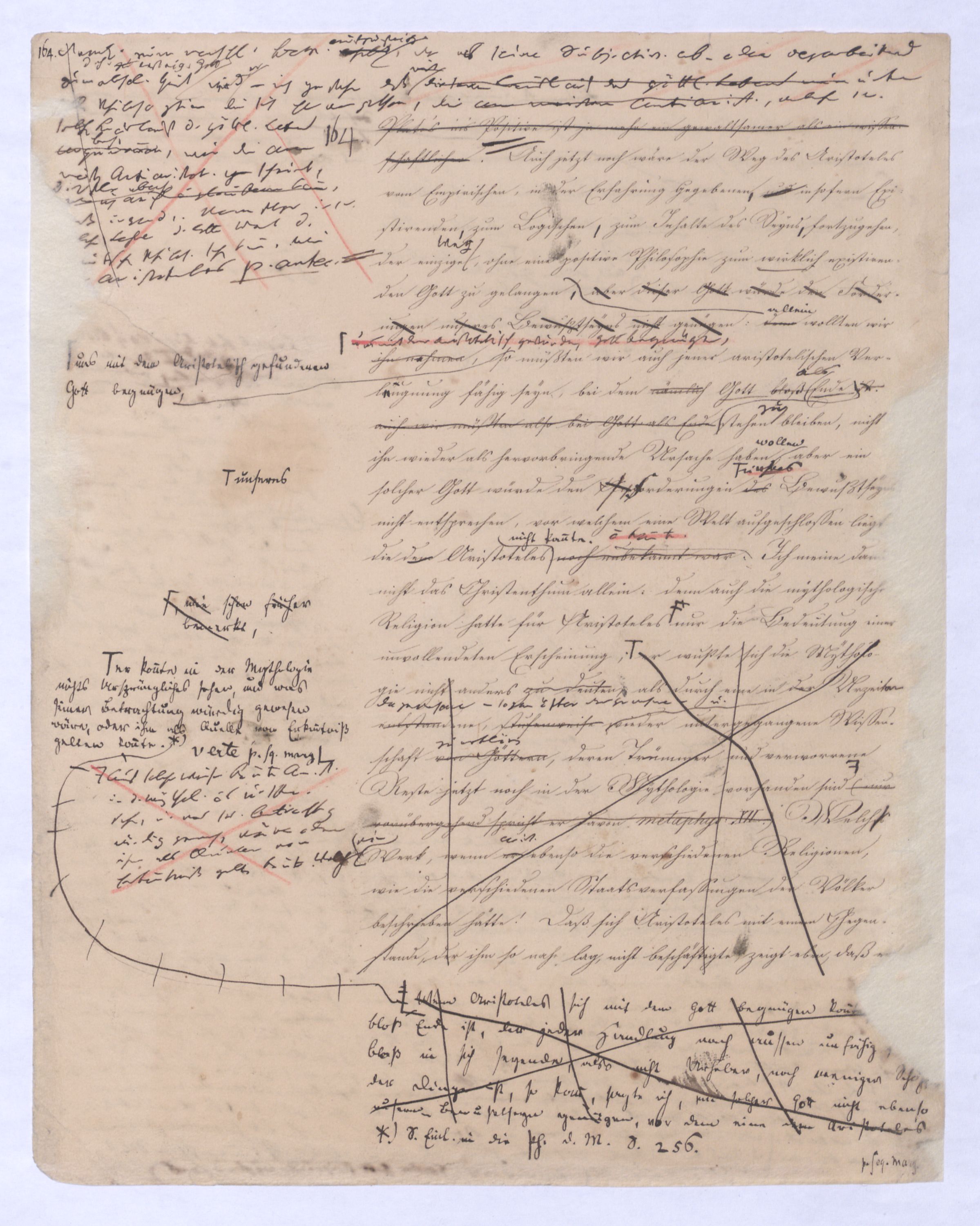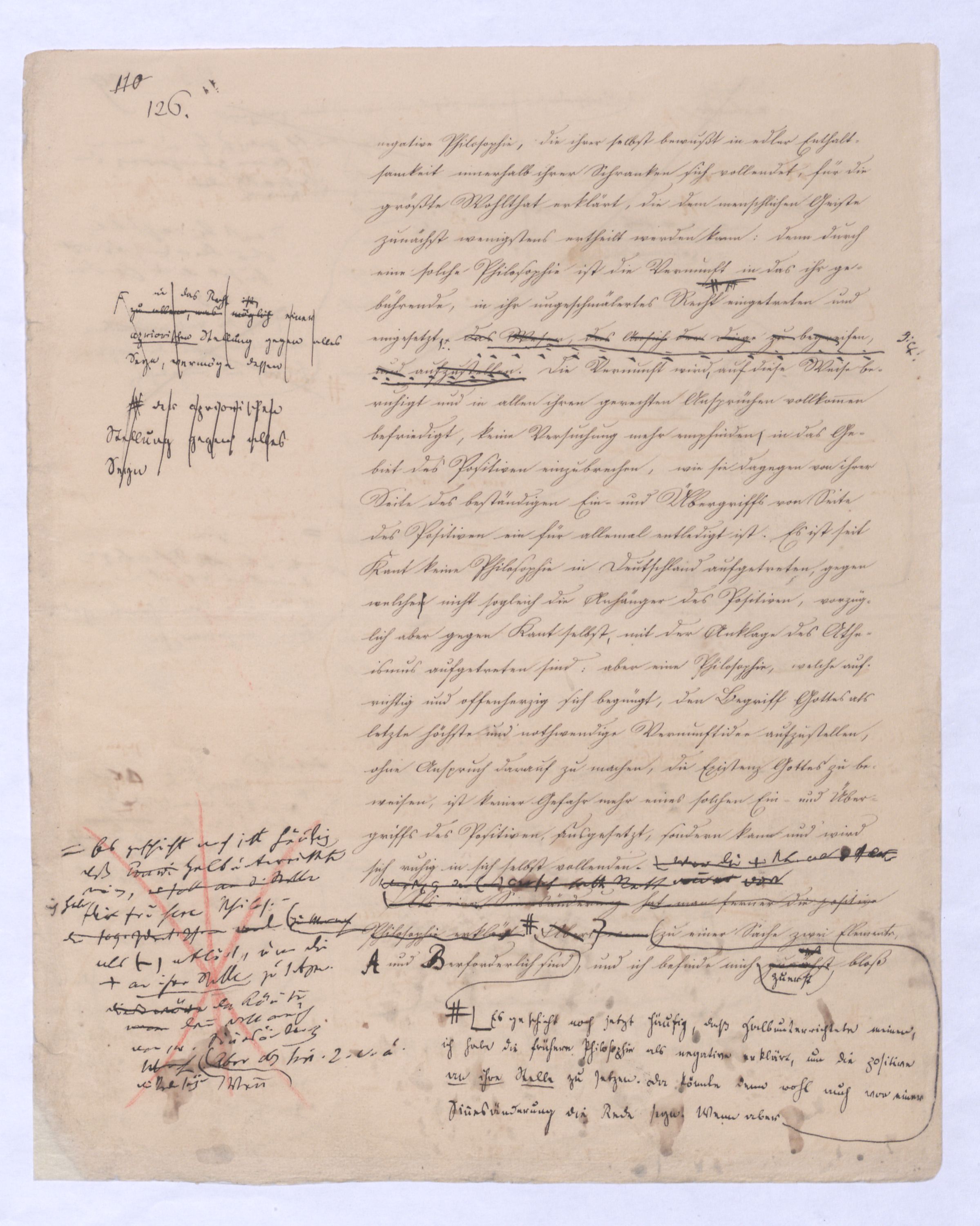 (von dem in der Folge ausführlich die Rede seyn wird) hat er meines Erachtens den eigentlichen Fehlschluß garer des Schlusses nicht einmal entdeckt, und überhaupt ist in seinerKants Critik der rationalen Theologie das positive Resultat derselben wichtiger, als das negative. Das positive bis jetzt noch nicht widerlegte, wenn gleich nicht beachtete – denn so tief ist die neueste frech mit Ath. prahlende Seichtigkeit nicht in Kant eingedrungen, dieß als Unwiderlegliches in ihm zu finden, ist war daß Gott nicht der zufällige, sondern der nothwendige Inhalt der letzten, höchsten Vernunftidee sei. (Dieß war keine Behauptung wen. der früherenzunächst vorausgegangenen Metaphysik, der im Grunde, was den Begriff Gottes betrifft, diesen Be oder überh. d. Metaph. wenn wir nicht etwa auf Platon und Arist. zurückgehen, welchem letzteren Gott ebenfalls d. nothw. Ende war. Der späteren Metaph. war im Grunde der Begriff Gottes ebenso zufällig wie alle andern waren.) Daran aberDem + schloß sich aber das negative Resultat an, daß die Vernunft das wirkliche Seyn Gottes nicht zu erkennen vermöge, Gott eben bloß höchste Idee, eben darum auch immer nur Ende bliebbleiben müsse das es nie wieder zum Anfang, also zum Princip irgend einer Wissenschaft bringen kannwerden könne, oder, wie er sich ausdrückt, daß diese Idee stets nur von regulativem,