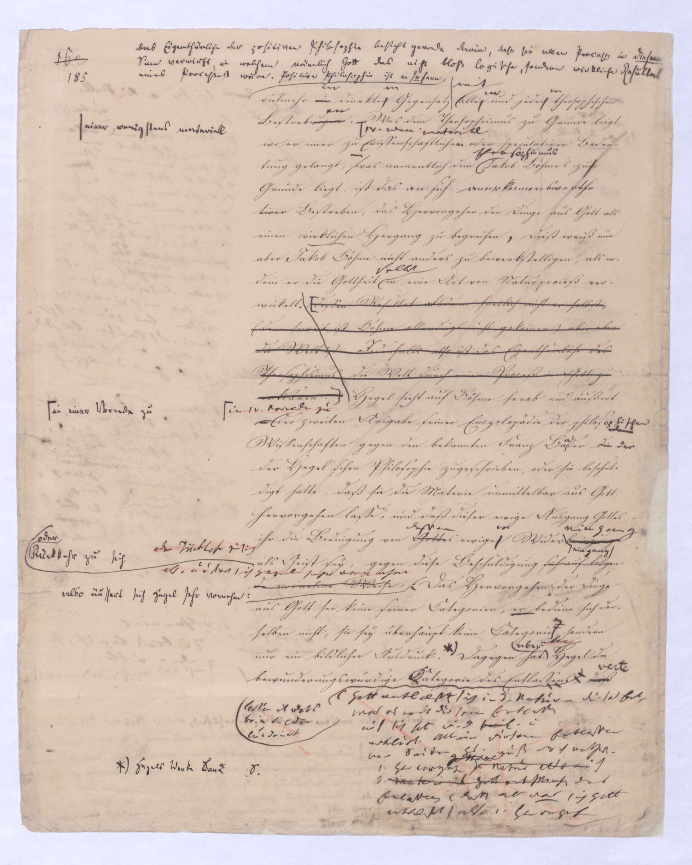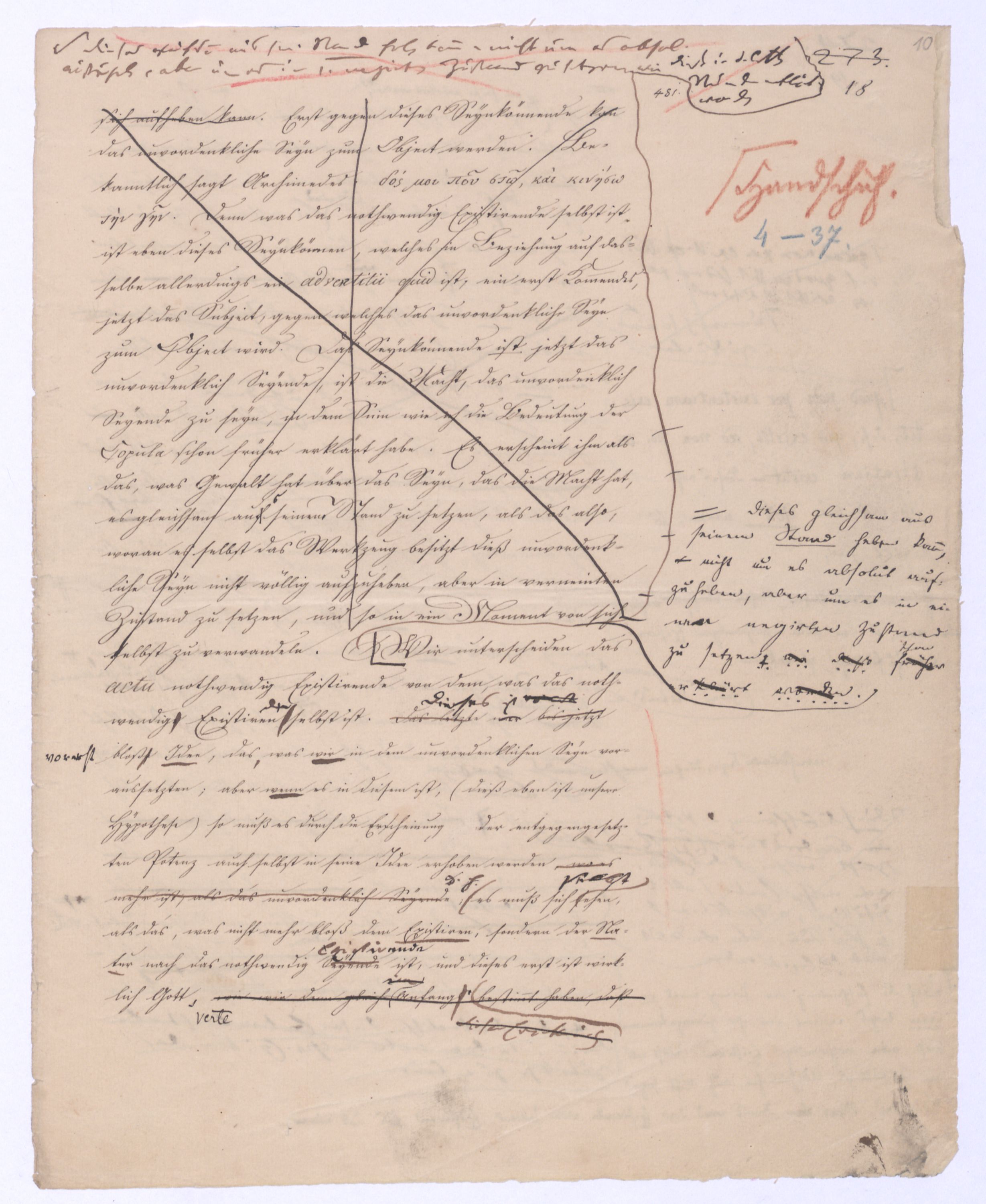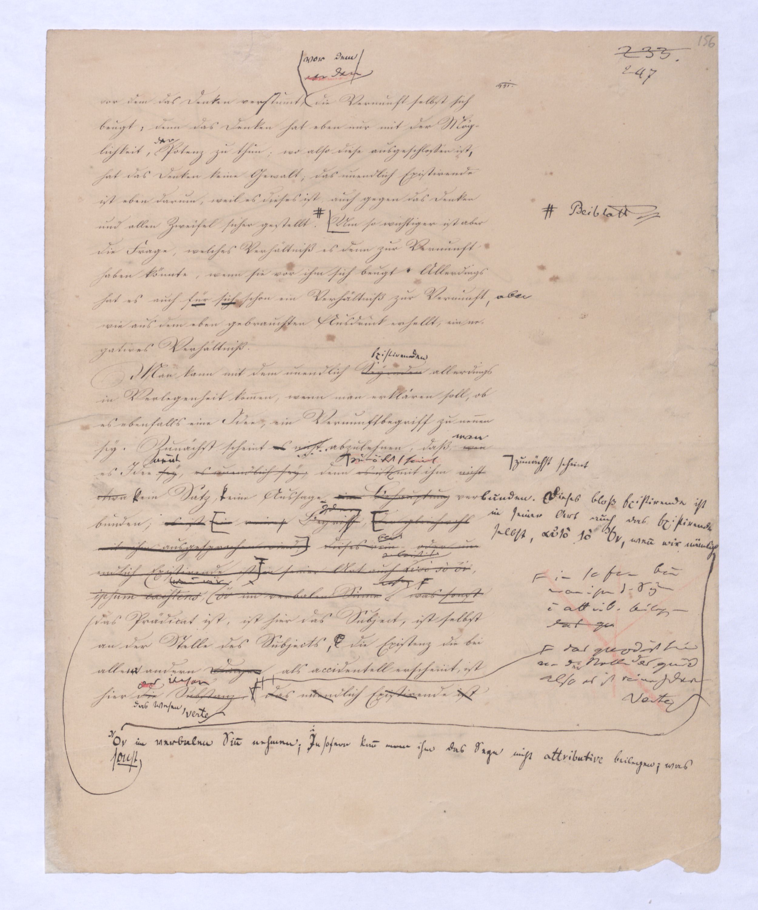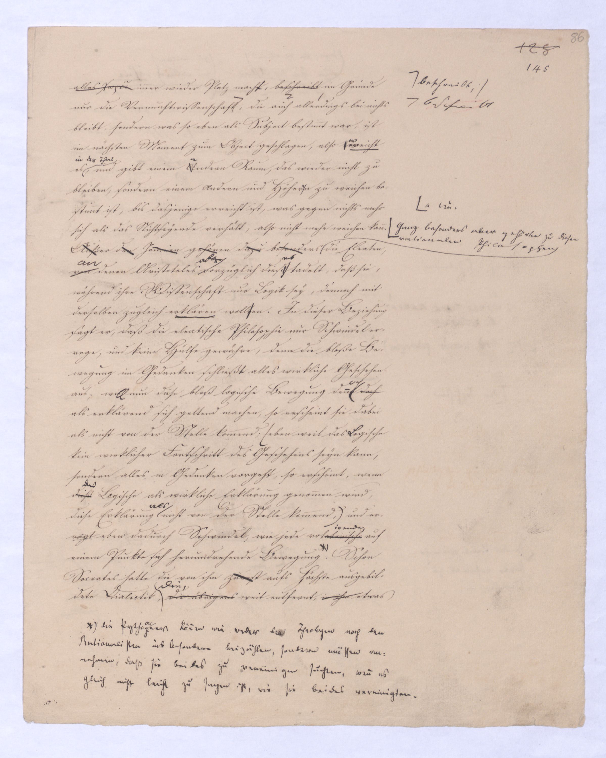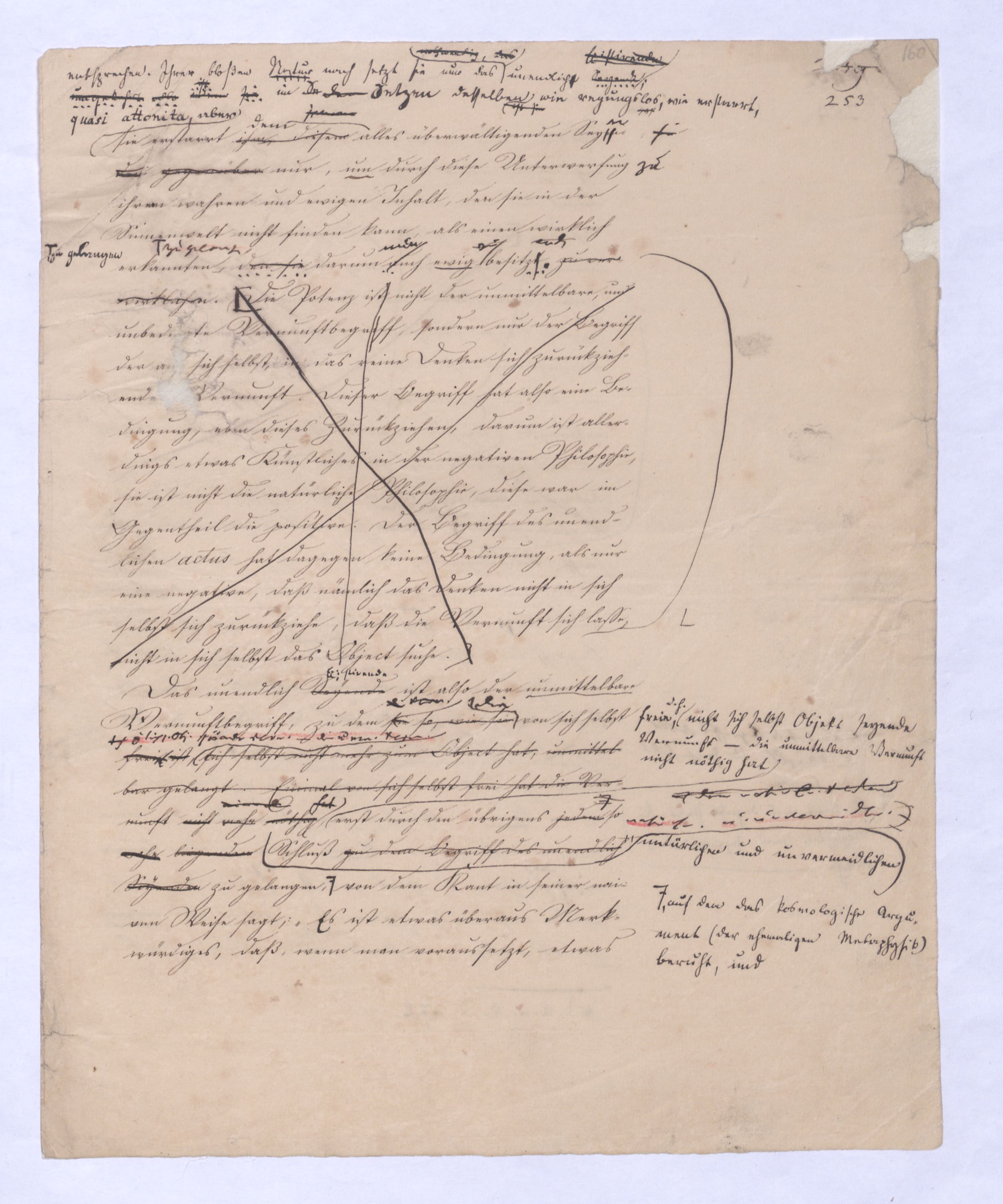 (von dem in der Folge ausführlich die Rede seyn wird) hat er meines Erachtens den eigentlichen Fehlschluß garer des Schlusses nicht einmal entdeckt, und überhaupt ist in seinerKants Critik der rationalen Theologie das positive Resultat derselben wichtiger, als das negative. Das positive bis jetzt noch nicht widerlegte, wenn gleich nicht beachtete – denn so tief ist die neueste frech mit Ath. prahlende Seichtigkeit nicht in Kant eingedrungen, dieß als Unwiderlegliches in ihm zu finden, ist war daß Gott nicht der zufällige, sondern der nothwendige Inhalt der letzten, höchsten Vernunftidee sei. (Dieß war keine Behauptung wen. der früherenzunächst vorausgegangenen Metaphysik, der im Grunde, was den Begriff Gottes betrifft, diesen Be oder überh. d. Metaph. wenn wir nicht etwa auf Platon und Arist. zurückgehen, welchem letzteren Gott ebenfalls d. nothw. Ende war. Der späteren Metaph. war im Grunde der Begriff Gottes ebenso zufällig wie alle andern waren.) Daran aberDem + schloß sich aber das negative Resultat an, daß die Vernunft das wirkliche Seyn Gottes nicht zu erkennen vermöge, Gott eben bloß höchste Idee, eben darum auch immer nur Ende bliebbleiben müsse das es nie wieder zum Anfang, also zum Princip irgend einer Wissenschaft bringen kannwerden könne, oder, wie er sich ausdrückt, daß diese Idee stets nur von regulativem,