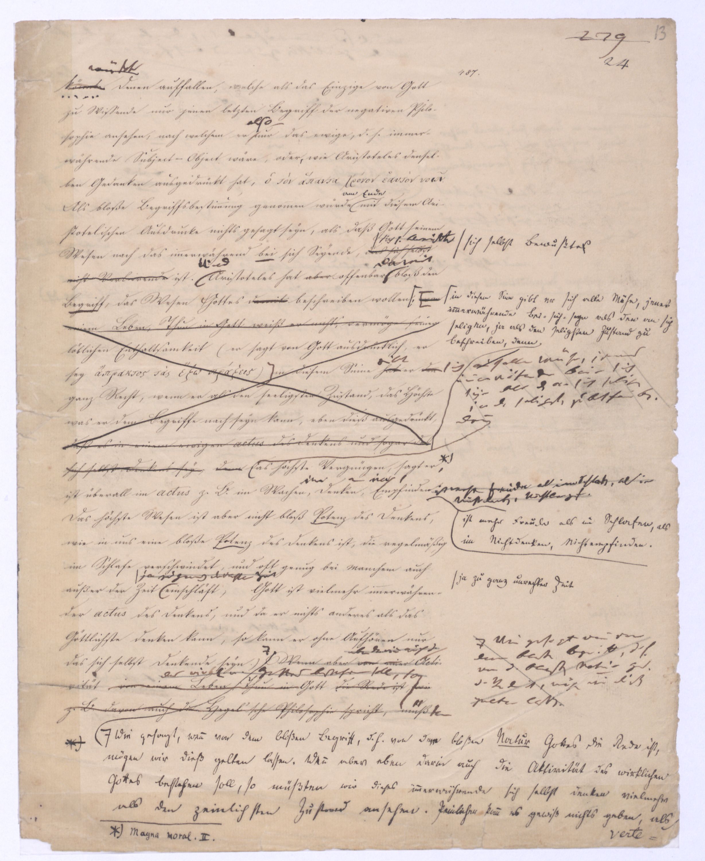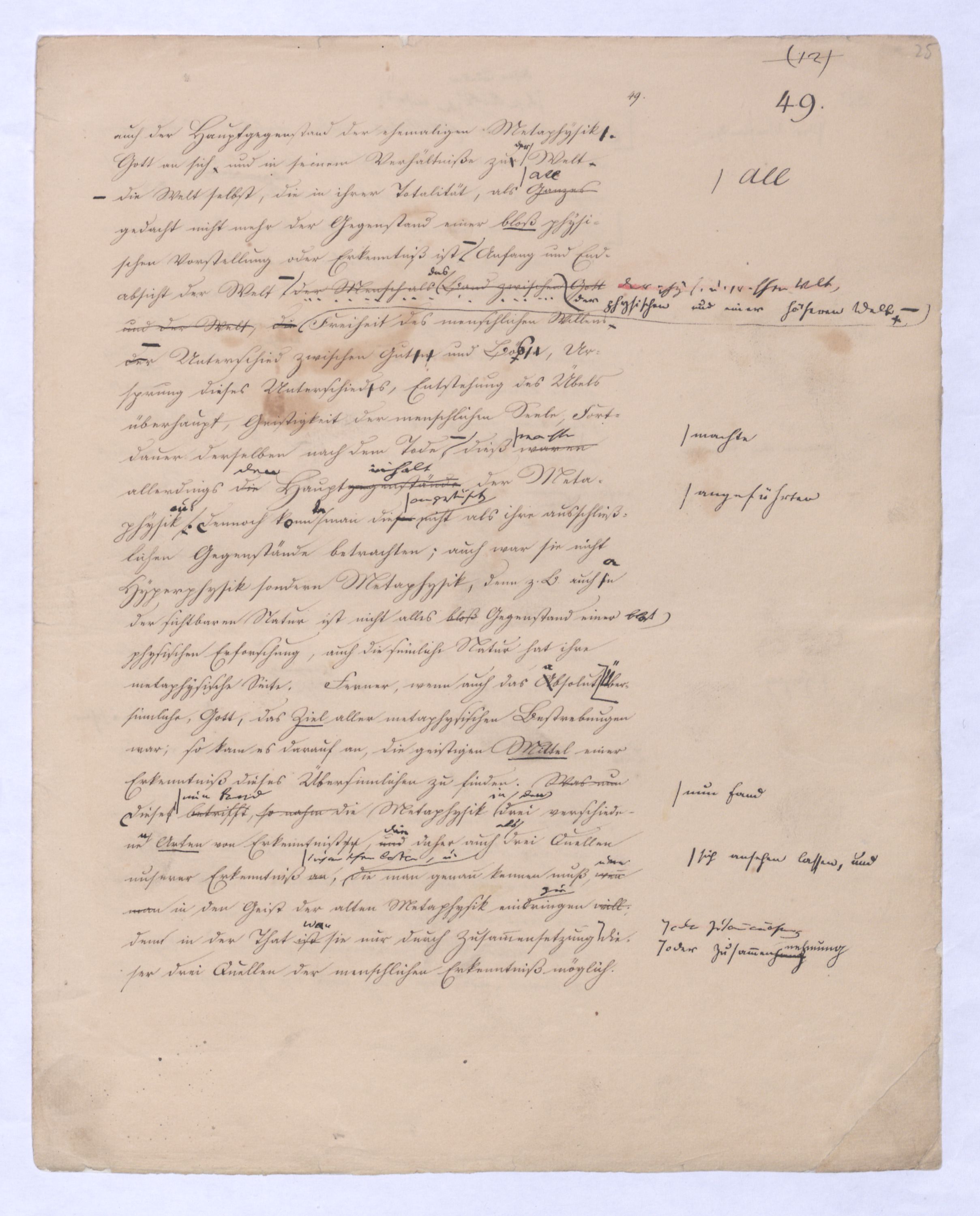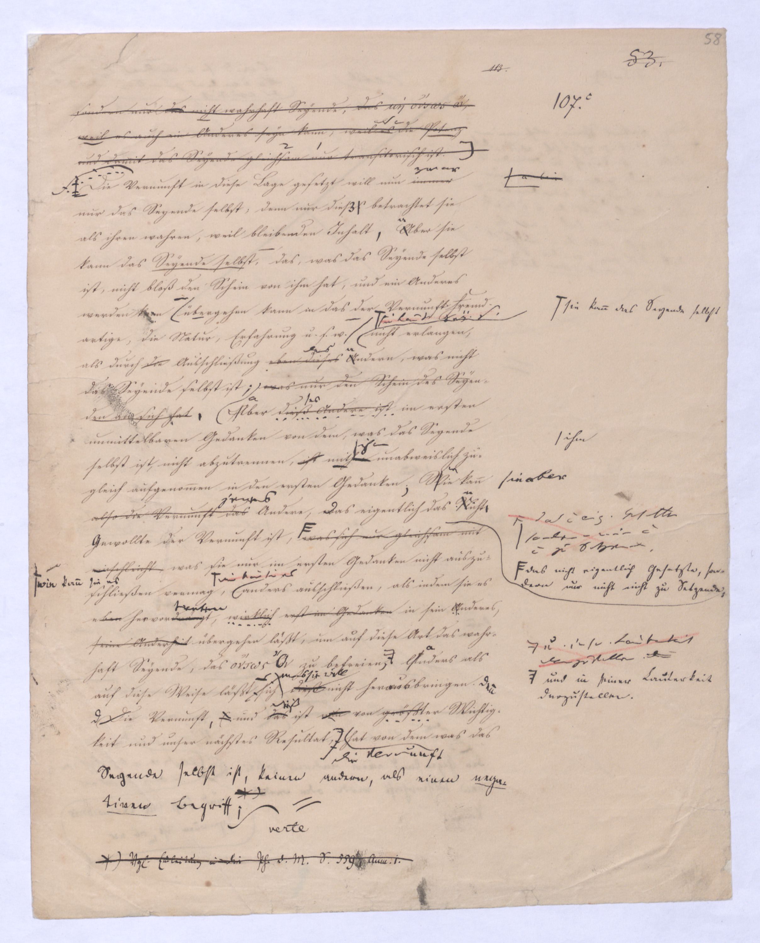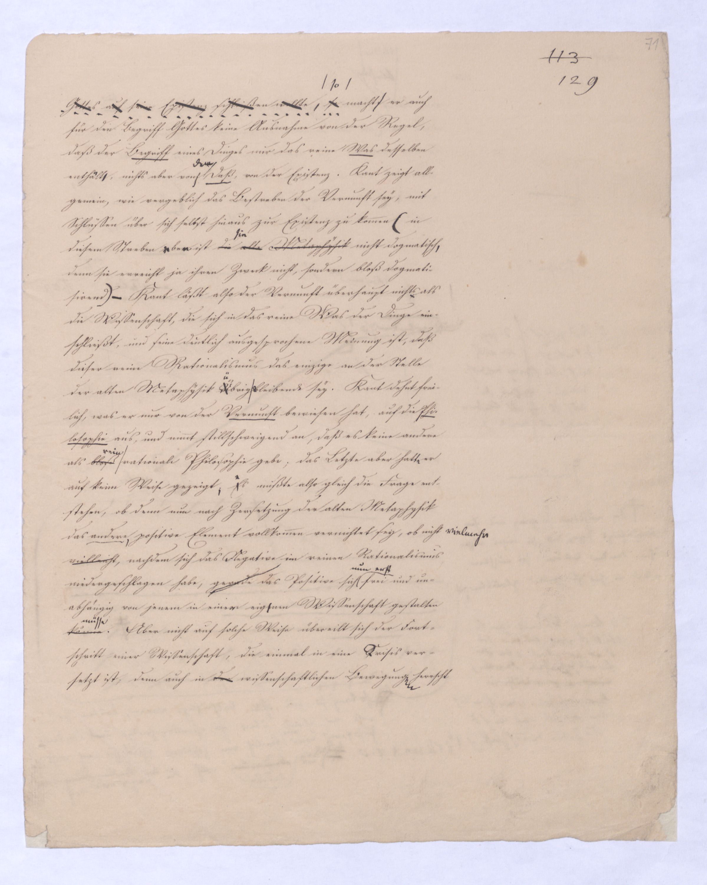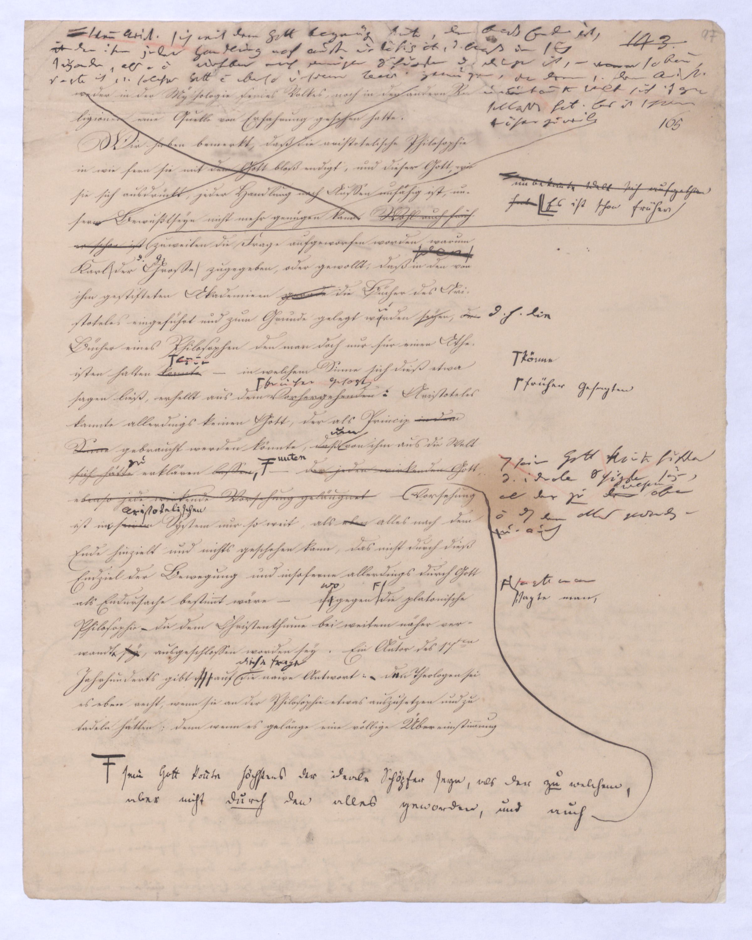 (von dem in der Folge ausführlich die Rede seyn wird) hat er meines Erachtens den eigentlichen Fehlschluß garer des Schlusses nicht einmal entdeckt, und überhaupt ist in seinerKants Critik der rationalen Theologie das positive Resultat derselben wichtiger, als das negative. Das positive bis jetzt noch nicht widerlegte, wenn gleich nicht beachtete – denn so tief ist die neueste frech mit Ath. prahlende Seichtigkeit nicht in Kant eingedrungen, dieß als Unwiderlegliches in ihm zu finden, ist war daß Gott nicht der zufällige, sondern der nothwendige Inhalt der letzten, höchsten Vernunftidee sei. (Dieß war keine Behauptung wen. der früherenzunächst vorausgegangenen Metaphysik, der im Grunde, was den Begriff Gottes betrifft, diesen Be oder überh. d. Metaph. wenn wir nicht etwa auf Platon und Arist. zurückgehen, welchem letzteren Gott ebenfalls d. nothw. Ende war. Der späteren Metaph. war im Grunde der Begriff Gottes ebenso zufällig wie alle andern waren.) Daran aberDem + schloß sich aber das negative Resultat an, daß die Vernunft das wirkliche Seyn Gottes nicht zu erkennen vermöge, Gott eben bloß höchste Idee, eben darum auch immer nur Ende bliebbleiben müsse das es nie wieder zum Anfang, also zum Princip irgend einer Wissenschaft bringen kannwerden könne, oder, wie er sich ausdrückt, daß diese Idee stets nur von regulativem,