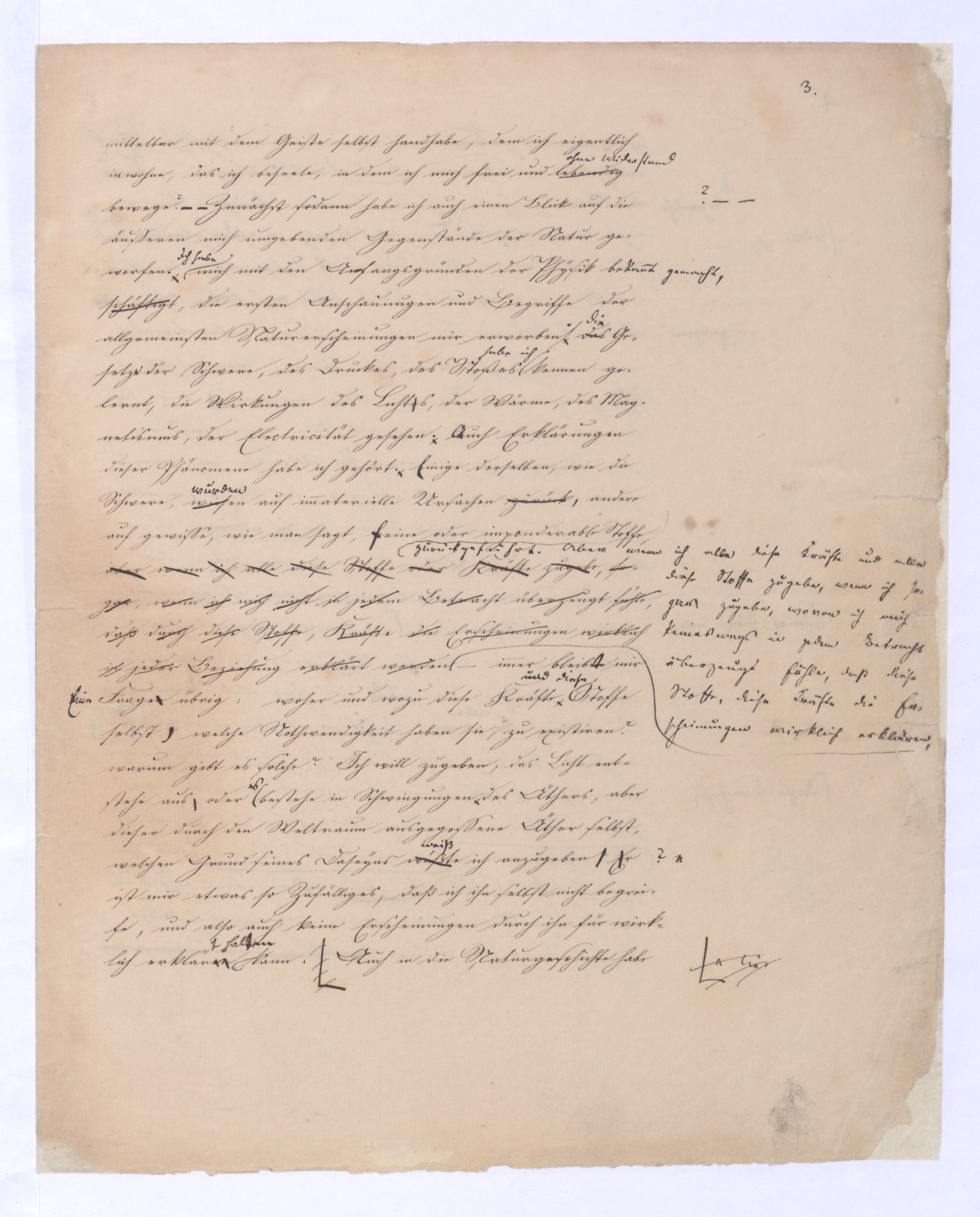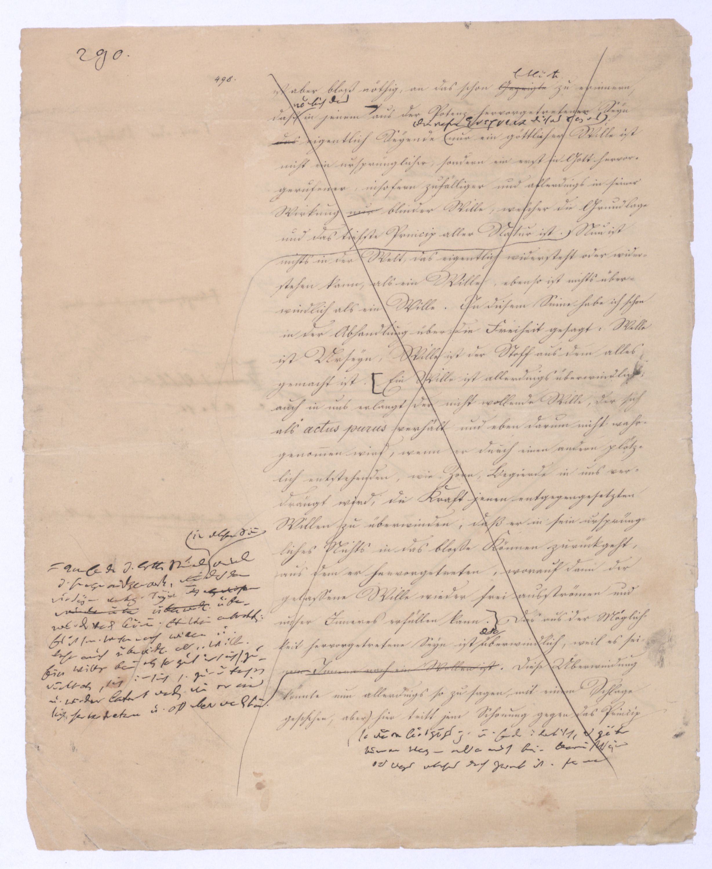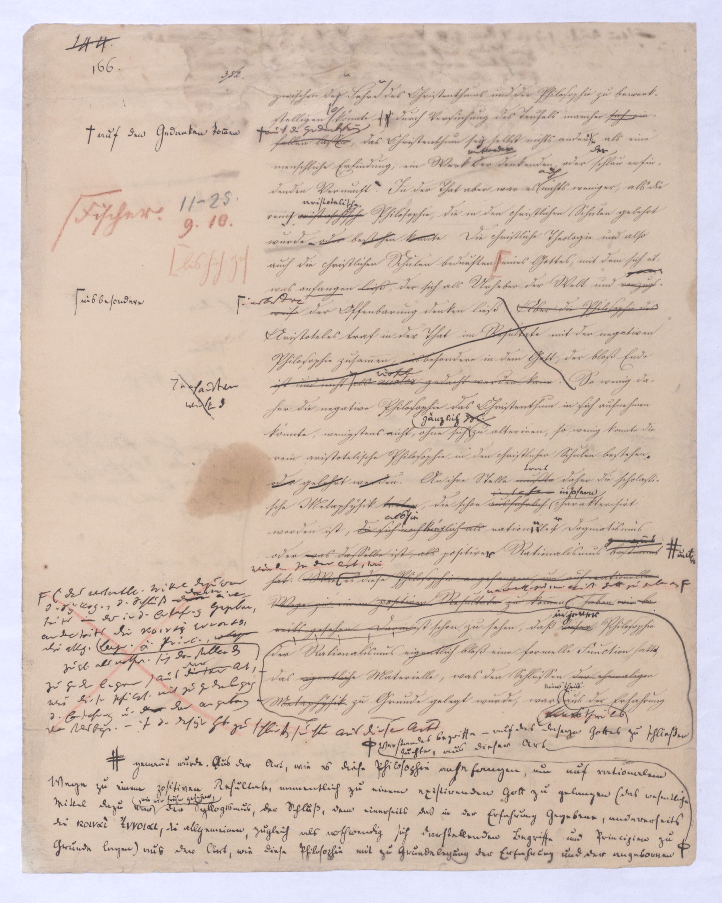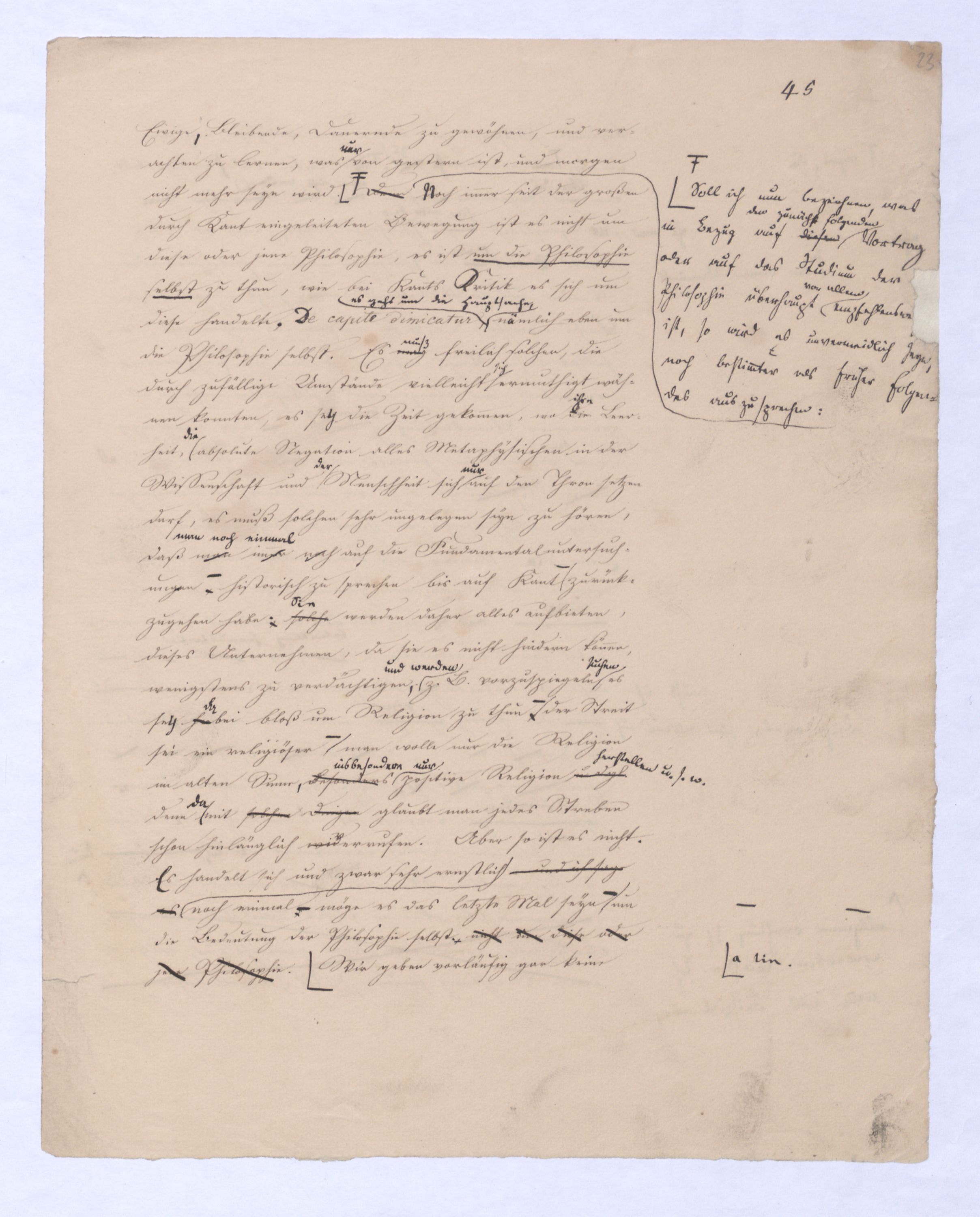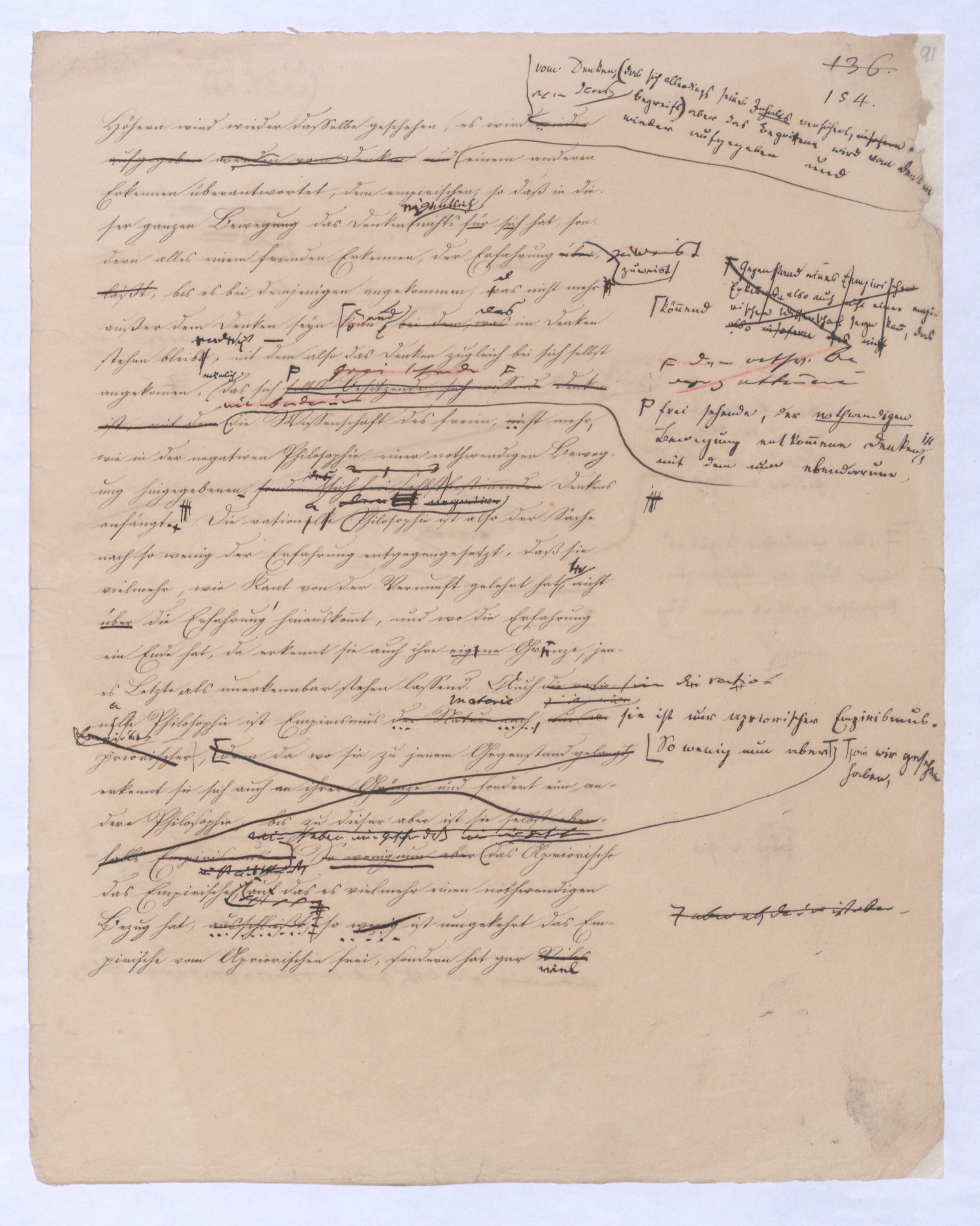 (von dem in der Folge ausführlich die Rede seyn wird) hat er meines Erachtens den eigentlichen Fehlschluß garer des Schlusses nicht einmal entdeckt, und überhaupt ist in seinerKants Critik der rationalen Theologie das positive Resultat derselben wichtiger, als das negative. Das positive bis jetzt noch nicht widerlegte, wenn gleich nicht beachtete – denn so tief ist die neueste frech mit Ath. prahlende Seichtigkeit nicht in Kant eingedrungen, dieß als Unwiderlegliches in ihm zu finden, ist war daß Gott nicht der zufällige, sondern der nothwendige Inhalt der letzten, höchsten Vernunftidee sei. (Dieß war keine Behauptung wen. der früherenzunächst vorausgegangenen Metaphysik, der im Grunde, was den Begriff Gottes betrifft, diesen Be oder überh. d. Metaph. wenn wir nicht etwa auf Platon und Arist. zurückgehen, welchem letzteren Gott ebenfalls d. nothw. Ende war. Der späteren Metaph. war im Grunde der Begriff Gottes ebenso zufällig wie alle andern waren.) Daran aberDem + schloß sich aber das negative Resultat an, daß die Vernunft das wirkliche Seyn Gottes nicht zu erkennen vermöge, Gott eben bloß höchste Idee, eben darum auch immer nur Ende bliebbleiben müsse das es nie wieder zum Anfang, also zum Princip irgend einer Wissenschaft bringen kannwerden könne, oder, wie er sich ausdrückt, daß diese Idee stets nur von regulativem,