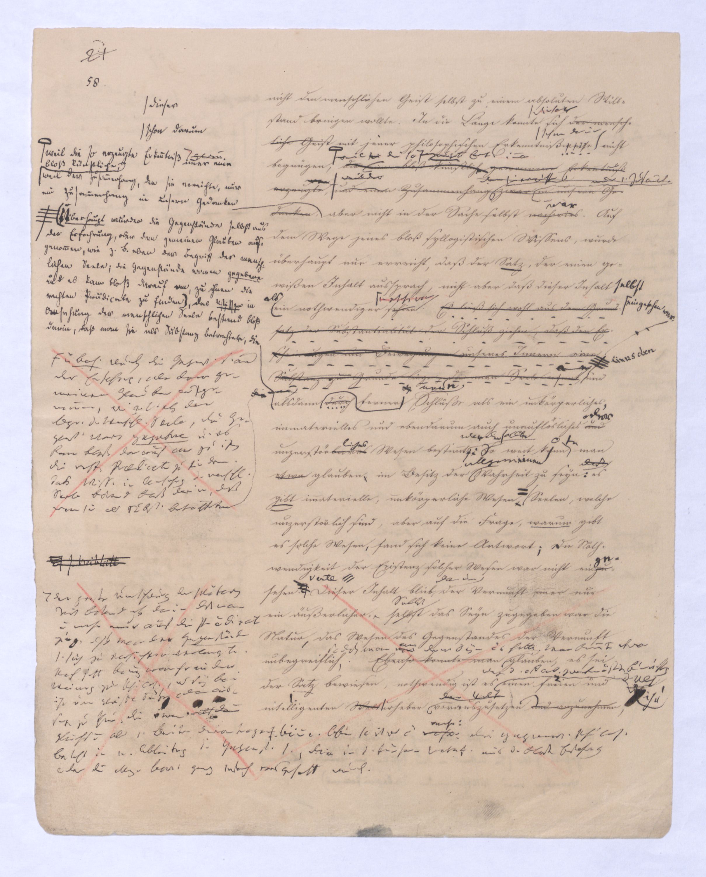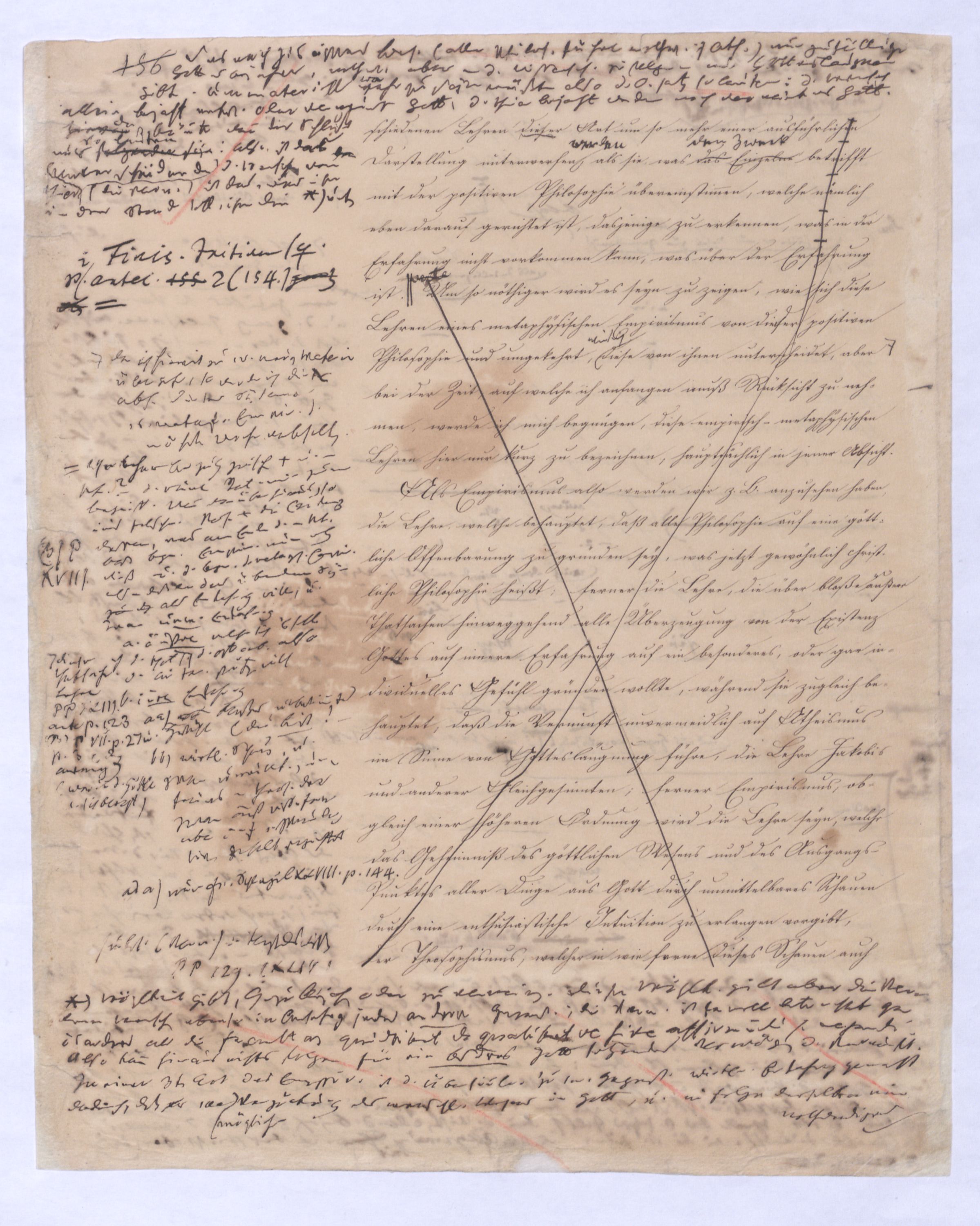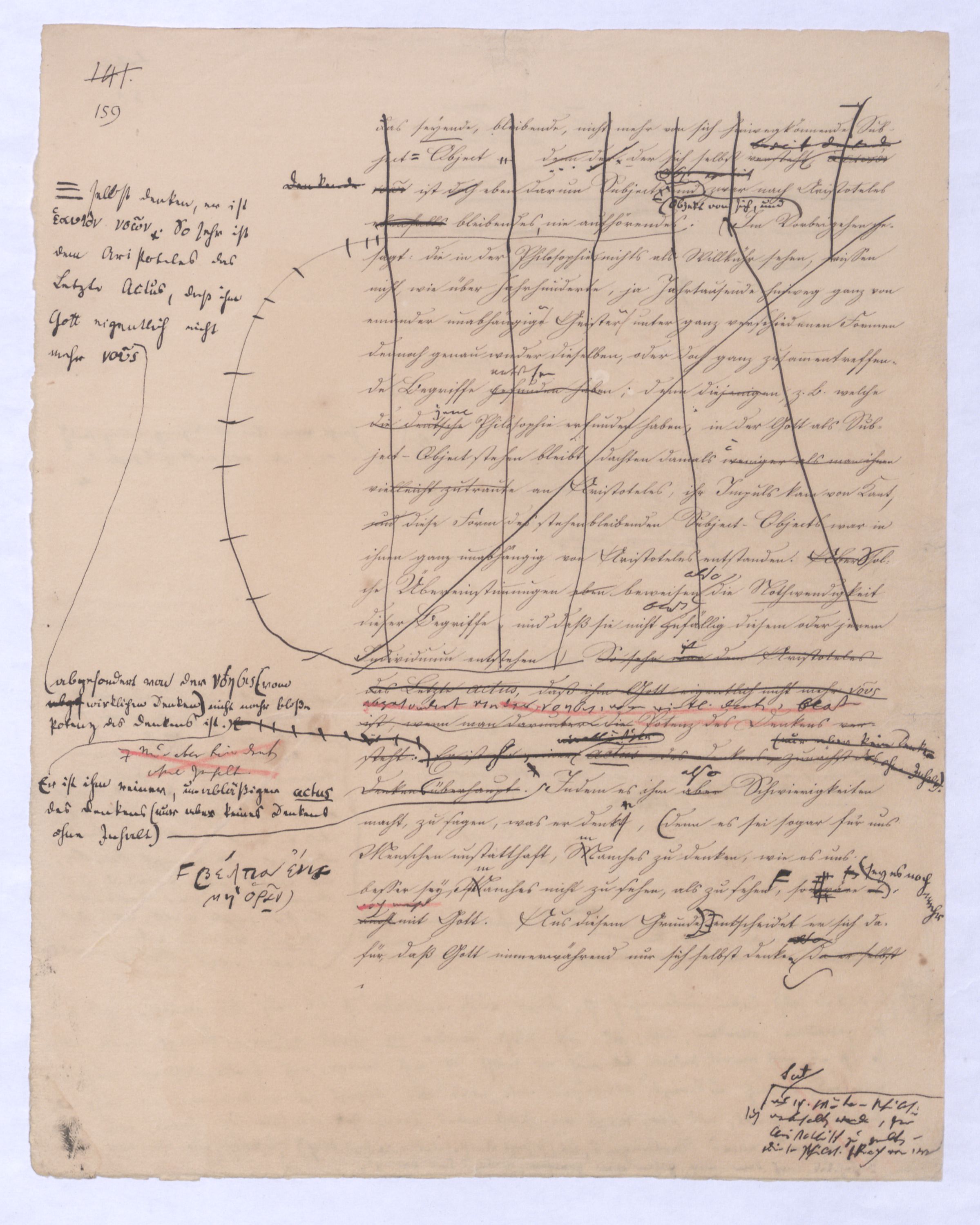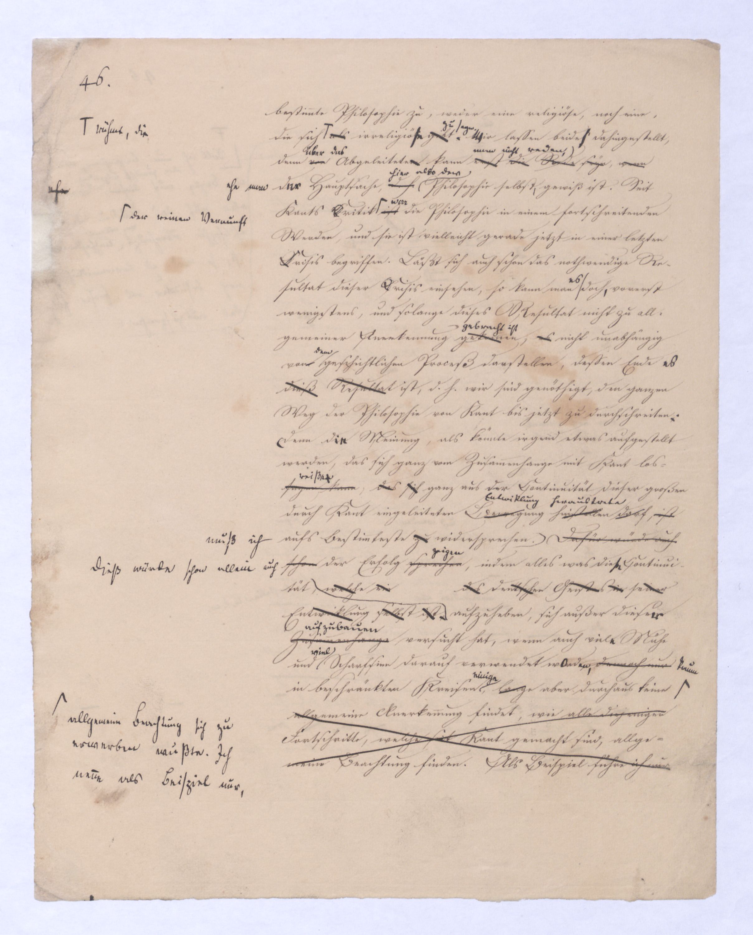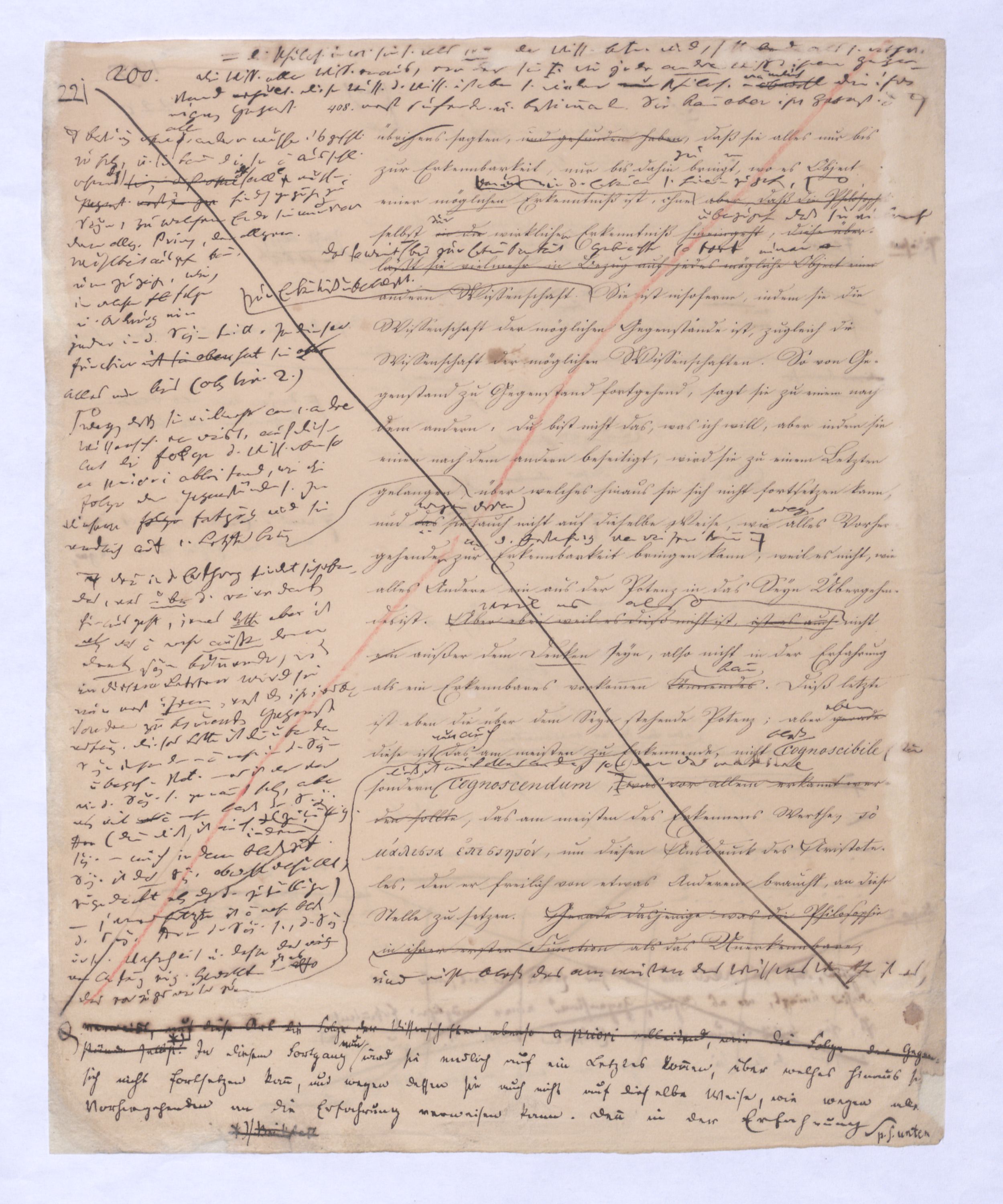 (von dem in der Folge ausführlich die Rede seyn wird) hat er meines Erachtens den eigentlichen Fehlschluß garer des Schlusses nicht einmal entdeckt, und überhaupt ist in seinerKants Critik der rationalen Theologie das positive Resultat derselben wichtiger, als das negative. Das positive bis jetzt noch nicht widerlegte, wenn gleich nicht beachtete – denn so tief ist die neueste frech mit Ath. prahlende Seichtigkeit nicht in Kant eingedrungen, dieß als Unwiderlegliches in ihm zu finden, ist war daß Gott nicht der zufällige, sondern der nothwendige Inhalt der letzten, höchsten Vernunftidee sei. (Dieß war keine Behauptung wen. der früherenzunächst vorausgegangenen Metaphysik, der im Grunde, was den Begriff Gottes betrifft, diesen Be oder überh. d. Metaph. wenn wir nicht etwa auf Platon und Arist. zurückgehen, welchem letzteren Gott ebenfalls d. nothw. Ende war. Der späteren Metaph. war im Grunde der Begriff Gottes ebenso zufällig wie alle andern waren.) Daran aberDem + schloß sich aber das negative Resultat an, daß die Vernunft das wirkliche Seyn Gottes nicht zu erkennen vermöge, Gott eben bloß höchste Idee, eben darum auch immer nur Ende bliebbleiben müsse das es nie wieder zum Anfang, also zum Princip irgend einer Wissenschaft bringen kannwerden könne, oder, wie er sich ausdrückt, daß diese Idee stets nur von regulativem,