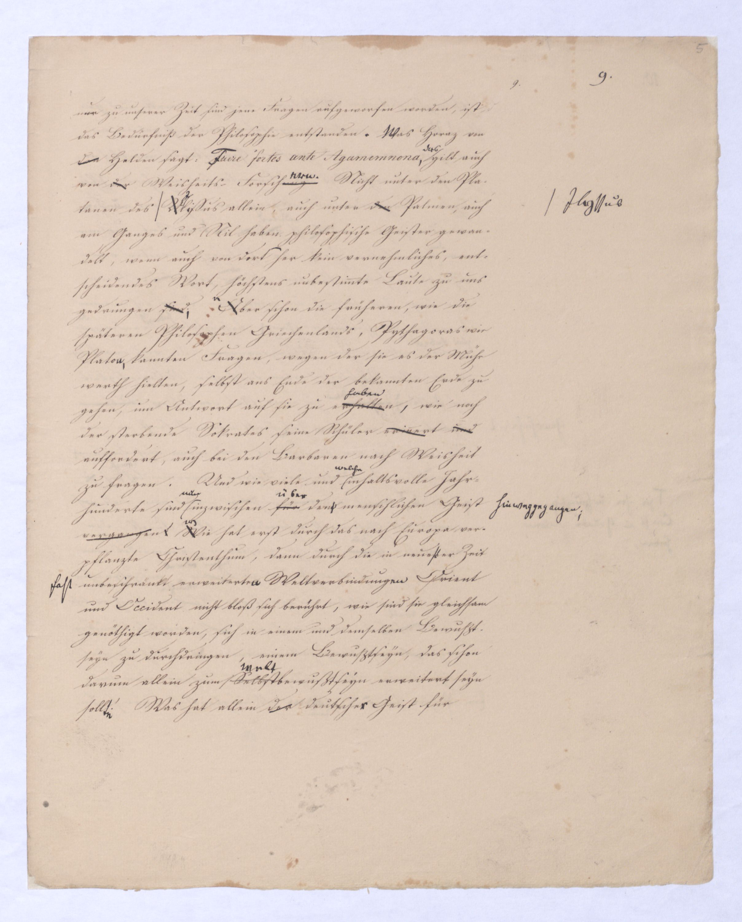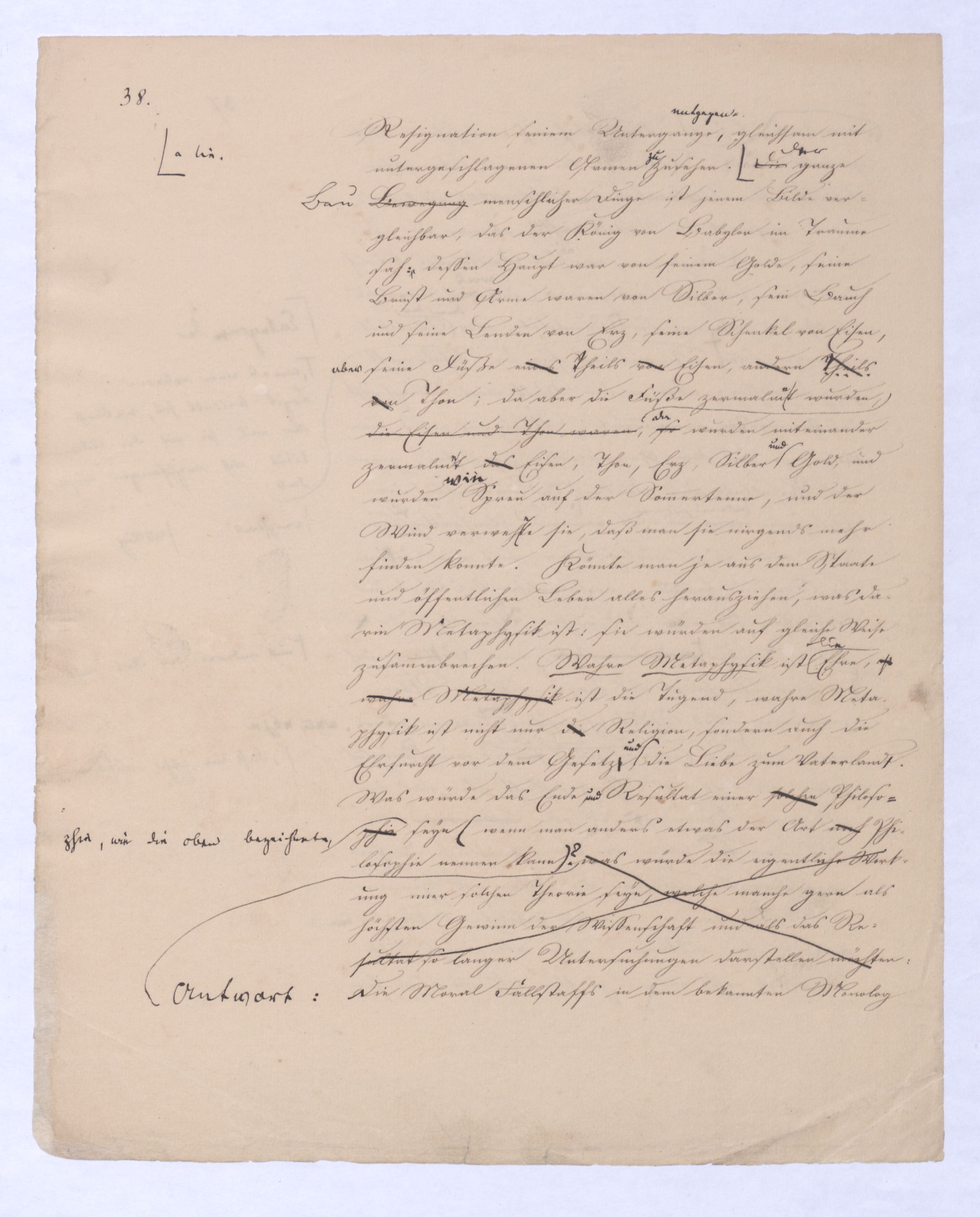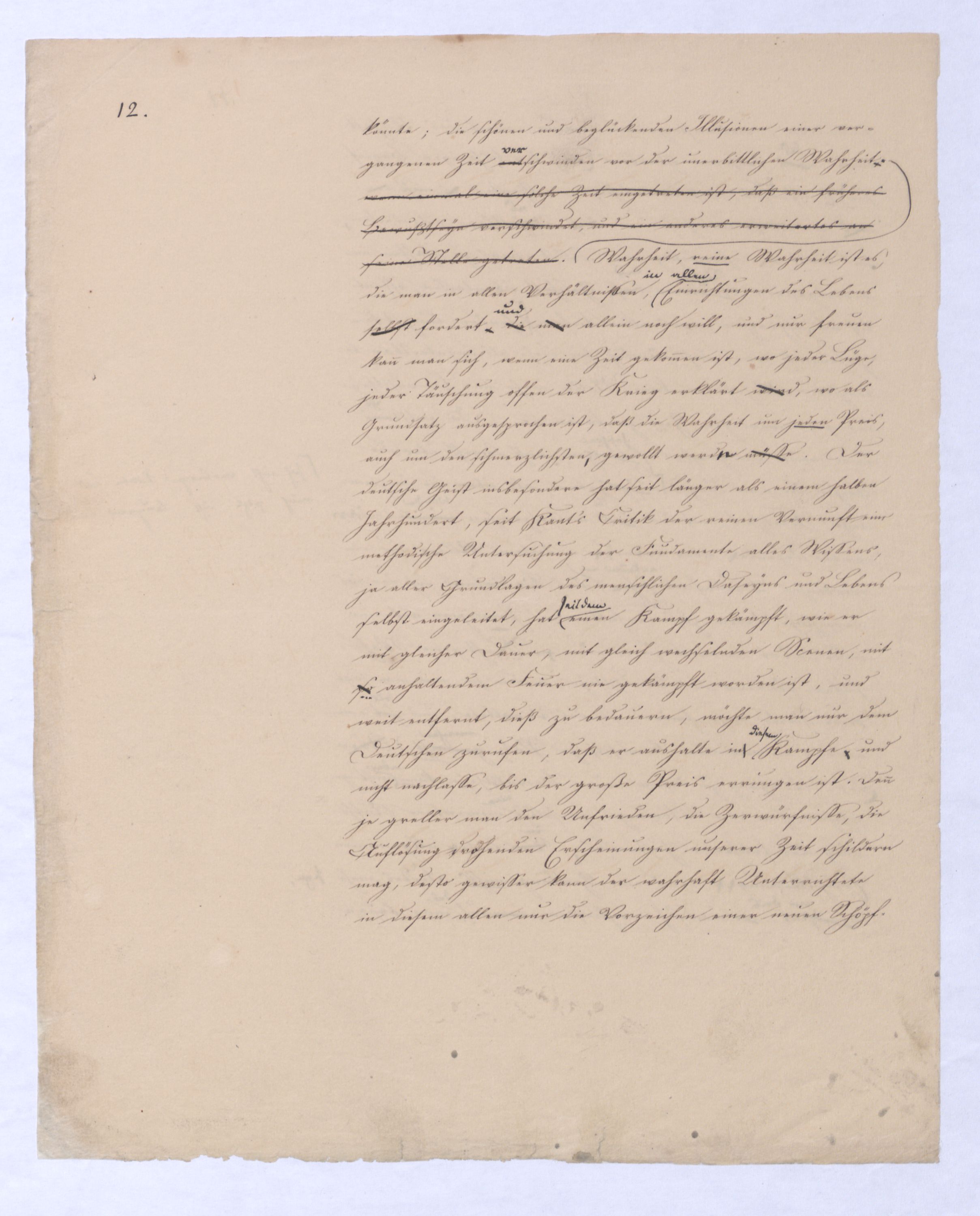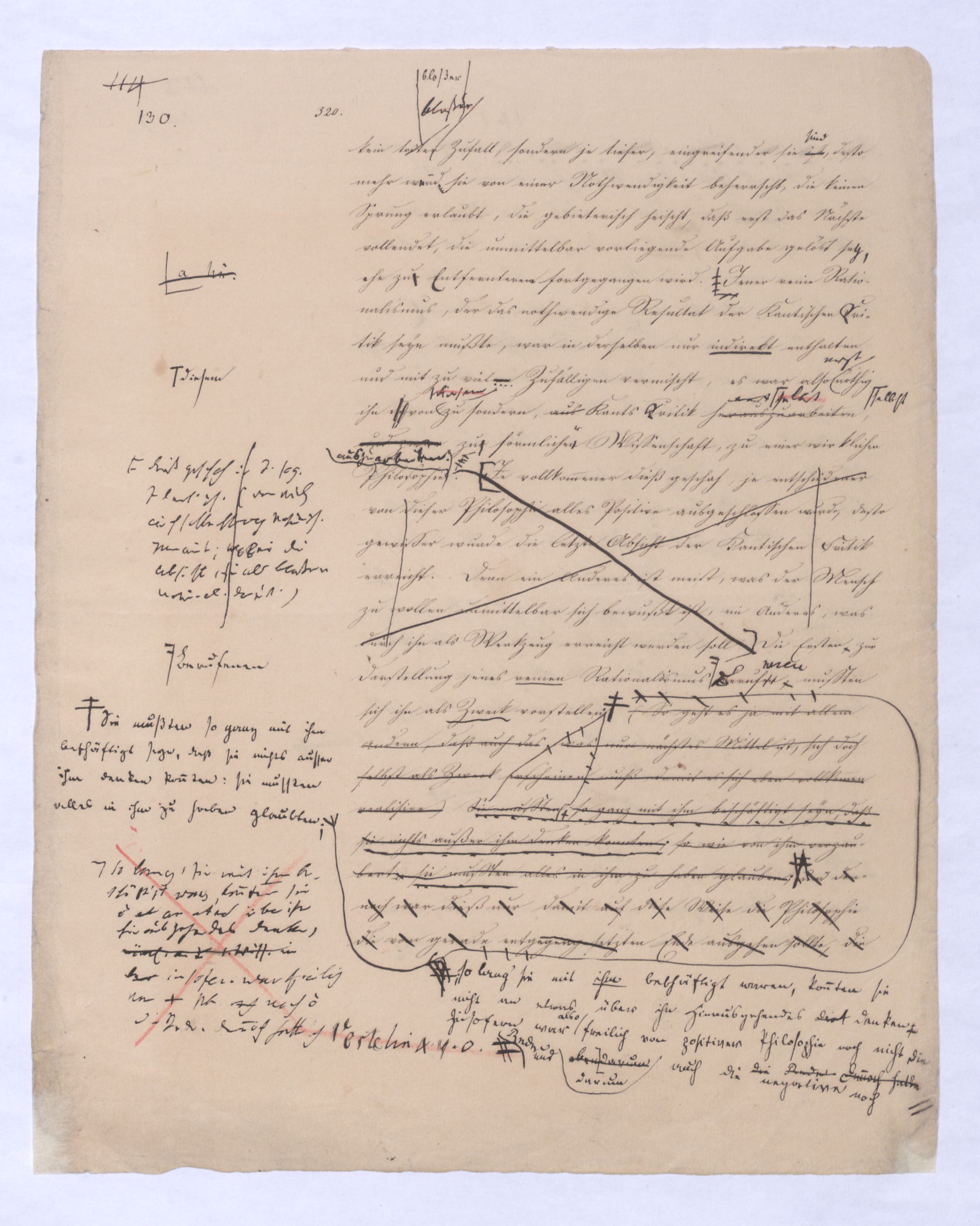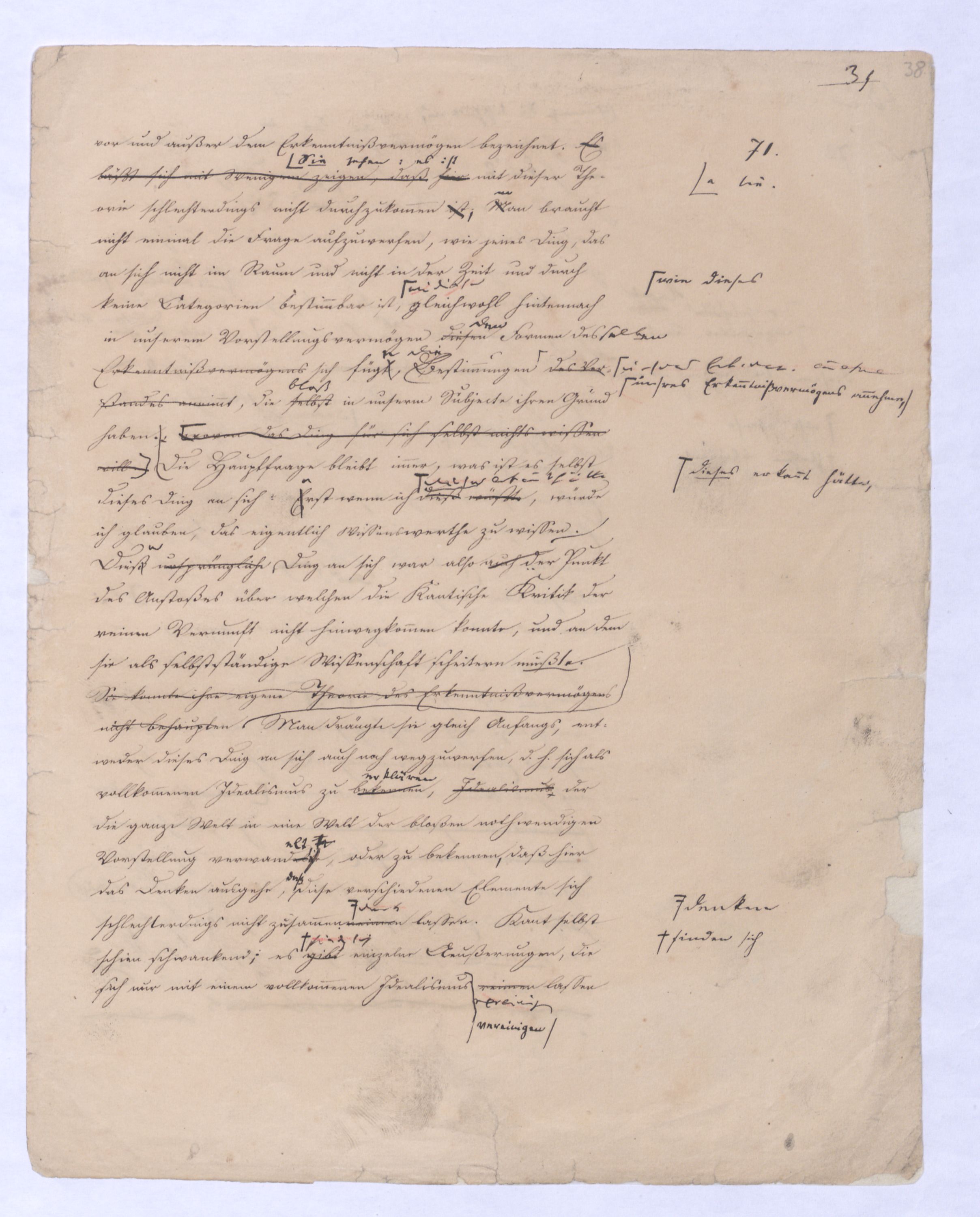 (von dem in der Folge ausführlich die Rede seyn wird) hat er meines Erachtens den eigentlichen Fehlschluß garer des Schlusses nicht einmal entdeckt, und überhaupt ist in seinerKants Critik der rationalen Theologie das positive Resultat derselben wichtiger, als das negative. Das positive bis jetzt noch nicht widerlegte, wenn gleich nicht beachtete – denn so tief ist die neueste frech mit Ath. prahlende Seichtigkeit nicht in Kant eingedrungen, dieß als Unwiderlegliches in ihm zu finden, ist war daß Gott nicht der zufällige, sondern der nothwendige Inhalt der letzten, höchsten Vernunftidee sei. (Dieß war keine Behauptung wen. der früherenzunächst vorausgegangenen Metaphysik, der im Grunde, was den Begriff Gottes betrifft, diesen Be oder überh. d. Metaph. wenn wir nicht etwa auf Platon und Arist. zurückgehen, welchem letzteren Gott ebenfalls d. nothw. Ende war. Der späteren Metaph. war im Grunde der Begriff Gottes ebenso zufällig wie alle andern waren.) Daran aberDem + schloß sich aber das negative Resultat an, daß die Vernunft das wirkliche Seyn Gottes nicht zu erkennen vermöge, Gott eben bloß höchste Idee, eben darum auch immer nur Ende bliebbleiben müsse das es nie wieder zum Anfang, also zum Princip irgend einer Wissenschaft bringen kannwerden könne, oder, wie er sich ausdrückt, daß diese Idee stets nur von regulativem,