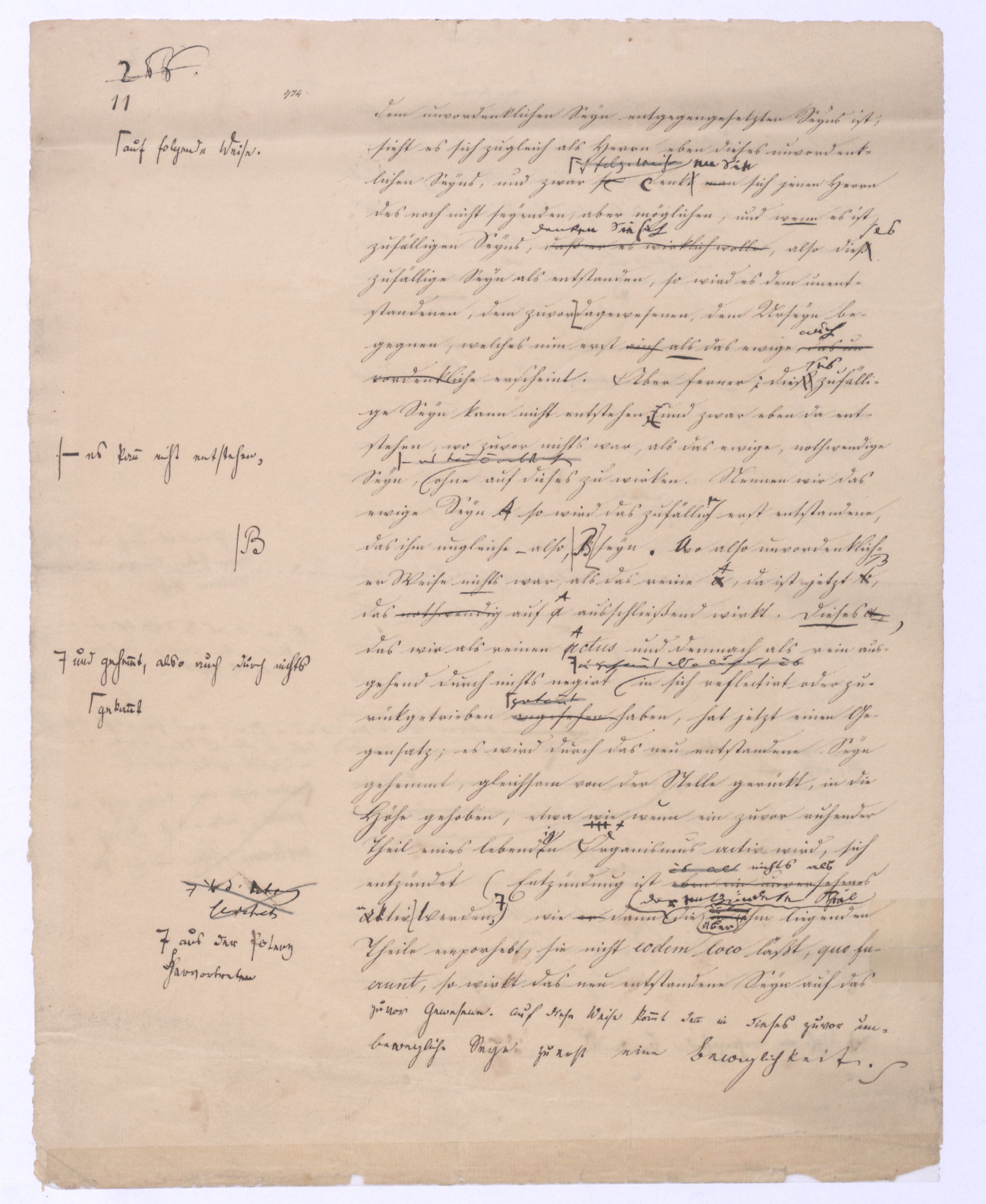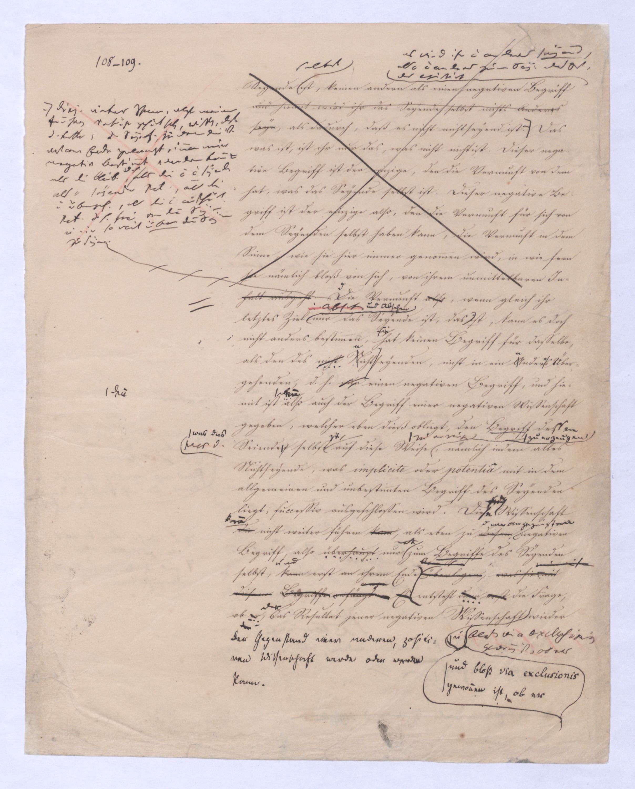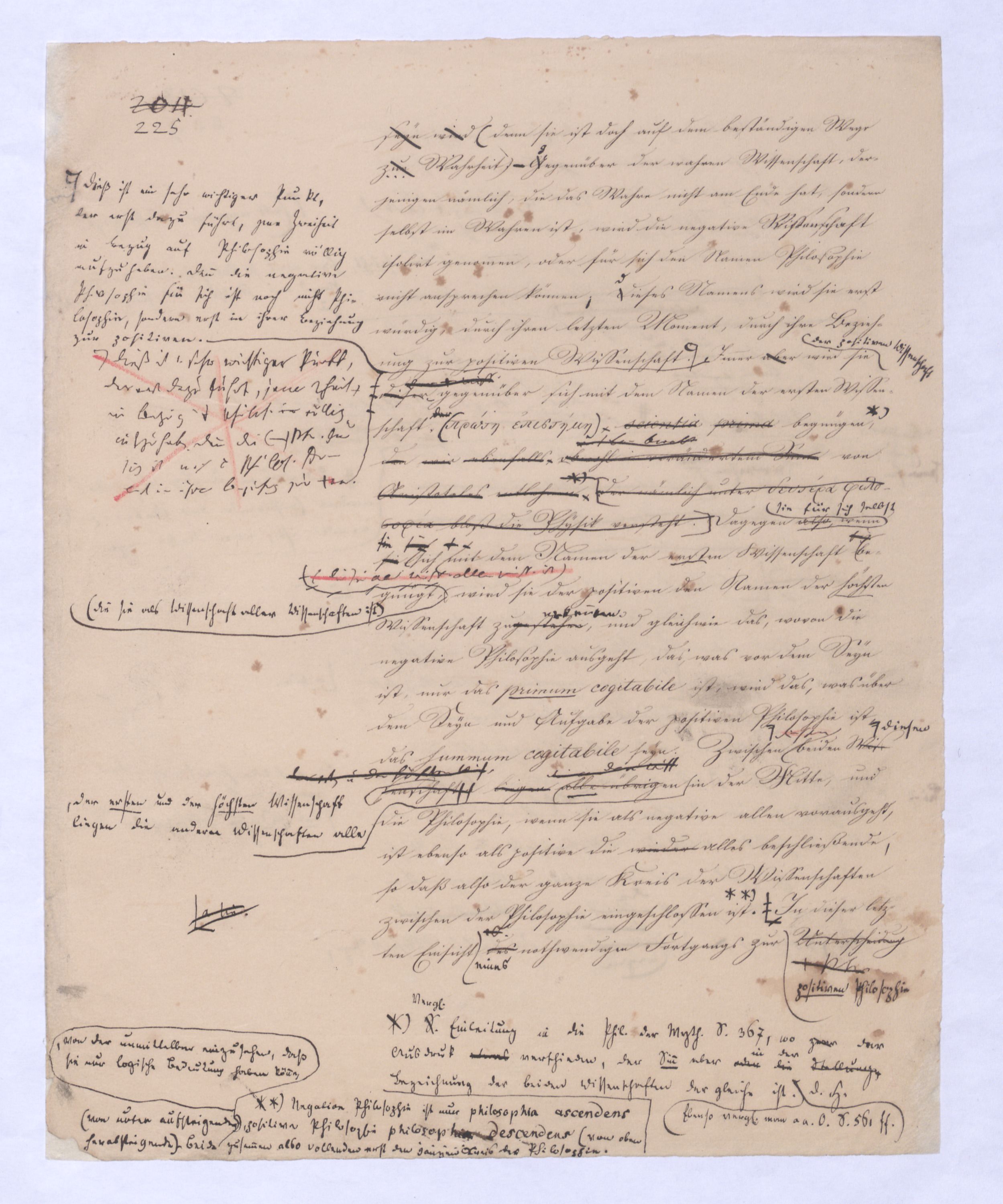 sondern nur das nicht wahrhaft Seyende, das μὴ ὄντως ὄν, weil es auch ein Anderes seyn kann, weil esalso die Potenz und damit das Seyende gleichsam nunnun gleichsam transitorisch ist. Die Vernunft in diese Lage gesetzt will nun immer nur das Seyende selbst; denn nur dieses betrachtet sie als ihren wahren, weil bleibenden Inhalt. Aber sie kann das Seyende selbst, – das, was das Seyende selbst ist, nicht bloß den Schein von ihm hat, und ein Anderes werden kann übergehen kann in das der Vernunft fremdartige, die Natur, Erfahrung u. s. w. sie kann d. Sey. s. nicht erlangen, als durch die Ausschließung eben diesesdes Andern, was nicht das Seyende selbst ist, was nur den Schein des Seyenden an sich selbst hat. A; aber dieß Andere ist im ersten unmittelbaren Gedanken von dem, was das Seyende selbst ist, nicht abzutrennen, ist mithin ihm unabweislich zugleich aufgenommen in den ersten Gedanken. W; wie kann also die Vernunft dasjenes Andere, was eigentlich das Nichtgewollte der Vernunft ist, was sich nur gleichsam mit einschleicht,das nicht eig. Gesetzte sondern nur nicht nicht zu Setzende, was sie nur im ersten Gedanken nicht auszuschließen vermag, wie kann sie es anders ausschließen, als indem sie es eben hervordrängttreten, wirklich erst in Gedanken in sein Anderes, seine Anderheit übergehen läßt, um auf diese Art das wahrhaft Seyende, das ὄντως ὄν zu befreien., u. in sr. Lauterkeit darzustellen. Denn A anders als auf diese Weise läßt es sich dießwirkl. nicht herausbringen. Die Vernunft (, und dasdieß ist nun von größterund hiermit wird ihr das Seyende selbst nichts Anderes seynes wird ihr nicht anders seyend, also nicht anders zum Das was ist, ist ihr nur das, was nicht nicht ist. Dieser negative Begriff ist der einzige, den die Vernunft von dem hat, was das Seyende selbst ist. Dieser negative Begriff ist der einzige also, den die Vernunft für sich von dem Seyenden selbst haben kann, die Vernunft in dem Sinne, wie sie hier immer genommen wird, in wie fern sie nämlich bloß von sich, von ihrem unmittelbaren Inhalt ausgeht.Diej. unter Ihnen, welche meine früheren Vorträge gehört haben, wissen, daß d. Kette, d. Seyenden zu dem die V. erst am Ende gelangt, immer nur negativ bestimmt werden konnte als die Bleib., d. h. als die nicht nicht seyende also seyende Pot., als die nicht übergeh., als die nicht ausschließ. Pot. d. h. frei von dem Seyn u. nur so weit über dem Seyn zu seyn. Die Vernunft also, wenn gleich ihr letztes Ziel u. Absehen nur das Seyende ist, das iIst, kann es doch nicht anders bestimmen, hat keinen Begriff für dasselbe, als den des nicht Nichtseyenden, nicht in ein Anders Übergehenden, d. h. nur einen negativen Begriff, und hiemit ist dann also auch der Begriff einer negativen Wissenschaft gegeben, welcher eben dieß obliegt, den Begriff dessen was d. Seyenden selbst, auf diese Weise zu erzeugen, nämlich indem alles Nichtseyende, was implicite oder potentia mit in dem allgemeinen und unbestimmten Begriff des Seyenden liegt, successiv ausgeschlossen wird. Diese Wissenschaft diekann nicht weiter führen kann, als eben zu diesem negativen Begriff, also überhaupt nur erst zum Begriffe des Seyenden selbst, kannund erst an ihrem Ende überlegenbeweisen, was sieängtange. Es entsteht dann erst die Frage, ob er, der das Resultat jener negativen Wissenschaft u. bloß via exclusionis gewonnen ist, ob er wieder der Gegenstand einer andern und positiven Wissenschaft wird oder werden kannwerde? Vorerstihrder Philos. nur darum zu thun, eben erst den Begriff dessen was das Seyende selbst ist, loszubekommen, es loszutrennen von dem, was diesem Begriffe anhängt im unmittelbaren Gedanken und von diesem ersten Gedanken her. Und eben diese Operation, dass Geschäft der Befreiung ist eben das Geschäft der Vernunft in ihrer ersten und nächsten Wissenschaft. Es ist damit von selbst dargethan, daß diese Wissenschaft, in welcher die Vernunft nur von ihrem unmittelbaren Inhalt ausgeht, wo ihr nichts gegeben ist, als eben dieses, dessen innere Amphibolie aber gezeigt worden ist, daß diese Wiss. nur negativ, also wenn sie eine Philosophie ist nur negative Philosophie seyn kann. Zugleich erklärt sich nun, was die Theorie derGenesis dieser Wissenschaft betrifft, daß ich vom ersten Begriff, welcher der der unendlichen Potenz ist, fortgehen, muß, nicht bleiben, sondern der Potenz, soferne sie Potenz eines andern Seyns ist allerdings in dießdas andere Seyns Werden folgen muß, in die Entfremdung folgen muß, nicht nur weil ich in der so gedachten Potenz d. Prius alles außer d. V. gesetzten Seyns habe, also auf diesem WeiseWege a priori zum Inhalte alles außer der Vernunft und in die Erfahrung gesetzten Seyns gelange, sondern auch darum, weil ich auf diese Weise allein erlangen kann, was ich beabsichtige, oder was die Vernunft will, nämlich nur das Seyende, was ist, das nicht auch nicht seyn kann, dem es unmöglich ist, nicht das Seyende zu seyn. Die Absicht der Vernunft ist,weil ich allein auf diese Weise in dieser Wissenschaft durch die Abscheidung des an sich Unwesentlichen zum Wesentlichen des Wesens, und so zum wahren Wesen, zum wahren Inhalt der Vernunft zu gelangen. Indem ich so meinen Standpunkt bestimme, daß mir nämlich nur das, was das Seyende selbst ist, das wahrhaft Seyende ist, alles Andere aber bloß das Seynkönnende von diesem Standpunkt erklärt sich von selbst, und wird erst vollkommen deutlich, daß dieß Andere, welches nicht das Seyende selbst ist, für mich auch nur die Bedeutung des bloß Möglichen haben kann. Es ist u. es u. daher wie schon gezeigt, nicht als Wirkls (sr. Wirklt. nach deduc. wird) – ferner ist diese Unterscheidung zwischen dem bloß scheinbar Seyenden, welches nur Seynkönnendens und dem wahrh. Seyenden, welches ich wie gesagt nur in dem Seyenden selbst erkenne, von der höchsten Wichtigkeit. Indem ich dem Seyn-Könnenden in Gedanken folge, bleibt mir natürlich, das was das Seyende selbst ist, außer derha