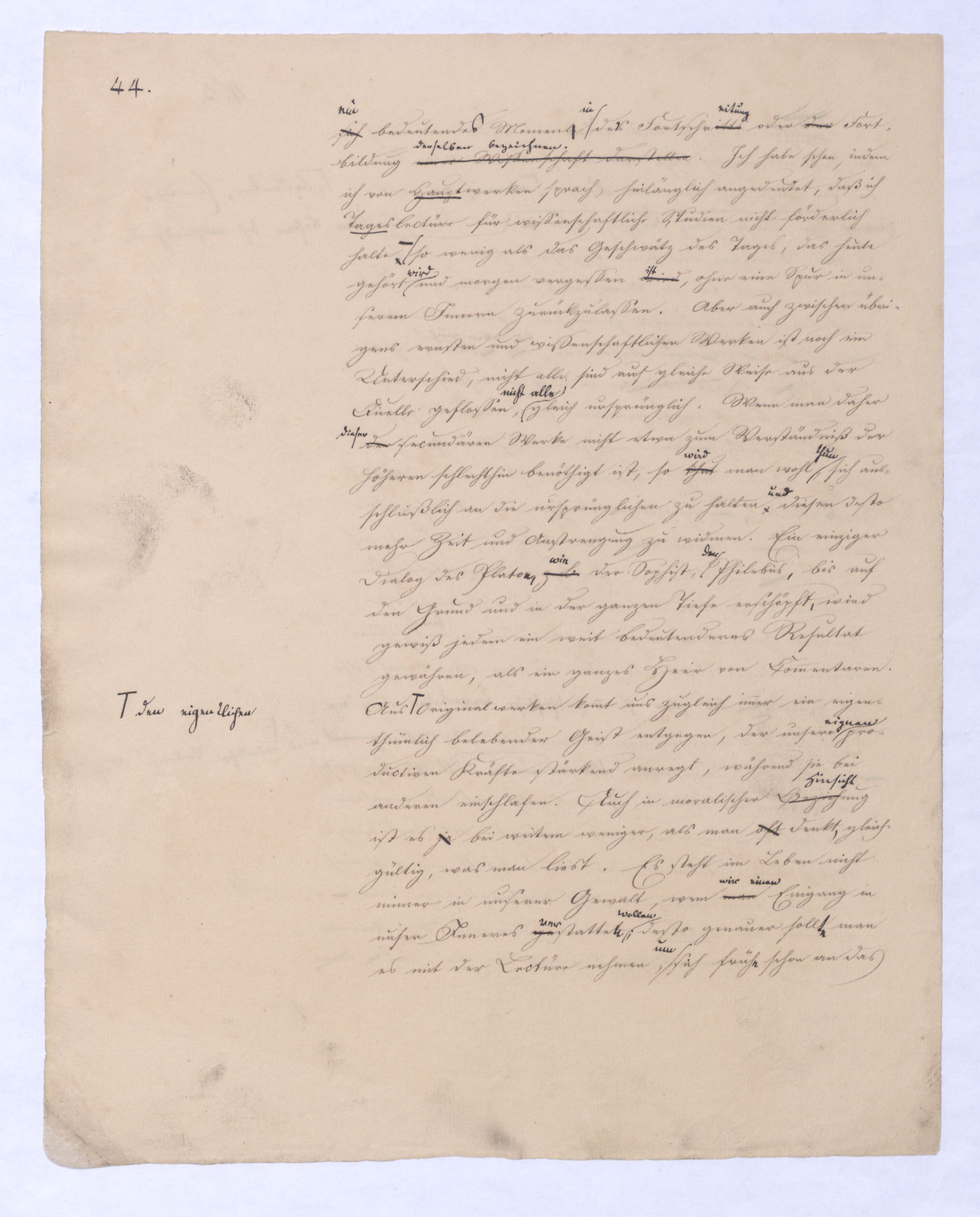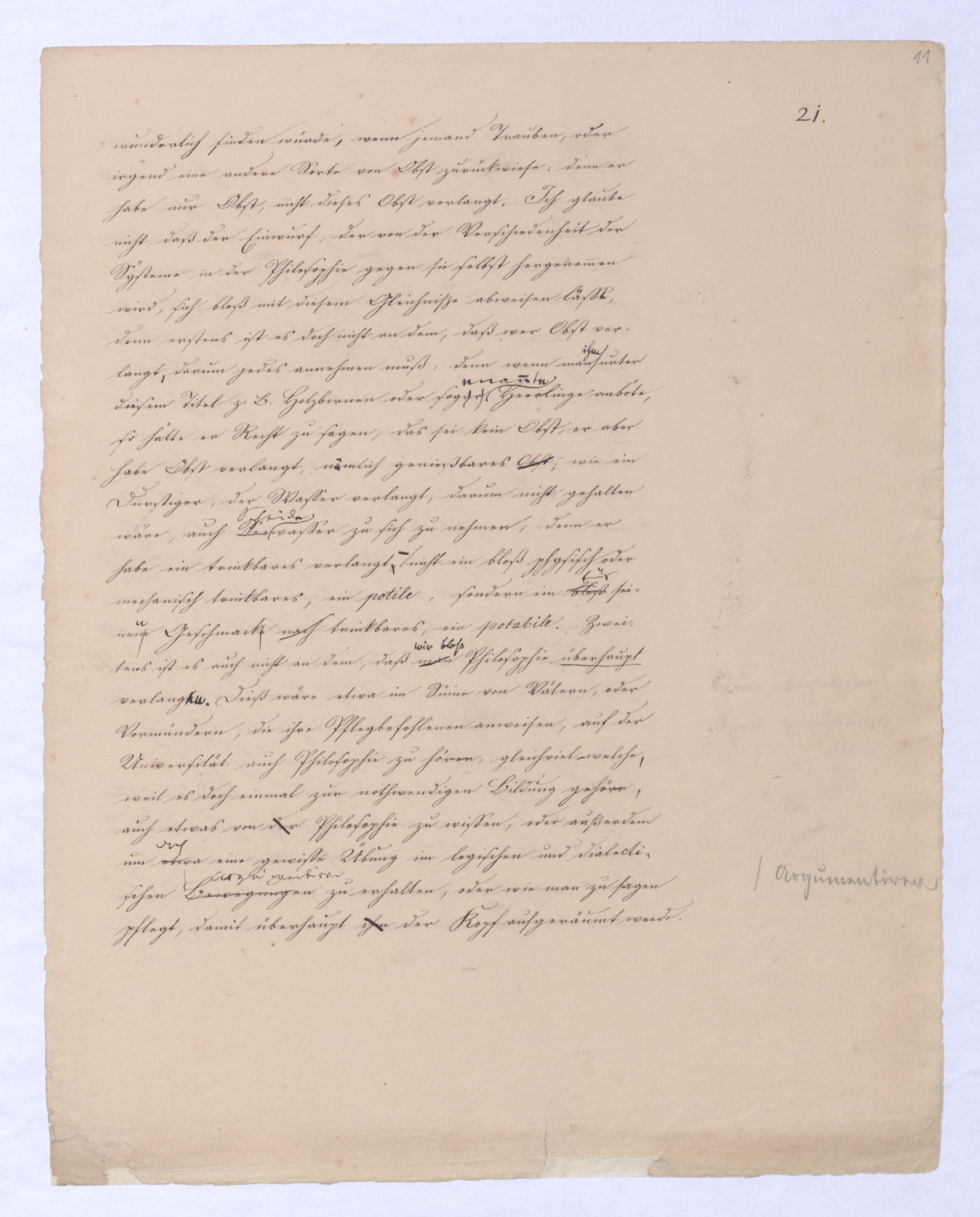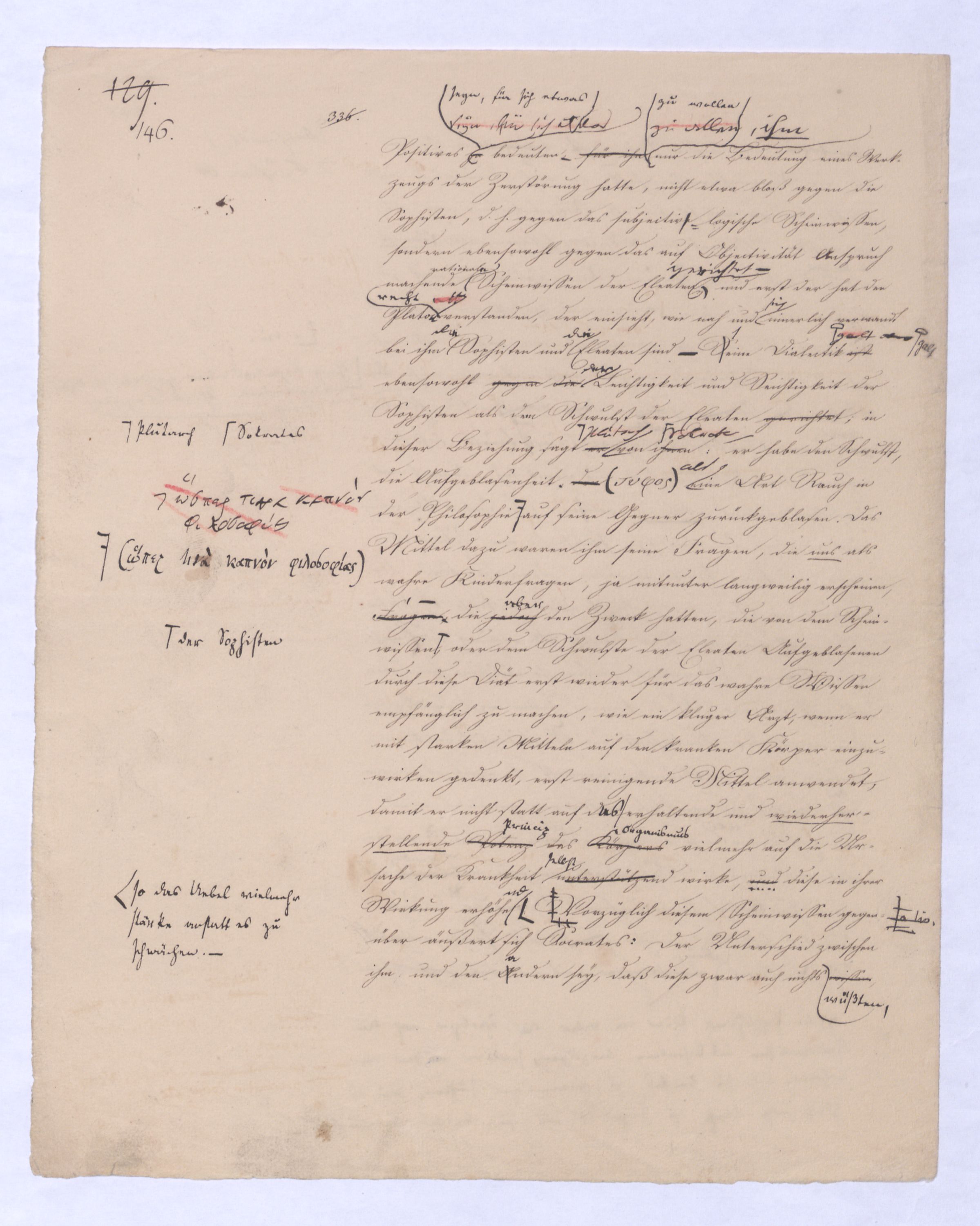 sondern nur das nicht wahrhaft Seyende, das μὴ ὄντως ὄν, weil es auch ein Anderes seyn kann, weil esalso die Potenz und damit das Seyende gleichsam nunnun gleichsam transitorisch ist. Die Vernunft in diese Lage gesetzt will nun immer nur das Seyende selbst; denn nur dieses betrachtet sie als ihren wahren, weil bleibenden Inhalt. Aber sie kann das Seyende selbst, – das, was das Seyende selbst ist, nicht bloß den Schein von ihm hat, und ein Anderes werden kann übergehen kann in das der Vernunft fremdartige, die Natur, Erfahrung u. s. w. sie kann d. Sey. s. nicht erlangen, als durch die Ausschließung eben diesesdes Andern, was nicht das Seyende selbst ist, was nur den Schein des Seyenden an sich selbst hat. A; aber dieß Andere ist im ersten unmittelbaren Gedanken von dem, was das Seyende selbst ist, nicht abzutrennen, ist mithin ihm unabweislich zugleich aufgenommen in den ersten Gedanken. W; wie kann also die Vernunft dasjenes Andere, was eigentlich das Nichtgewollte der Vernunft ist, was sich nur gleichsam mit einschleicht,das nicht eig. Gesetzte sondern nur nicht nicht zu Setzende, was sie nur im ersten Gedanken nicht auszuschließen vermag, wie kann sie es anders ausschließen, als indem sie es eben hervordrängttreten, wirklich erst in Gedanken in sein Anderes, seine Anderheit übergehen läßt, um auf diese Art das wahrhaft Seyende, das ὄντως ὄν zu befreien., u. in sr. Lauterkeit darzustellen. Denn A anders als auf diese Weise läßt es sich dießwirkl. nicht herausbringen. Die Vernunft (, und dasdieß ist nun von größterund hiermit wird ihr das Seyende selbst nichts Anderes seynes wird ihr nicht anders seyend, also nicht anders zum Das was ist, ist ihr nur das, was nicht nicht ist. Dieser negative Begriff ist der einzige, den die Vernunft von dem hat, was das Seyende selbst ist. Dieser negative Begriff ist der einzige also, den die Vernunft für sich von dem Seyenden selbst haben kann, die Vernunft in dem Sinne, wie sie hier immer genommen wird, in wie fern sie nämlich bloß von sich, von ihrem unmittelbaren Inhalt ausgeht.Diej. unter Ihnen, welche meine früheren Vorträge gehört haben, wissen, daß d. Kette, d. Seyenden zu dem die V. erst am Ende gelangt, immer nur negativ bestimmt werden konnte als die Bleib., d. h. als die nicht nicht seyende also seyende Pot., als die nicht übergeh., als die nicht ausschließ. Pot. d. h. frei von dem Seyn u. nur so weit über dem Seyn zu seyn. Die Vernunft also, wenn gleich ihr letztes Ziel u. Absehen nur das Seyende ist, das iIst, kann es doch nicht anders bestimmen, hat keinen Begriff für dasselbe, als den des nicht Nichtseyenden, nicht in ein Anders Übergehenden, d. h. nur einen negativen Begriff, und hiemit ist dann also auch der Begriff einer negativen Wissenschaft gegeben, welcher eben dieß obliegt, den Begriff dessen was d. Seyenden selbst, auf diese Weise zu erzeugen, nämlich indem alles Nichtseyende, was implicite oder potentia mit in dem allgemeinen und unbestimmten Begriff des Seyenden liegt, successiv ausgeschlossen wird. Diese Wissenschaft diekann nicht weiter führen kann, als eben zu diesem negativen Begriff, also überhaupt nur erst zum Begriffe des Seyenden selbst, kannund erst an ihrem Ende überlegenbeweisen, was sieängtange. Es entsteht dann erst die Frage, ob er, der das Resultat jener negativen Wissenschaft u. bloß via exclusionis gewonnen ist, ob er wieder der Gegenstand einer andern und positiven Wissenschaft wird oder werden kannwerde? Vorerstihrder Philos. nur darum zu thun, eben erst den Begriff dessen was das Seyende selbst ist, loszubekommen, es loszutrennen von dem, was diesem Begriffe anhängt im unmittelbaren Gedanken und von diesem ersten Gedanken her. Und eben diese Operation, dass Geschäft der Befreiung ist eben das Geschäft der Vernunft in ihrer ersten und nächsten Wissenschaft. Es ist damit von selbst dargethan, daß diese Wissenschaft, in welcher die Vernunft nur von ihrem unmittelbaren Inhalt ausgeht, wo ihr nichts gegeben ist, als eben dieses, dessen innere Amphibolie aber gezeigt worden ist, daß diese Wiss. nur negativ, also wenn sie eine Philosophie ist nur negative Philosophie seyn kann. Zugleich erklärt sich nun, was die Theorie derGenesis dieser Wissenschaft betrifft, daß ich vom ersten Begriff, welcher der der unendlichen Potenz ist, fortgehen, muß, nicht bleiben, sondern der Potenz, soferne sie Potenz eines andern Seyns ist allerdings in dießdas andere Seyns Werden folgen muß, in die Entfremdung folgen muß, nicht nur weil ich in der so gedachten Potenz d. Prius alles außer d. V. gesetzten Seyns habe, also auf diesem WeiseWege a priori zum Inhalte alles außer der Vernunft und in die Erfahrung gesetzten Seyns gelange, sondern auch darum, weil ich auf diese Weise allein erlangen kann, was ich beabsichtige, oder was die Vernunft will, nämlich nur das Seyende, was ist, das nicht auch nicht seyn kann, dem es unmöglich ist, nicht das Seyende zu seyn. Die Absicht der Vernunft ist,weil ich allein auf diese Weise in dieser Wissenschaft durch die Abscheidung des an sich Unwesentlichen zum Wesentlichen des Wesens, und so zum wahren Wesen, zum wahren Inhalt der Vernunft zu gelangen. Indem ich so meinen Standpunkt bestimme, daß mir nämlich nur das, was das Seyende selbst ist, das wahrhaft Seyende ist, alles Andere aber bloß das Seynkönnende von diesem Standpunkt erklärt sich von selbst, und wird erst vollkommen deutlich, daß dieß Andere, welches nicht das Seyende selbst ist, für mich auch nur die Bedeutung des bloß Möglichen haben kann. Es ist u. es u. daher wie schon gezeigt, nicht als Wirkls (sr. Wirklt. nach deduc. wird) – ferner ist diese Unterscheidung zwischen dem bloß scheinbar Seyenden, welches nur Seynkönnendens und dem wahrh. Seyenden, welches ich wie gesagt nur in dem Seyenden selbst erkenne, von der höchsten Wichtigkeit. Indem ich dem Seyn-Könnenden in Gedanken folge, bleibt mir natürlich, das was das Seyende selbst ist, außer derha