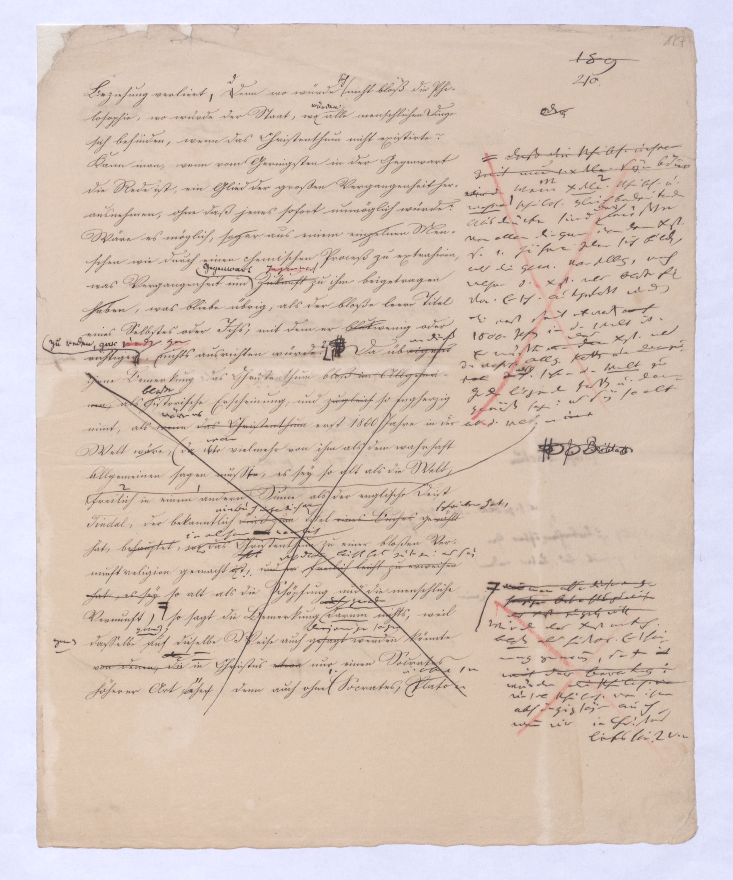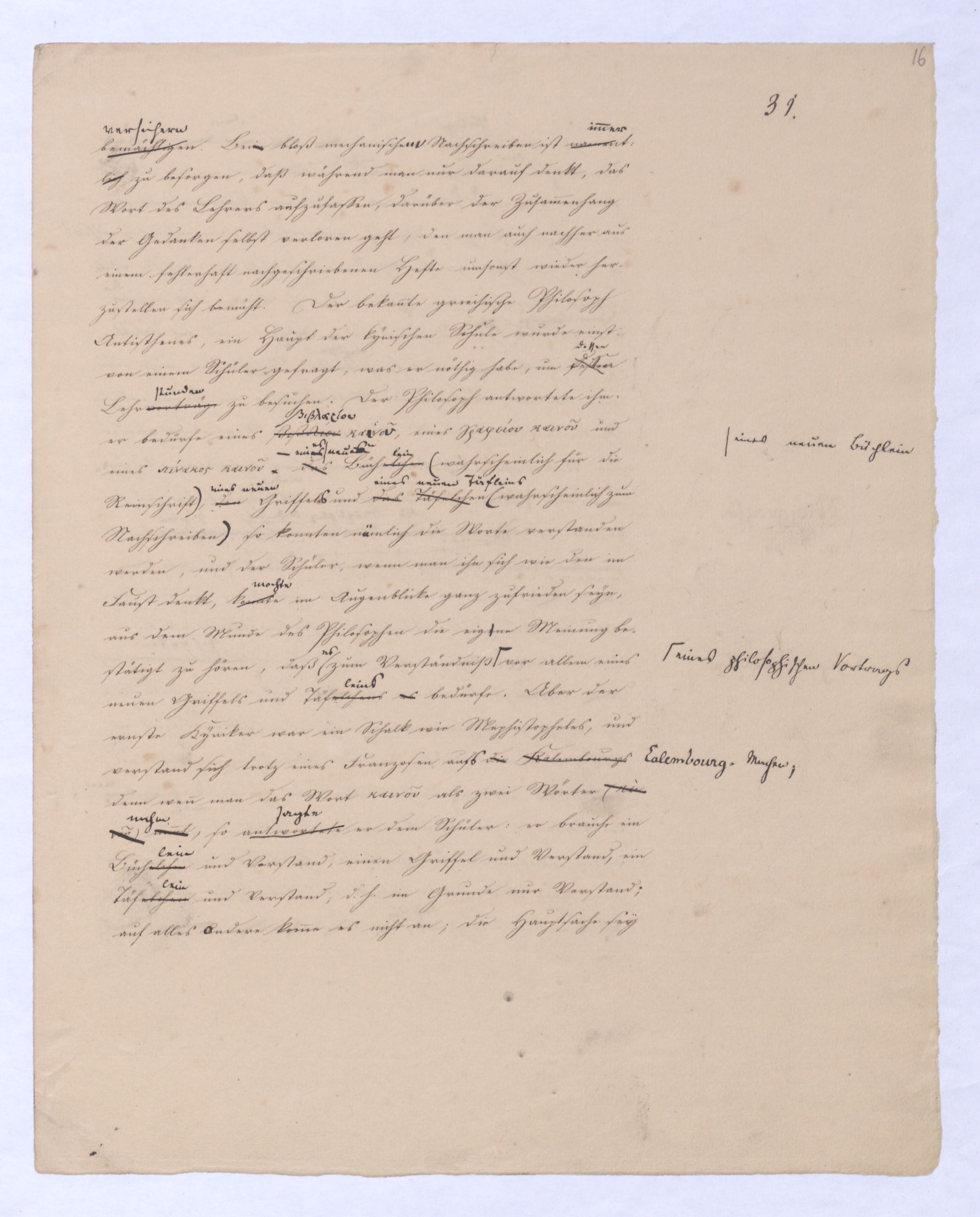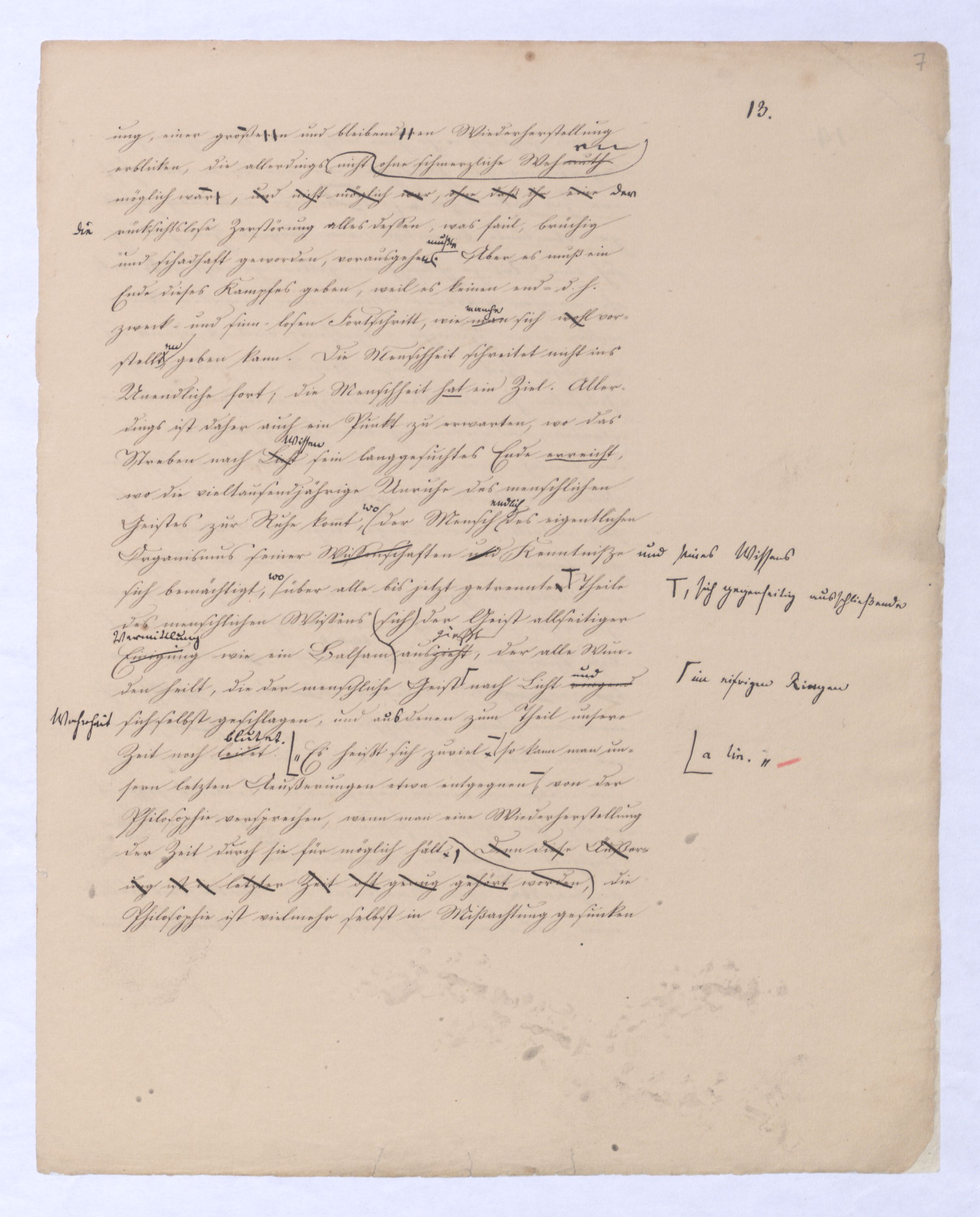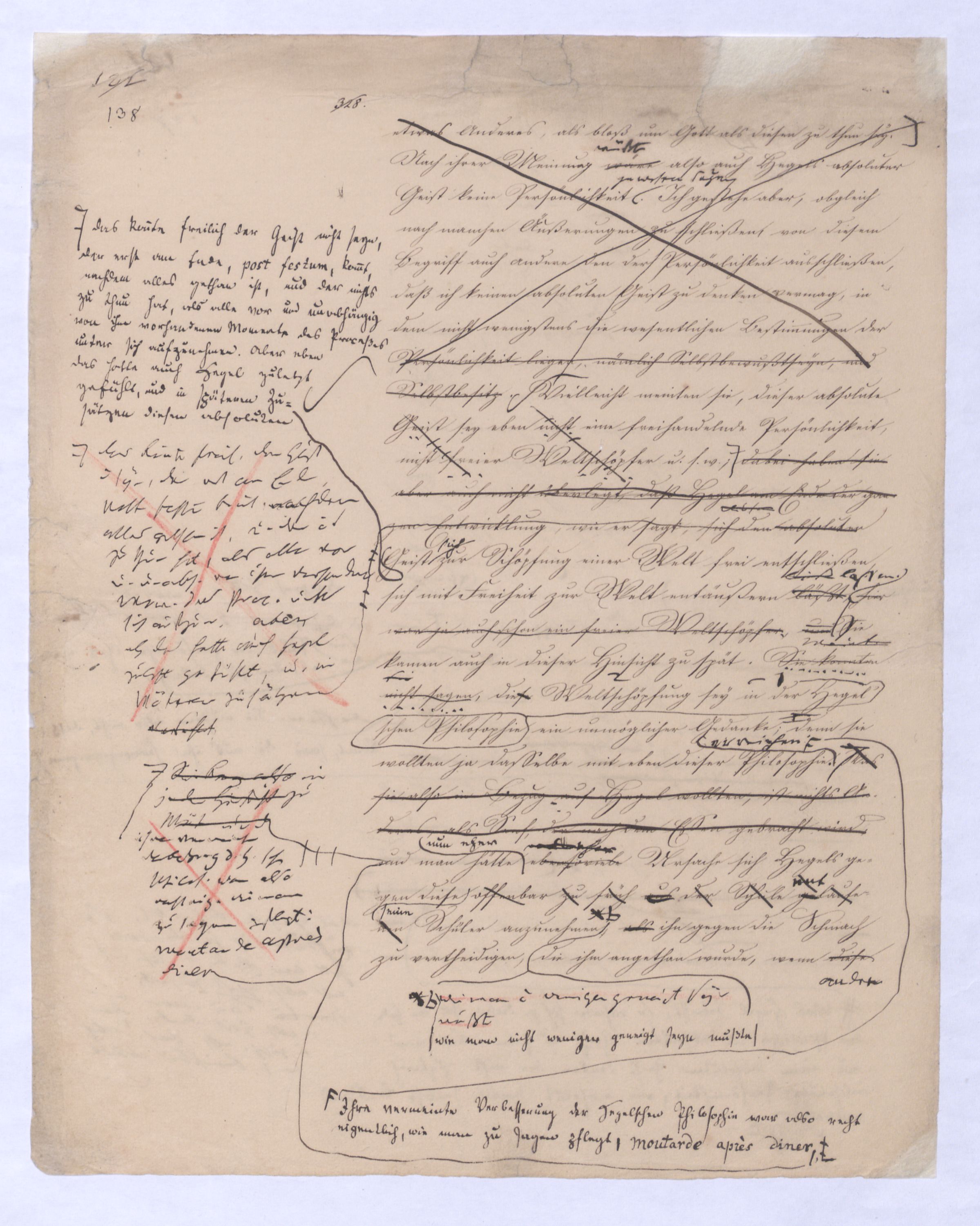 läßtließ lassen, hier war ja auch schon ein freier Weltschöpfer, und s. Sie kamen auch in dieser Hinsicht zu spät. Sie konnten nicht sagen Meinten siediese Weltschöpfung sey in der Hegel’schen Philosophiein der Hegel’schen Philosophie sey die Weltschöpfung ein unmöglicher Gedanke; ¿ denn sie wollten ja dasselbe mit eben dieser Philosophie. Was sie also in Bezug auf Hegel wollten, ist nichts Anderes, als Senf, der nach dem Essen gebraucht wird,Sie kamen also in jeder Hinsicht zu spät und Ihre vermeinte Verbesserung d. H.schen Philos. war also recht eig., wie man zu sagen pflegt: moutarde après diner und man hätte ebensovielenun eher Ursache sich Hegels gegen diese offenbar zu früh aus der Schule gelaufenen Schüler anzunehmen, wie man nicht weniger geneigt seyn mußte als ihn gegen die Schmach zu vertheidigen, die ihm angethan wurde, wenn dieseandre mit herzbrechenden, d. h. jedem kräftigen Denken nur Ekel erregen könnenden, sentimentalen pietistischen Phrasen, wovor er selbst sich entsetzen würde, eines Theils seine Philos einem Theil des Publikums barrwerth zugedachten.zu können dachten, die anders woher genommenen, eig. ¿¿¿ Ideen in d. enge Gefäß zwingen wollten, das sie immer wieder auswirft.