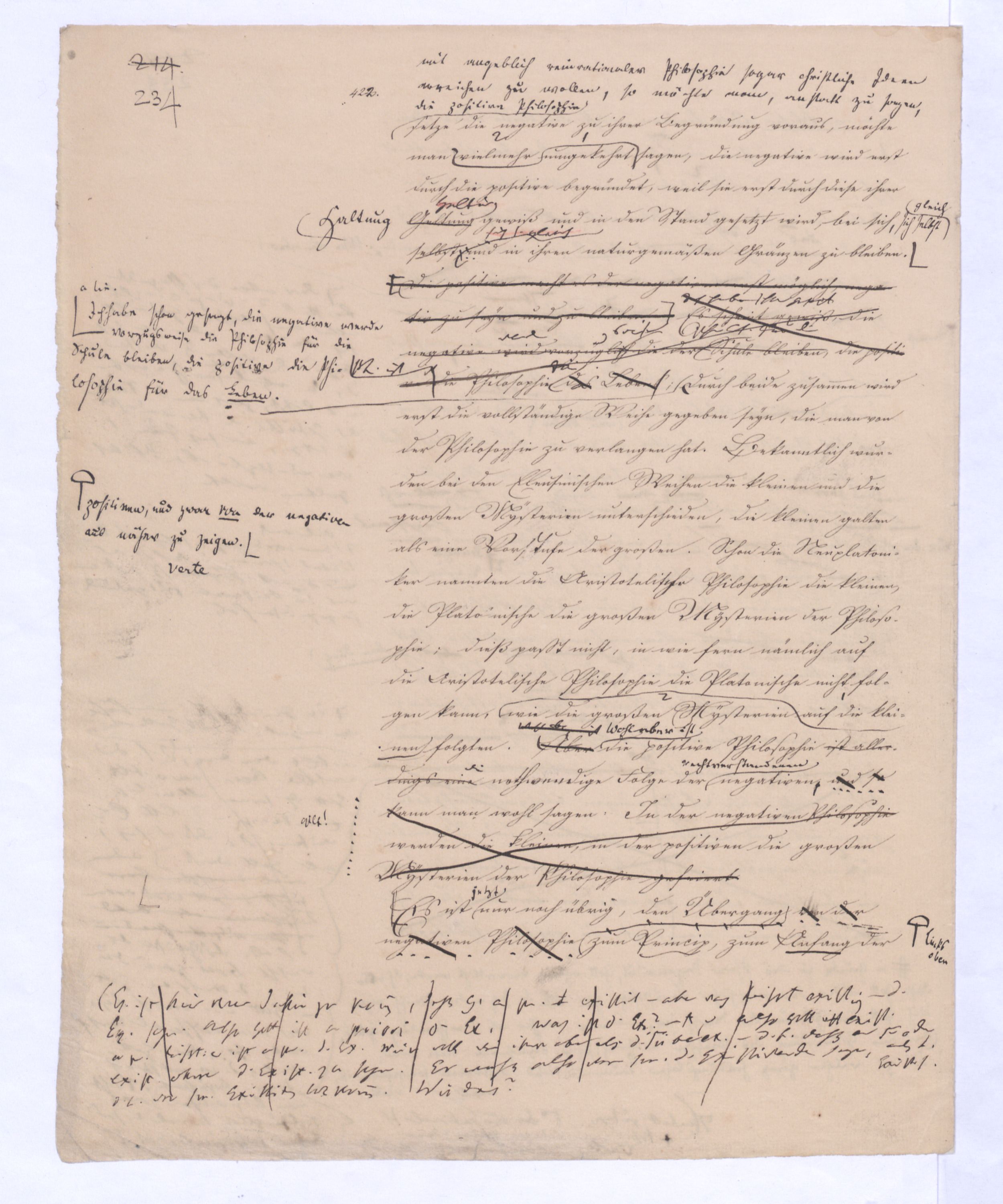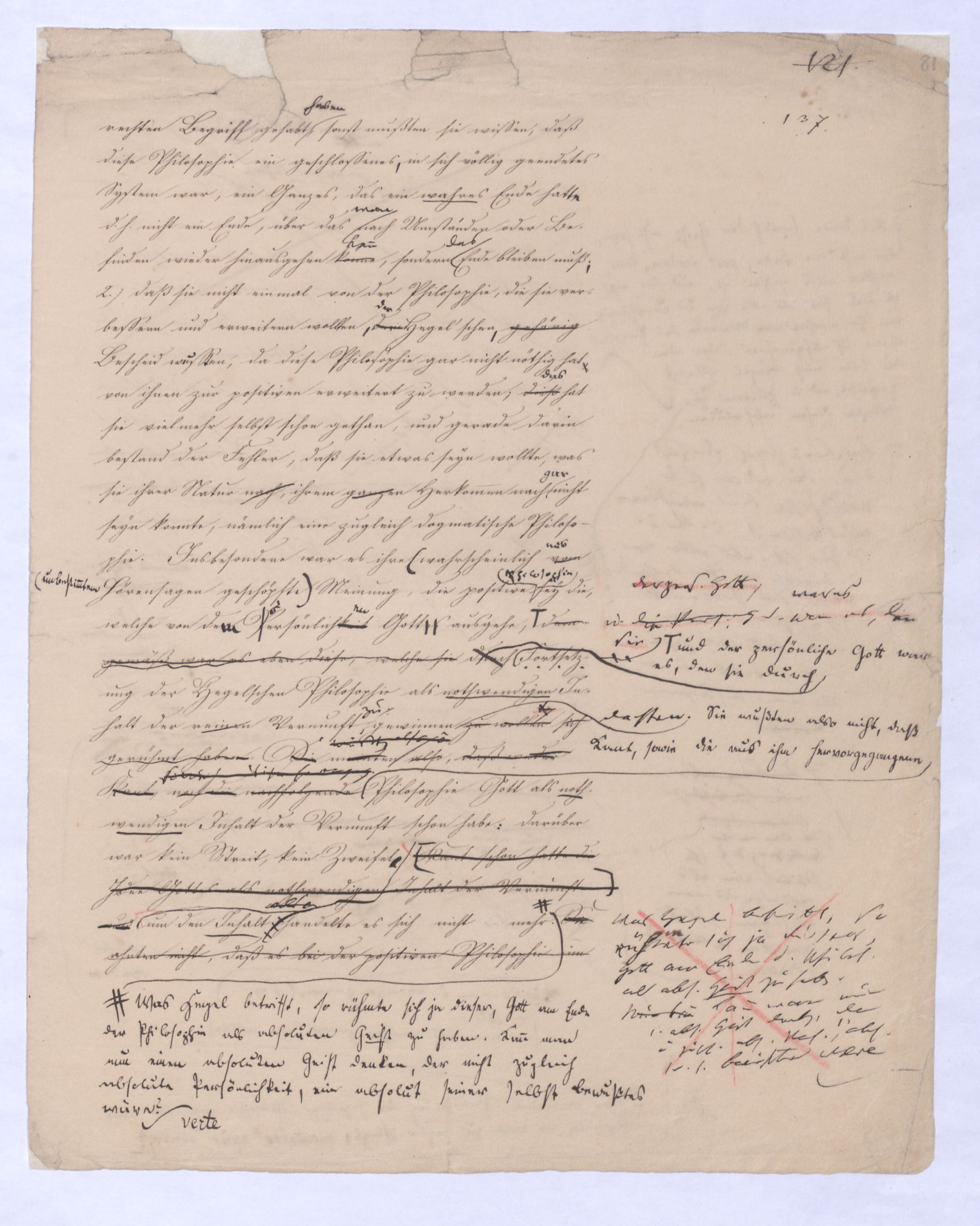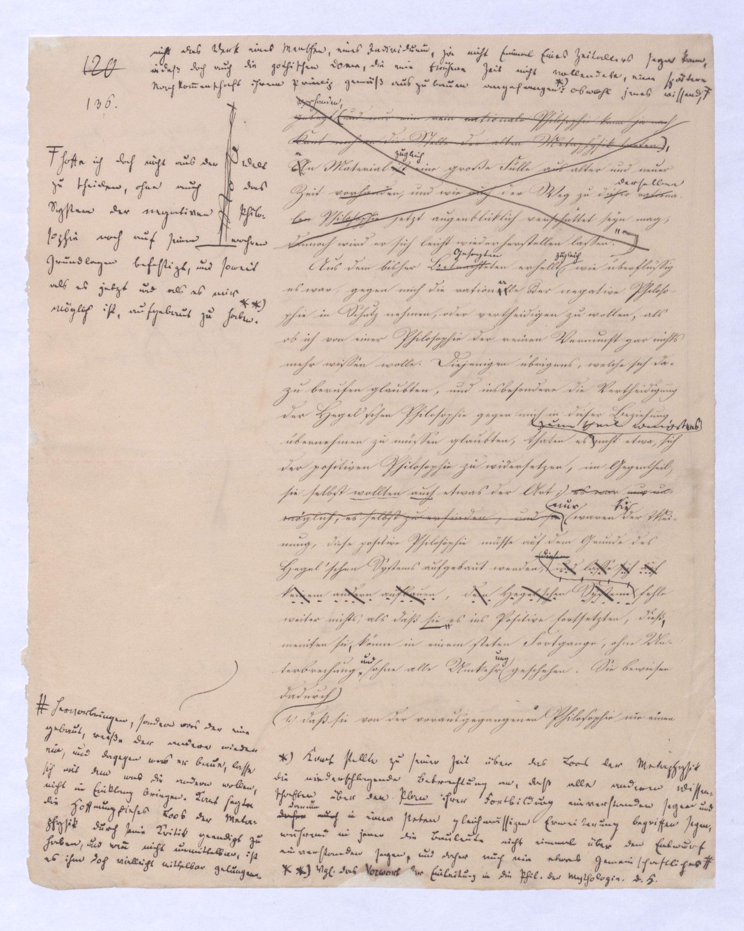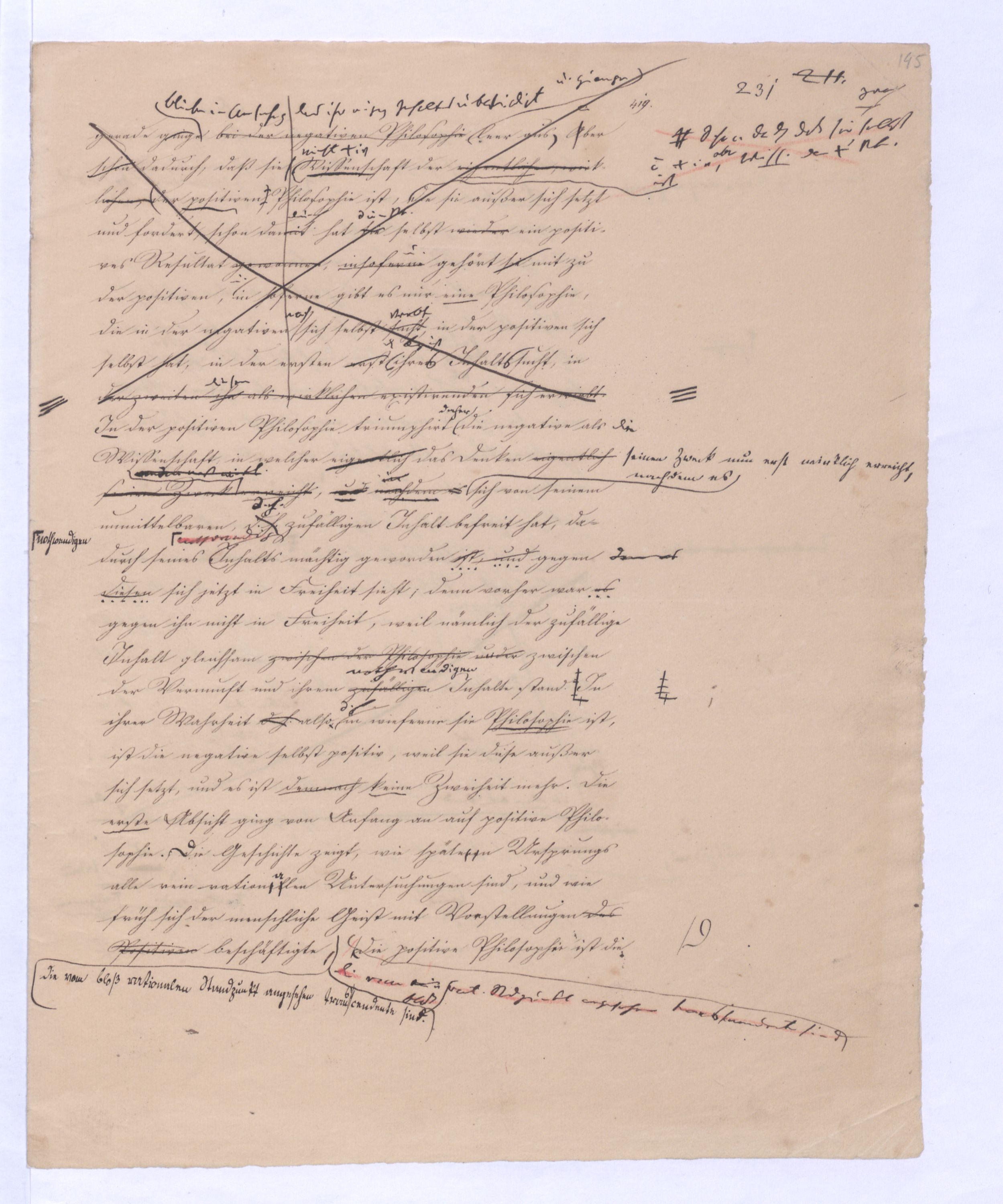 ich kann ihr [der Hegelschen Philosophie] gar nicht zugeben, die negative zu seyn, ihr Grundfehler besteht vielmehr eben darin, daß sie positiv seyn will. Die Aufstellung der positiven ist nicht das Einzige, wodurch ich mich von Hegel unterscheide, die Verschiedenheit istVersch. zwischen H. u. mir ist keine geringere in Betreff des der negativen keine geringere.als d. + Ph. Natürlich erst die recht verstandene (-) bringt führt die + herbei u. umg., denn positive Philosophie ist erst gegen die recht verstandene negative möglich; oder vielmehr, diese, wenn sie in ihre Schranken sich zurückzieht, macht jene erst erkennbar, und dann nicht bloß möglich sondern nothwendig. Indem sie das Positive, die Existenz überhaupt als solche ausschließt, sich bloß mit dem Wesen, dem Ansich der Dinge beschäftigt, setzt sie sie außer sich; die Existenz dringt sich nur so auf, fodert so bestimmt, ebenfalls begriffen zu werden, durch die Philosophie, daß die eine Seite der Philosophie sie nicht ausschließen kann, ohne sie eben darin zu setzen, nämlich außer sich zu setzen. Aber die Philosophie, die Hegel dargestellt, ist die über alleihre Schranken getriebene negat. –, schließt das Positive nicht aus, sondern hat es ihrer Meinung nach in sich, sich unterworfen; das große, von bekanntenden Schülern wiederholt gebrauchte Wort war: »Die volle wirkliche Erkenntniß des göttlichen Daseyns, die Kant der menschlichen Vernunft abgesprochen, sey durch sie gewährt, s. Selbst die christlichen Dogmen, wie wir gehört haben, waren für diese Philosophie nur eine Kleinigkeit., nicht bloß die Dreieinigkeitslehre sondern s. die Menschwerdung Gottes, wie sie in ihr sich ausdr., während d. orthod. Lehre eig. nur von d. Menschwerdung einer göttl. Pers. spricht. – Bekanntlich als Stütze der kirchl. Orthod.« Diese Philosophie, die sich zur positiven aufbläht, während sie ihrem letzten Grunde nach nur negativ seyn kann, die anstatt einer ehrenharften Armuth sich zu rühmen, sich als reich gebärden will, habe ich in meinen öffentlichen Vorträgen schon seit langer Zeit mit aller Kraftnicht erst hier, lange zuvor bestritten, und bestreitewerde sie fortwährend d. h. solange es noch nöthig scheinen kann bestreiten, indeß ich die wahre negative Philosophie, die ihrer selbst bewußt in edler Enthaltsamkeit innerhalb ihrer Schranken sich vollendet, für die größte Wohlthat erklärt, die dem menschlichen Geiste zunächst wenigstens ertheilt werden kann: denn durch eine solche Philosophie ist die Vernunft in das ihr gebührende, in ihr ungeschmälertes Recht eingetreten und eingesetzt, das Wesen, das Ansich der Dinge zu begreifen, und aufzustellen. Die Vernunft wird auf diese Weise beruhigt und in allen ihren gerechten Ansprüchen vollkommen befriedigt, keine Versuchung mehr empfinden, in das Gebiet des Positiven einzubrechen, wie sie dagegen von ihrer Seite des beständigen Ein- und Übergriffs von Seite des Positiven ein für allemal entledigt ist. Es ist seit Kant keine Philosophie in Deutschland aufgetreten, gegen welchen nicht sogleich die Anhänger des Positiven, vorzüglich aber gegen Kant selbst mit der Anklage des Atheismus aufgetreten sind: aber eine Philosophie, welche aufrichtig und offenherzig sich begnügt, den Begriff Gottes als letzte höchste und nothwendige Vernunftidee aufzustellen, ohne Anspruch darauf zu machen, die Existenz Gottes zu beweisen, ist keiner Gefahr mehr eines solchen Ein- und Übergriffs des Positiven, ausgesetzt, sondern kann und wird sich ruhig in sich selbst vollenden.