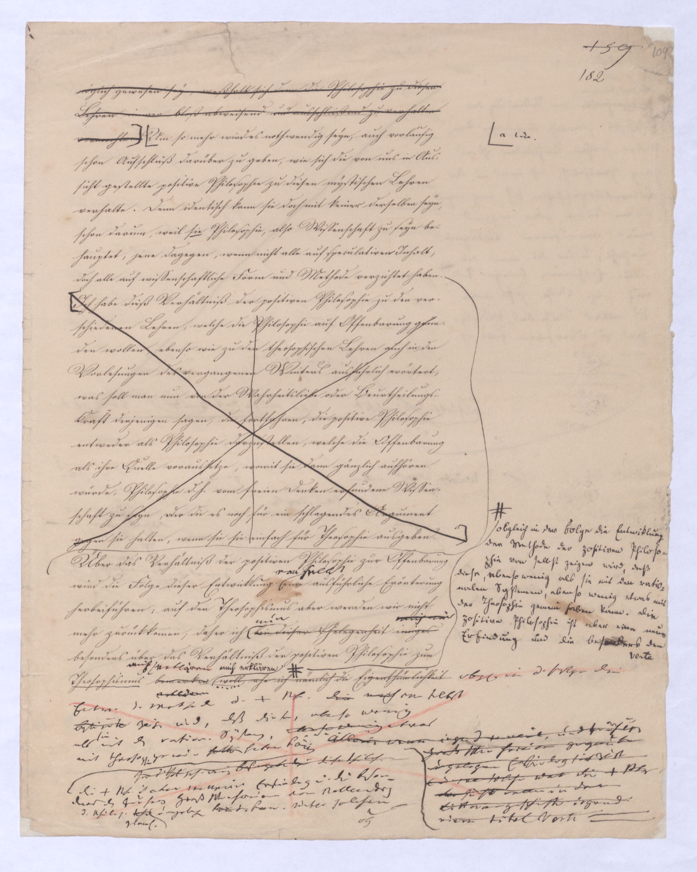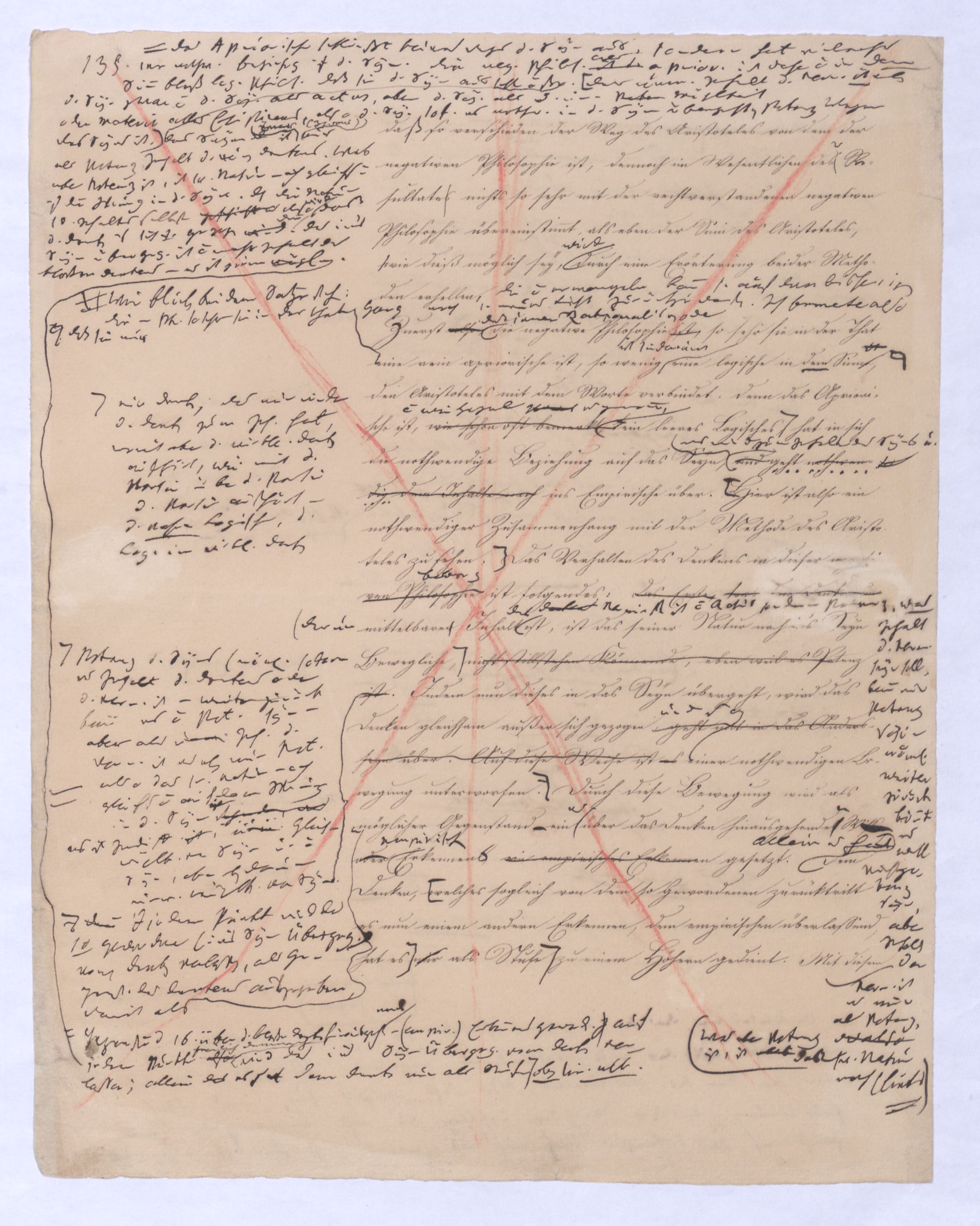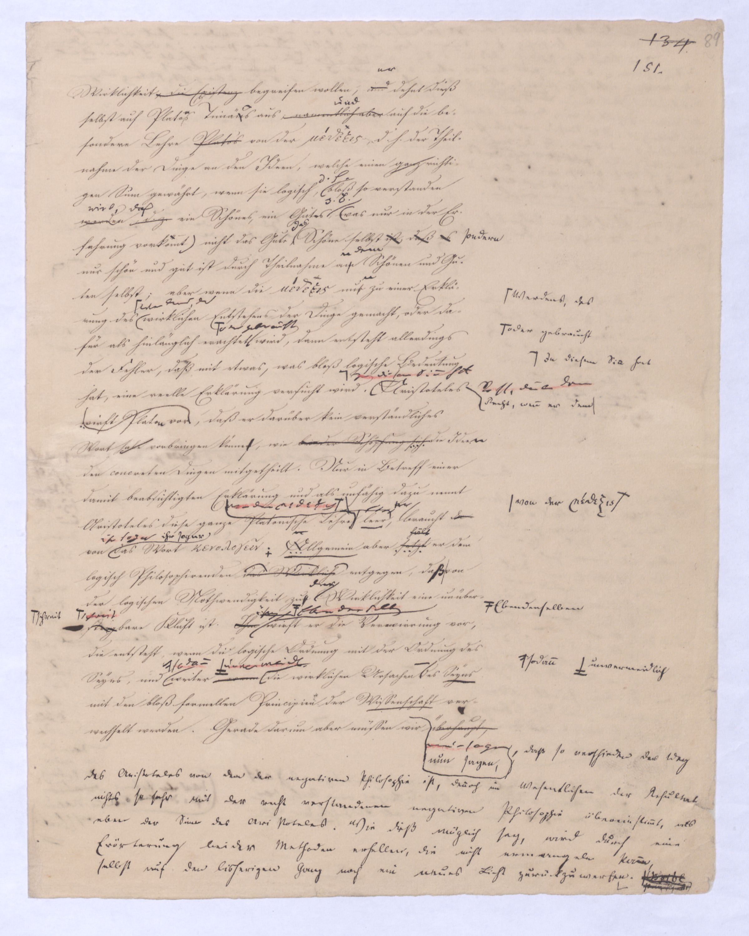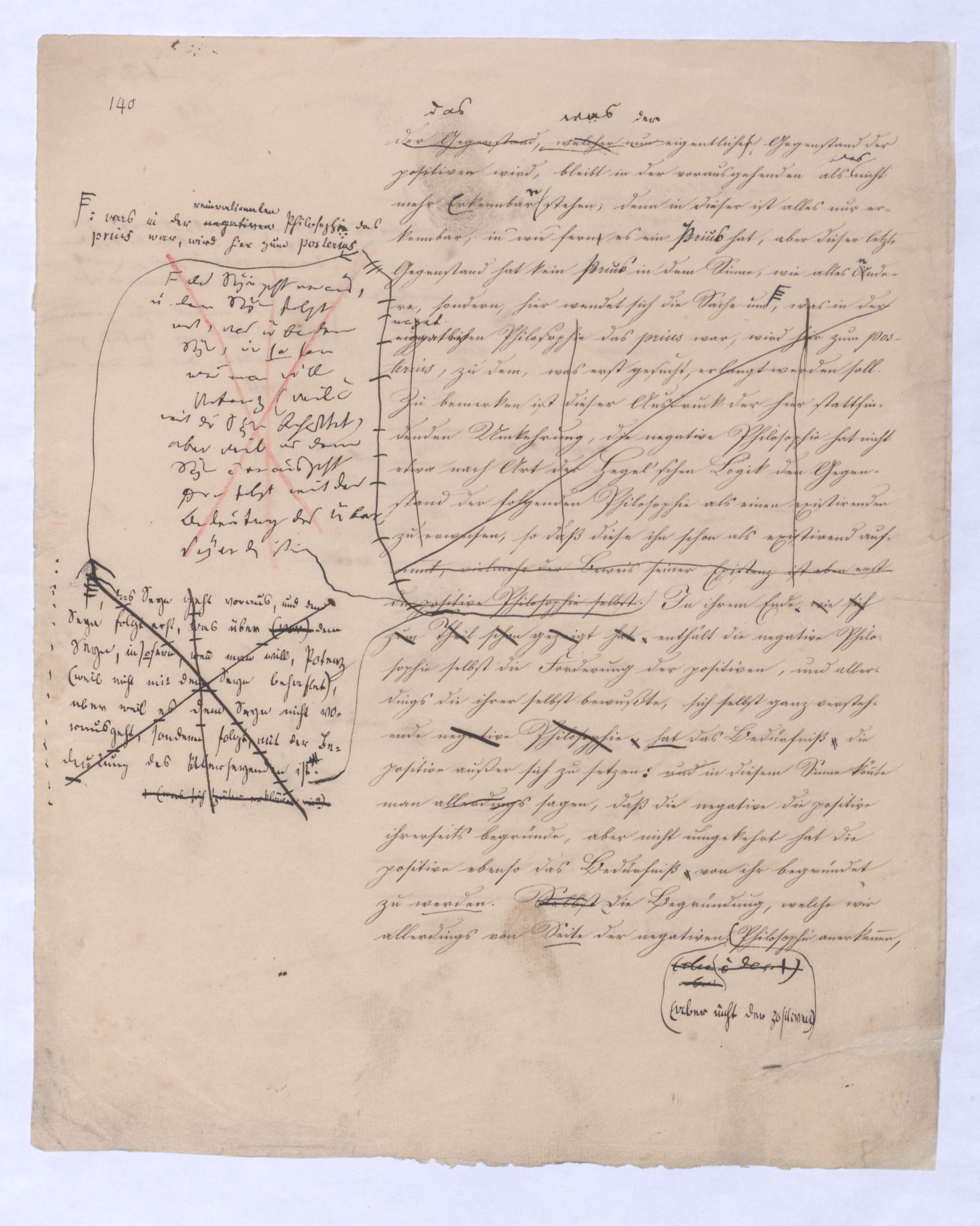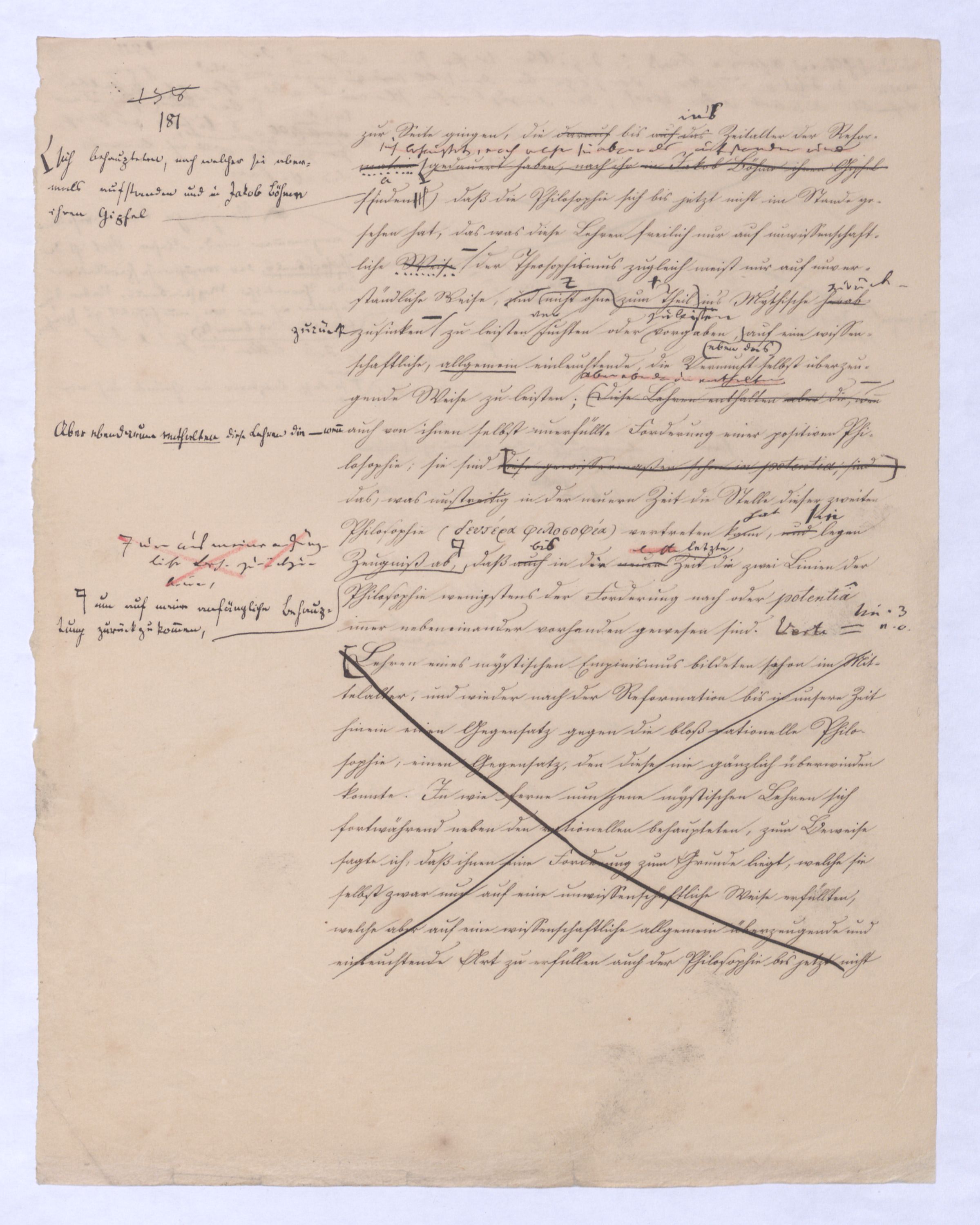 ich kann ihr [der Hegelschen Philosophie] gar nicht zugeben, die negative zu seyn, ihr Grundfehler besteht vielmehr eben darin, daß sie positiv seyn will. Die Aufstellung der positiven ist nicht das Einzige, wodurch ich mich von Hegel unterscheide, die Verschiedenheit istVersch. zwischen H. u. mir ist keine geringere in Betreff des der negativen keine geringere.als d. + Ph. Natürlich erst die recht verstandene (-) bringt führt die + herbei u. umg., denn positive Philosophie ist erst gegen die recht verstandene negative möglich; oder vielmehr, diese, wenn sie in ihre Schranken sich zurückzieht, macht jene erst erkennbar, und dann nicht bloß möglich sondern nothwendig. Indem sie das Positive, die Existenz überhaupt als solche ausschließt, sich bloß mit dem Wesen, dem Ansich der Dinge beschäftigt, setzt sie sie außer sich; die Existenz dringt sich nur so auf, fodert so bestimmt, ebenfalls begriffen zu werden, durch die Philosophie, daß die eine Seite der Philosophie sie nicht ausschließen kann, ohne sie eben darin zu setzen, nämlich außer sich zu setzen. Aber die Philosophie, die Hegel dargestellt, ist die über alleihre Schranken getriebene negat. –, schließt das Positive nicht aus, sondern hat es ihrer Meinung nach in sich, sich unterworfen; das große, von bekanntenden Schülern wiederholt gebrauchte Wort war: »Die volle wirkliche Erkenntniß des göttlichen Daseyns, die Kant der menschlichen Vernunft abgesprochen, sey durch sie gewährt, s. Selbst die christlichen Dogmen, wie wir gehört haben, waren für diese Philosophie nur eine Kleinigkeit., nicht bloß die Dreieinigkeitslehre sondern s. die Menschwerdung Gottes, wie sie in ihr sich ausdr., während d. orthod. Lehre eig. nur von d. Menschwerdung einer göttl. Pers. spricht. – Bekanntlich als Stütze der kirchl. Orthod.« Diese Philosophie, die sich zur positiven aufbläht, während sie ihrem letzten Grunde nach nur negativ seyn kann, die anstatt einer ehrenharften Armuth sich zu rühmen, sich als reich gebärden will, habe ich in meinen öffentlichen Vorträgen schon seit langer Zeit mit aller Kraftnicht erst hier, lange zuvor bestritten, und bestreitewerde sie fortwährend d. h. solange es noch nöthig scheinen kann bestreiten, indeß ich die wahre negative Philosophie, die ihrer selbst bewußt in edler Enthaltsamkeit innerhalb ihrer Schranken sich vollendet, für die größte Wohlthat erklärt, die dem menschlichen Geiste zunächst wenigstens ertheilt werden kann: denn durch eine solche Philosophie ist die Vernunft in das ihr gebührende, in ihr ungeschmälertes Recht eingetreten und eingesetzt, das Wesen, das Ansich der Dinge zu begreifen, und aufzustellen. Die Vernunft wird auf diese Weise beruhigt und in allen ihren gerechten Ansprüchen vollkommen befriedigt, keine Versuchung mehr empfinden, in das Gebiet des Positiven einzubrechen, wie sie dagegen von ihrer Seite des beständigen Ein- und Übergriffs von Seite des Positiven ein für allemal entledigt ist. Es ist seit Kant keine Philosophie in Deutschland aufgetreten, gegen welchen nicht sogleich die Anhänger des Positiven, vorzüglich aber gegen Kant selbst mit der Anklage des Atheismus aufgetreten sind: aber eine Philosophie, welche aufrichtig und offenherzig sich begnügt, den Begriff Gottes als letzte höchste und nothwendige Vernunftidee aufzustellen, ohne Anspruch darauf zu machen, die Existenz Gottes zu beweisen, ist keiner Gefahr mehr eines solchen Ein- und Übergriffs des Positiven, ausgesetzt, sondern kann und wird sich ruhig in sich selbst vollenden.