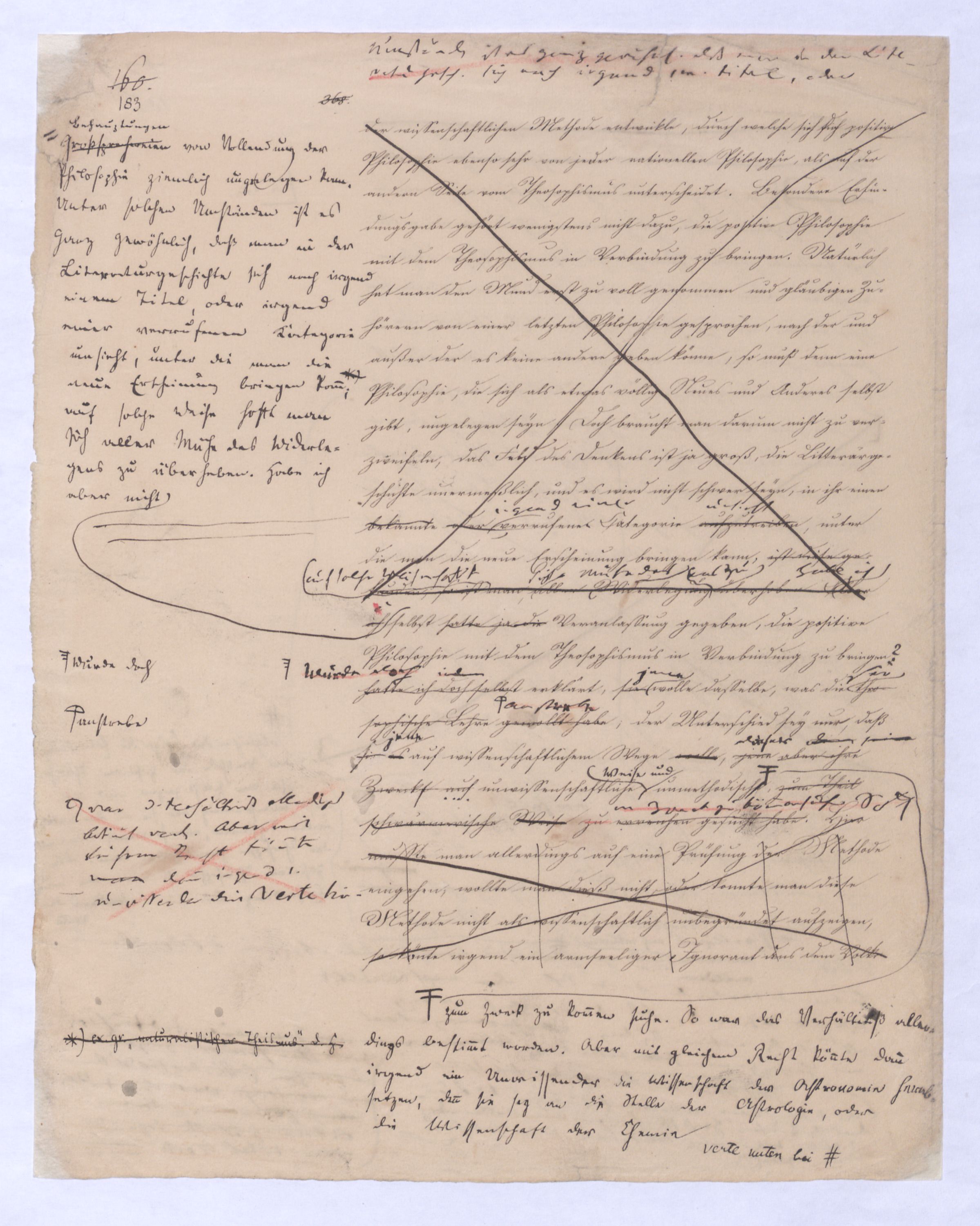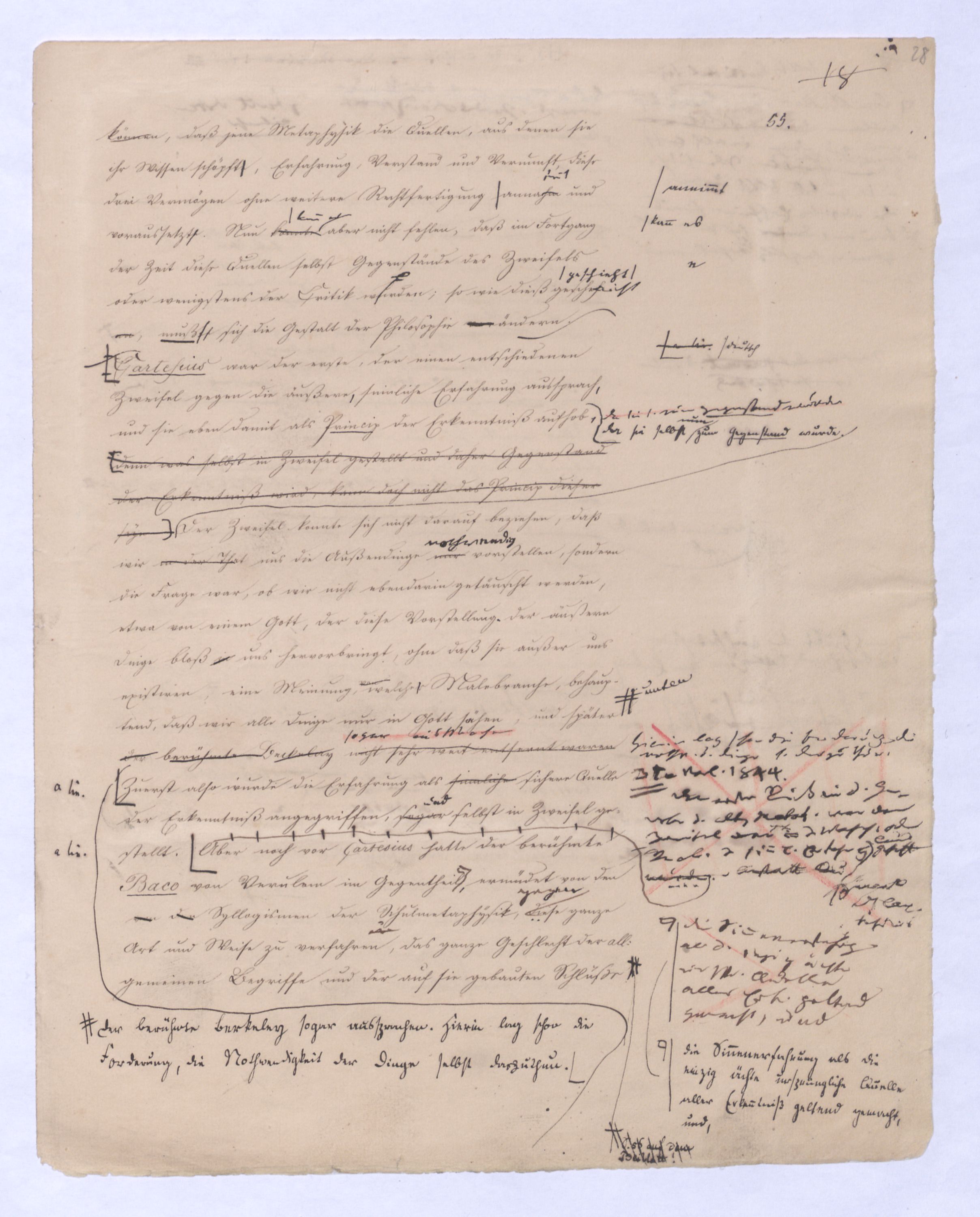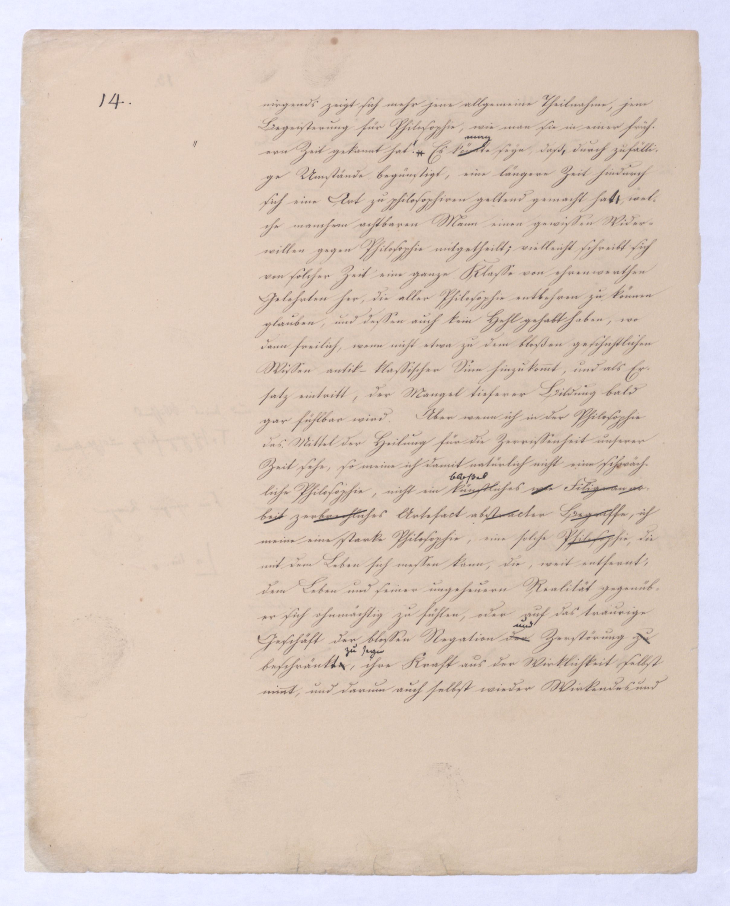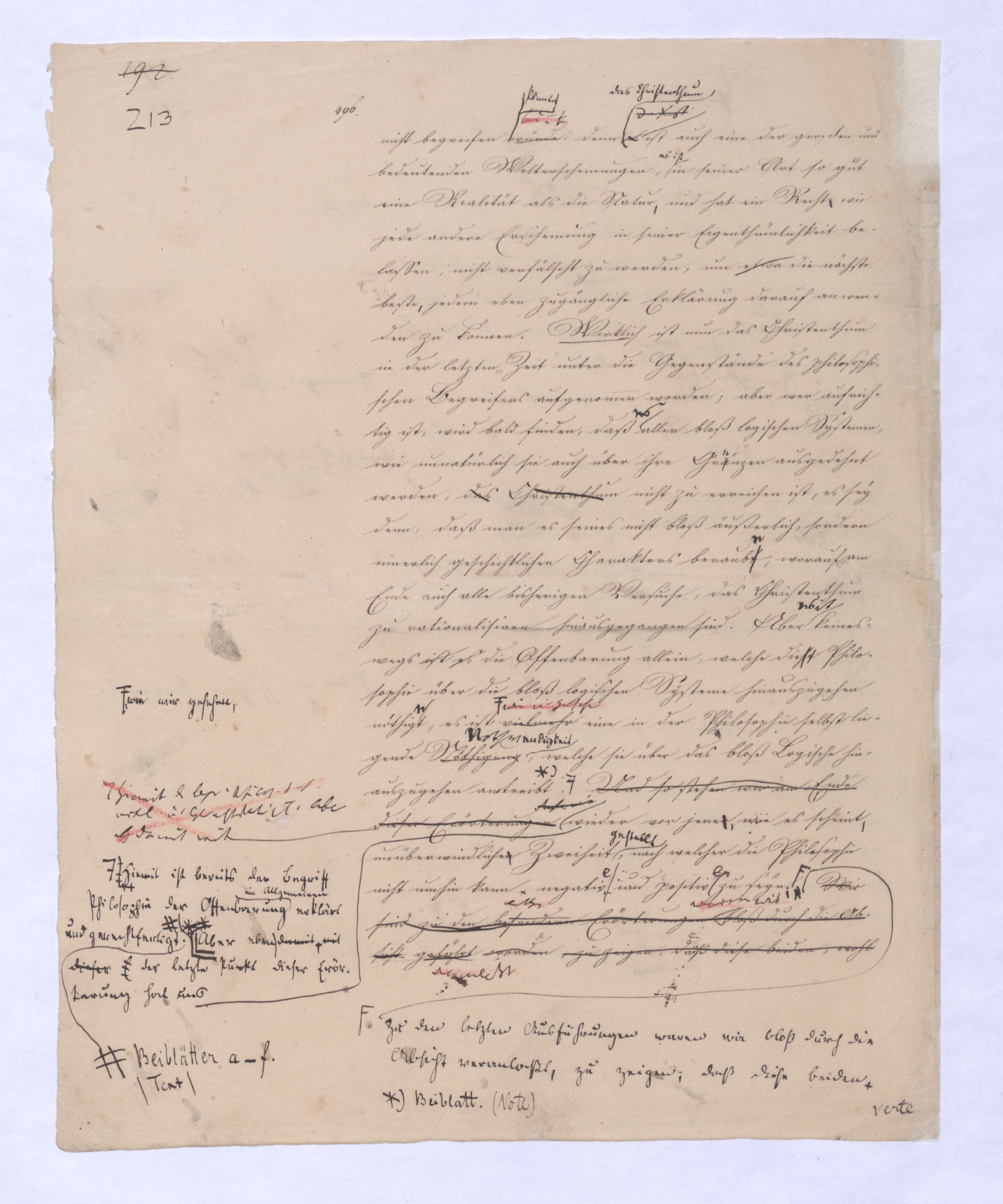 ich kann ihr [der Hegelschen Philosophie] gar nicht zugeben, die negative zu seyn, ihr Grundfehler besteht vielmehr eben darin, daß sie positiv seyn will. Die Aufstellung der positiven ist nicht das Einzige, wodurch ich mich von Hegel unterscheide, die Verschiedenheit istVersch. zwischen H. u. mir ist keine geringere in Betreff des der negativen keine geringere.als d. + Ph. Natürlich erst die recht verstandene (-) bringt führt die + herbei u. umg., denn positive Philosophie ist erst gegen die recht verstandene negative möglich; oder vielmehr, diese, wenn sie in ihre Schranken sich zurückzieht, macht jene erst erkennbar, und dann nicht bloß möglich sondern nothwendig. Indem sie das Positive, die Existenz überhaupt als solche ausschließt, sich bloß mit dem Wesen, dem Ansich der Dinge beschäftigt, setzt sie sie außer sich; die Existenz dringt sich nur so auf, fodert so bestimmt, ebenfalls begriffen zu werden, durch die Philosophie, daß die eine Seite der Philosophie sie nicht ausschließen kann, ohne sie eben darin zu setzen, nämlich außer sich zu setzen. Aber die Philosophie, die Hegel dargestellt, ist die über alleihre Schranken getriebene negat. –, schließt das Positive nicht aus, sondern hat es ihrer Meinung nach in sich, sich unterworfen; das große, von bekanntenden Schülern wiederholt gebrauchte Wort war: »Die volle wirkliche Erkenntniß des göttlichen Daseyns, die Kant der menschlichen Vernunft abgesprochen, sey durch sie gewährt, s. Selbst die christlichen Dogmen, wie wir gehört haben, waren für diese Philosophie nur eine Kleinigkeit., nicht bloß die Dreieinigkeitslehre sondern s. die Menschwerdung Gottes, wie sie in ihr sich ausdr., während d. orthod. Lehre eig. nur von d. Menschwerdung einer göttl. Pers. spricht. – Bekanntlich als Stütze der kirchl. Orthod.« Diese Philosophie, die sich zur positiven aufbläht, während sie ihrem letzten Grunde nach nur negativ seyn kann, die anstatt einer ehrenharften Armuth sich zu rühmen, sich als reich gebärden will, habe ich in meinen öffentlichen Vorträgen schon seit langer Zeit mit aller Kraftnicht erst hier, lange zuvor bestritten, und bestreitewerde sie fortwährend d. h. solange es noch nöthig scheinen kann bestreiten, indeß ich die wahre negative Philosophie, die ihrer selbst bewußt in edler Enthaltsamkeit innerhalb ihrer Schranken sich vollendet, für die größte Wohlthat erklärt, die dem menschlichen Geiste zunächst wenigstens ertheilt werden kann: denn durch eine solche Philosophie ist die Vernunft in das ihr gebührende, in ihr ungeschmälertes Recht eingetreten und eingesetzt, das Wesen, das Ansich der Dinge zu begreifen, und aufzustellen. Die Vernunft wird auf diese Weise beruhigt und in allen ihren gerechten Ansprüchen vollkommen befriedigt, keine Versuchung mehr empfinden, in das Gebiet des Positiven einzubrechen, wie sie dagegen von ihrer Seite des beständigen Ein- und Übergriffs von Seite des Positiven ein für allemal entledigt ist. Es ist seit Kant keine Philosophie in Deutschland aufgetreten, gegen welchen nicht sogleich die Anhänger des Positiven, vorzüglich aber gegen Kant selbst mit der Anklage des Atheismus aufgetreten sind: aber eine Philosophie, welche aufrichtig und offenherzig sich begnügt, den Begriff Gottes als letzte höchste und nothwendige Vernunftidee aufzustellen, ohne Anspruch darauf zu machen, die Existenz Gottes zu beweisen, ist keiner Gefahr mehr eines solchen Ein- und Übergriffs des Positiven, ausgesetzt, sondern kann und wird sich ruhig in sich selbst vollenden.
