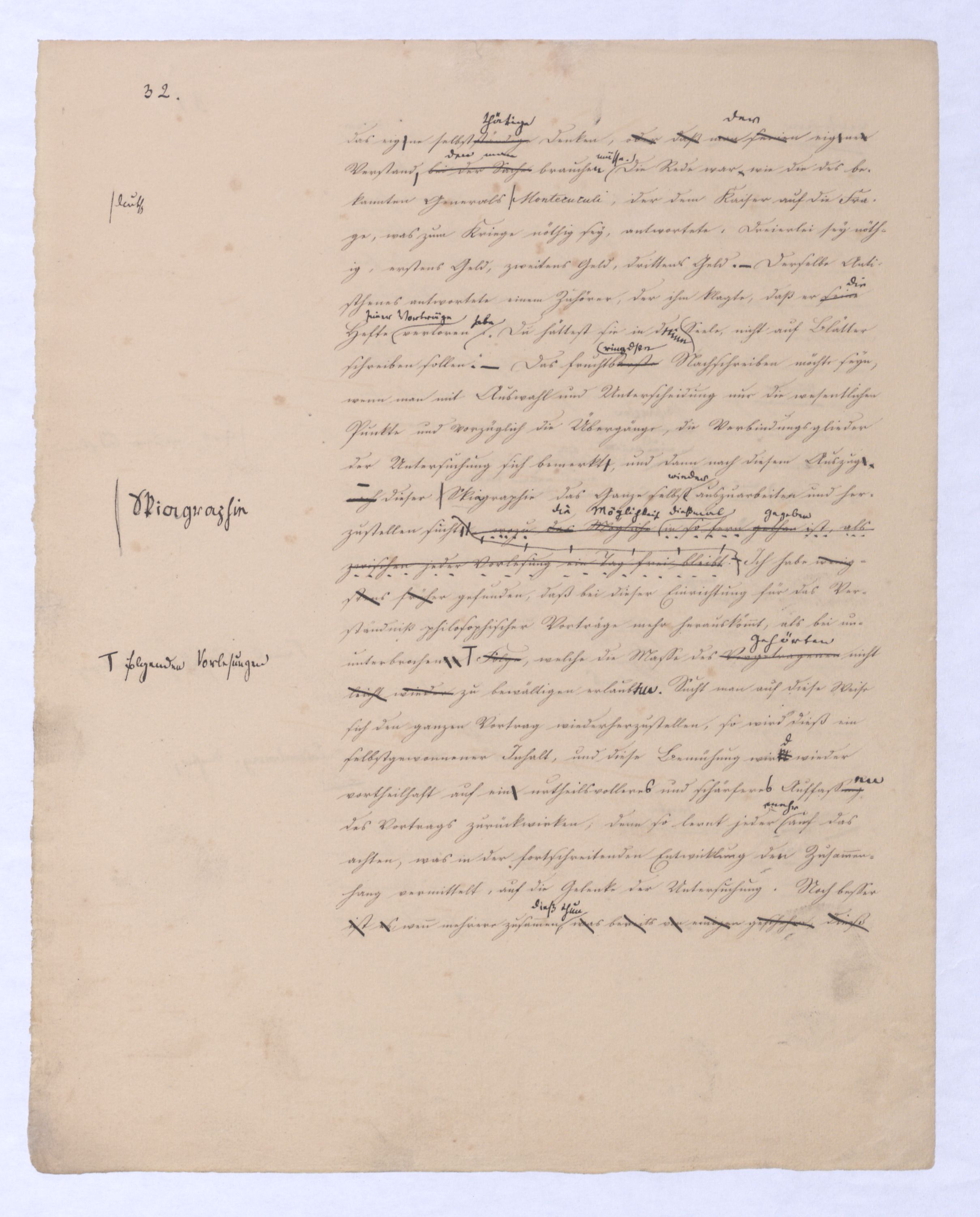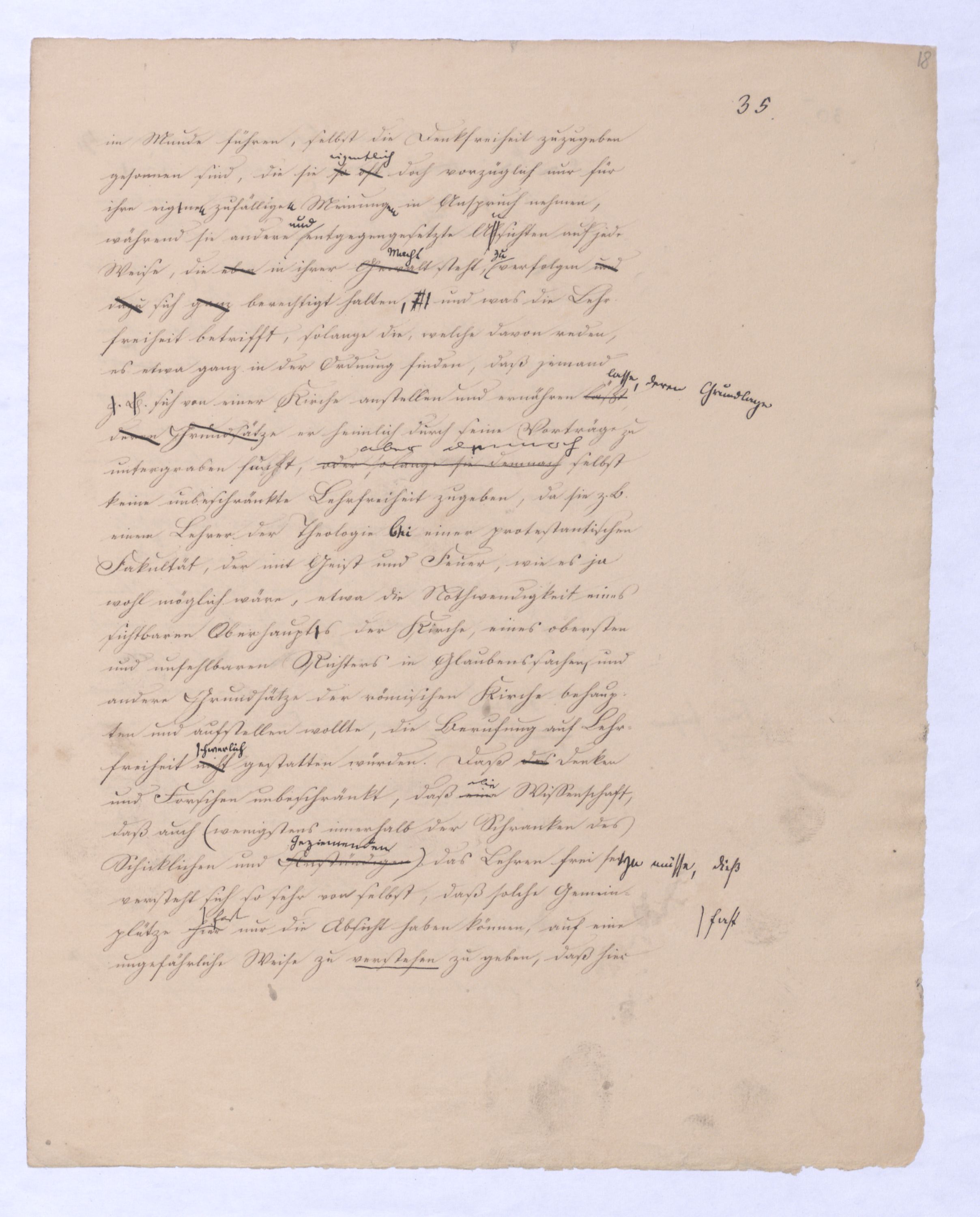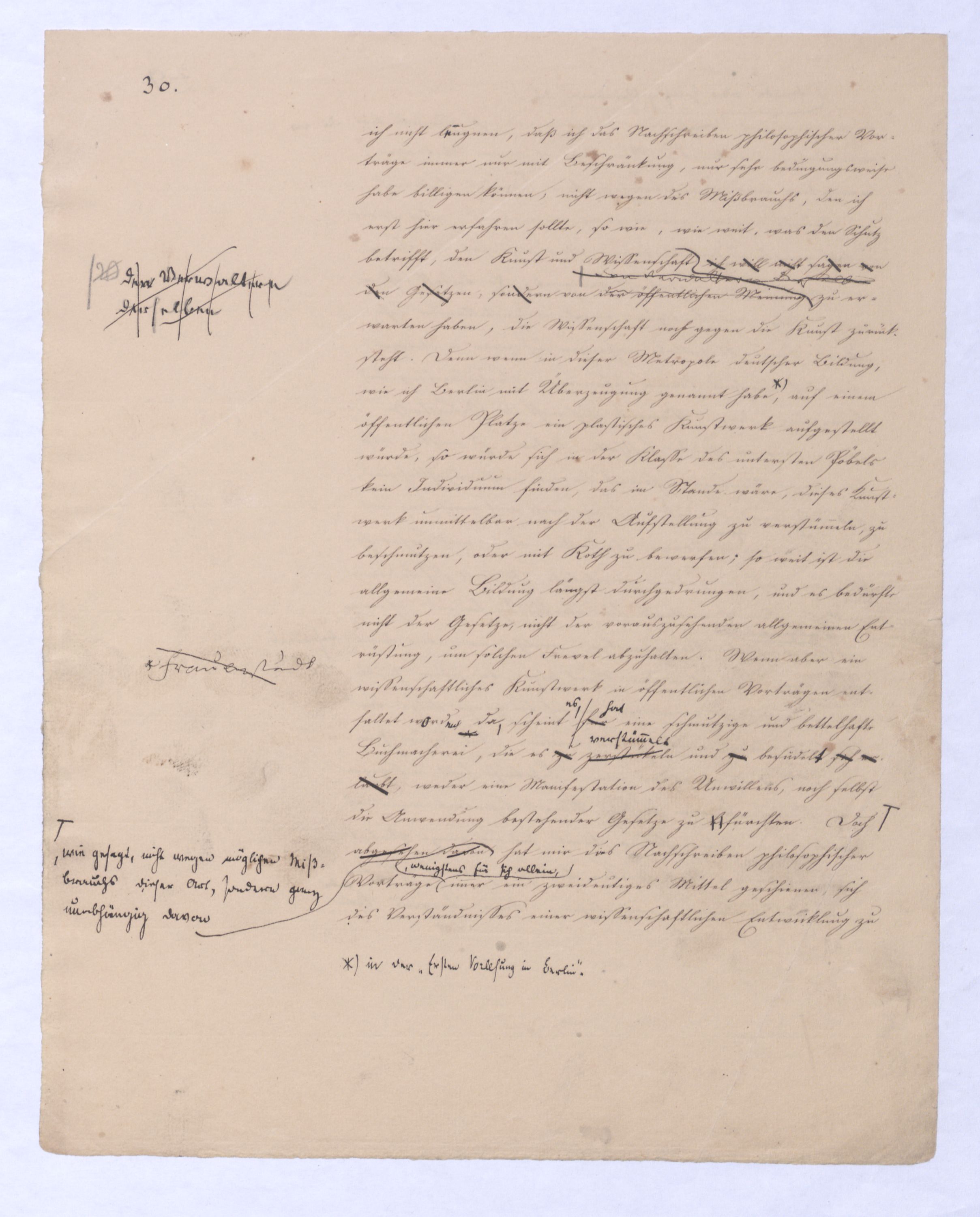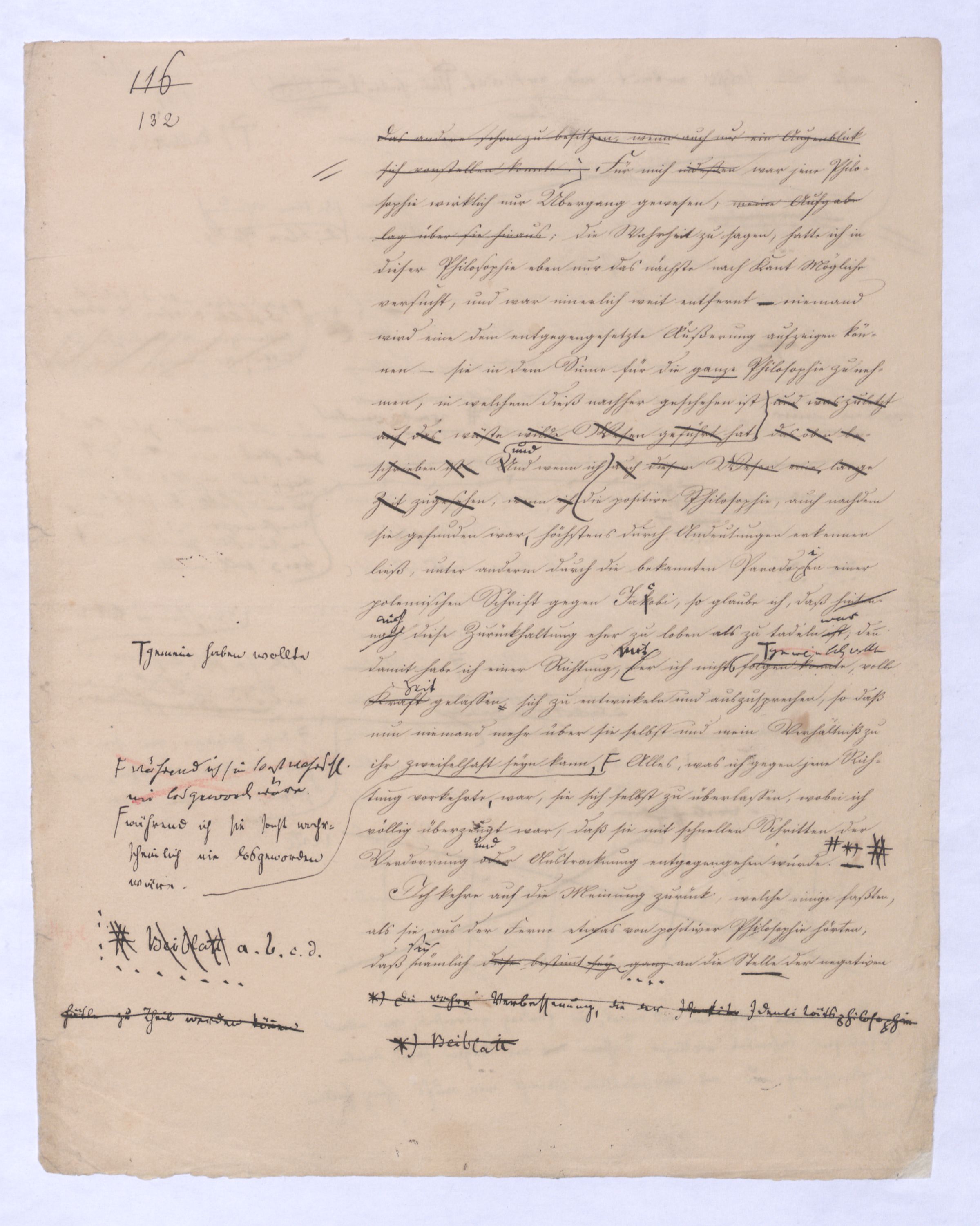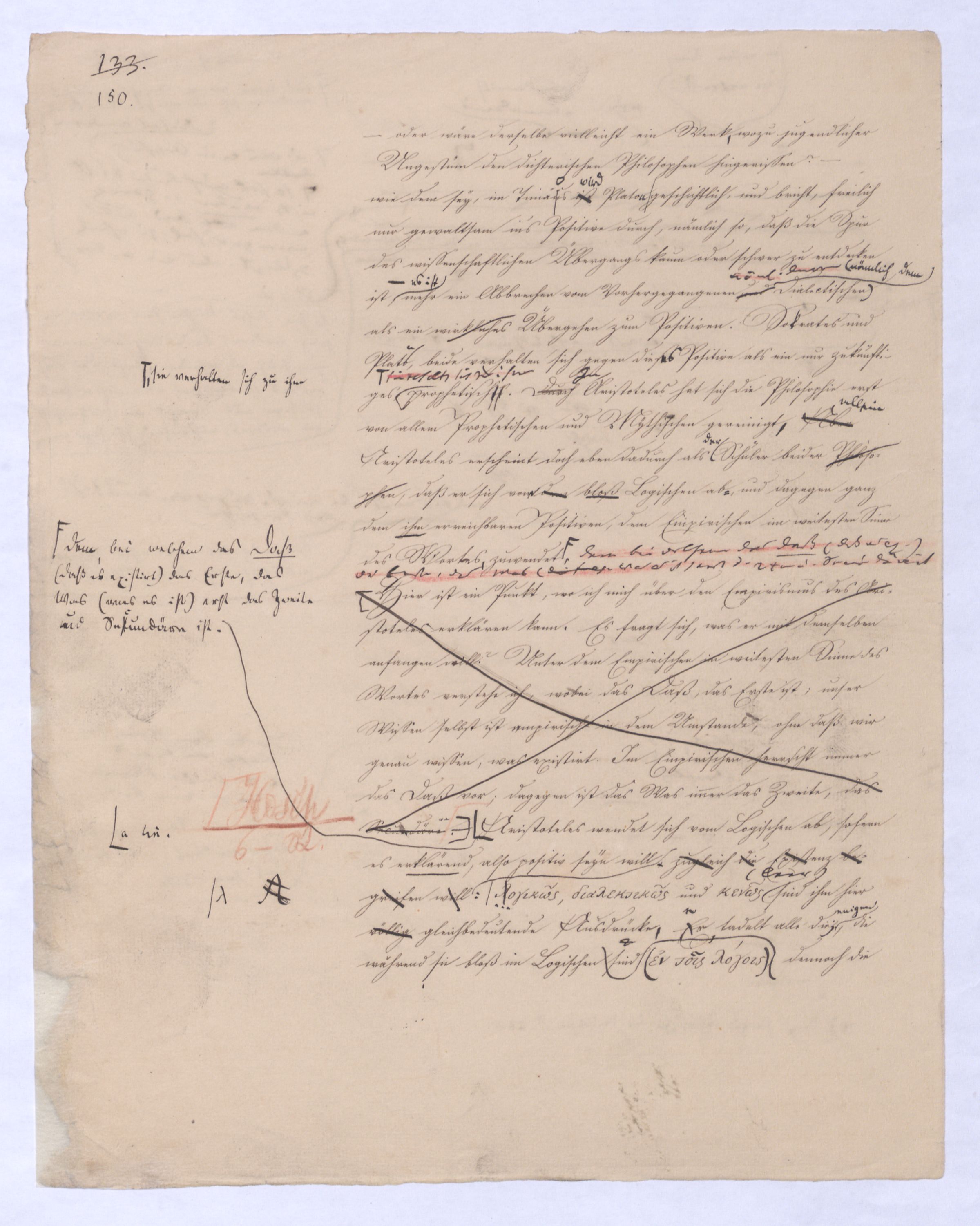 ich kann ihr [der Hegelschen Philosophie] gar nicht zugeben, die negative zu seyn, ihr Grundfehler besteht vielmehr eben darin, daß sie positiv seyn will. Die Aufstellung der positiven ist nicht das Einzige, wodurch ich mich von Hegel unterscheide, die Verschiedenheit istVersch. zwischen H. u. mir ist keine geringere in Betreff des der negativen keine geringere.als d. + Ph. Natürlich erst die recht verstandene (-) bringt führt die + herbei u. umg., denn positive Philosophie ist erst gegen die recht verstandene negative möglich; oder vielmehr, diese, wenn sie in ihre Schranken sich zurückzieht, macht jene erst erkennbar, und dann nicht bloß möglich sondern nothwendig. Indem sie das Positive, die Existenz überhaupt als solche ausschließt, sich bloß mit dem Wesen, dem Ansich der Dinge beschäftigt, setzt sie sie außer sich; die Existenz dringt sich nur so auf, fodert so bestimmt, ebenfalls begriffen zu werden, durch die Philosophie, daß die eine Seite der Philosophie sie nicht ausschließen kann, ohne sie eben darin zu setzen, nämlich außer sich zu setzen. Aber die Philosophie, die Hegel dargestellt, ist die über alleihre Schranken getriebene negat. –, schließt das Positive nicht aus, sondern hat es ihrer Meinung nach in sich, sich unterworfen; das große, von bekanntenden Schülern wiederholt gebrauchte Wort war: »Die volle wirkliche Erkenntniß des göttlichen Daseyns, die Kant der menschlichen Vernunft abgesprochen, sey durch sie gewährt, s. Selbst die christlichen Dogmen, wie wir gehört haben, waren für diese Philosophie nur eine Kleinigkeit., nicht bloß die Dreieinigkeitslehre sondern s. die Menschwerdung Gottes, wie sie in ihr sich ausdr., während d. orthod. Lehre eig. nur von d. Menschwerdung einer göttl. Pers. spricht. – Bekanntlich als Stütze der kirchl. Orthod.« Diese Philosophie, die sich zur positiven aufbläht, während sie ihrem letzten Grunde nach nur negativ seyn kann, die anstatt einer ehrenharften Armuth sich zu rühmen, sich als reich gebärden will, habe ich in meinen öffentlichen Vorträgen schon seit langer Zeit mit aller Kraftnicht erst hier, lange zuvor bestritten, und bestreitewerde sie fortwährend d. h. solange es noch nöthig scheinen kann bestreiten, indeß ich die wahre negative Philosophie, die ihrer selbst bewußt in edler Enthaltsamkeit innerhalb ihrer Schranken sich vollendet, für die größte Wohlthat erklärt, die dem menschlichen Geiste zunächst wenigstens ertheilt werden kann: denn durch eine solche Philosophie ist die Vernunft in das ihr gebührende, in ihr ungeschmälertes Recht eingetreten und eingesetzt, das Wesen, das Ansich der Dinge zu begreifen, und aufzustellen. Die Vernunft wird auf diese Weise beruhigt und in allen ihren gerechten Ansprüchen vollkommen befriedigt, keine Versuchung mehr empfinden, in das Gebiet des Positiven einzubrechen, wie sie dagegen von ihrer Seite des beständigen Ein- und Übergriffs von Seite des Positiven ein für allemal entledigt ist. Es ist seit Kant keine Philosophie in Deutschland aufgetreten, gegen welchen nicht sogleich die Anhänger des Positiven, vorzüglich aber gegen Kant selbst mit der Anklage des Atheismus aufgetreten sind: aber eine Philosophie, welche aufrichtig und offenherzig sich begnügt, den Begriff Gottes als letzte höchste und nothwendige Vernunftidee aufzustellen, ohne Anspruch darauf zu machen, die Existenz Gottes zu beweisen, ist keiner Gefahr mehr eines solchen Ein- und Übergriffs des Positiven, ausgesetzt, sondern kann und wird sich ruhig in sich selbst vollenden.