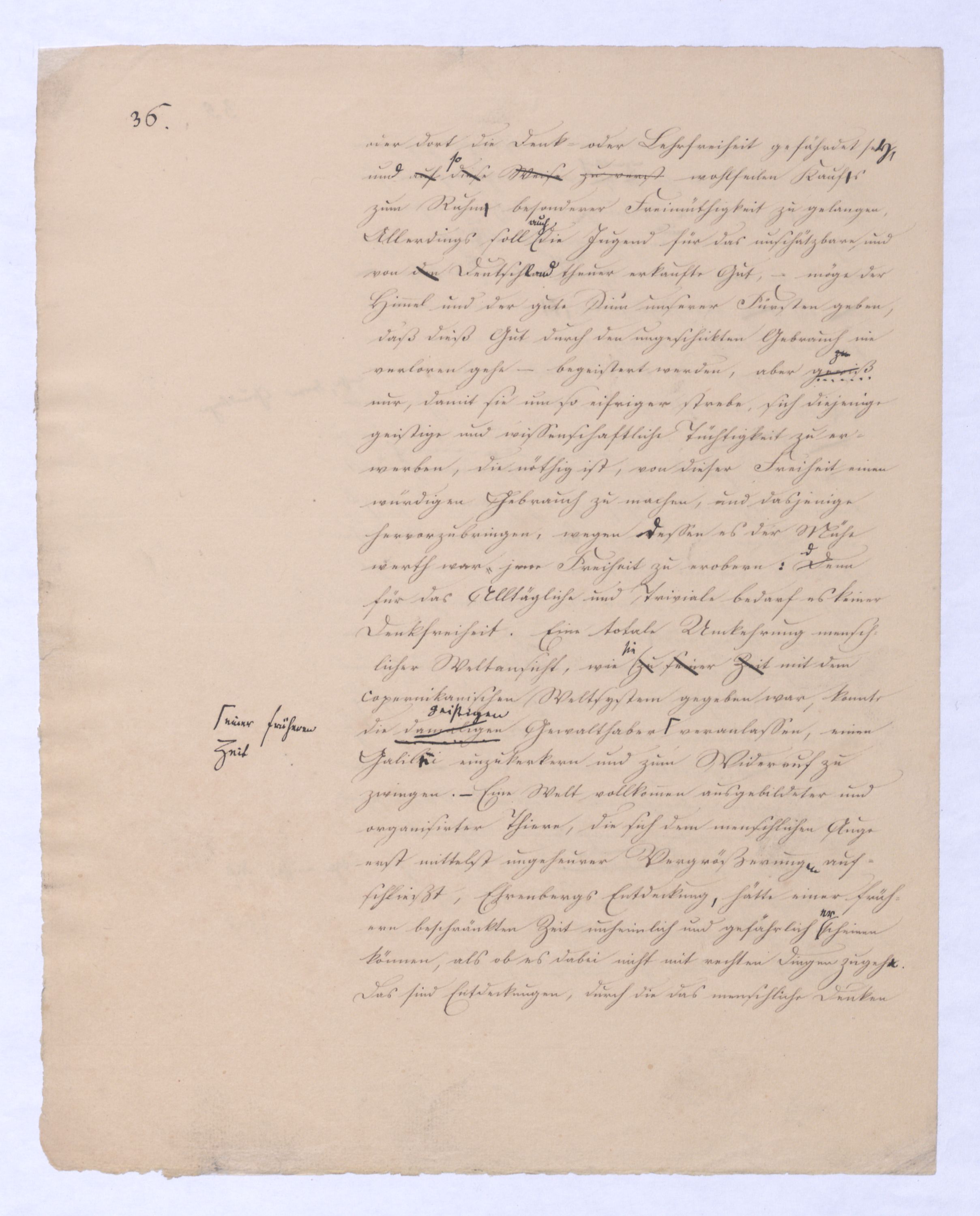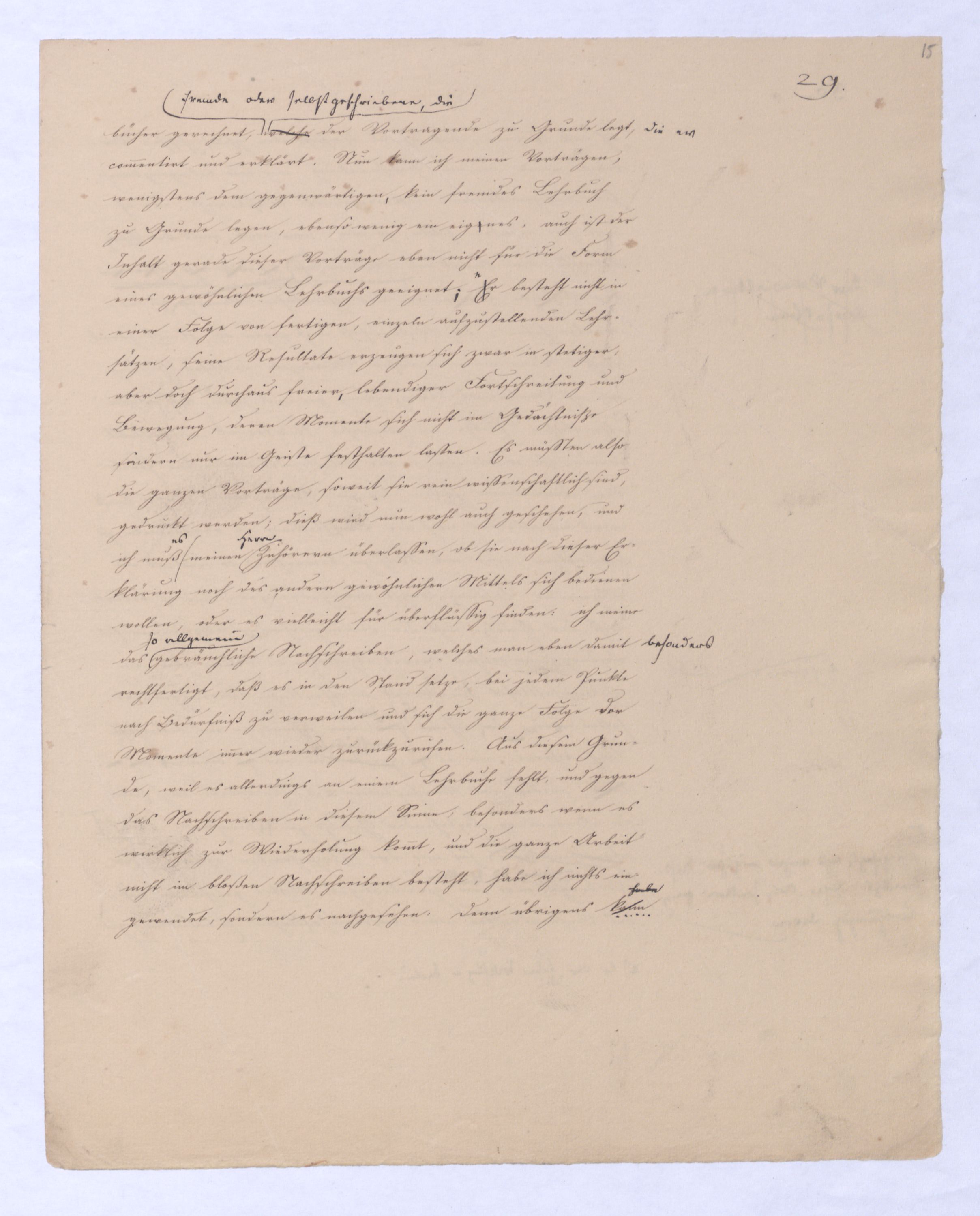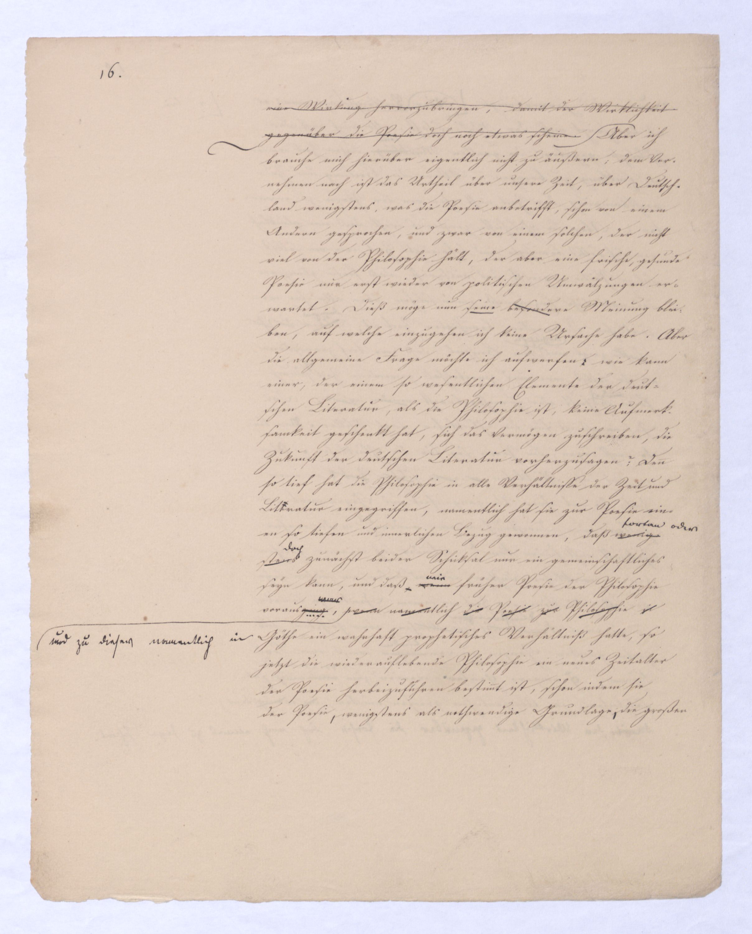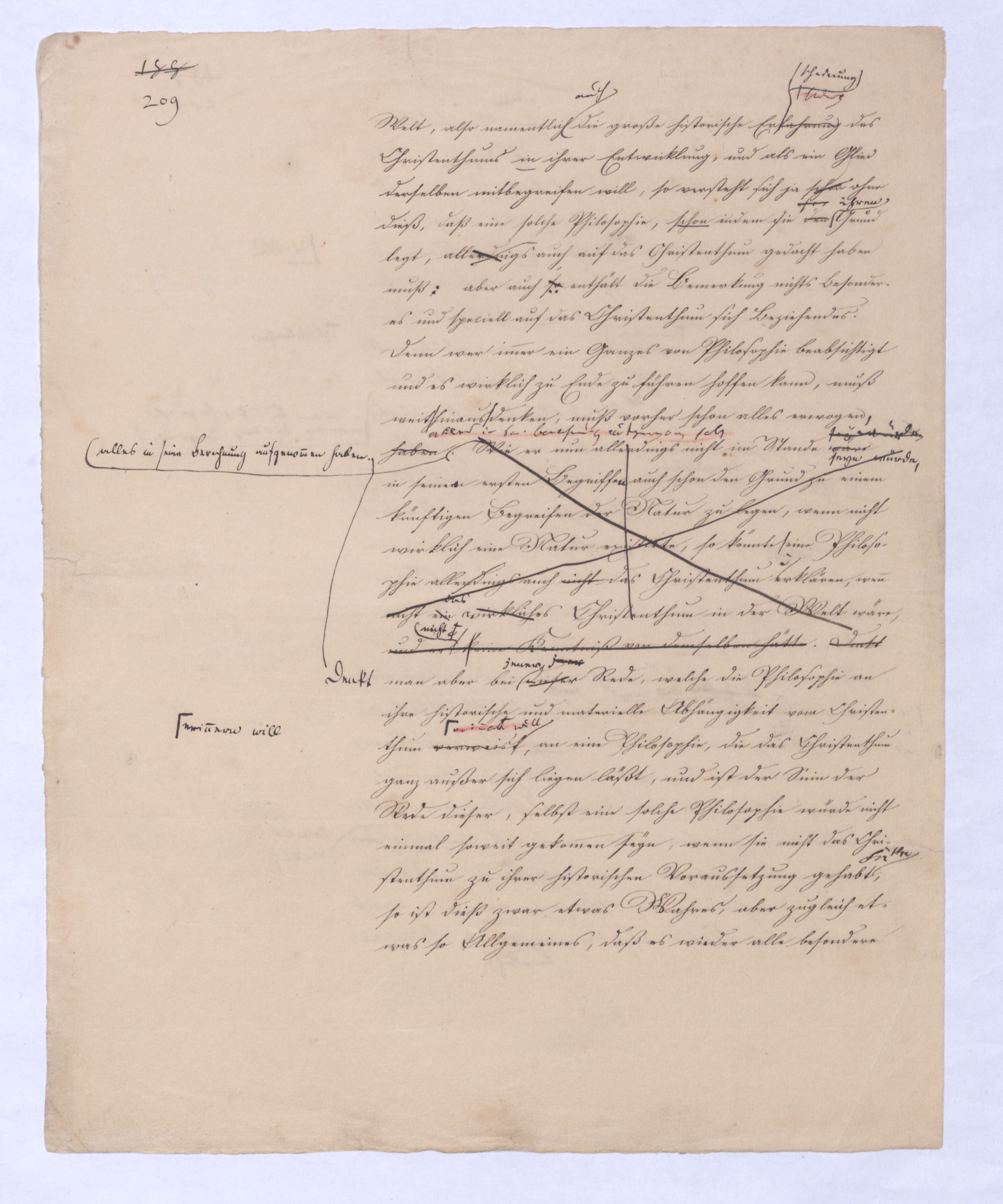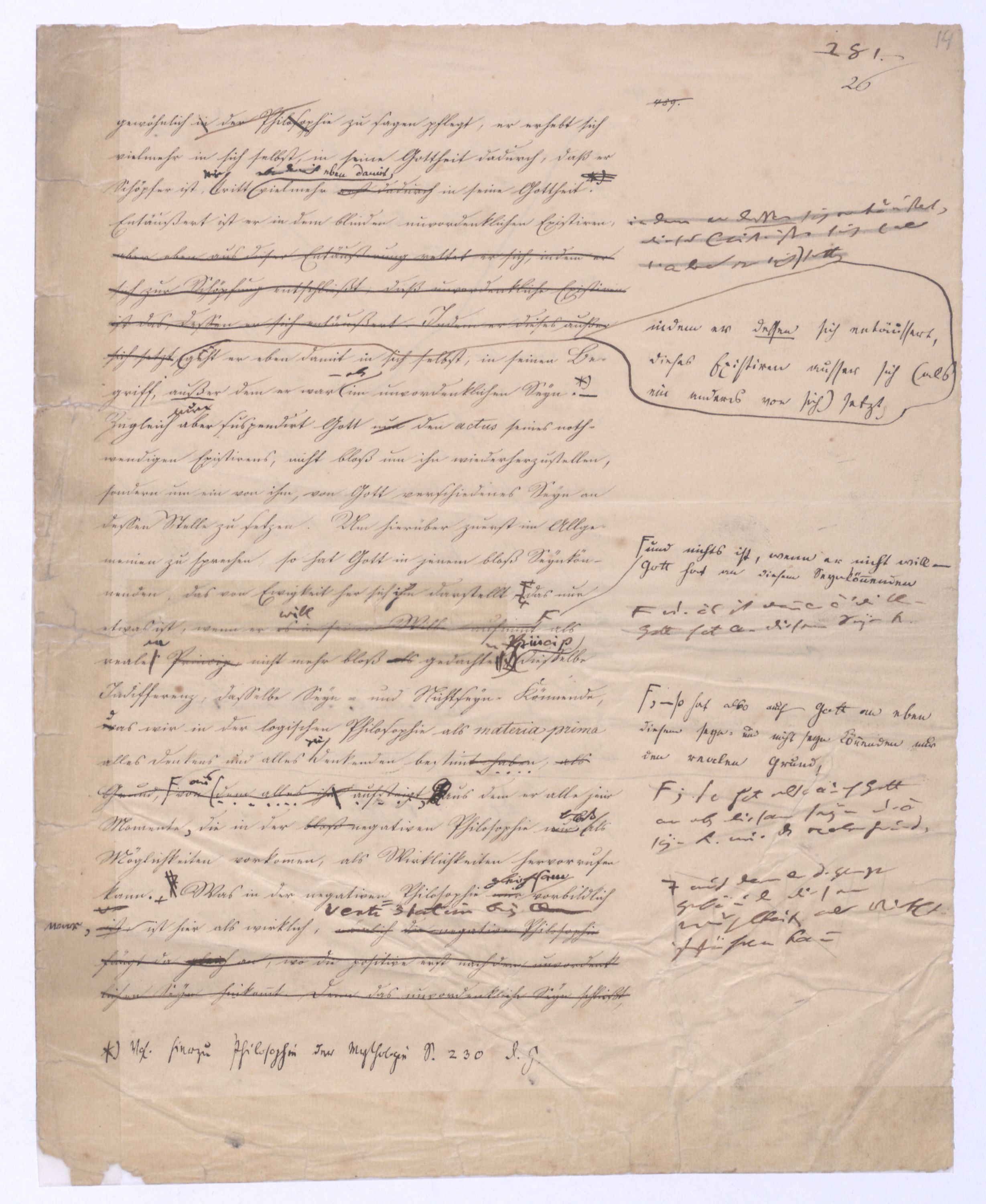 oder umgekehrt, wie ich mich umgekehrt ausdrücken will, positiver Rationalismus. Dieser wurde nunnun wurde durch Kant so zersetzt, daß er fortan als ganz unmöglich erscheint, wie denn heutzutage selbst solche Theol., die gern überall noch Anhaltspunkte finden möchten, bei der alten Metaphysik keine Hülfe mehr suchen. Aber indem er zersetzt wurde, wurdewar eben damit ein reiner Rationalismus in Aussicht gestellt wohl hüten werden, etwa den metaphysischennegat. zu nennen; denn, der uns gleichbedeutend ist mit negativer Philosophie, schon in Kants Critik enthalten. Kant läßt der Vernunft, wie gesagt, nur den Begriff Gottes, und da er das sogenannte ontologische Argument verwirft, welches nämlich aus dem Begriff Gottes auf seine Existenz schließen wollte, so machte er auch für den Begriff Gottes keine Ausnahme von der Regel, daß der Begriff eines Dinges nur das reine Was desselben enthalte, nichts aber vomn dem Daß, von der Existenz. Kant zeigt allgemein, wie vergeblich das Bestreben der Vernunft sey, mit Schlüssen über sich selbst hinaus zur Existenz zu kommen, in diesem Streben eben ist die alte Metaphysik nicht dogmatisch denn sie erreicht ja ihren Zweck nicht, sondern bloß dogmatisirendtodterbloßer Zufall, sondern je tiefer, eingreifender sie ist, desto mehr wird sie von einer Nothwendigkeit beherrscht, die keinen Sprung erlaubt, die gebieterisch heischt, daß erst das Nächste vollendet, die unmittelbar vorliegende Aufgabe gelöst sei ehe zur entfernteren fortgegangen wird. Jener reine Rationalismus, der das nothwendige Resultat der Kantischen Critik seyn mußte, war in derselben nur indirekt enthalten und mit zu vielem Zufälligem vermischt, es war also erst nöthig ihn davon diesem zu sondern, aus Kants Critik herauszuarbeiten, und zwarent selbst zur förmlichen Wissenschaft, zu einer wirklichen Philosophie auszuarbeiten. Dieß geschah in d. sog. Identätsph. (von vielen auch schlechtweg Naturph. genannt; wobei die Absicht, sie als bloße Naturl. darzust.) Je vollkommener dieß geschah, je entschiedener von dieser Philosophie alles Positive ausgeschlossen werde, desto gewisser wurde die letzte Absicht der Kantischen Critik erreicht. Denn ein Anderes ist meist, was der Mensch zu wollen unmittelbar sich bewußt ist, ein Anderes, was durch ihn als Werkzeug erreicht werden soll. Die Ersten, zur Darstellung jenes reinen Rationalismus berufen,Berufenen mußten sich ihn als Zweck vorstellen. (So geht es ja mit allem Andern, daß auch das, was nur nächstes Mittel ist, sich doch selbst als Zweck erscheinen muß, damit es sich eben vollkommen realisire) Sie mußten so ganz mit ihm beschäftigt seyn, daß sie nichts außer ihm denken konnten, so wie von ihm verzaubert, sie mußten alles in ihm zu haben glauben, und dennoch war dieß nur damit auf diese Weise die Philosophie die vom gerade entgegenensetzen Ende ausgehen sollte, die positive desto eher völlig befreit von dem Elementso lang’ sie mit ihm beschäftigt waren, konnten sie nichten, mit denen sie in der frühern Metaphysik verbunden war, in eigener Gestalt hervortreten und erscheinen konnte. Hatte ich nun et an etwas über ihn Hinausgehendes denken, näml. an d. eine Wiss. im Den insofern war freilich von + Ph. nachgeahnt,die klare Ahndung, daß jenseits dieses Criticismus, der die dogmatisirende Philosophie gestört hatte, eine andere, und zwar durch ihn nicht erreichte dogmatische Philosophie aufstehen müsse ¿¿, großartiger als d. falsche u. halbe der ehemal. Metaph., so läßt sich also denken, wie mir eben diese Wahrnehmung oder Ahnung und mit welchem Gefühl auf die Seele fallen mußte, als ich nunnachdem endlich jenes durch Kant vorbereitete negativerat. System in seiner ganzen Reinheit und dennoch völligen Negativität vor mir hatte,nun als reines, zur Evid. gebrachtes, von allem Zuf. befreites wirkliches System vor mir hattevor Augen stand, dieselbe Wahrnehmung nur mit verstärktem Gewicht mir aufs Herz fallen mußte. je reiner das Negative aufgestellt war, desto mächtiger mußte ihm gegenüber das Positive sich erheben und es schien nichts gethan, so lange dieß nicht auch gefunden sei. Vielleicht kann man sich hieraus erklären, wie fast unmittelbar nach der ersten Darstellung jenes aus dem Criticismus herausgebildeten Systems der Urheber die Hand von ihm abzog, wie er diese Philosophie verließ, die nun gleichsam verwaist jedem anheimfiel,diese Philos. von ihrem Urheber gleichsam verlassen ¿¿¿ ¿¿¿ jedemeinstweilen jedem überlassen wurde, der bereit stand, sie sich anzueignen, und mit Plato zu reden von dem Glanze der leer gelassenen Stelle angezogen mit Begierde sich auf sie zu stürzen. Die vollendete negative Philosophie enthält potentia oder der Forderung nach die positive; diese ist in ihr wie Künftiges im Gegenwärtigen vorauszusehen. Kein Wunder, wenn im Anfange die beiden Leiber sich verwirrten, wenn man anfangs in dem ersten das andere schon zu besitzen, wenn auch nur im Augenblick sich vorstellen konnte. Für mich indeßen war jene Philosophie wirklich nur Übergang gewesen, meine Aufgabe lag über sich hinaus; die Wahrheit zu sagen, hatte ich in dieser Philosophie eben nur das nächste nach Kant Mögliche versucht, und war innerlich weit entfernt – niemand wird eine dem entgegengesetzte Äußerung aufzeigen können – sie in dem Sinne für die ganze Philosophie zu nehmen, in welchem dieß nachher geschehen ist, und was zuletzt auf das wüßte wilde Wesen geführt hat, das oben beschrieben ist. Und wenn ich auch diesem Wesen eine lange Zeit zugesehen, wenn ich die positive Philosophie, auch nachdem sie gefunden war höchstens durch Andeutungen erkennen ließ, unter anderm durch die bekannten Paradoxien einer polemischen Schrift gegen Jakobi, so glaube ich, daß hintennach diese Zurückhaltung eher zu loben als zu tadeln istwar; denn damit habe ich einer Richtung, mit der ich nicht folgen konntes gemein haben wollte, volle KraftZeit gelassen., während ich sie sonst wahrschl. nie