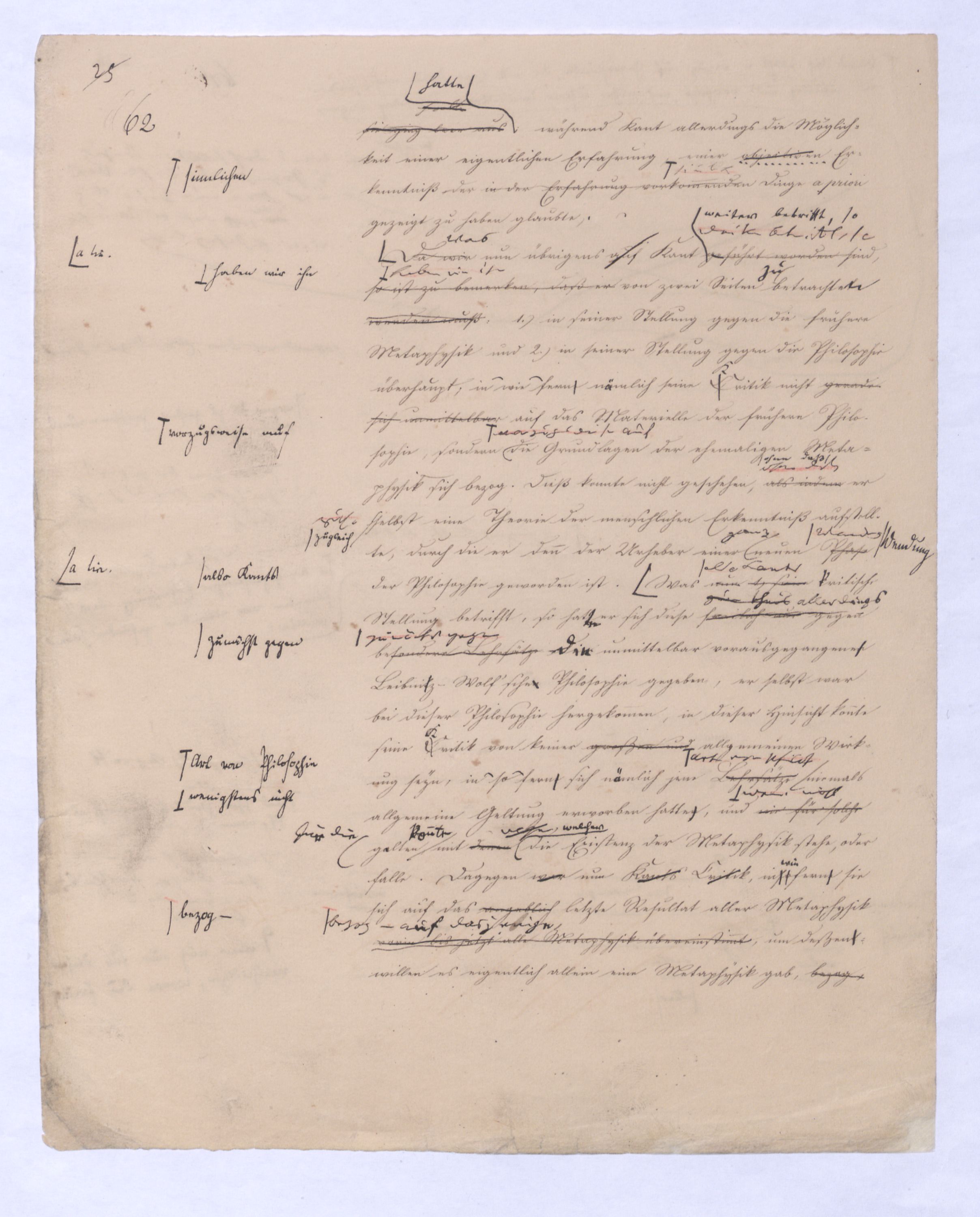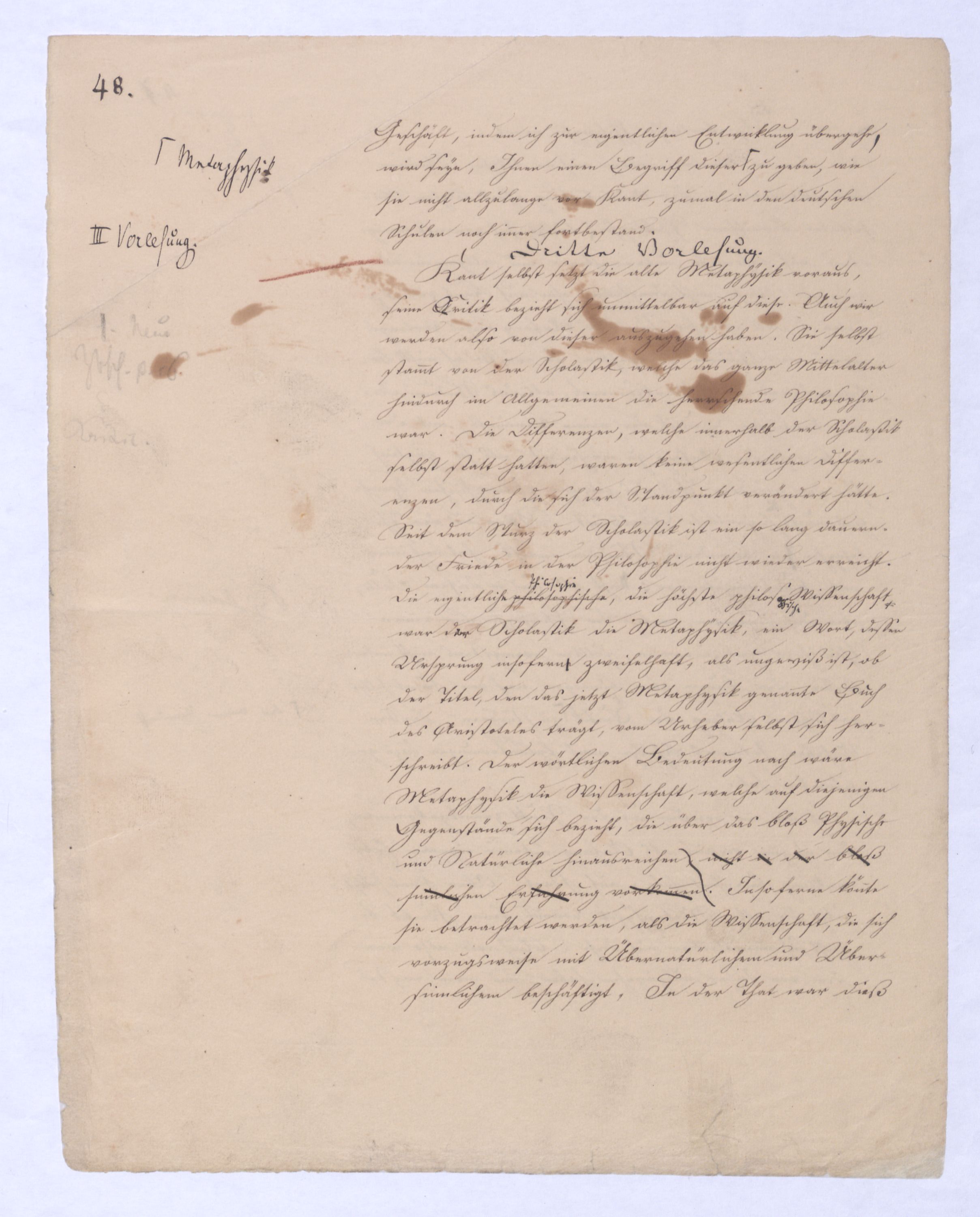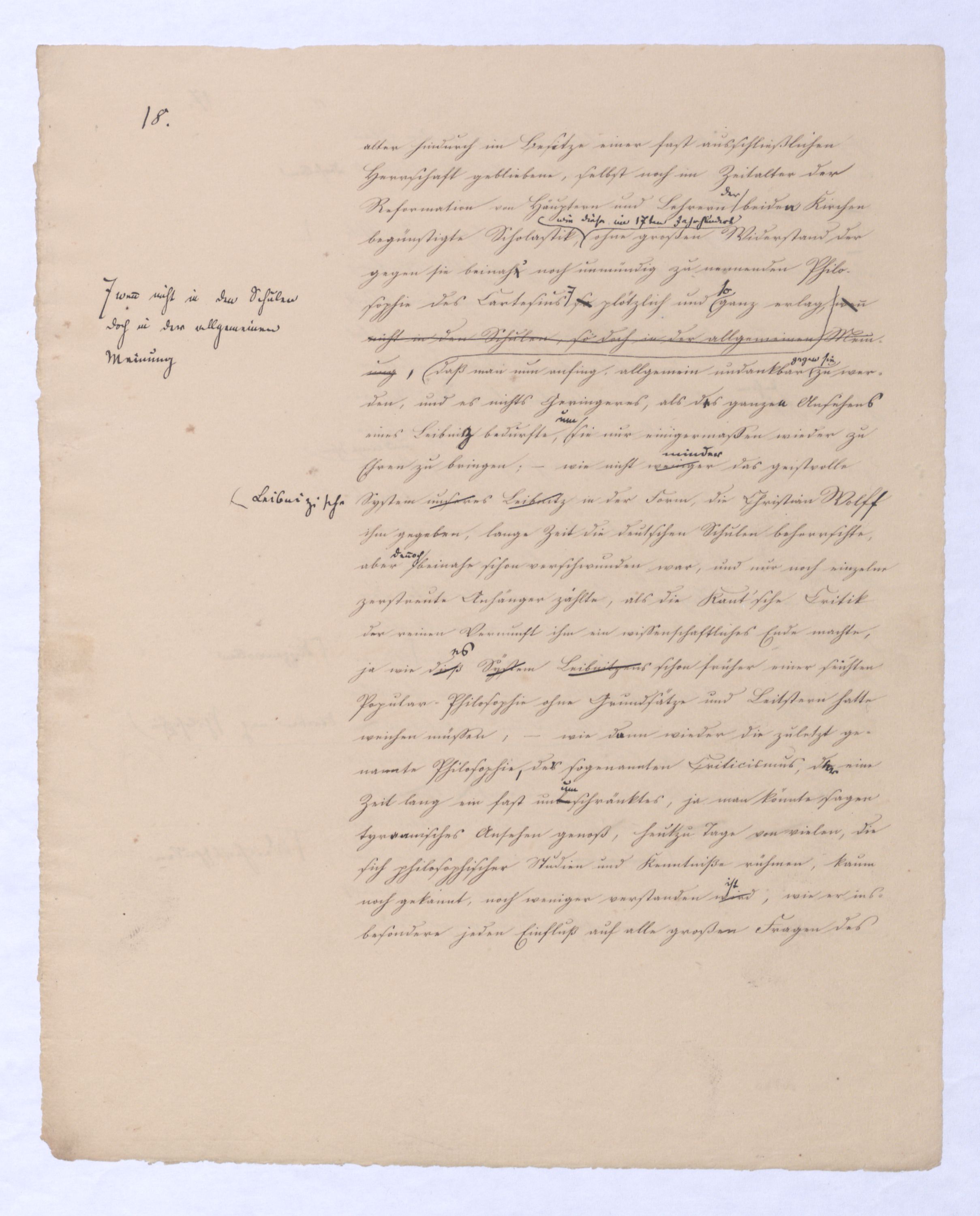 Da wirWas nun übrigens auf Kant geführt worden sind, so ist zu bemerken, daß er vonweiter betrifft, so haben wir ihn von zwei Seiten zu betrachtet werden mußn: 1.) in seiner Stellung gegen die frühere Metaphysik und 2.) in seiner Stellung gegen die Philosophie überhaupt; in wie ferne nemlich seine Critik nicht gerade sich unmittelbar auf das Materielle der frühern Philosophie, sondern vorzugsweise auf die Grundlage der ehemaligen Metaphysik sich bezog. Dieß konnte nicht geschehen, als indemohne daß er zugl. selbst eine Theorie der menschlichen Erkenntniß aufstellte, durch die er denn der Urheber einer ganz neuen PhaseWendung der Philosophie geworden ist. Was nun 1) seinealso Kants critische Stellung betrifft, so hat er sich diese freilich nur zum theil gegen besondere Lehrsätzeallerdings zunächst gegen derdie unmittelbar vorausgegangenen Leibnitz-Wolff'schen Philosophie gegeben, er selbst war bei dieser Philosophie hergekommen, in dieser Hinsicht konnte seine Critik von keiner großen und allgemeinen Wirkung seyn, in so fern sich nemlich jene LehrsätzeArt von Philosoph. niemals allgemeine Geltung erworben hatten, und wie für solchewen. nicht für die gaelten konnte, mit denenwelcher die Existenz der Metaphysik stehe, oder falle. Dagegen war nun Kants Critik, insoferne sie sich auf das angeblich letzte Resultat aller Metaphysik worin bis jetzt alle Metaphysik übereinstimmt,bezog – auf dasjenige, um deßentwillen es eigentlich allein eine Metaphysik gab, bezog, alsosoweit war Kants Kritik entscheidend war für die ganze Zukunft der Philosophie. Bekanntlich baute sich die frühere Metaphysik aus vier verschiedenen Wissenschaften auf. Die erste war die Ontologie, welche ihren Namen dahervon hatte, daß sie die ersten und allgemeinsten Bestimmungen des Seyenden, alle die Begriffe enthalten sollte, die sich vom höchsten Begriff des Seyenden überhaupt, dem ens ableiten lassen. Alles was jedem Wesen zukommen muß, schon in wie fern es ein Seyendes oder Wirkliches ist, wurde in ihr zusammengefaßt. In der durch Kant eingeführten Sprache war sie die Wissenschaft der allgem. Verstandesbegriffe oder Categorien. Ihr folgte die rationale Kosmologie und Psychologie, aber die Krone dieser verschiedenen Wissenschaften war die sogenannte natürliche oder rationale Theologie, die freilich den Begriff Gottes einfach aus der Erfahrung oder Überlieferung aufnahm, dagegen sich zur Hauptaufgabe setzte, die Existenz Gottes zu beweisen. Man kann nicht behaupten, daß Kant in seiner Critik der sogenannten Beweise für die Existenz Gottes durchaus das Richtige getroffen, namentlich im sogenannten ontologischen Argument