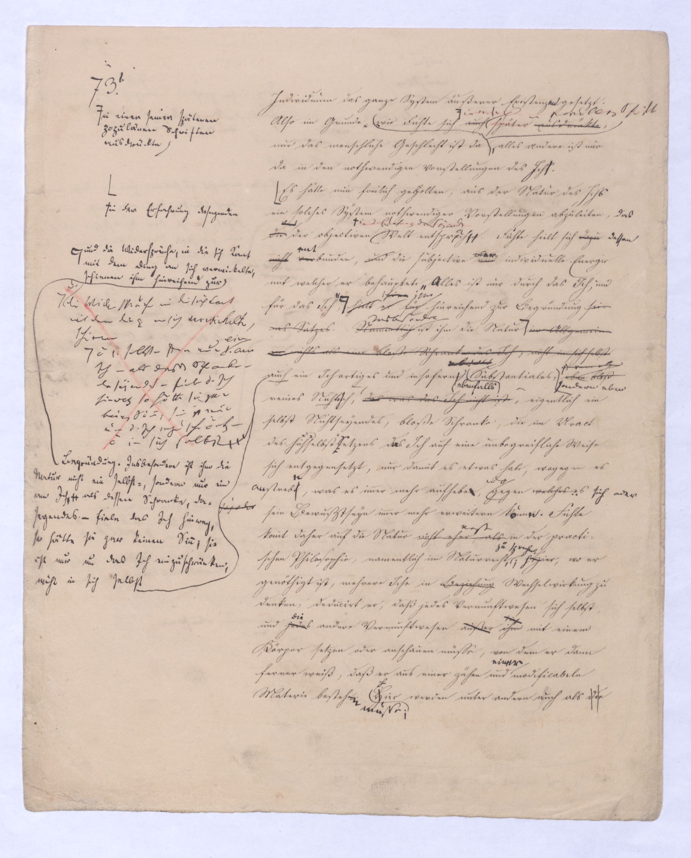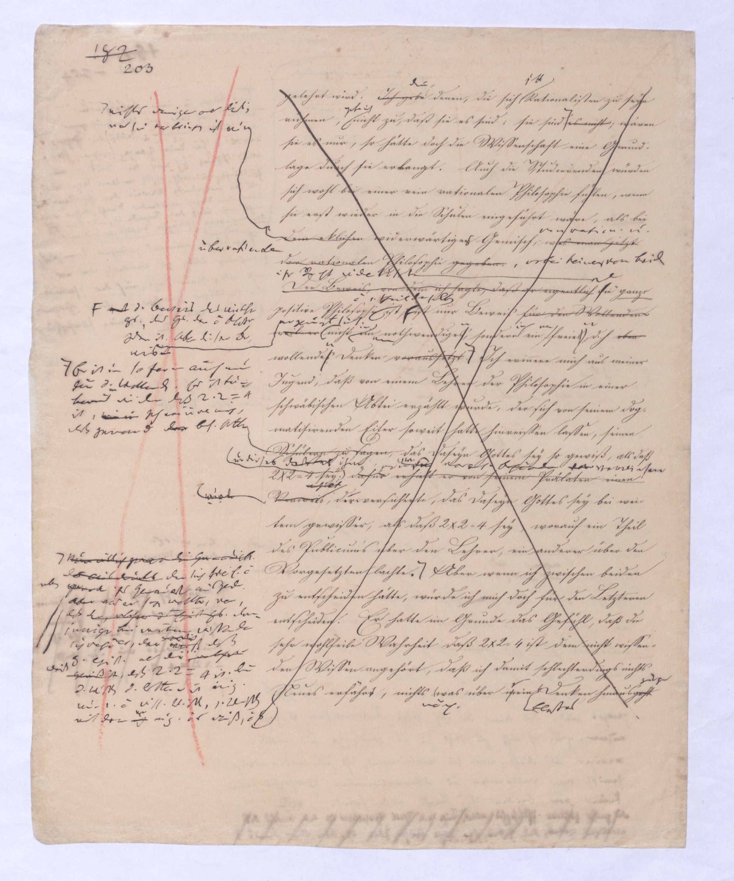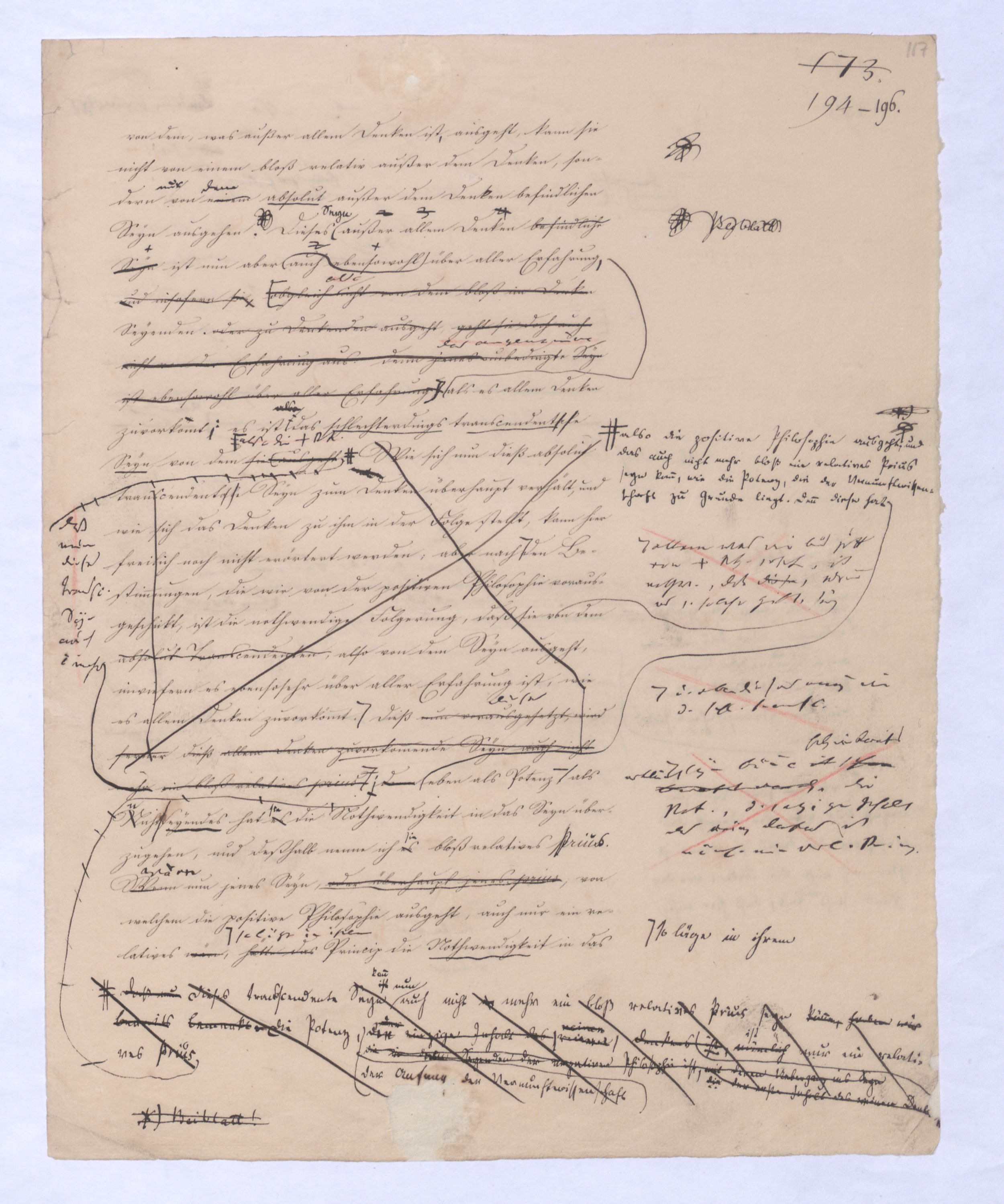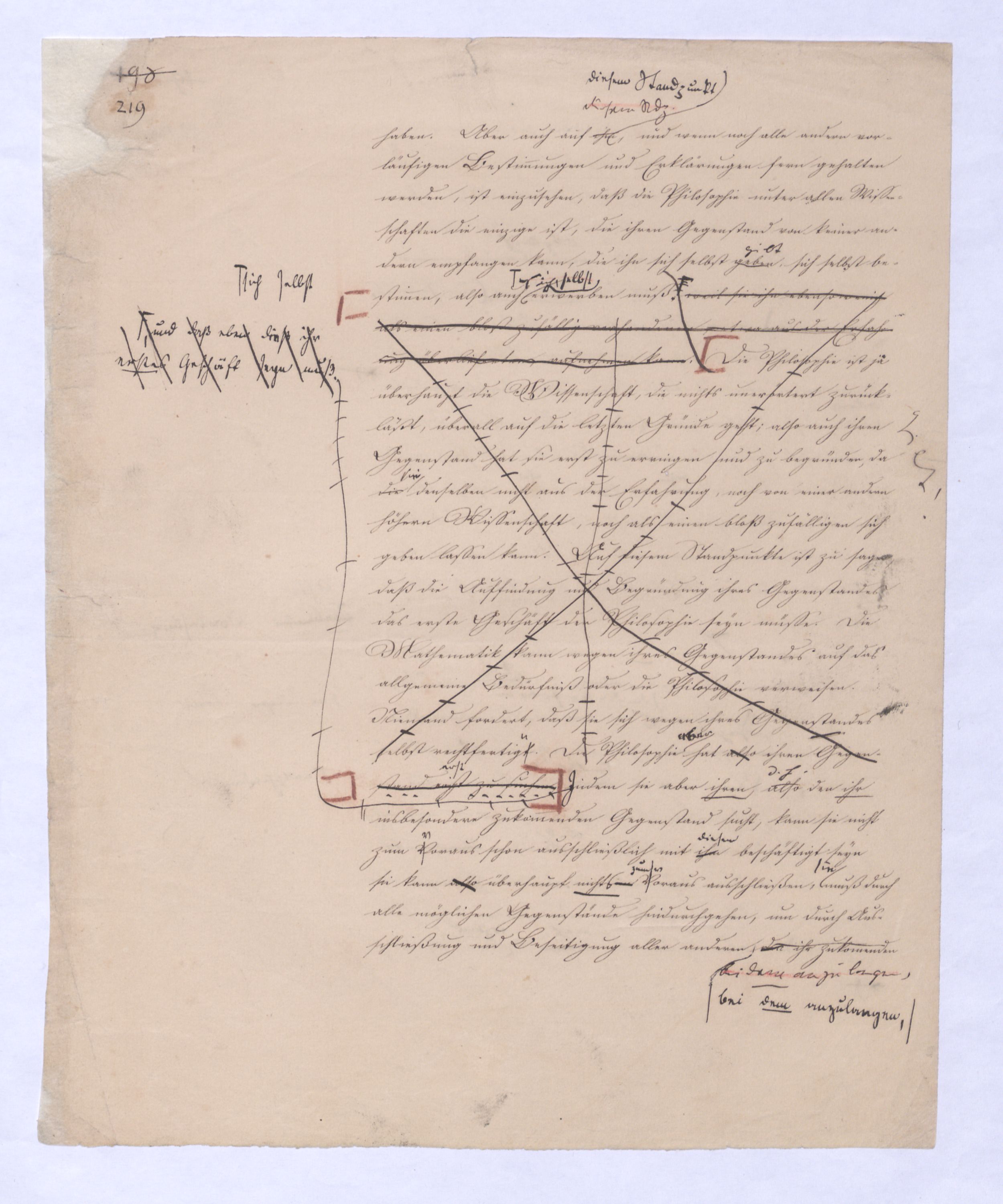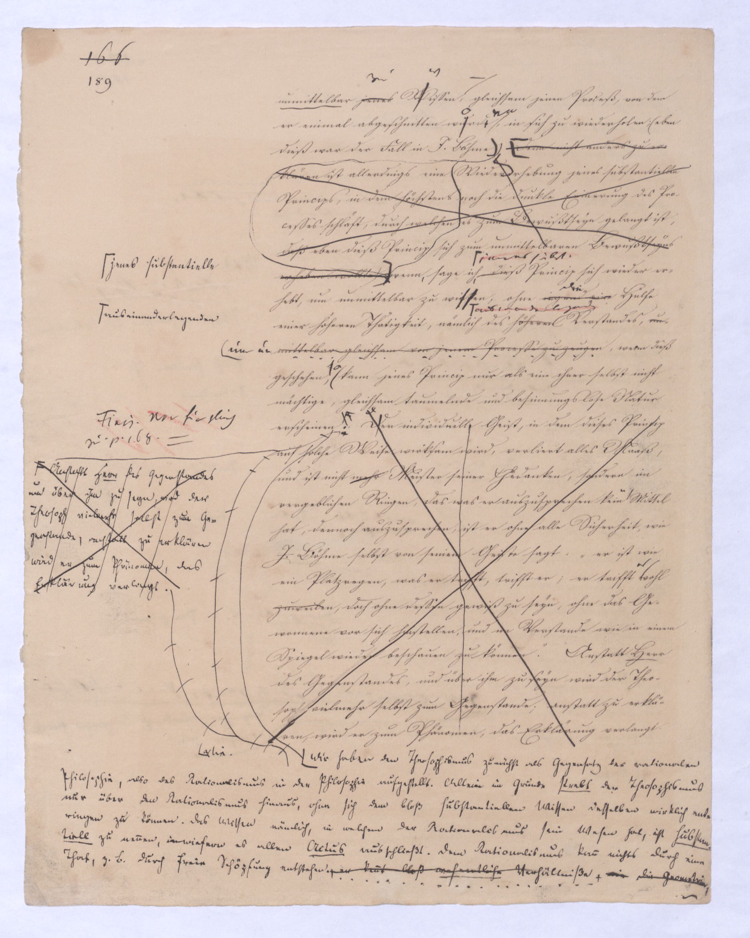 Diese ganze Entw. mit der die + Philosophie anfängt ist eminent speculativer Art u. in einem Gebiet, in das sich ein bloß mechanisch eingeübtes Denken so wenig erheben kann als ein bloßer gemeiner Rechenmeister in die Speculationen d. Analysis des Un., die ihm in sr. Unwiss. als Willkür erscheinen müssen. Hier sind also auch versch. Darstellungen mögl. u. zulässig, wie man in der höheren Anal. zu demselben Resultat auf versch. Wegen kommen kann u. auch dann, wenn es bewieein Resultat längst bewiesen ist, noch den einfachst.eren, einleuchtenderen, übersichtl. Gang dieses Beweises sucht.