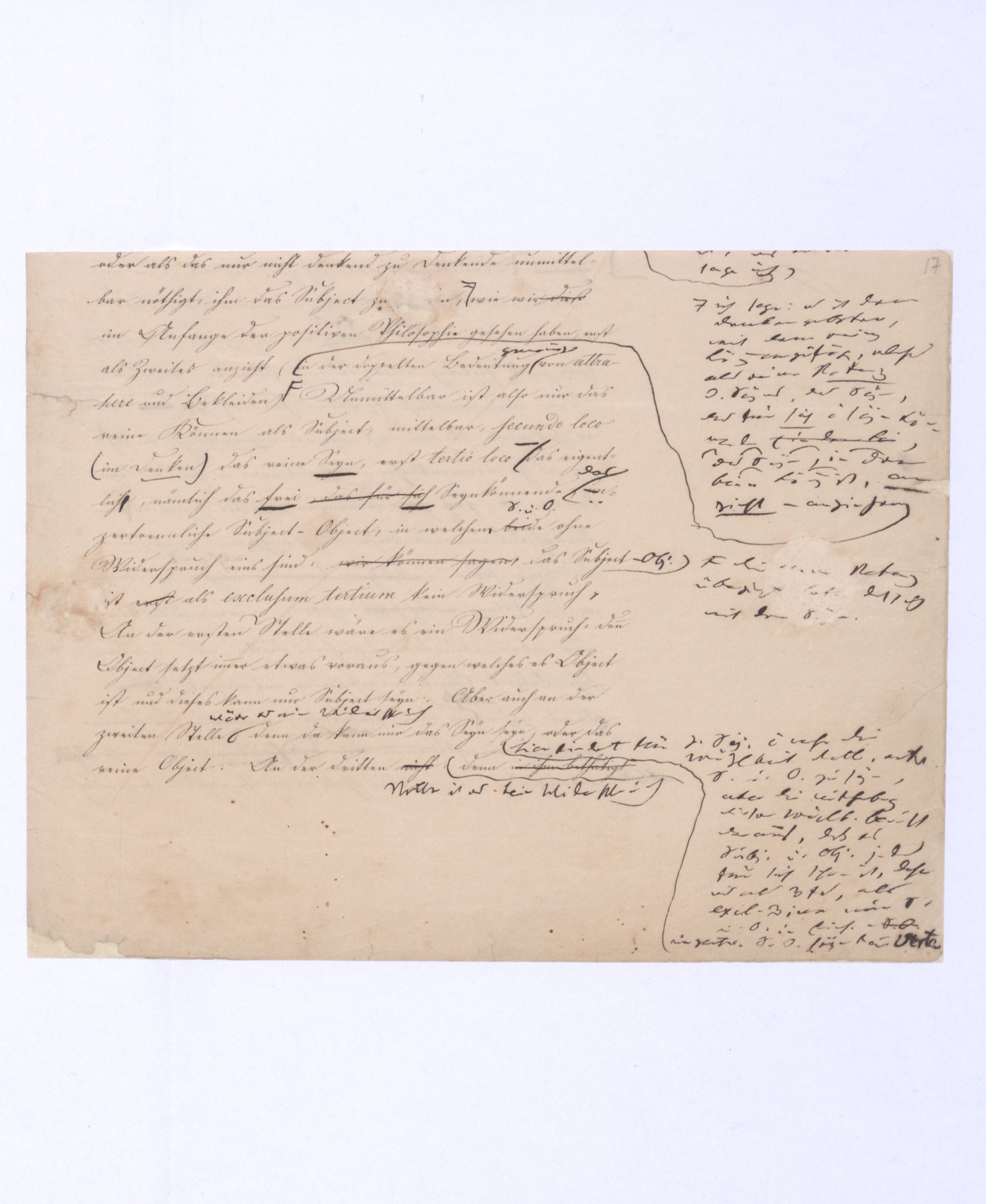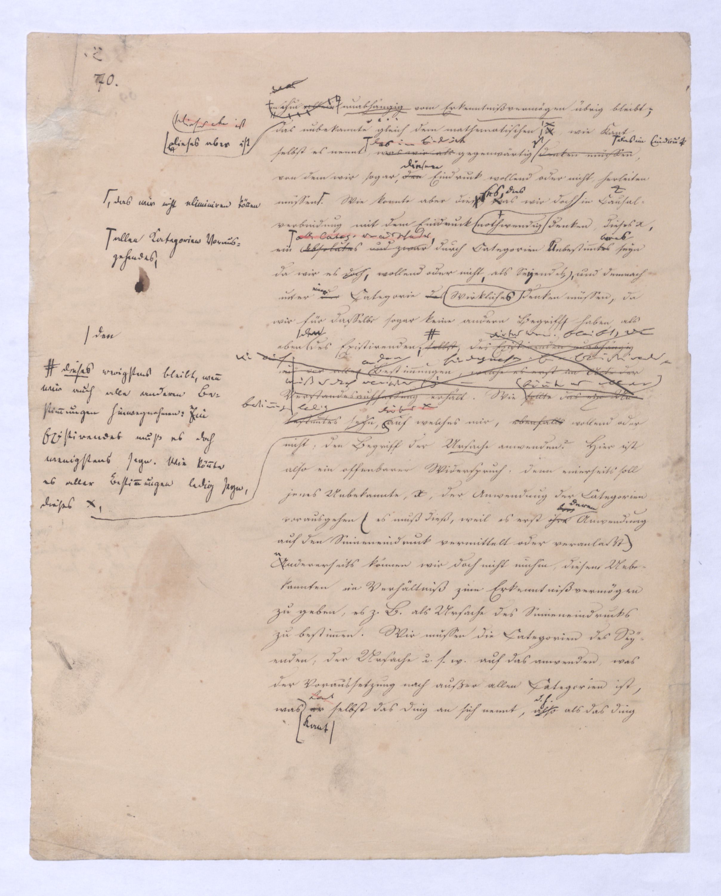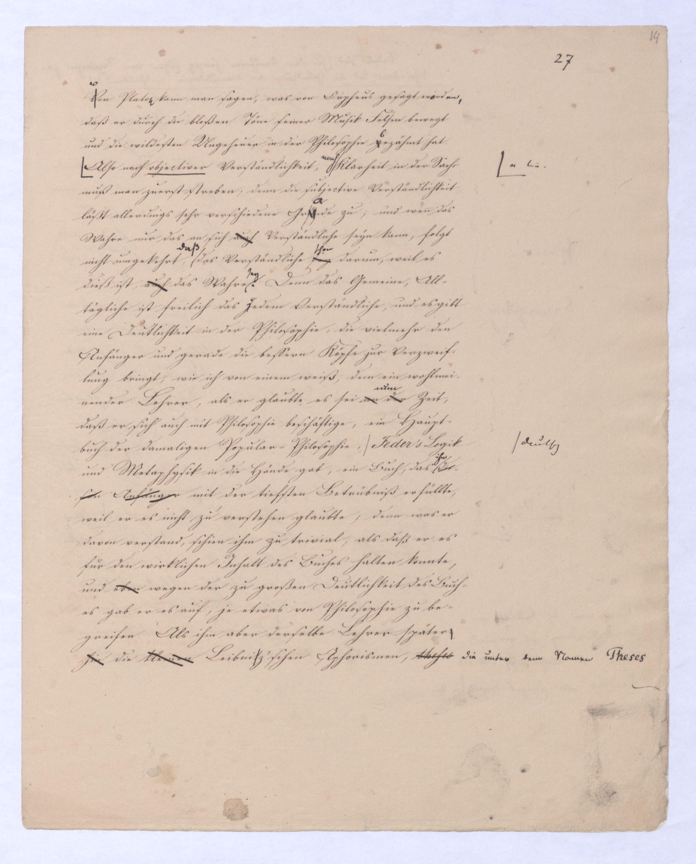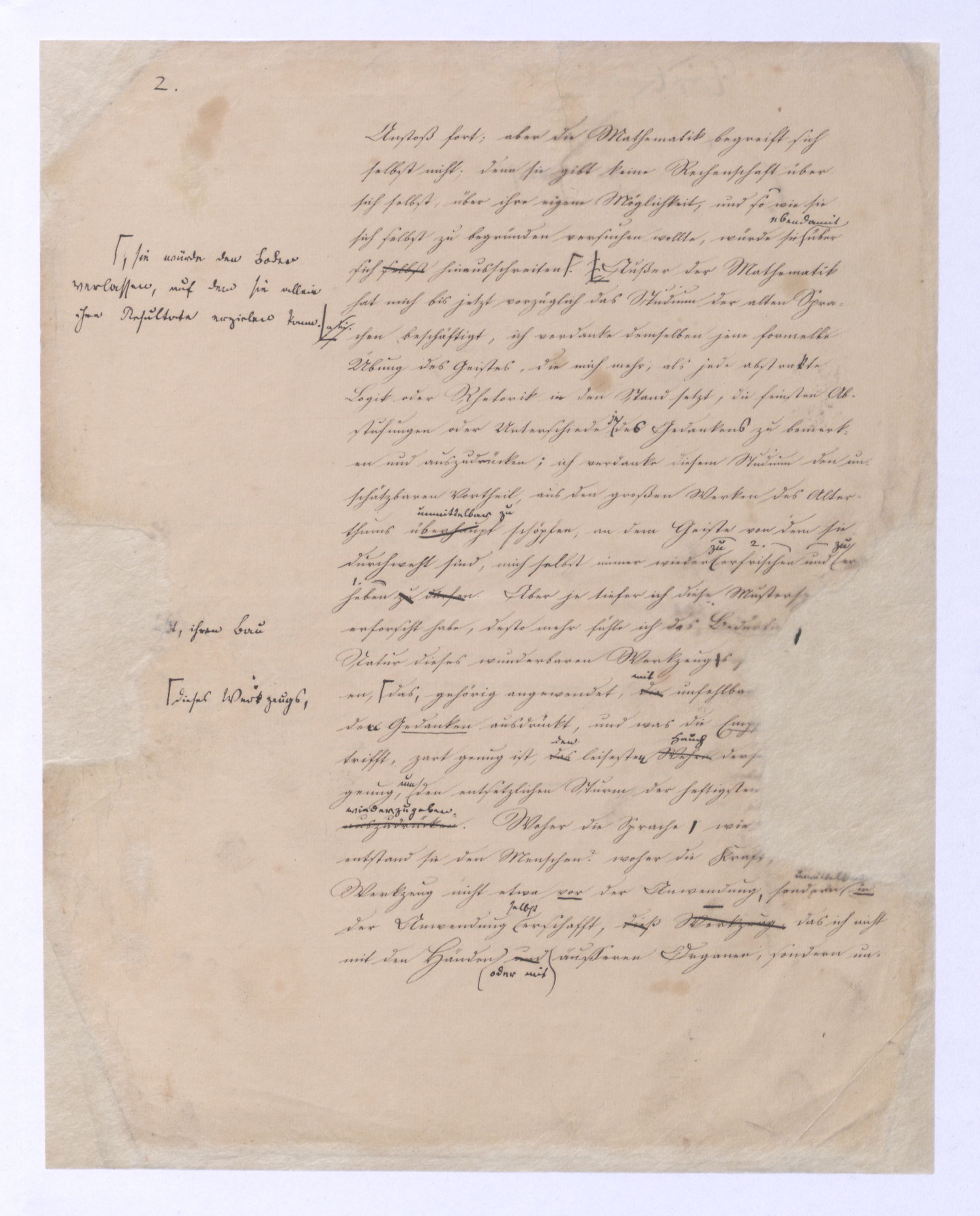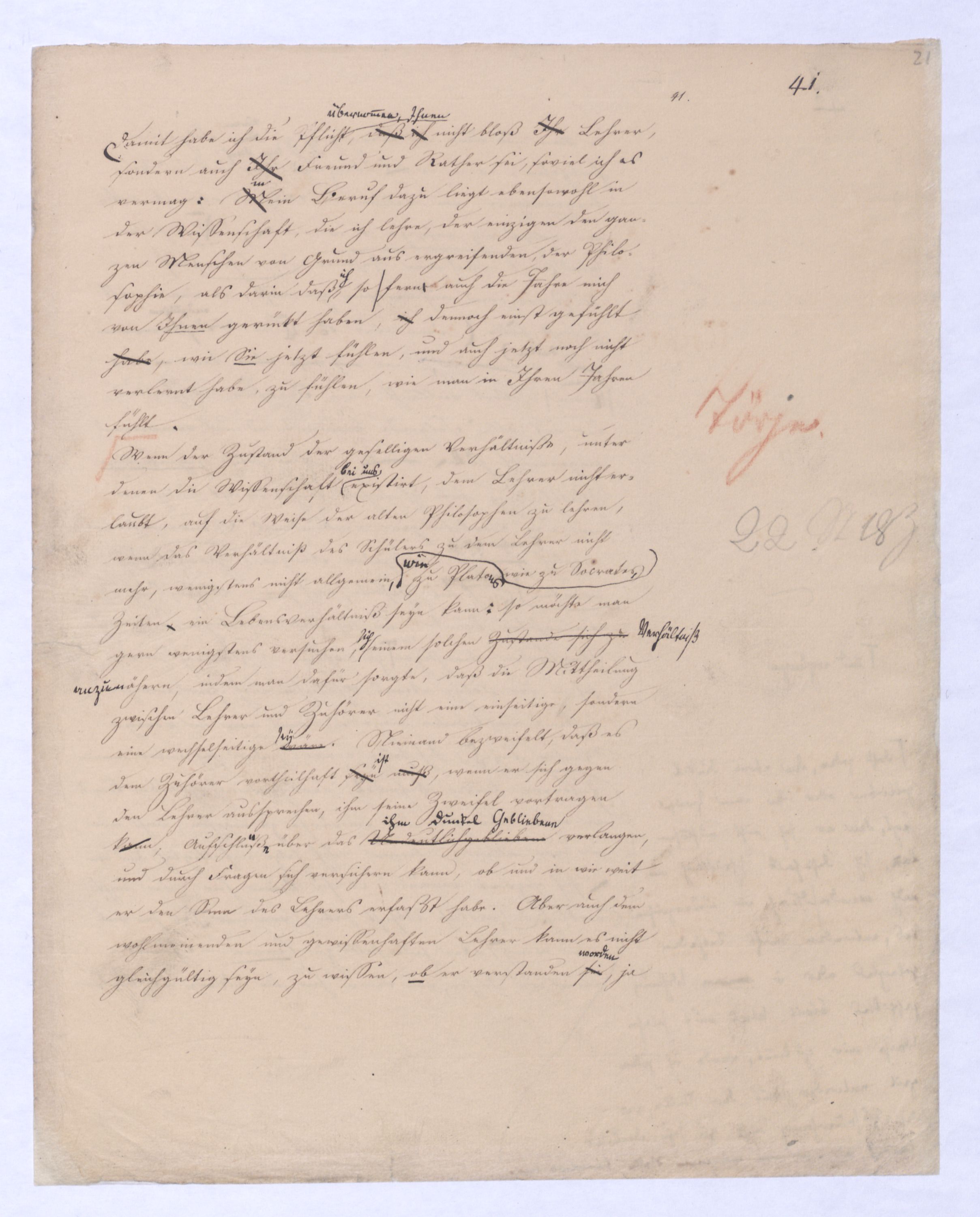 Diese ganze Entw. mit der die + Philosophie anfängt ist eminent speculativer Art u. in einem Gebiet, in das sich ein bloß mechanisch eingeübtes Denken so wenig erheben kann als ein bloßer gemeiner Rechenmeister in die Speculationen d. Analysis des Un., die ihm in sr. Unwiss. als Willkür erscheinen müssen. Hier sind also auch versch. Darstellungen mögl. u. zulässig, wie man in der höheren Anal. zu demselben Resultat auf versch. Wegen kommen kann u. auch dann, wenn es bewieein Resultat längst bewiesen ist, noch den einfachst.eren, einleuchtenderen, übersichtl. Gang dieses Beweises sucht.