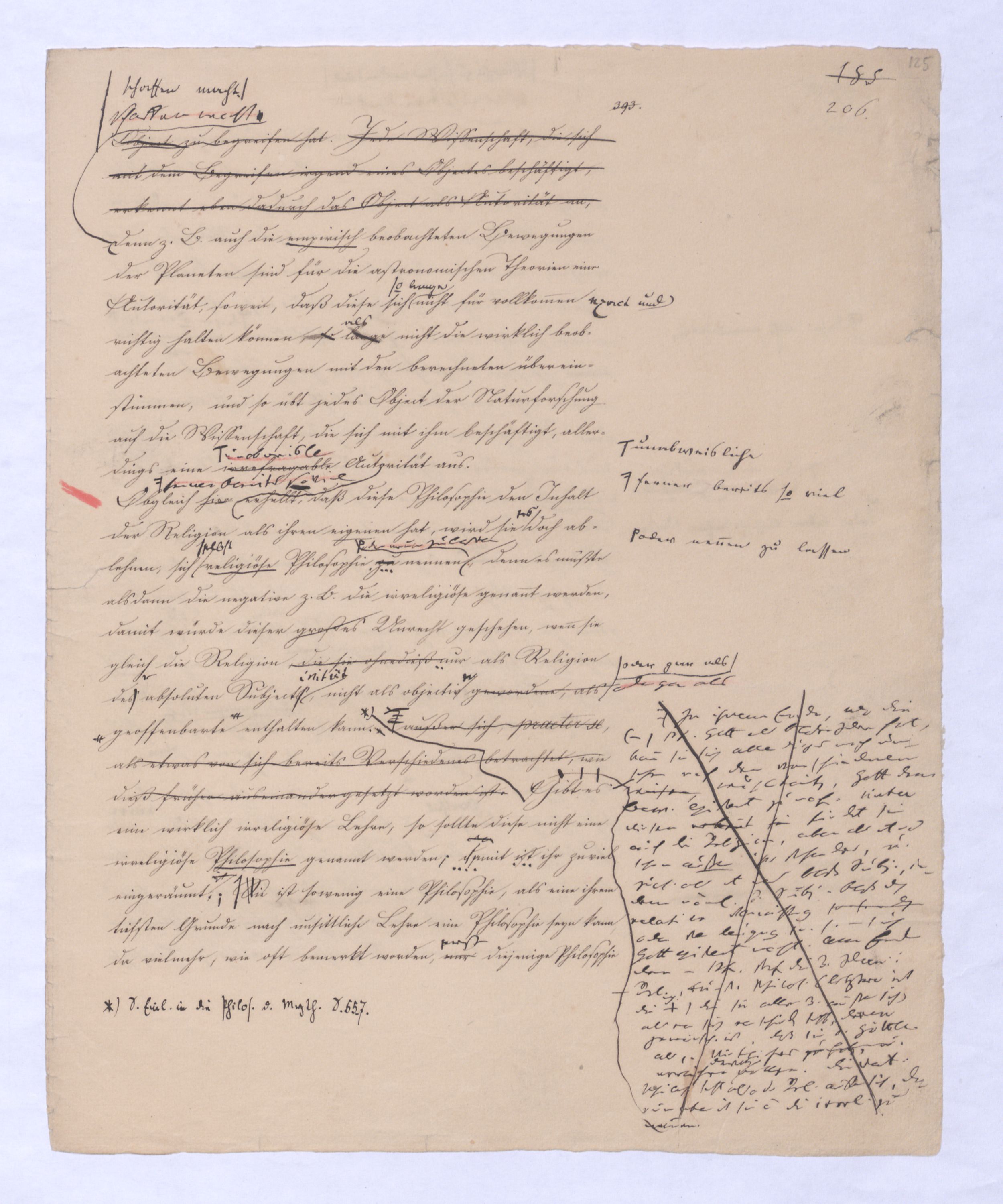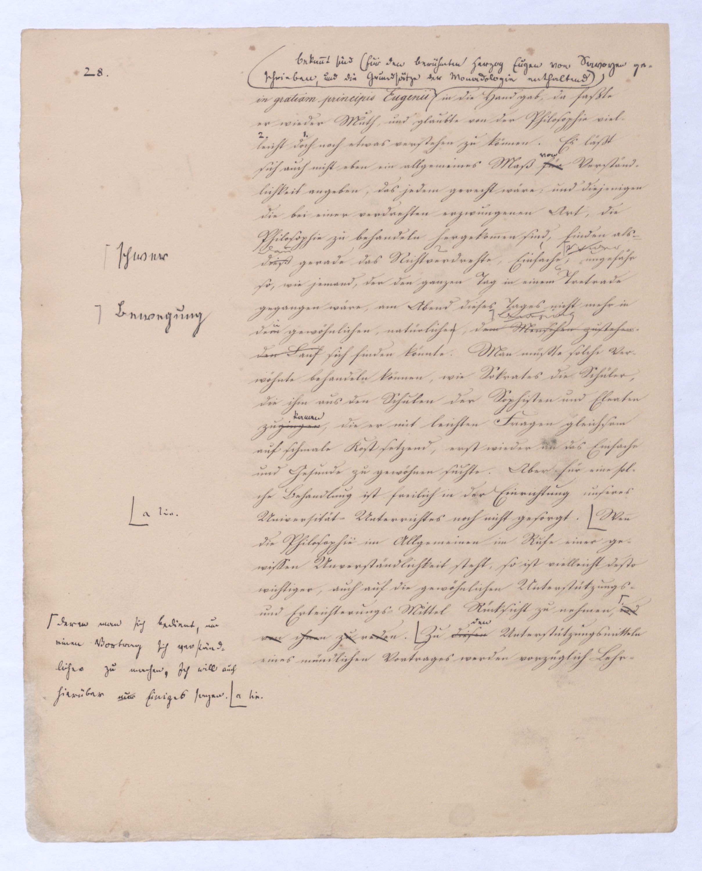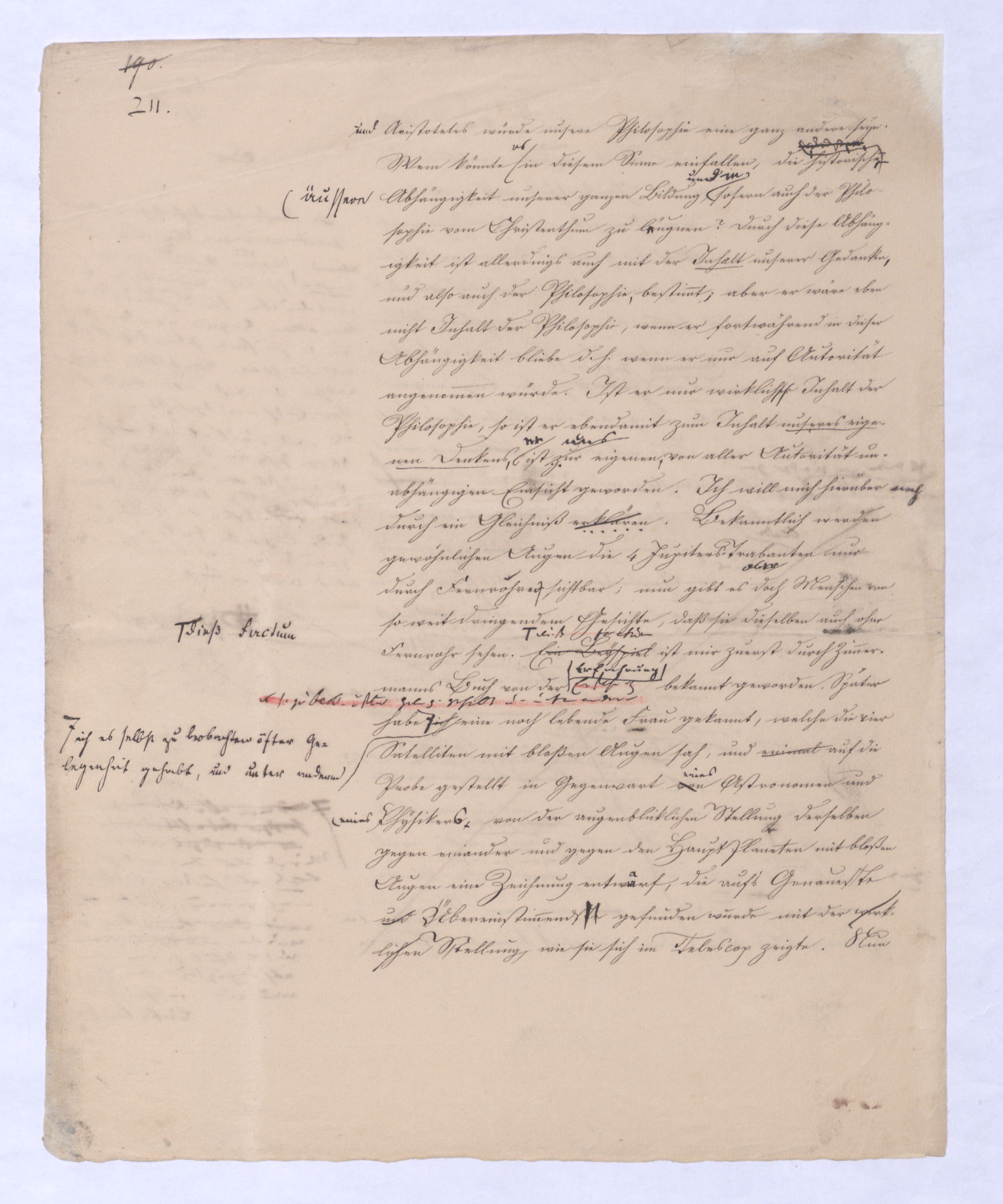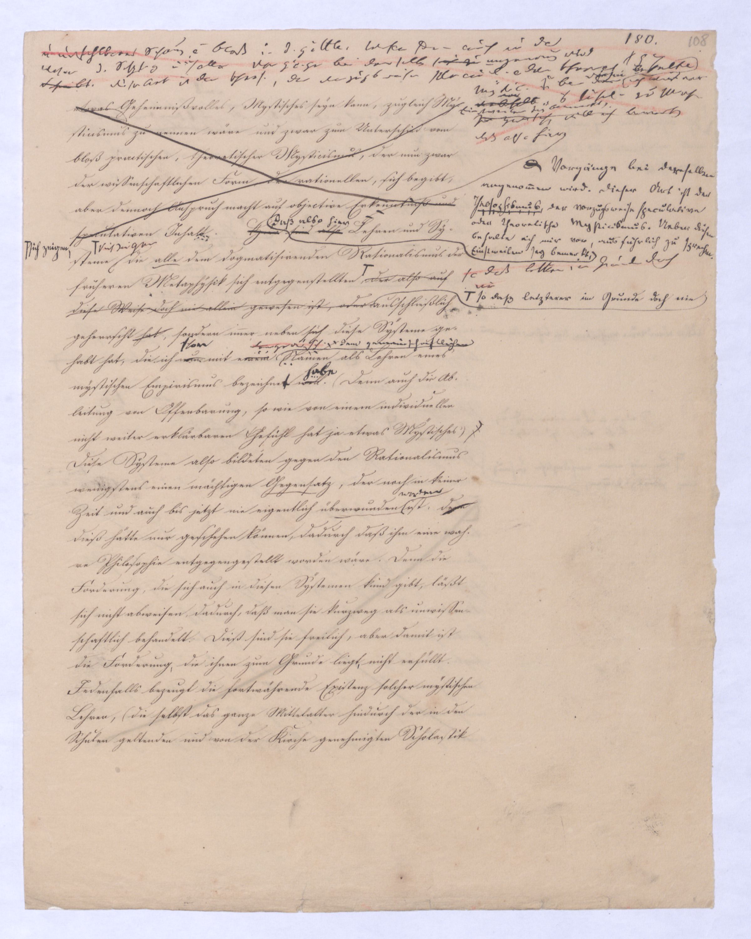 , die Lehre Jakobis und anderer Gleichgesinnten; ferner Empirismus, obgleich einer höheren Ordnung wird die Lehre seyn, welche das Geheimniß des göttlichen Wesens und des Ausgangs-Punktes aller Dinge aus Gott durch unmittelbares Schauen durch ein enthuastische Intuition zu erlangen vorgibt, der Theosophismus, welcher in wie ferne dieses Schauen auch etwas Geheimnißvolles, Mystisches seyn kann, zugleich Mysticismus zu nennen wäre und zwar zum Unterschied vom bloß practischen, theoretischer Mystisicismus, der nun zwar der wissenschaftlichen Form, der rationellen, sich begibt, aber dennoch Anspruch macht auf objective Erkenntniß und speculativen Inhalt. Hier sind also u. wolle gar alles Übersinnl. entw. überh. oder doch als möglr. Gegenst. der Erk. geleugnet wird. Nimmt man den philos. Empiris. in diesem Sinn, so hat er mit der was wir + Ph. nennen, nicht einmal d. Gegens. gegen den Rat. gemein. Denn die + Ph. geht nur davon d. Erkenntnißleugnet nur, daß d. Übers. auf dem bloß rat. Wege nicht erkennbar sey, jener aber beh. daß es weder auf diese noch auf jeneandre Weise erkennbar sey, ja am Ende daß es nicht Gegenst. einer wirkl. Gegenst. einer Erfahrung werden könne, welche Erfahrung denn wobei sich übrigensdann von s. versteht, daß diese Erfahrung s. nicht bloß sinnlr. Art seyn kann, insof.vielmehr s. etwas myst. Geheimnißvolles Mystisches an sich hathaben muß; weßhalb wir denn die Lehren dieser Art wohl überh. Lehren eines myst. Empir. überh. nennen können. Unter diesen Lehren steht wohl wieder am tiefsten diej., welche uns d. Überg. von dieer Exist. des Übersinnl. nur durch eine göttli. Offenb. zu theildie zugl. als äußeres Factum gedacht ist gewiß werden läßt: Denn obgl. ich sage: diese Lehre steht wohl auf der Die nächste sich deren Wirkung nur auf unser Inneres, auf unseren Geist erstrecken kann, so wird sie doch dabei s. als äußeres Factum vorausges.nach ihrStufe ist eine Philos., welche zwar über alle äußere Thatsache hinweggeht, aber dagegen auf d. innere Thatsache eines unwiderstehlichen Geh Gefühls sich beruft, das uns von d. Existenz Gs. überz., während d. Vernunft unvermeidl. auf Ath., Fatal., also ein blindes Nothw.system