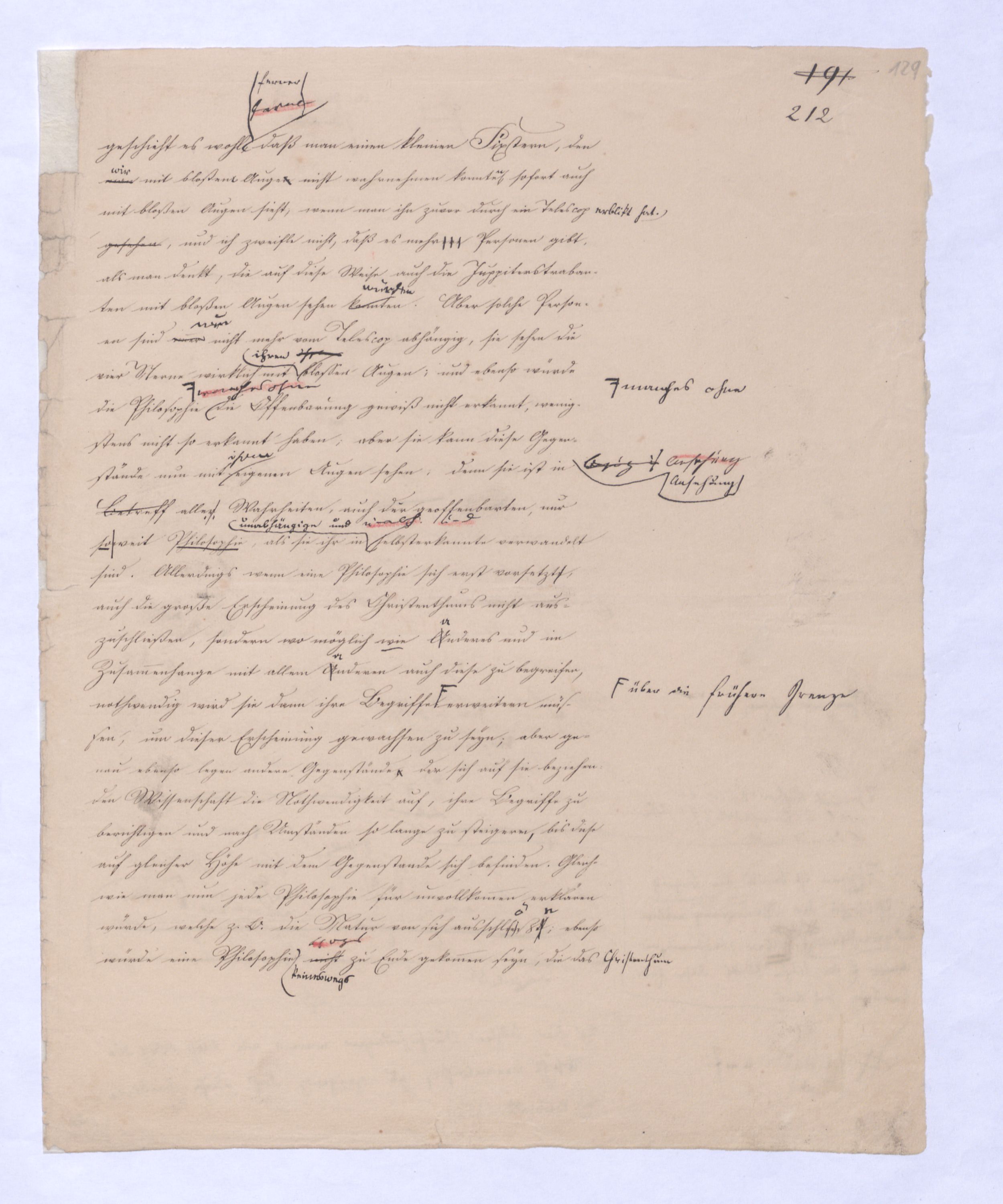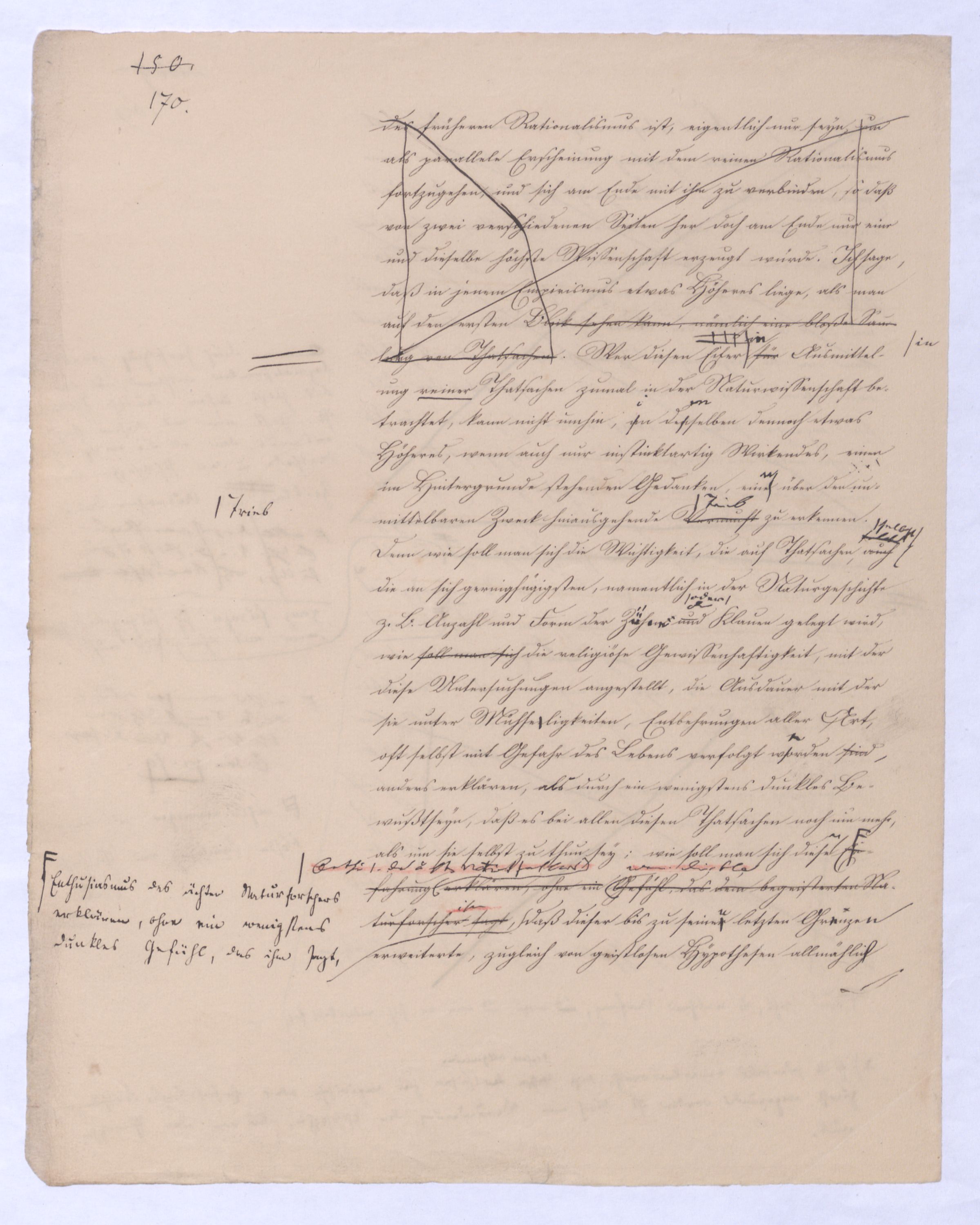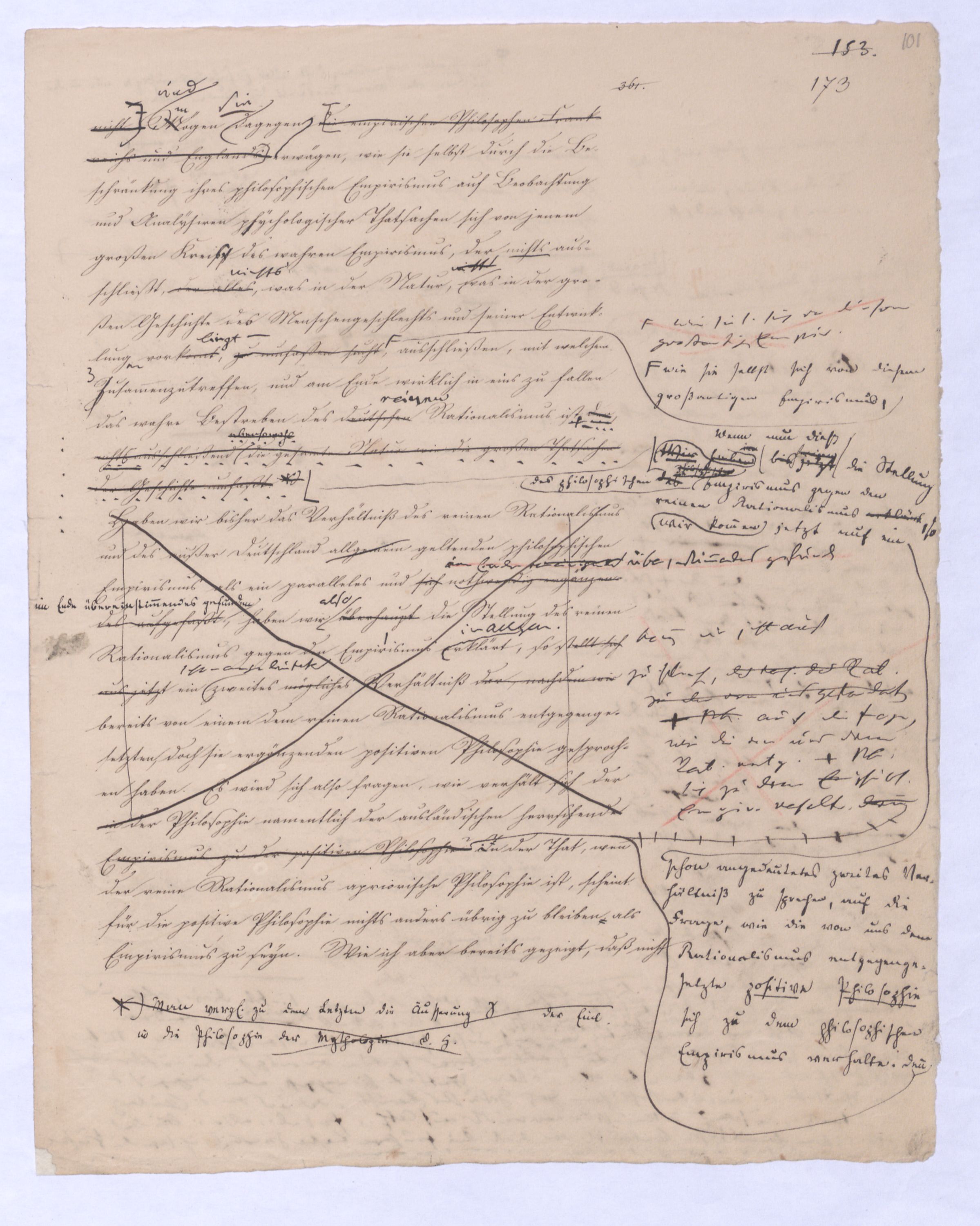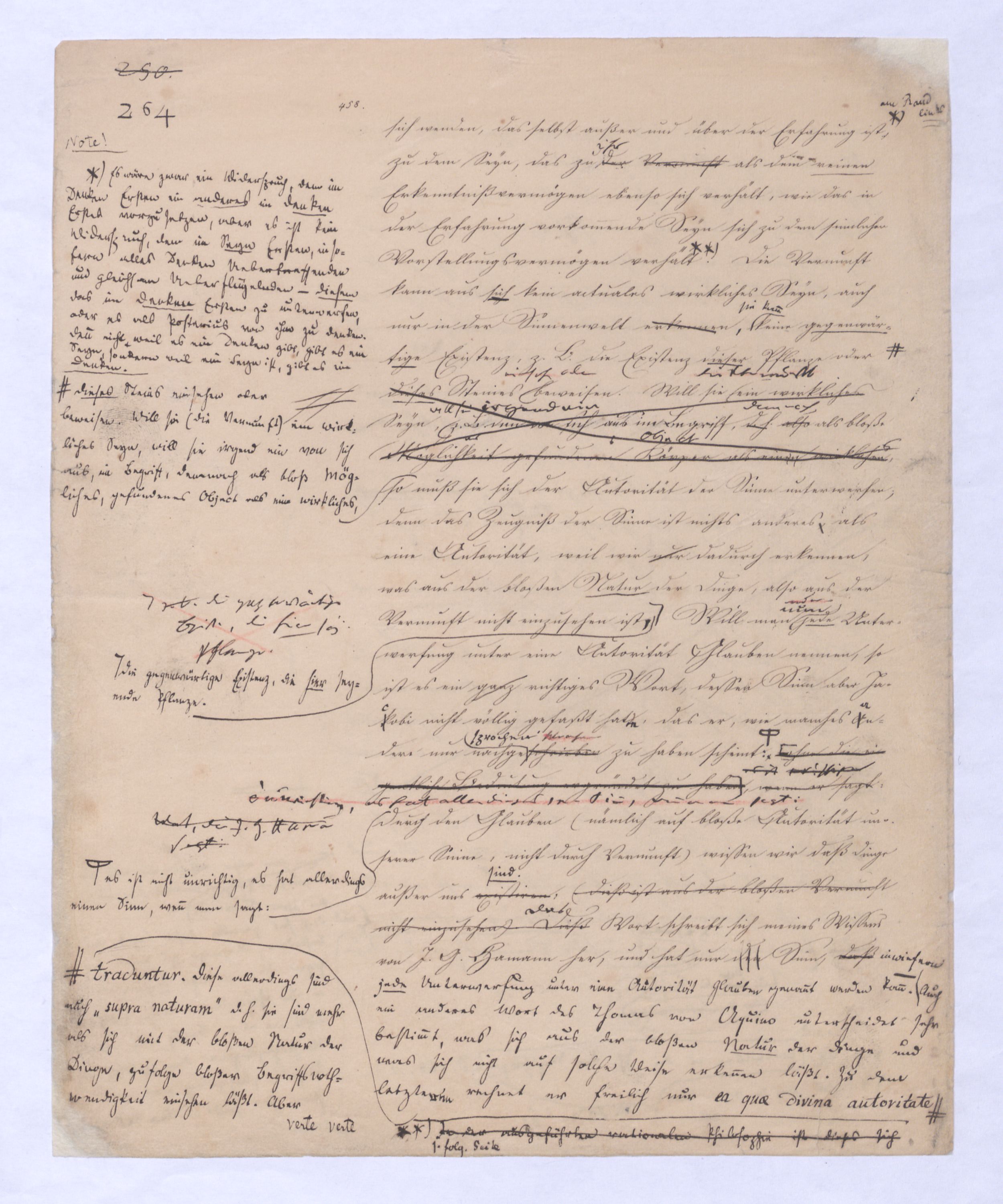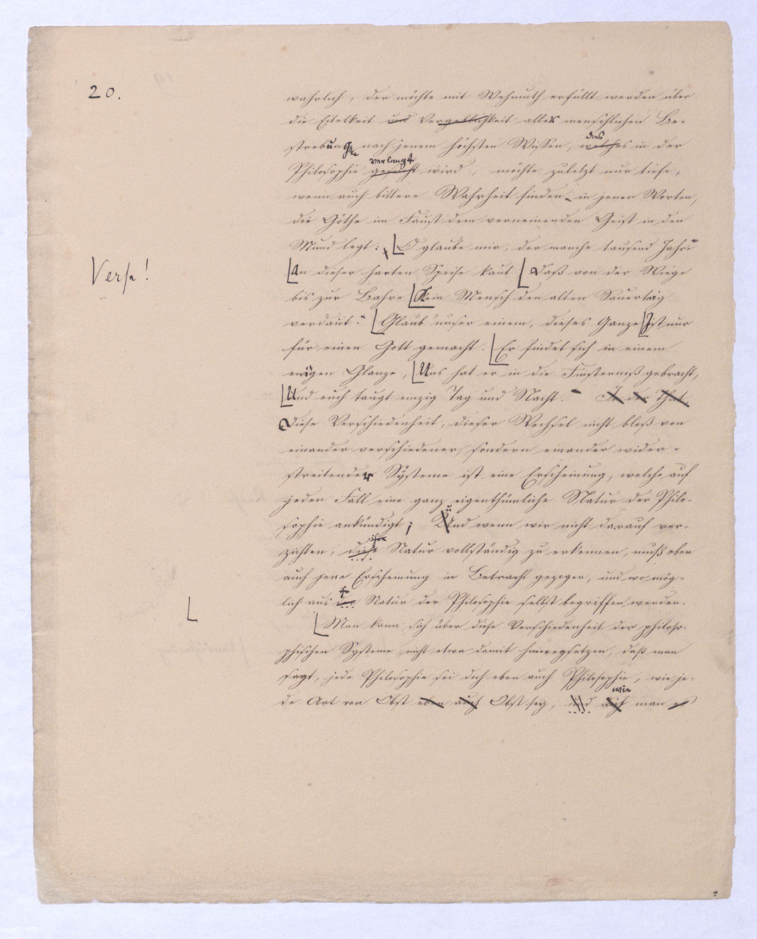 , die Lehre Jakobis und anderer Gleichgesinnten; ferner Empirismus, obgleich einer höheren Ordnung wird die Lehre seyn, welche das Geheimniß des göttlichen Wesens und des Ausgangs-Punktes aller Dinge aus Gott durch unmittelbares Schauen durch ein enthuastische Intuition zu erlangen vorgibt, der Theosophismus, welcher in wie ferne dieses Schauen auch etwas Geheimnißvolles, Mystisches seyn kann, zugleich Mysticismus zu nennen wäre und zwar zum Unterschied vom bloß practischen, theoretischer Mystisicismus, der nun zwar der wissenschaftlichen Form, der rationellen, sich begibt, aber dennoch Anspruch macht auf objective Erkenntniß und speculativen Inhalt. Hier sind also u. wolle gar alles Übersinnl. entw. überh. oder doch als möglr. Gegenst. der Erk. geleugnet wird. Nimmt man den philos. Empiris. in diesem Sinn, so hat er mit der was wir + Ph. nennen, nicht einmal d. Gegens. gegen den Rat. gemein. Denn die + Ph. geht nur davon d. Erkenntnißleugnet nur, daß d. Übers. auf dem bloß rat. Wege nicht erkennbar sey, jener aber beh. daß es weder auf diese noch auf jeneandre Weise erkennbar sey, ja am Ende daß es nicht Gegenst. einer wirkl. Gegenst. einer Erfahrung werden könne, welche Erfahrung denn wobei sich übrigensdann von s. versteht, daß diese Erfahrung s. nicht bloß sinnlr. Art seyn kann, insof.vielmehr s. etwas myst. Geheimnißvolles Mystisches an sich hathaben muß; weßhalb wir denn die Lehren dieser Art wohl überh. Lehren eines myst. Empir. überh. nennen können. Unter diesen Lehren steht wohl wieder am tiefsten diej., welche uns d. Überg. von dieer Exist. des Übersinnl. nur durch eine göttli. Offenb. zu theildie zugl. als äußeres Factum gedacht ist gewiß werden läßt: Denn obgl. ich sage: diese Lehre steht wohl auf der Die nächste sich deren Wirkung nur auf unser Inneres, auf unseren Geist erstrecken kann, so wird sie doch dabei s. als äußeres Factum vorausges.nach ihrStufe ist eine Philos., welche zwar über alle äußere Thatsache hinweggeht, aber dagegen auf d. innere Thatsache eines unwiderstehlichen Geh Gefühls sich beruft, das uns von d. Existenz Gs. überz., während d. Vernunft unvermeidl. auf Ath., Fatal., also ein blindes Nothw.system