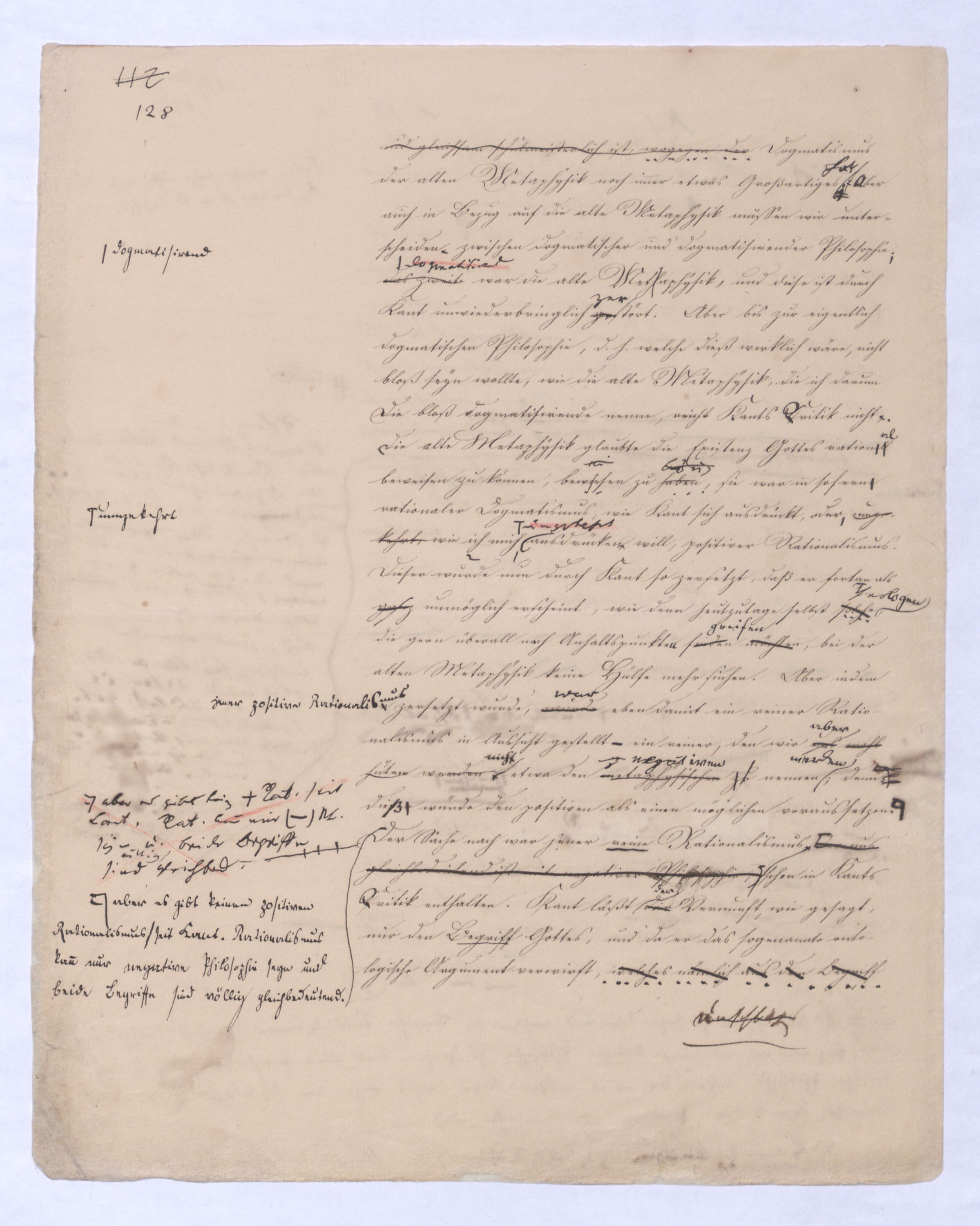 . Das Wort Dogmatismus hat freilichtiefererkühnerer und weit herrlicherer Dogmatismus, als in der füheren Philosophie möglich geworden sey, und wohlgewesen einst noch hervortreten werde theils schon von Kant her einen übeln Klang, theilsvollends in Folge jenes logischen Dogmatismus, den man später Hegel auf den bloßen abstracten Begriff zu gründen suchtewollte, und der von allen der widerwärtigste, wie kleinlich undweil der kleinlichste ist, und gleichsam schulmeisterlich ist, wogegen der das zweite; dogmatisirend war die alte Methaphysik, und diese ist durch Kant unwiederbringlich gezerstört. Aber bis zur eigentlich dogmatischen Philosophie, d. h. welche dieß wirklich wäre, nicht bloß seyn wollte, wie die alte Metaphysik, die ich darum die bloß dogmatisirende nenne, reicht Kants Critik nicht, d. Die alte Metaphysik glaubte die Existenz Gottes rationell beweisen zu können, bewieeisen zu haben können, sie war insoferne rationaler Dogmatismus, wie Kant sich ausdrückt