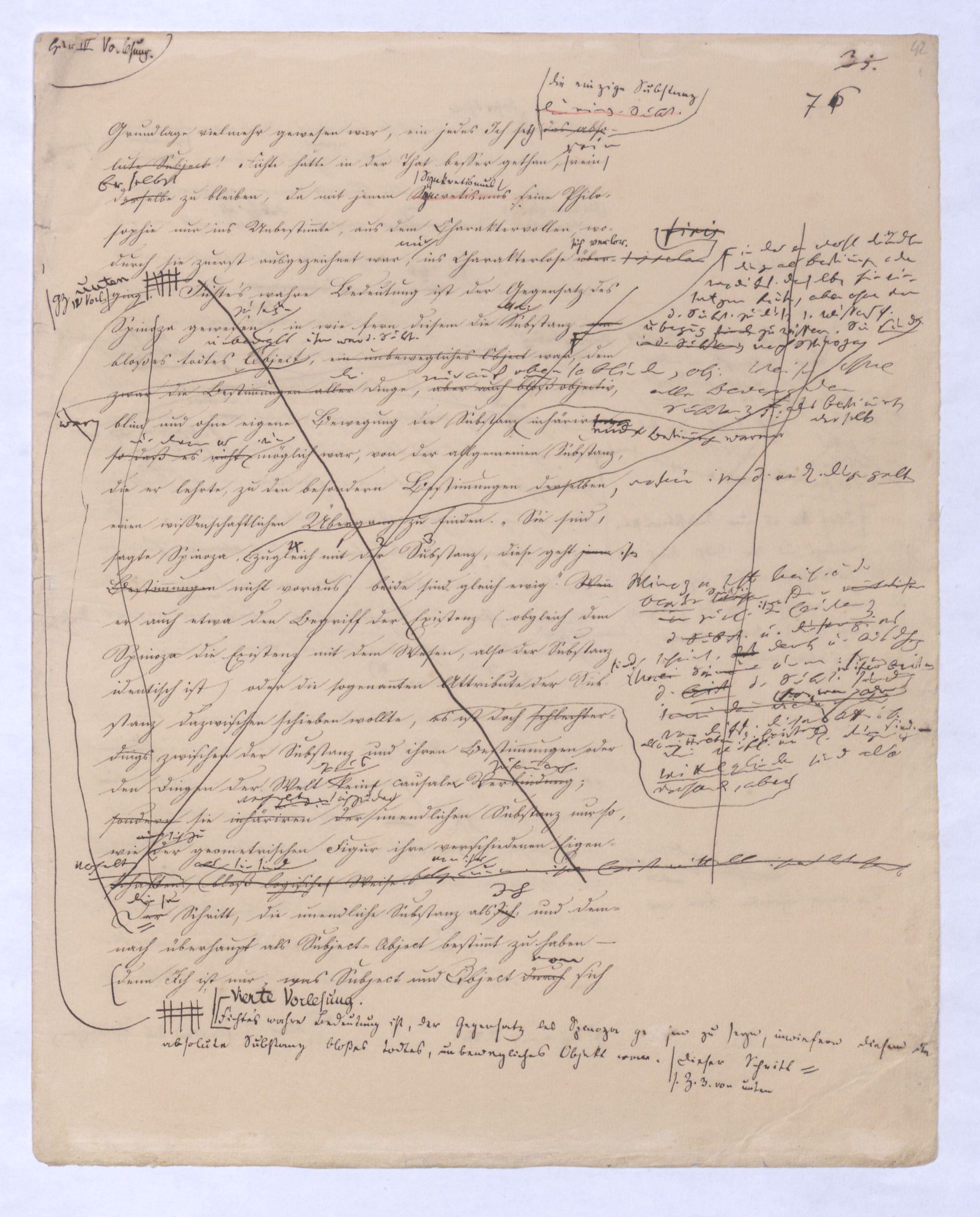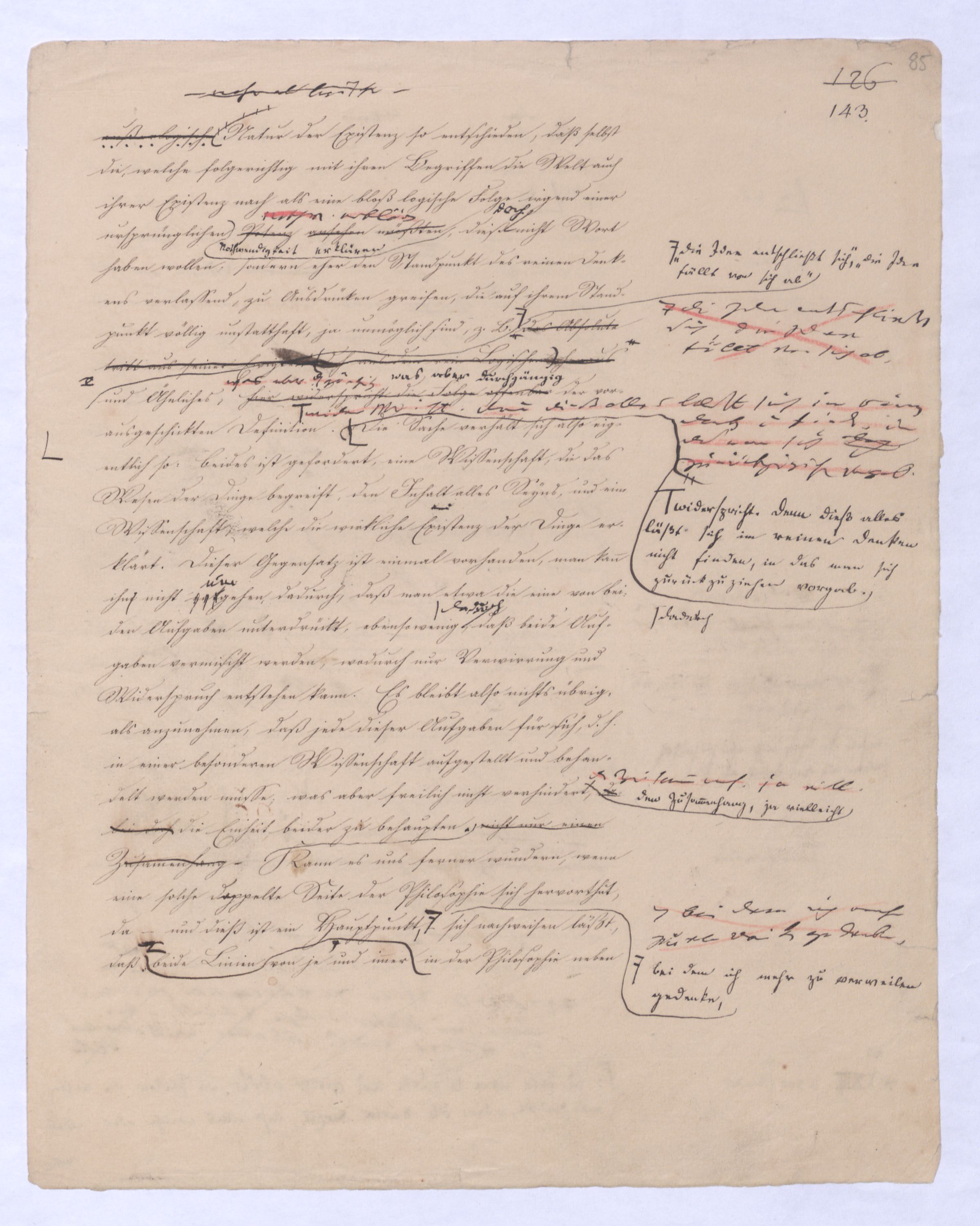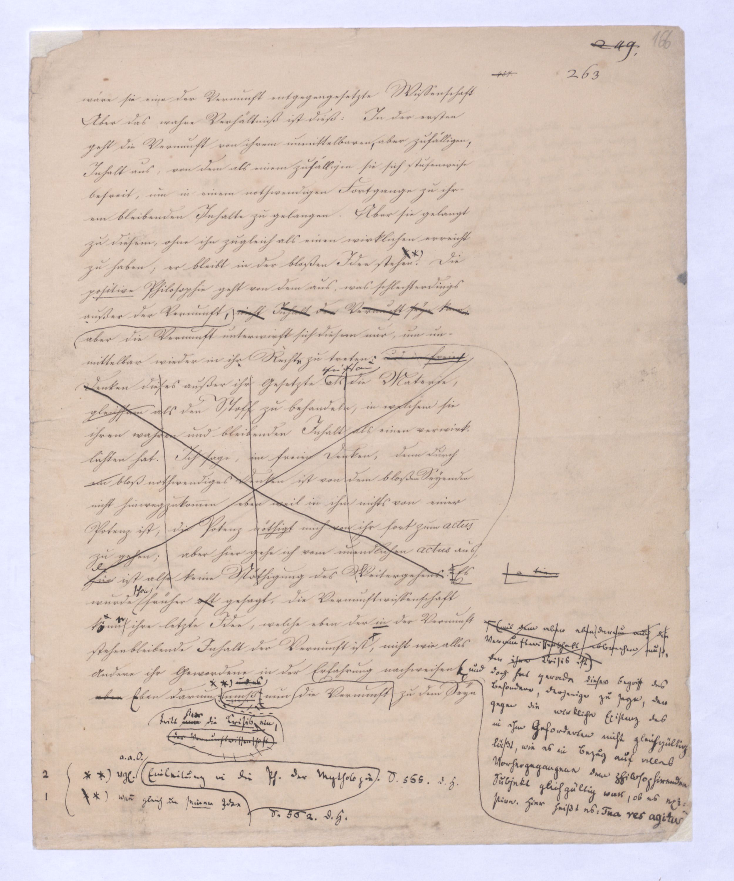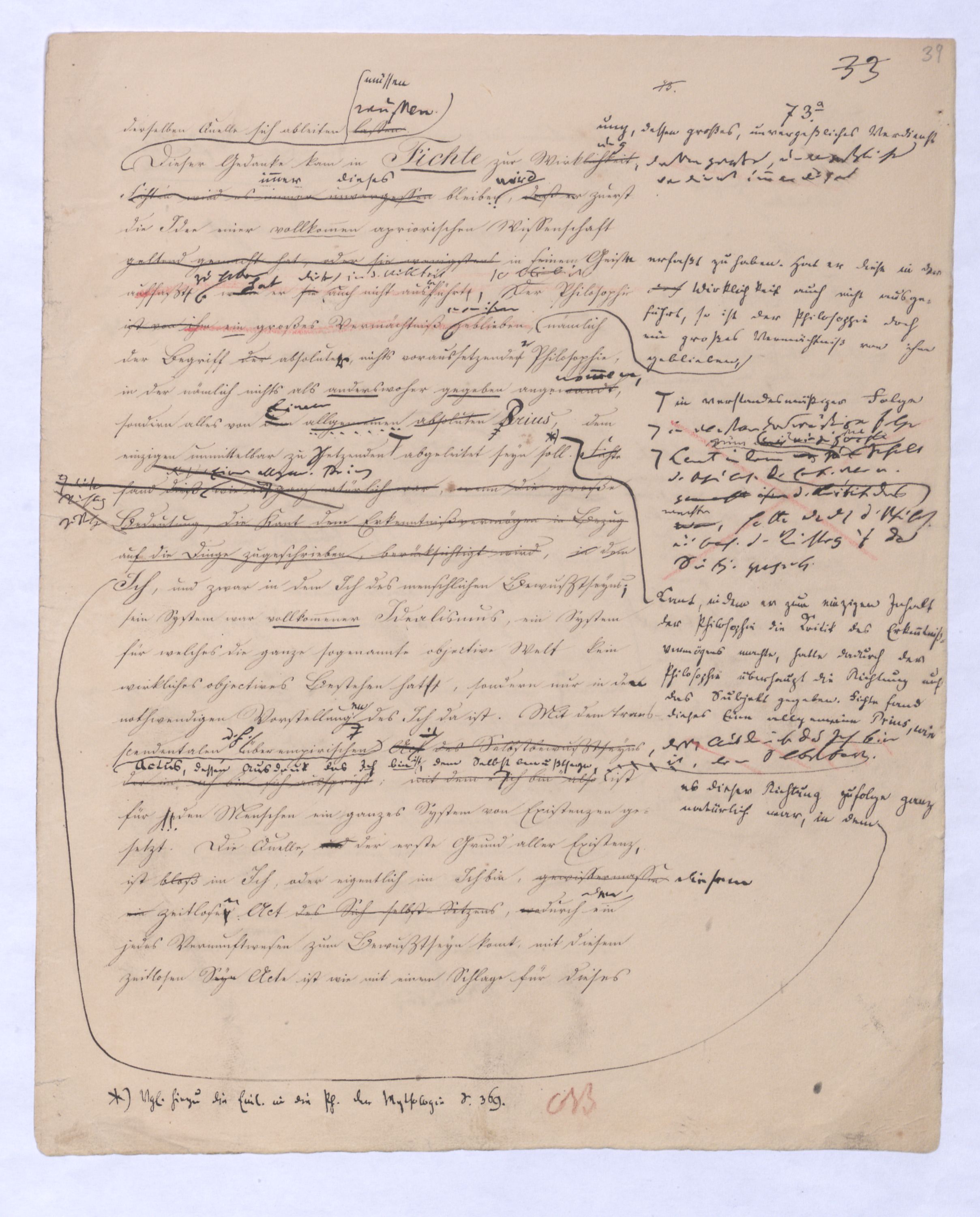 Ich habe, als ich diese Unterscheidung zuerst vortrug, gleich vorausgesehen, was geschehen würde; wirklich haben sich gegenmanche über diese einfache, gar nicht zu verkennende, aber gerade darum höchst wichtigen Unterscheidung verschiedene Stimmen erklärt, größtentheils vermeintliche Anfänge einer vorausgegangenen Philosophie. Freilich ist dieß nicht ohne Grund, und wenigstens instinkmäßig gesehen, weil sie fühlten daß mit dieser Unterscheidung der ganze Mißverstand jener Philosophie hinweggenommen sei; indeß ist vorläufig zu bemerken, daß eben diese nicht sehr weit in Hegelssich ganz verwundert gezeigt denn sie hatten in einer vorausgeg. Philos. viel von einerder Ident. einer falsch verstandenen Id. des O. u. des S. gehört. Diese Id., recht verstanden, werde ich wohl schon gewiß nicht bestreiten, denn sie schreibt sich von mir her, aber eben diesenen Mißverstand dieser Ident. werde ich bestreiten, der stets s. in d. Philos., die sich von ihm herschreibt, einschl. u. die von letzterem sich herschreib. Philosophie mußte ich wohl bestreiten. ÜbrigensIndeß braucht man nicht weit in Hegels Encyclopädie der philos. Wissenschaften mit hineinzulesen gehabt, um auf dern ersten und den nächstfolgenden Seiten wiederholt zu finden den Ausdruckden Ausdruck zu finden: daß die Vernunft sich mit dem An sich der Dinge beschäftige