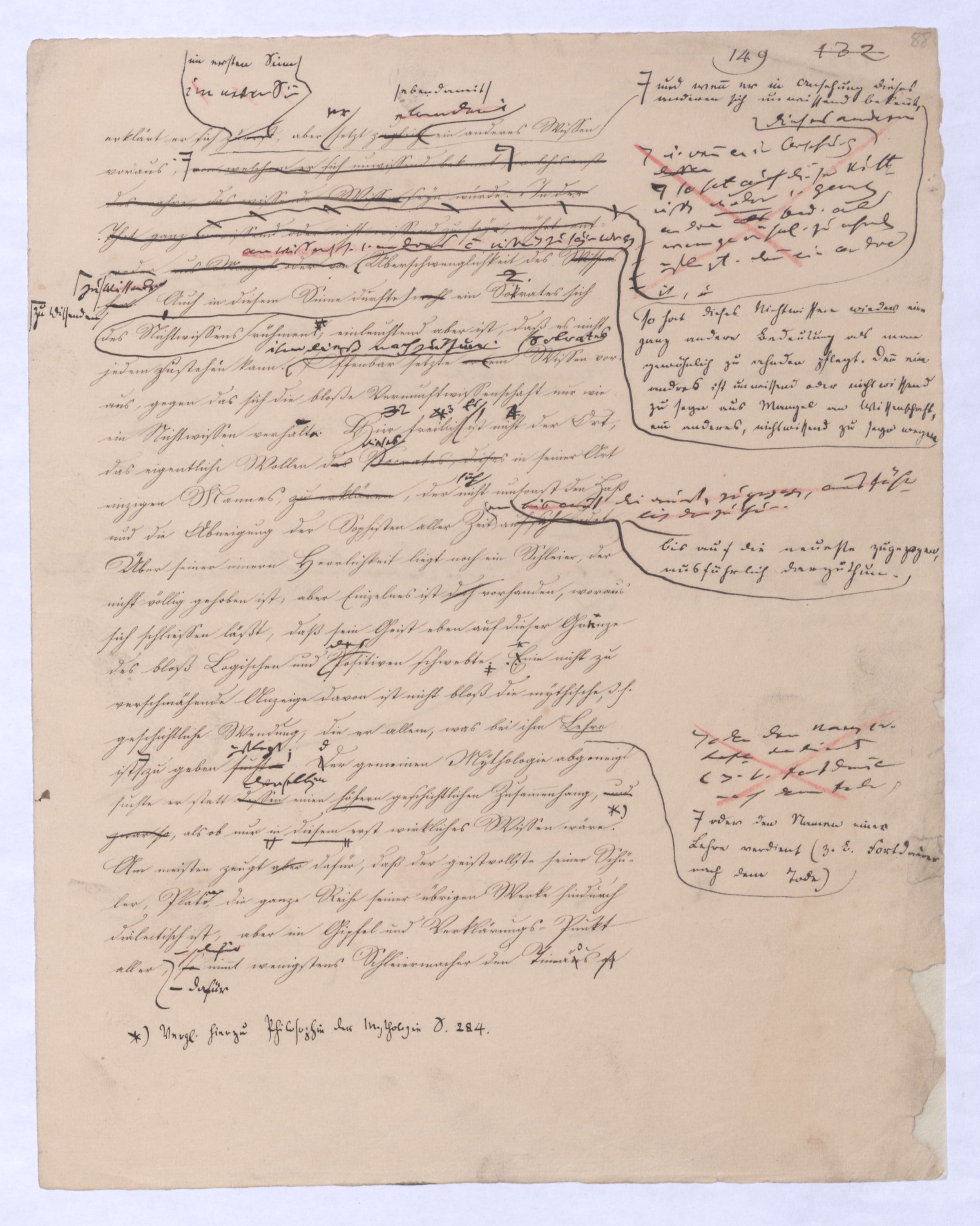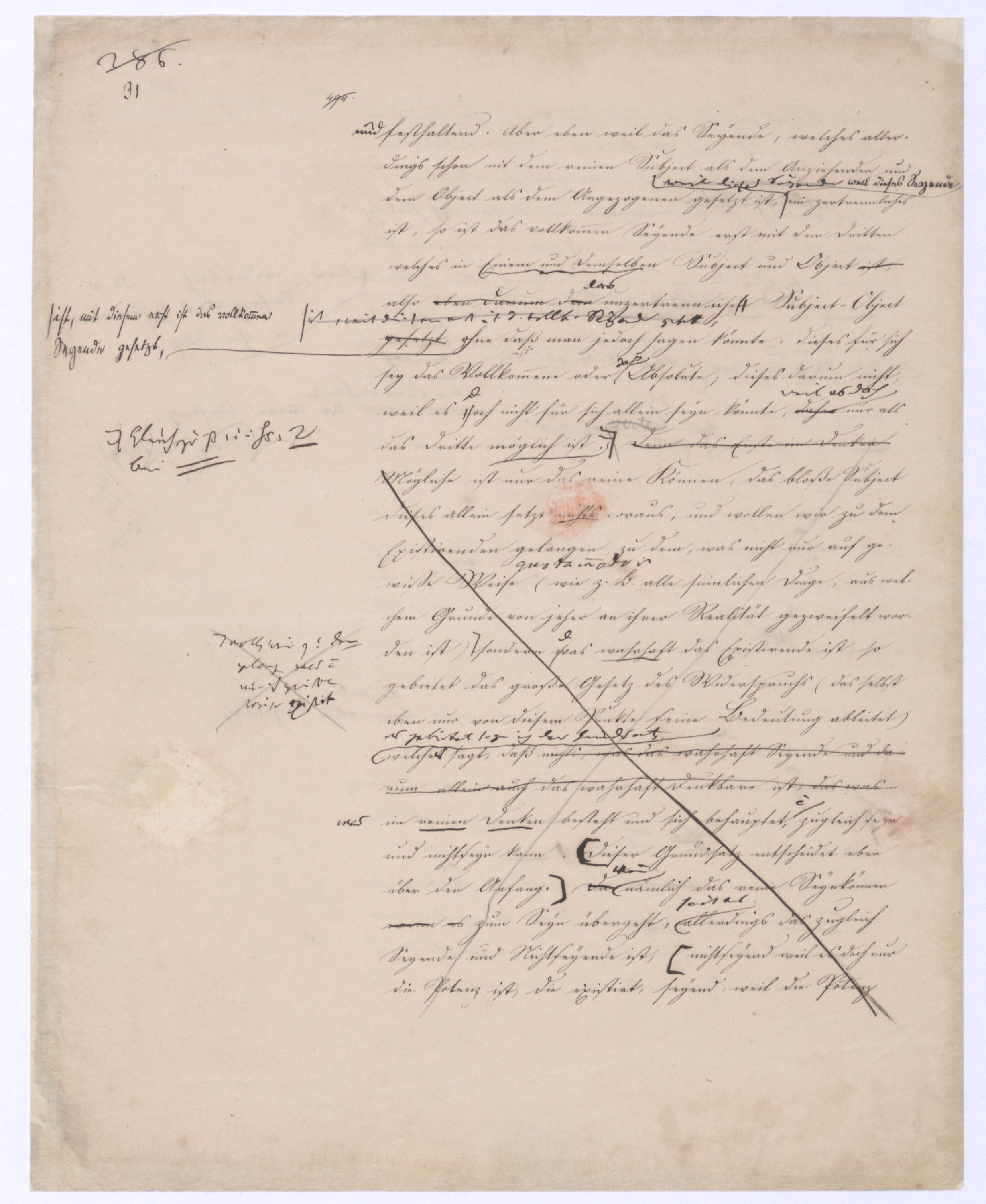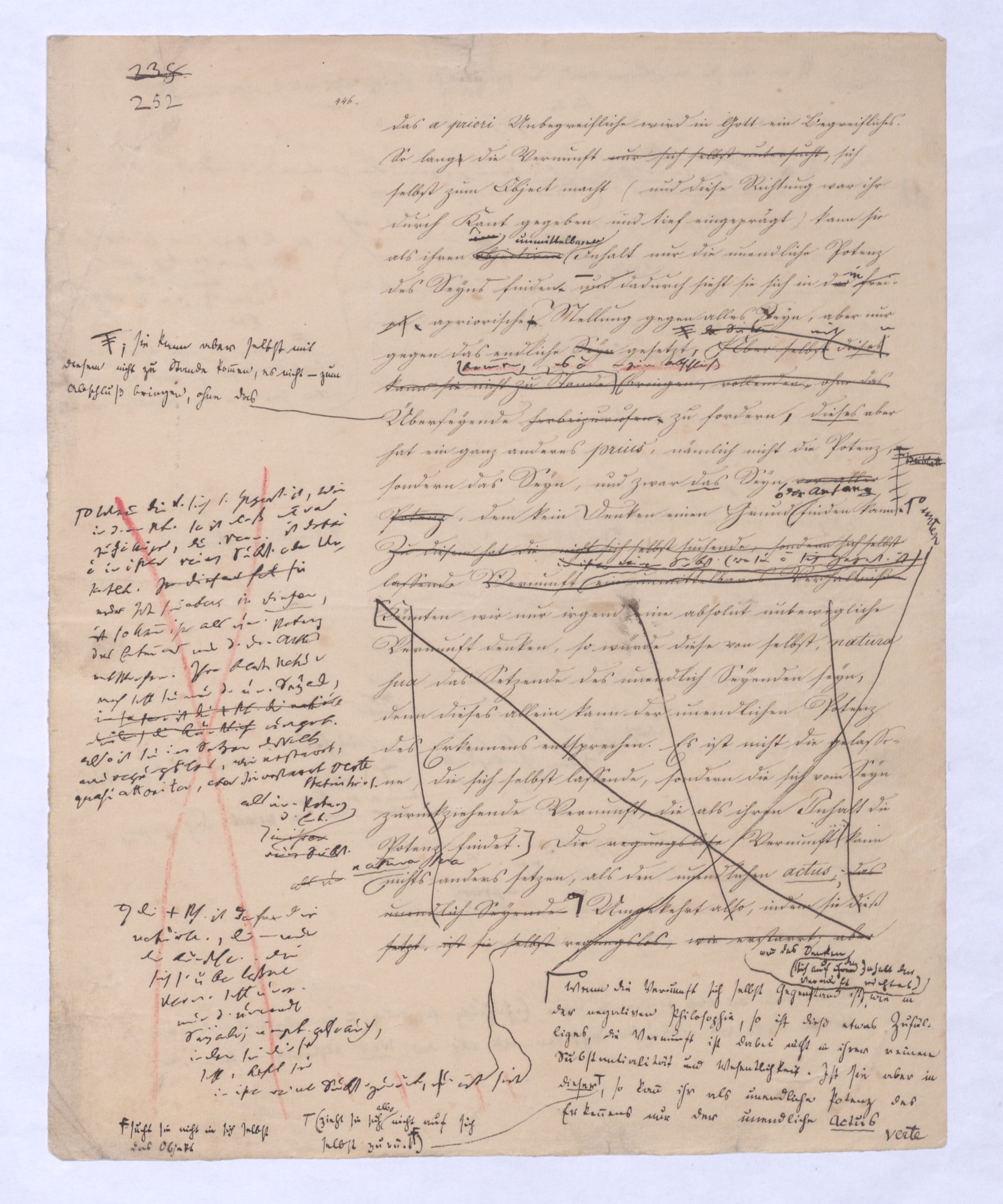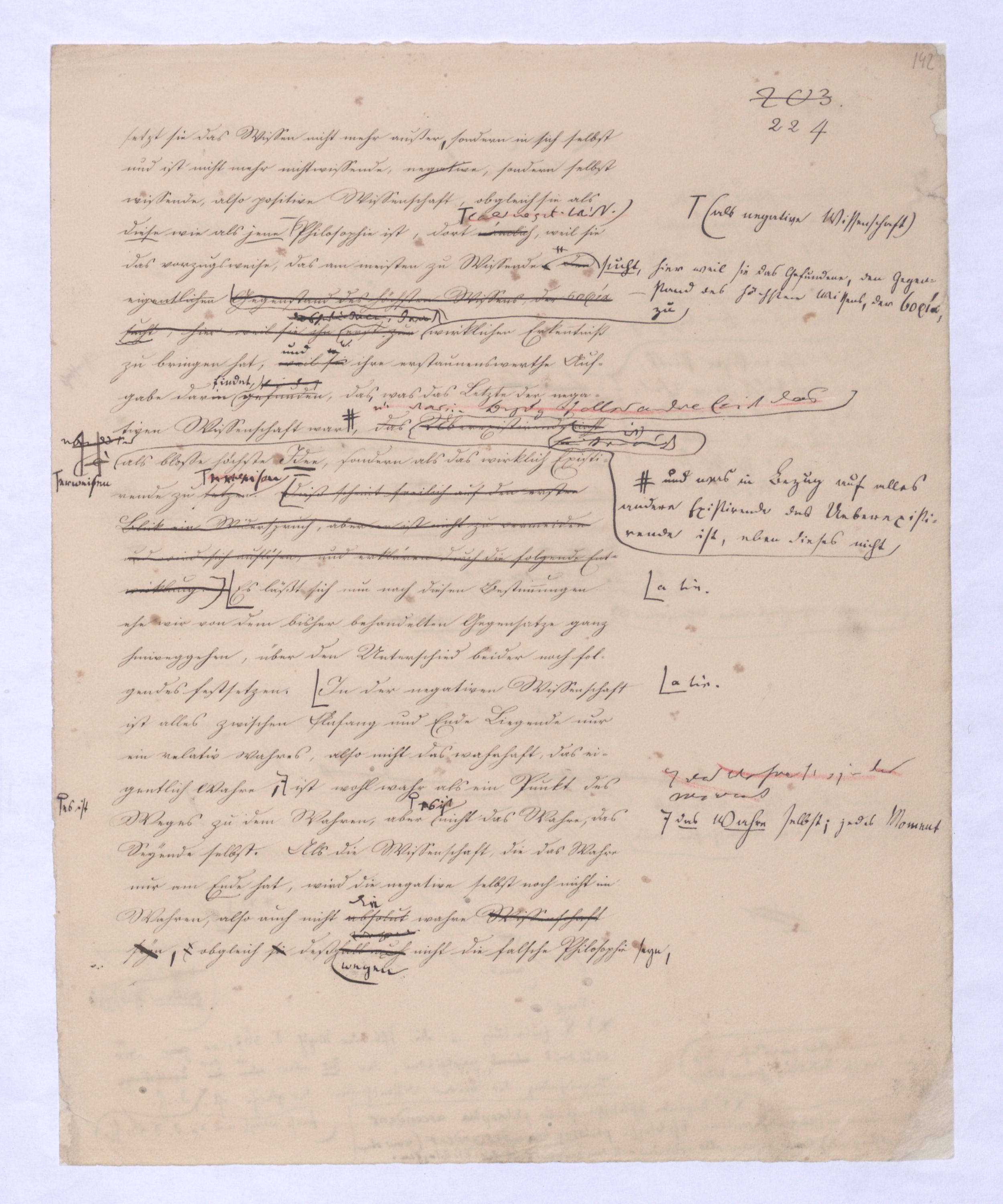 Ich habe, als ich diese Unterscheidung zuerst vortrug, gleich vorausgesehen, was geschehen würde; wirklich haben sich gegenmanche über diese einfache, gar nicht zu verkennende, aber gerade darum höchst wichtigen Unterscheidung verschiedene Stimmen erklärt, größtentheils vermeintliche Anfänge einer vorausgegangenen Philosophie. Freilich ist dieß nicht ohne Grund, und wenigstens instinkmäßig gesehen, weil sie fühlten daß mit dieser Unterscheidung der ganze Mißverstand jener Philosophie hinweggenommen sei; indeß ist vorläufig zu bemerken, daß eben diese nicht sehr weit in Hegelssich ganz verwundert gezeigt denn sie hatten in einer vorausgeg. Philos. viel von einerder Ident. einer falsch verstandenen Id. des O. u. des S. gehört. Diese Id., recht verstanden, werde ich wohl schon gewiß nicht bestreiten, denn sie schreibt sich von mir her, aber eben diesenen Mißverstand dieser Ident. werde ich bestreiten, der stets s. in d. Philos., die sich von ihm herschreibt, einschl. u. die von letzterem sich herschreib. Philosophie mußte ich wohl bestreiten. ÜbrigensIndeß braucht man nicht weit in Hegels Encyclopädie der philos. Wissenschaften mit hineinzulesen gehabt, um auf dern ersten und den nächstfolgenden Seiten wiederholt zu finden den Ausdruckden Ausdruck zu finden: daß die Vernunft sich mit dem An sich der Dinge beschäftige
