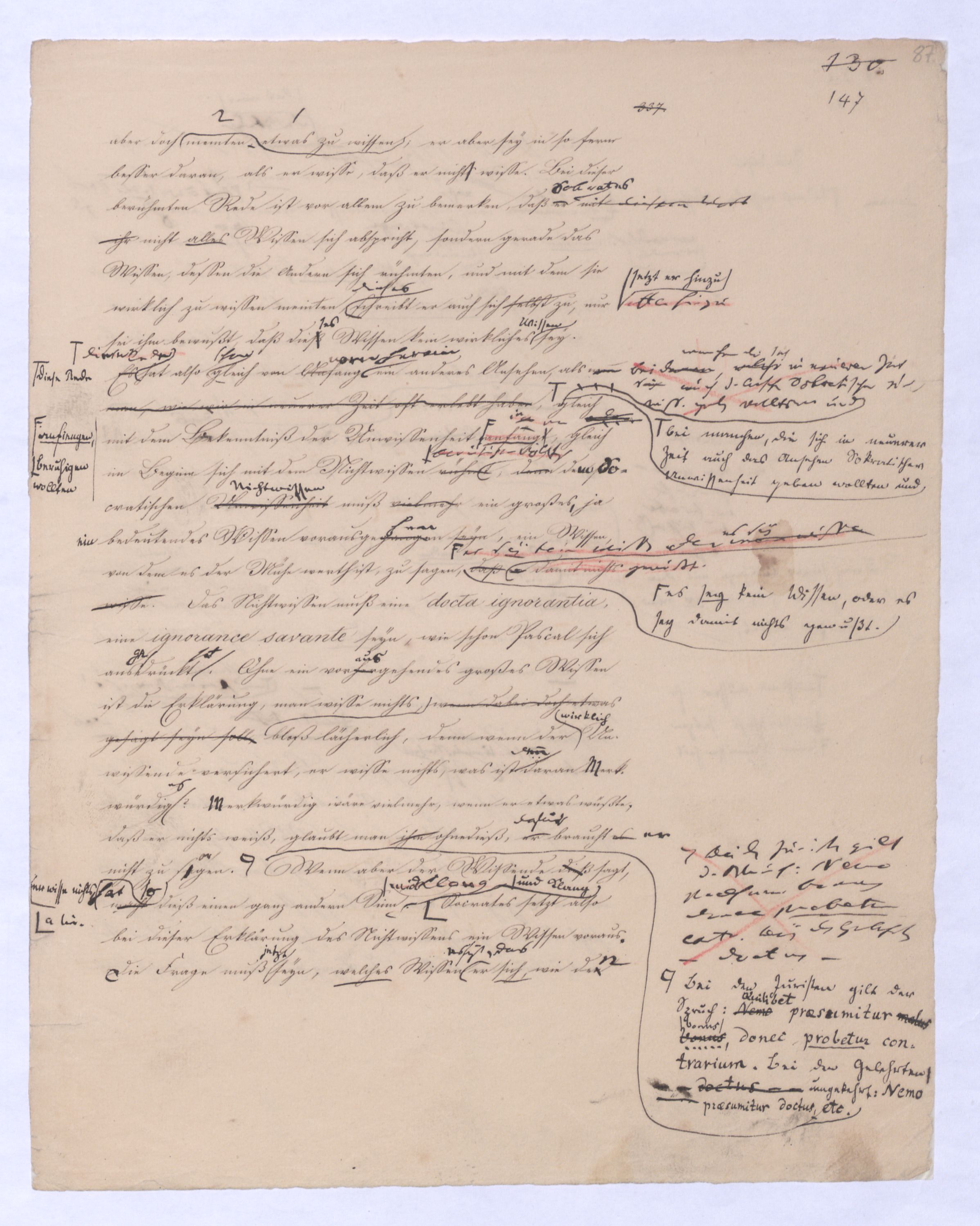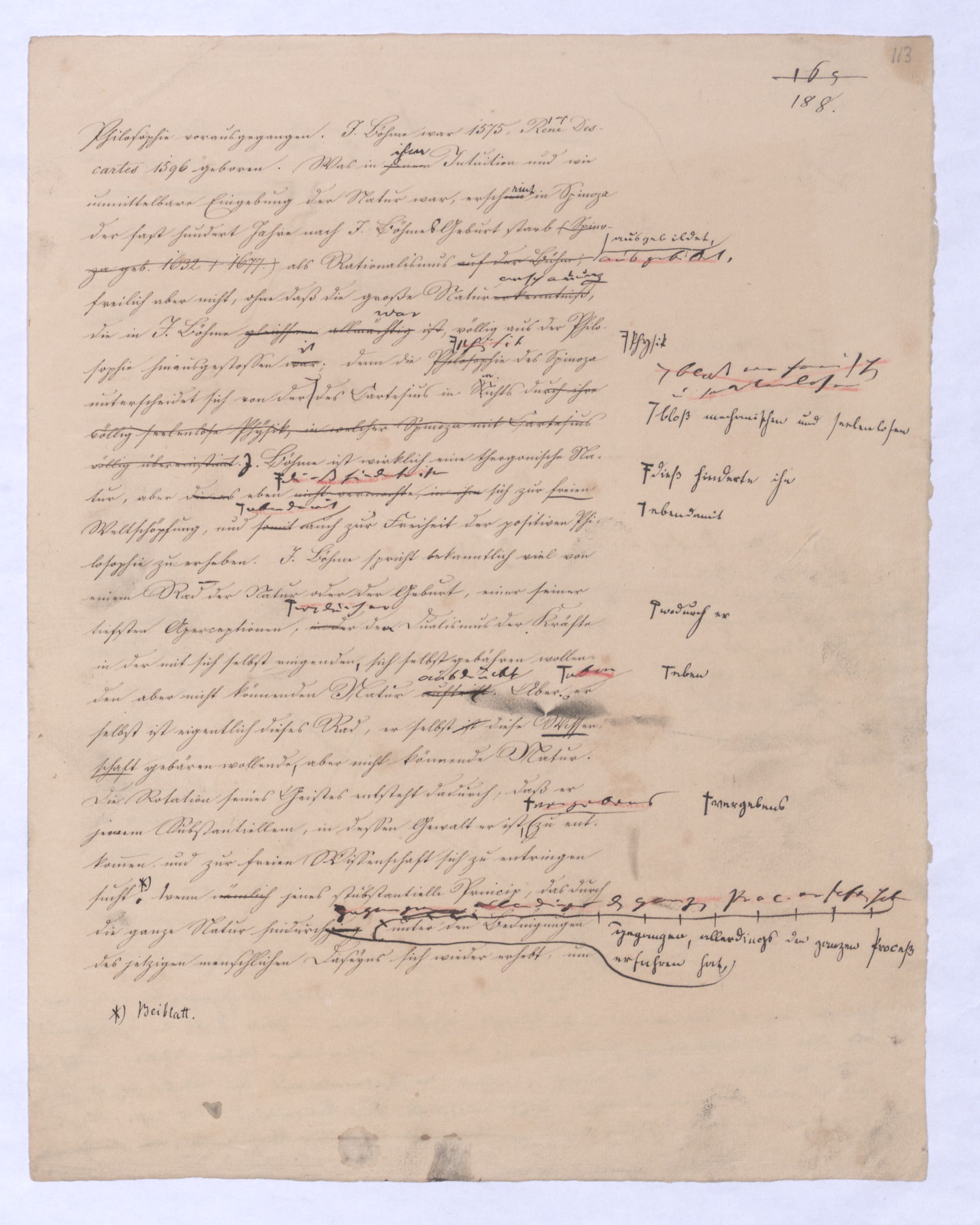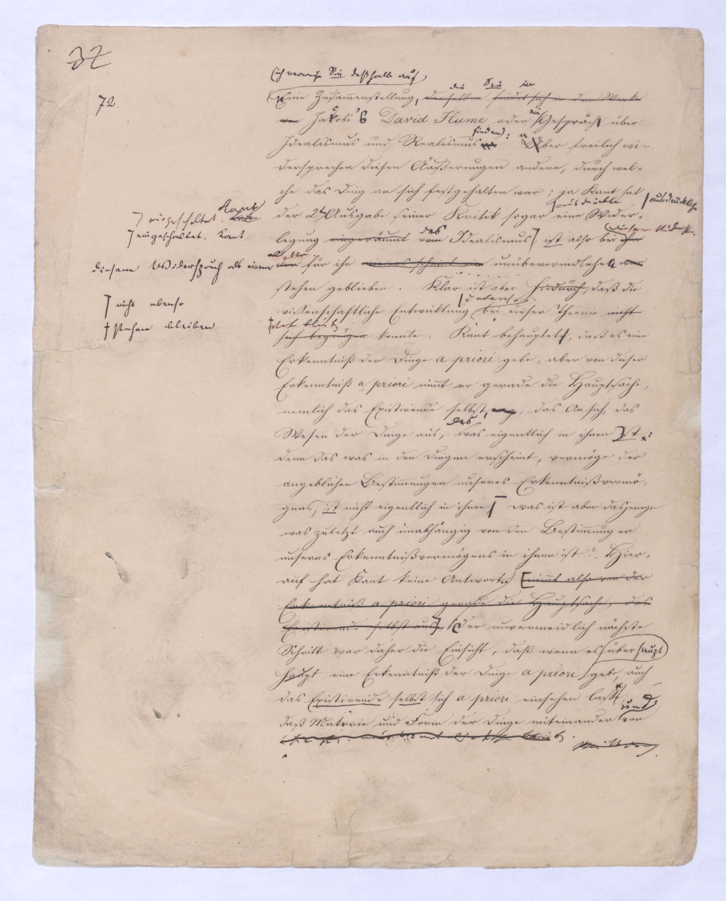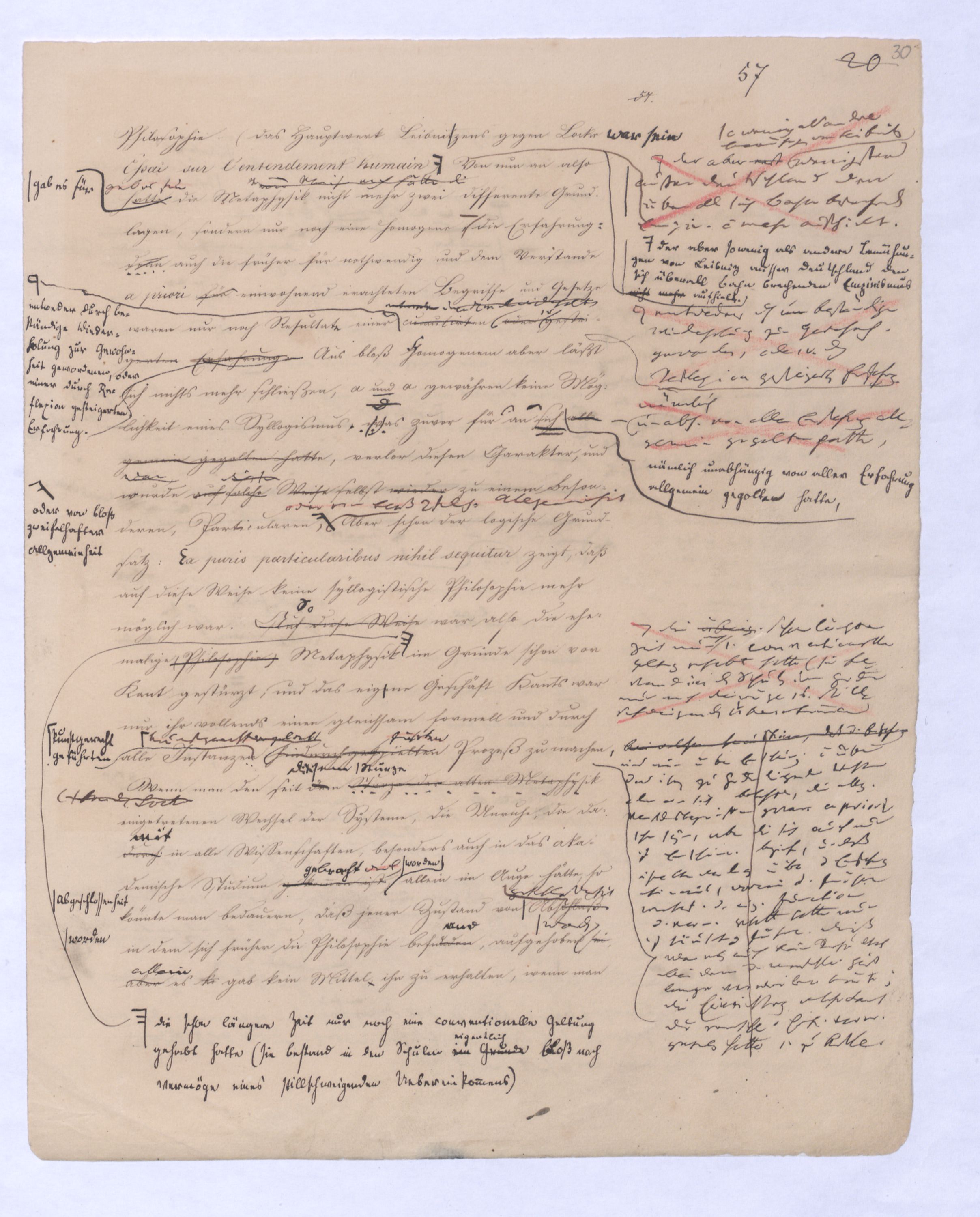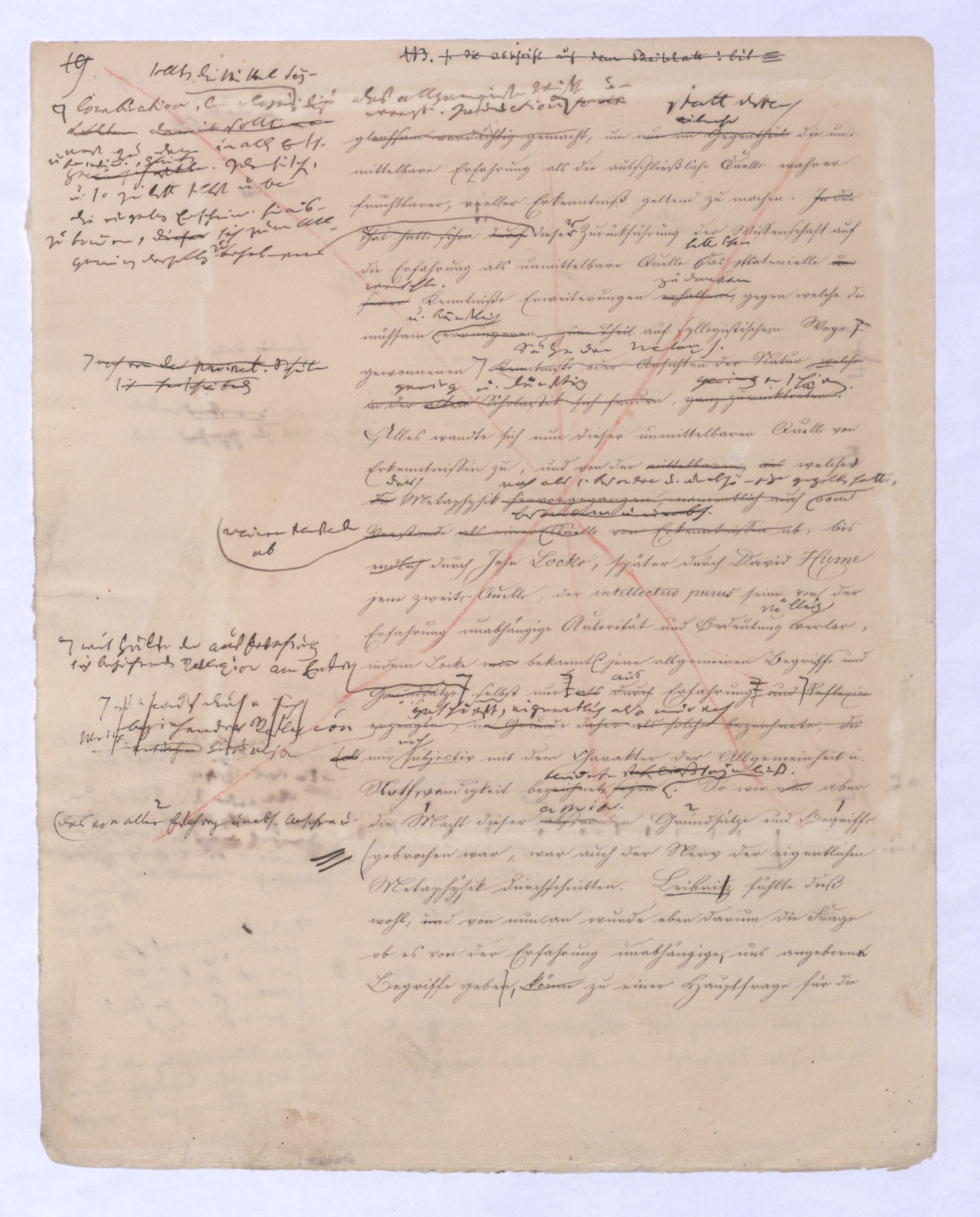 Hierin lag schon die Forderung, die Nothw. d. Dinge s. darzuthun. nicht sehr weit entfernt warensogar aussprachen. sinnliche sichere Quelle der Erkenntniß angegriffen, sogar selbst in Zweifel gestellt. Der erste Riß in d. Gewebe d. alten Metaph. war der Zweifel gegen d. Wahrh. oder Real. d. sinnl. Erfahrung so ward durch Cartesius der ingesetzt wurdekund. Anstatt ¿u Aber noch vor Cartesius hatte der berühmte Baco von Verulam im Gegentheil die Sinnenerfahrung als d. einzig ächte urspr. Quelle aller Erk. geltend gemacht, und ermüdet von den von den Syllogismen der Schulmetaphysik, gegen diese ganze Art und Weise zu verfahren um, das ganze Geschlecht der allgemeinen Begriffe und der auf sie gebauten Schlüsse gleichsam verdächtig gemacht, um das allgemeinste Mißtrauen erregt. Induction statt dessen die unmittelbare Erfahrung als die ausschließliche Quelle wahrer fruchtbarer, reeller Erkenntniß geltend zu machen. In der That hatte schon durchnun im Gegentheilvielmehr¿¿¿Kombination, Analogie dieß sollten damit sollte vonsollten die Mittel seyn; erst zu dem in allen Ersch. Gemeinschaftl.Übereinstimm., Gleichen, Identischen, u. so zuletzt selbst über die einzelnen Erschein. hinauszukommen, dieser sich zum Allgemeinen derselben zu erheben; dieser Zurückführung der Wissenschaft auf die Erfahrung als unmittelbare Quelle hatte schon das Materielle um fernermenschl. Kenntniße Erweiterungen erhaltenzu danken, gegen welche die mühsam errungenen, zum Theilu. künstlich auf syllogistischem Wege noch von der peripat. Schule sich fortschreitenden Kenntnisse oder Ansichten der NaturSätze der Metaph. welche in der alten Scholastik sich fandengering u. dürftig, ganz zurücktreten.gering erscheinen. Alles wandte sich dieser unmittelbaren Quelle von Erkenntnissen zu, und von der unmittelbaren, aus welcher die der Metaphysik hervorgegangen, namentlich auchnoch als eine besondere u. unabhängige gegolten hatte, vom Verstandereinen Verstande ab als reiner Quelle von Erkenntnissen ab bis andere u. unabh., bis endlich durch John Locke, später durch David Hume jene zweite Quelle, der intellectus purus seine von der Erfahrung unabhängige Autorität und Bedeutung völlig verlor, indem Locke wie bekanntl jene allgemeinen Begriffe und Grundsätze als durchaus Erfahrunggeschöpft, eigentlich also nur nochReflexion erzeugtenur ein r Reflexion entstehen ließspringen, im Grunde daher als solche bezeichnete, die (als nur nochbezeichnet seyenbekleidet stehen ließ seyn ließ. So wie nun aber das von aller Erfahrung unabh. Ansehen u. die Machtdie Macht u. das von aller Erfahrung unabh. Ansehen dieser abstracten Grundsätze und Begriffeaprior. Begriffe und Grundsätze gebrochen war, war auch der Nerv der eigentlichen Metaphysik durchschnitten. Leibnitz fühlte dieß wohl, und von nun an wurde eben darum die Frage ob es von der Erfahrung unabhängige uns angeborne Begriffe geben, könne zu einer Hauptfrage für die Philosophie. (Das Hauptwerk Leibnitzens gegen Locke Essai sur l’entendement humain). Der aber erstso wenig als andre Bemühungen von Leibnitz wenigstens außer Deutschland den überall sich Bahn brechenden Empir. nicht mehr aufhielt. Von nun an also hattegab es für die Metaphysik nicht mehr zwei differente Grundlagen, sondern nur noch eine homogene, – die Erfahrung: denn auch die früher für nothwendig und dem Verstande a priori für einwohnend erachteten Begriffe und Gesetze waren nur noch Resultat einer cumuliertenentweder undendlich wiederholtenoder einer gesteigerten Erfahrung.entweder durch unbeständige Wiederholung zur Gewohnh. gewordenen, oder einer durch Reflexion gesteigerten Erfahrung. Aus bloß homogenem aber läßt sich nichts mehr schließen, a und a gewähren keine Möglichkeit eines Syllogismus, was zuvor für an sich allgemein gegolten hatte,nämlich unbh. von aller Erfahrung allgemein gegolten hatte, verlor diesen Charakter, und war wurde auf selbstsolchediese Weise wieder zu einem Besonderen, Particularen., oder von bloß zweifelh. Allgemeinheit. Aber schon der logische Grundsatz: ex puris particularibus nihil sequitur zeigt, daß auf diese Weise keine syllogistische Philosophie mehr möglich war. Auf diese Weise war also die ehemalige (Philosophie) Metaphysik die übrig. schon längere Zeit nur noch eine conventionelle Geltung gehabt hatte (sie bestand in den Schulen im Grunde nur noch vermöge eines stillschweigenden Übereinkommens) im Grunde schon vor Kant gestürzt, und das eigene Geschäft Kants war nur ihr vollends einen gleichsam formell und durch alle Instanzen kunstgerecht vorgebrachten hindurchgespieltenführten Prozeß zu machen. Wenn man den seit ., bei welchen herauskäme, daß d. Erfahrung uns nur über Erschein. nicht über das ihnen zu Grunde liegende Wesen oder an sich belehre, die allg. Verstandesbegriffe zwar a priorische seyen, aber die sich auch nur auf Erschein. beziehen, u. daß ihre Anwendung über d. Erfahrung hinaus, worin d. frühere Metaph. d. eig. Function d. Vern. gesetzt hatte nur auf Täuschung führe. Dieß war eben auch kein Resultat bei dem d. menschl. Geist lange verweilen konnte; die Einrichtung welche dort die menschl. Erf. vorm. gegeben hatte einzuhalten.demdies. Sturze der alten Metaphysik (schon durch Locke eingetretenen Wechsel der Systeme, die Unruhe, die dadurchmit in alle Wissenschaften, besonders auch in das akademische Studium gekommen istbracht worden, allein im Auge hätte, so könnte man bedauern, daß jener Zustand von Abschlußgeschlossenheit in dem sich früher die Philosophie befunden, aufgehoben worden sei, aberallein, es gab kein Mittel, ihn zu erhalten, wenn man nicht den menschlichen Geist selbst zu einem absoluten Stillstand bringen wollte. In die Länge konnte dieser sich der menschliche Geist mit jener philosophischen Erkenntnißweise schon darum nicht begnügen, dennweil sie die so genann. erzeugtegewonnene Erkenntniß erzeugte, und einenwar – weil der Zusammenhang den sie erreichte zwar nur ein Zusammenh