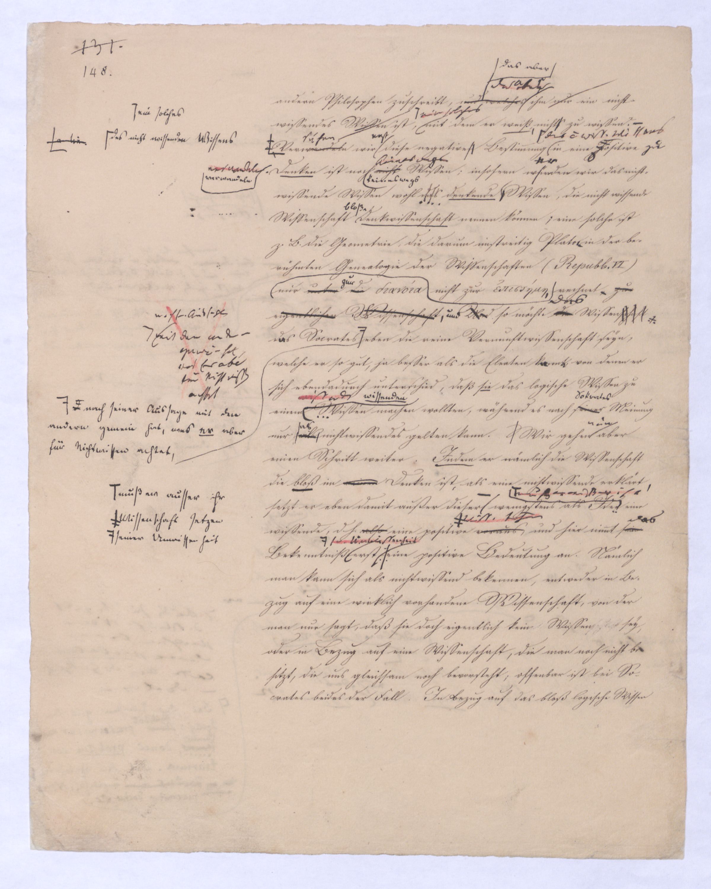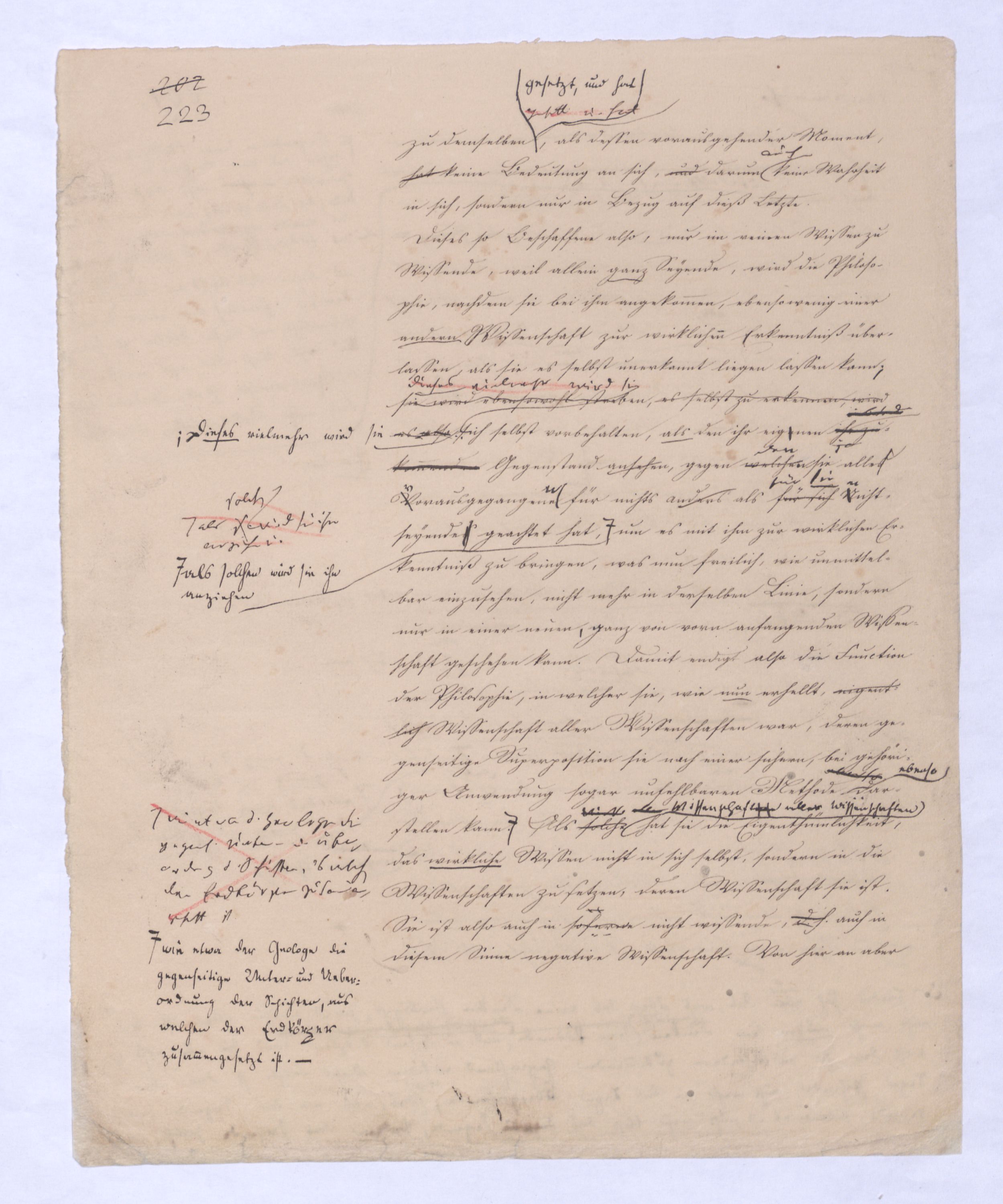 Dieses so Beschaffene also, nur im reinen Wissen zu Wissende, weil allein ganz Seyende, wird die Philosophie, nachdem sie bei ihm angekommen, ebensowenig einer andern Wissenschaft zur wirklichen Erkenntniß überlassen, als sie es selbst unerkannt liegen lassen kann sie wird ebensowohl streben, es selbst zu erkennen, wird es alsodieses vielmehr wird sie sich selbst vorbehalten, als den ihr eigenen ihr ansehen, gegen welchenden sie ja alles Vorausgegangene für nichts anders als für sichfür sie Nichtseyendes geachtet hat, als s.solchen wird sie ihn anziehen um es mit ihm zur wirklichen Erkenntniß zu bringen, was nun freilich, wie unmittelbar einzusehen, nicht mehr in derselben Linie, sondern nur in einer neuen ganz von vorn anfangenden Wissenschaft geschehen kann. Damit endigt also die Function der Philosophie, in welcher sie, wie nun erhellt, eigentlich Wissenschaft aller Wissenschaften war, deren gegenseitige Superposition sie nach einer sichern, bei gehöriger Anwendung sogar unfehlbaren Methode ebenso darstellen kann wie etwa d. Geologe die gegens. Unter- u. Überordnung d. Schichten, aus welchen der Erdkörper zusammengesetzt ist. Als solcheWiss. aller Wiss. hat sie die Eigenthümlichkeit, das wirkliche Wissen nicht in sich selbst, sondern in die Wissenschaften zu setzen, deren Wissenschaft sie ist. Sie ist also auch in sofern d. h. auch in diesem Sinne negative Wissenschaft. Von hier an aber setzt sie das Wissen nicht mehr außer, sondern in sich selbst, und ist nicht mehr nichtwissende, negative, sondern selbst wissende, also positive Wissenschaft, obgleich sie als diese wie als jene Philosophie ist, dort nämlich(als negat. Wiss.), weil sie das vorzugsweise, das am meisten zu Wissende, den eigentlichen Gegenstand des höchsten Wissens, der σοφία sucht, hier weil sie ihndas Gefundene, denGegenstand des höchsten Wissens, der σοφία erst zur wirklichen Erkenntniß zu bringen hat, weil sie ihre erstaunenswerthe Aufgabe darin gefundenfindet, das was das Letzte der negativen Wissenschaft war dasu. was in Bezug auf alles andre Exist das Überexistirende nichtheißen muss Dieß scheint freilich auf den ersten Blick ein Widerspruch, aber er ist nicht vermeiden und wird sich auflösen, und erklären durch die folgende Entwicklung. Es läßt sich nun nach diesen Bestimmungen ehe wir von dem bisher behandelten Gegensatze ganz hinweggehen, über den Unterschied beider noch folgendes festsetzen. In der negativen Wissenschaft ist alles zwischen Anfang und Ende Liegende nur ein relativ Wahres, also nicht das wahrhaft, das eigentlich Wahreabsolutdie wahre Wissenschaft seyn (obgleich sie deßhalb auchwegen nicht die falsche Philosophie seyn wird, denn sie ist doch auf dem beständigen Wege zur Wahrheit. Gegenüber der wahren Wissenschaft, derjenigen nämlich, die das Wahre nicht am Ende hat, sondern selbst im Wahren ist, wird die negative Wissenschaft isolirt genommen, oder für sich den Namen Philosophie nicht ansprechen können. Dieses Namens wird sie erst würdig, durch ihren letzten Moment, durch ihre Beziehung zur positiven Wissenschaft. Dieß ist ein sehr wichtiger Punkt, der erst dazu führt, jene Zweiheit, in Bezug auf Philos. in völlig aufzuheben. Denn die (-) Ph. für sich ist noch nicht Philos., sondern erst in ihrer Beziehung zur +en. Immer aber wird sie dieserder + Wiss. gegenüber sich mit dem Namen der ersten Wissenschaft πρώτη ἐπιστήμη