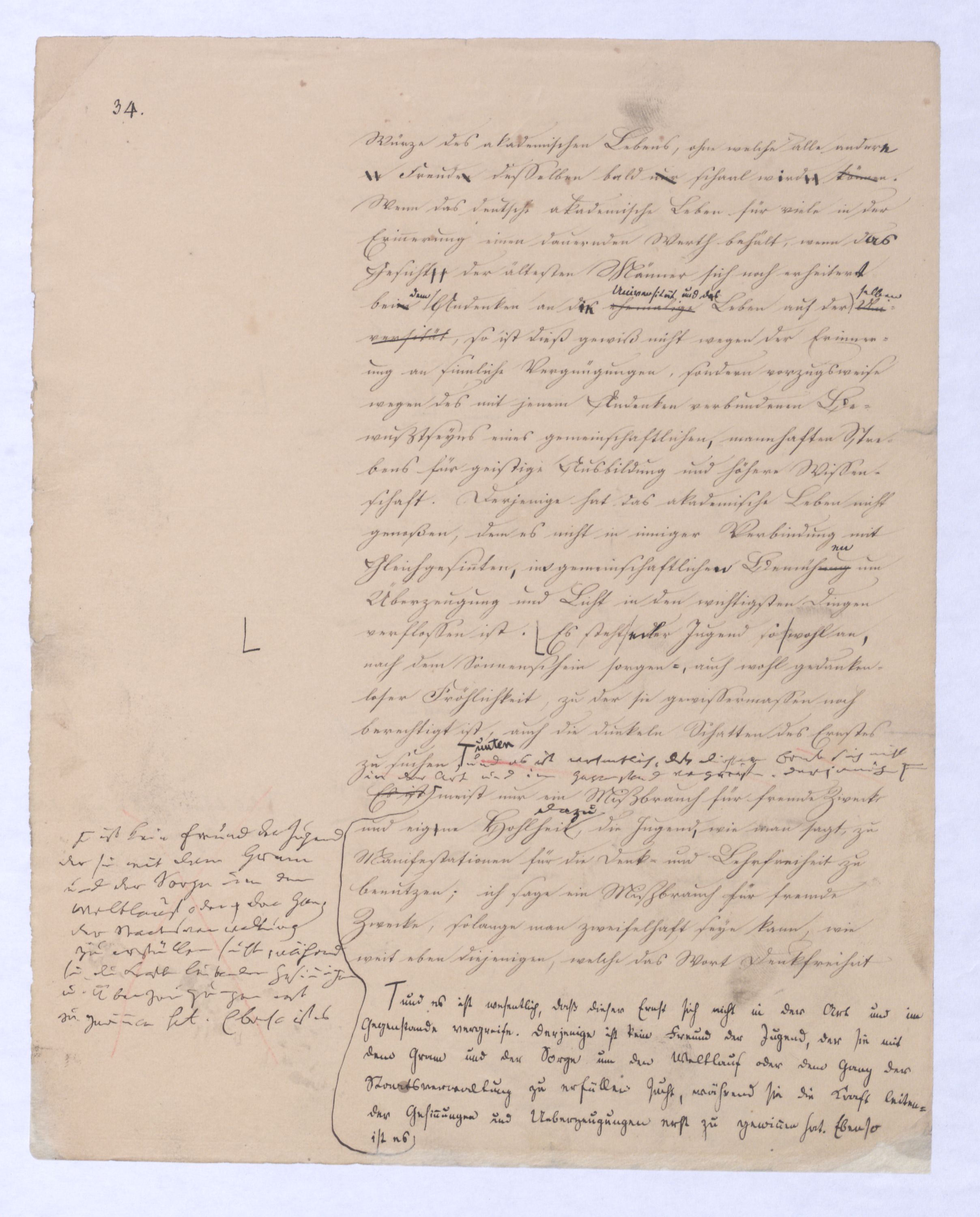 . Der Jugend ziemt es für das Rechte, was sie dafür erkannt hat zu stehen, denn das größte Talent selbst wird erst durch den Charakter geadelt; dieser aber bildet sich erst im Kampfe und Gegenkampfe bei übrigens gemeinschaftlichem Streben nach einem Ziele. Diese Wechselerregung und Wechsel-Begeisterung für die Wissenschaft erst ist die wahre Würze des akademischen Lebens, ohne welche alle anderen Freuden desselben bald nur schaal werden können. Wenn das deutsche akademische Leben für viele in der Erinnerung einen dauernden Werth behält, wenn die Gesichter der ältesten Männer sich noch erheitern beim Andenken an das ehemalige Leben auf der Universität, so ist dieß gewiß nicht wegen der Erinnerung an sinnliche Vergnügungen, sondern vorzugsweise wegen des mit jenem Andenken verbundenen Bewußtseyns eines gemeinschaftlichen mannhaften Strebens für geistige Ausbildung und höhere Wissenschaft. Derjenige hat das akademische Leben nicht genoßen, dem es nicht in inniger Verbindung mit Gleichgesinnten in gemeinschaftlicher Bemühung um Überzeugung und Licht in den wichtigsten Dingen verflossen ist. Es steht der Jugend so wohl an nach dem Sonnenschein sorgen-, auch wohl gedankenloser Fröhlichkeit, zu der sie gewissermassen noch berechtigt ist, auch die dunkeln Schatten des Ernstes zu suchen. Es ist, und es ist wesentlich, daß dieser Ernst sich nicht in der Art und im Gegenstand vergreife. Derjenige ist kein Freund der Jugend der sie mit dem Gram und der Sorge um den Weltlauf oder ¿ dem Gang der Staatsverwaltung zu erfüllen sucht, während sie die Kraft leitender Gesinnungen u. Überzeugungen erst zu gewinnen hat. Ebenso ist es meist nur ein Mißbrauch für fremde Zwecke und eigene Hohlheit dazu, die Jugend wie man sagt, zu Manifestationen für die Denk- und Lehrfreiheit zu benutzen, ich sage ein Mißbrauch für fremde Zwecke, solange man zweifelhaft seyn kann, wie weit eben diejenigen, welche das Wort Denkfreiheit im Munde führen, selbst die Denkfreiheit zuzugeben gesonnen sind, die sie so oft doch vorzüglich nur für ihre eigene zufällige Meinung in Anspruch nehmen, während sie andere entgegengesetzte Abnsichten auf jede Weise, die eben in ihrer Gewalt steht, verfolgen und dazu sich ganz berechtigt halten und was die Lehrfreiheit betrifft, solange die, welche davon reden, es etwa ganz in der Ordnung finden, daß jemand z. B. sich von einer Kirche anstellen und ernähren läßt, deren Grundsätze er heimlich durch seine Vorträge zu untergraben sucht, oder solange sie demnachaber dennoch selbst keine unbeschränkte Lehrfreiheit zugeben, da sie z. B. einem Lehrer der Theologie in einer protestantischen Fakultät, der mit Geist und Feuer, wie es ja wohl möglich wäre, etwa die Nothwendigkeit eines sichtbaren Oberhauptes der Kirche, eines obersten und unfehlbaren Richters in Glaubenssachen und andere Grundsätze der römischen Kirche behaupten und aufstellen wollte, die Berufung auf Lehrfreiheit nicht gestatten würden. Daß das Denken und Forschen unbeschränkt, daß einedie Wissenschaft, daß auch wenigstens innerhalb der Schranken des Schicklichen und Anständigen das Lehren frei seihierfast nur die Absicht haben können, auf eine ungefährliche Weise zu verstehen zu geben, daß hier oder dort die Denk- oder Lehrfreiheit gefährdet sei, um auf diese Weise wohlfeilen Kaufes zum Ruhme besonderer Freimüthigkeit zu gelangen. Allerdings soll die Jugend für das unschätzbare und von den Deutschen theuer erkaufte Gut, – möge der Himmel und der gute Sinn unserer Fürsten geben, daß dieß Gut durch den ungeschickten Gebrauch nie verloren gehe – begeistert werden, aber gewiß nur, damit sie um so eifriger strebe, sich diejenige geistige und wissenschaftliche Tüchtigkeit zu erwerben, die nöthig ist, von dieser Freiheit einen würdigen Gebrauch zu machen, und dasjenige hervorzubringen, wegen wird eswenigstens nicht vollendsvöllig gleichgültig seyn. Denn wenn es je möglich wäre, daß eine Doctrin die Oberhand bekomme, nach welcher das Beste und Klügste, für den Menschen Übrigbleibende in Essen, Trinken u. d. gl. bestehe, eine Doctrin, nach welcher überhaupt aus den menschlichen Überzeugungen alles Metaphysische genommen wird, wenn es je möglich wäre –, daß eine solche aufkäme, was ich jedoch für so wenig möglich halte, als daß das Affengeschlecht über das der Menschen Herr würde, oder daß, wenn die Menschen für immer von der Oberfläche der Erde verschwänden, und alsdann die Affen zu Herren der Welt würden – aber gesetzt, es könnte solche Lehre aufkommen, dann allerdings hätte der Staat nichts anderes zu thun, als mit stumpfer Resignation seinem Untergange gleichsam mit untergeschlagenen Armen zusehen. DieDer ganze BewegungBau menschlicher Dinge ist jenem Bilde vergleichbar, das der König von Babylon im Traume sah, dessen Haupt war von feinem Golde, seine Brust und Arme waren von Silber, sein Bauch und seine Lenden von Erz, seine Schenkel von Eisen, seine Füße eines Theils von Eisen, andern Theils von Thon; da aber die Füße zermalmt wurden, die Eisen und Thon waren, so wurden miteinander zermalmt das Eisen, Thon, Erz, Silber, Gold, und wurden wie Spreu auf der Sommertenne, und der Wind verwehte sie, daß man sie nirgends mehr finden konnte