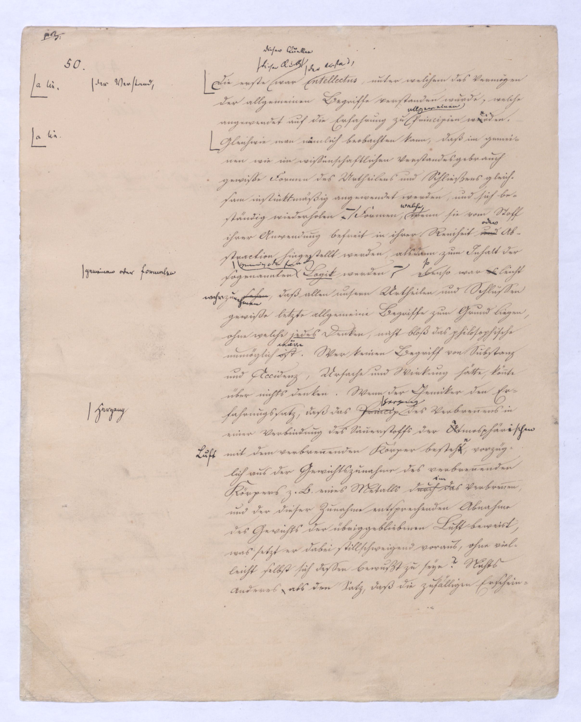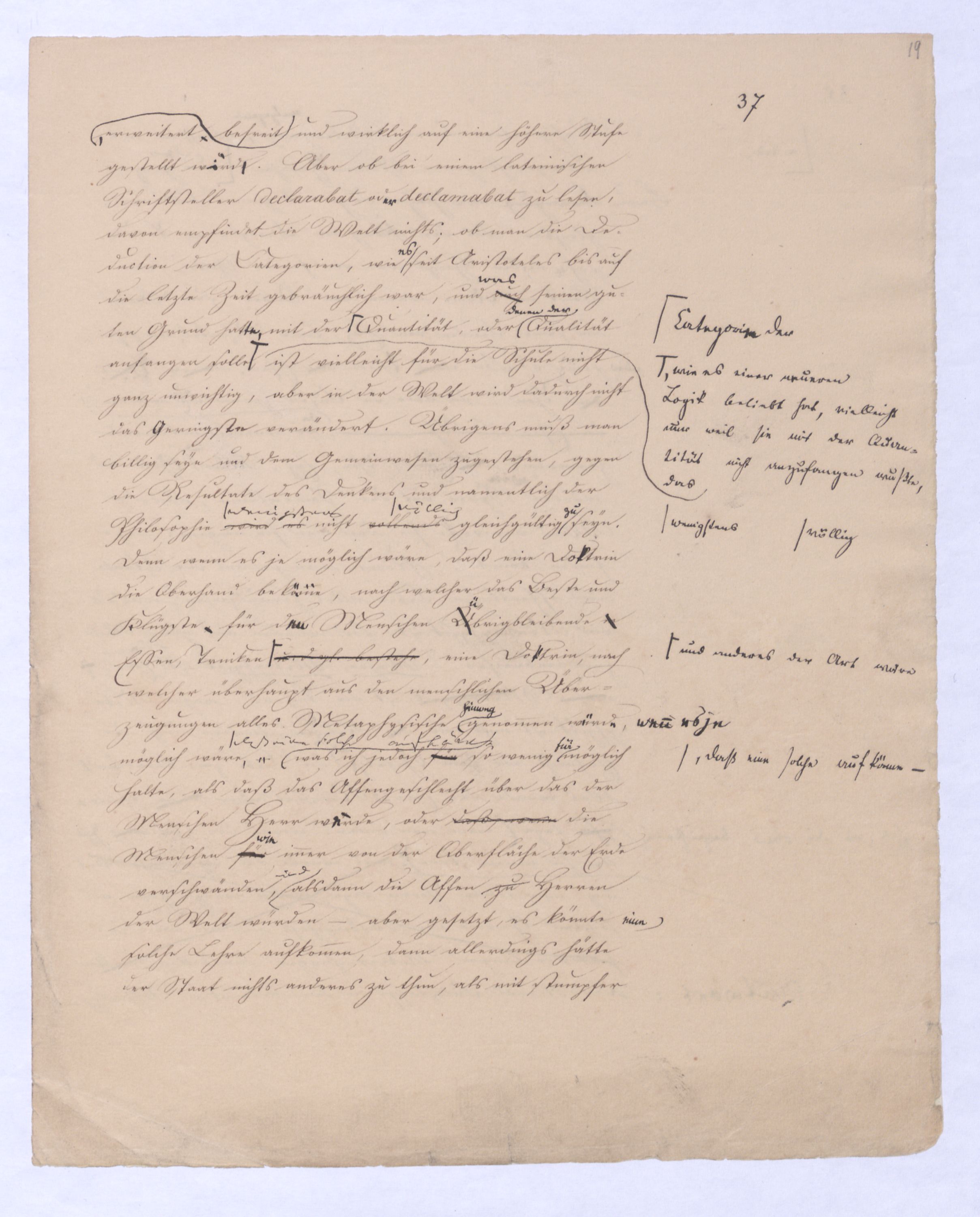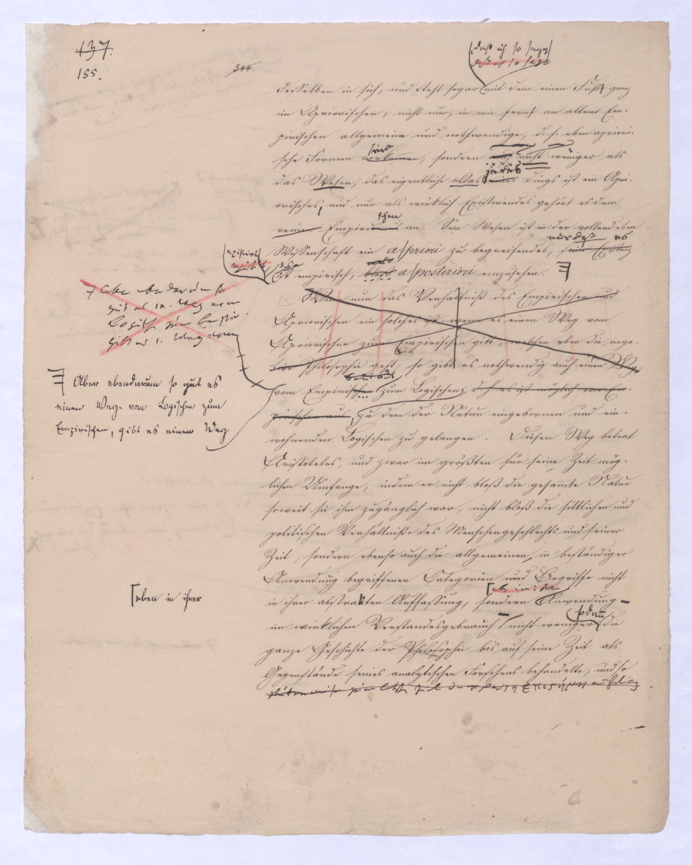 In wiefern nun Kant den allgemeinen Verstandesbegriffen wirklich eine von der Erkenntniß unabhängige ihr vorausgehende Wurzel schon im bloßen Erkenntnißvermögen anweist, hat er eben damit allerdings den bloß aprioristiposteriorischen Ursprung dieser Begriffe, wie ihnden Locke, Hume und die ganze sensualistische Schule, die aus diesen beiden hervorgegangen waren, behauptetenihnen zuschrieb, aus der bloßen Erfahrung, und also auch dieser Begriffe bloße Erfahrungsbedeutung beseitigtbeseitigt, aber nicht ohne daß er diese Formensie zugleich zu bloß subjectiven Formen des Erkenntnißvermögens herabsetzte, nemlich sie sind objective Formen allerdings, in wie fern durch sie das Object dem Denken und Erkennen erst entsteht, aber an sich und in ihrer Wurzel sind sie bloß subjectiv dem Erkenntnißvermögen angehörig, Formen, darin zwardenen zwar in in den GegenständenObjecten, sofern sie Gegenstände derunserer Erfahrung sind, etwas entspricht, nicht aber in den Gegenständen an sich, und unabhängig von der Erfahrung. VielmehrAber wenn wir nothw.endige allg., dem Erk.vermögen vorausinwohnende Begr. annehmen, wo durch deren Anwendung uns erst der bloße Sinneneindruck zu wirkl. Erfahrung, zu obj. Erkenntniß erhebt, so sind die Dinge selbst, welche in der wirklen Erfahrung vorkommen, sind nun nach dieser Theorie aus zwei Elementen gefordertzusammengesetzt. Wir müssen in jedem Dinge die Bestimmungen des Erkenntnißvermögens unterscheiden, die allgemeinste Bestimmung ist wohl die, daß es eben ein Ding, Gegenstand, d. h. überhaupt ein Seyendes Wirkliches sei. Eineist, eine nähere Bestimmung, die es bloß durch das Erkenntnißvermögen nach Kant erfährt, ist daß es im Raum und in der Zeit sei. Auch diese Bestimmung schreibt sich ja nach ihmKant zwar nicht von dem Verstande, aber doch vom Erkenntnißvermögen her. Und dann ferner, daß der Gegenstand Substanz oder Accidenz, Ursache oder Wirkung ist, auch dieß ist eine Bestimmung, die im Gegenstande unserer Erkenntnißfahrung bloß vermöge des Erkenntnißvermögens ist.