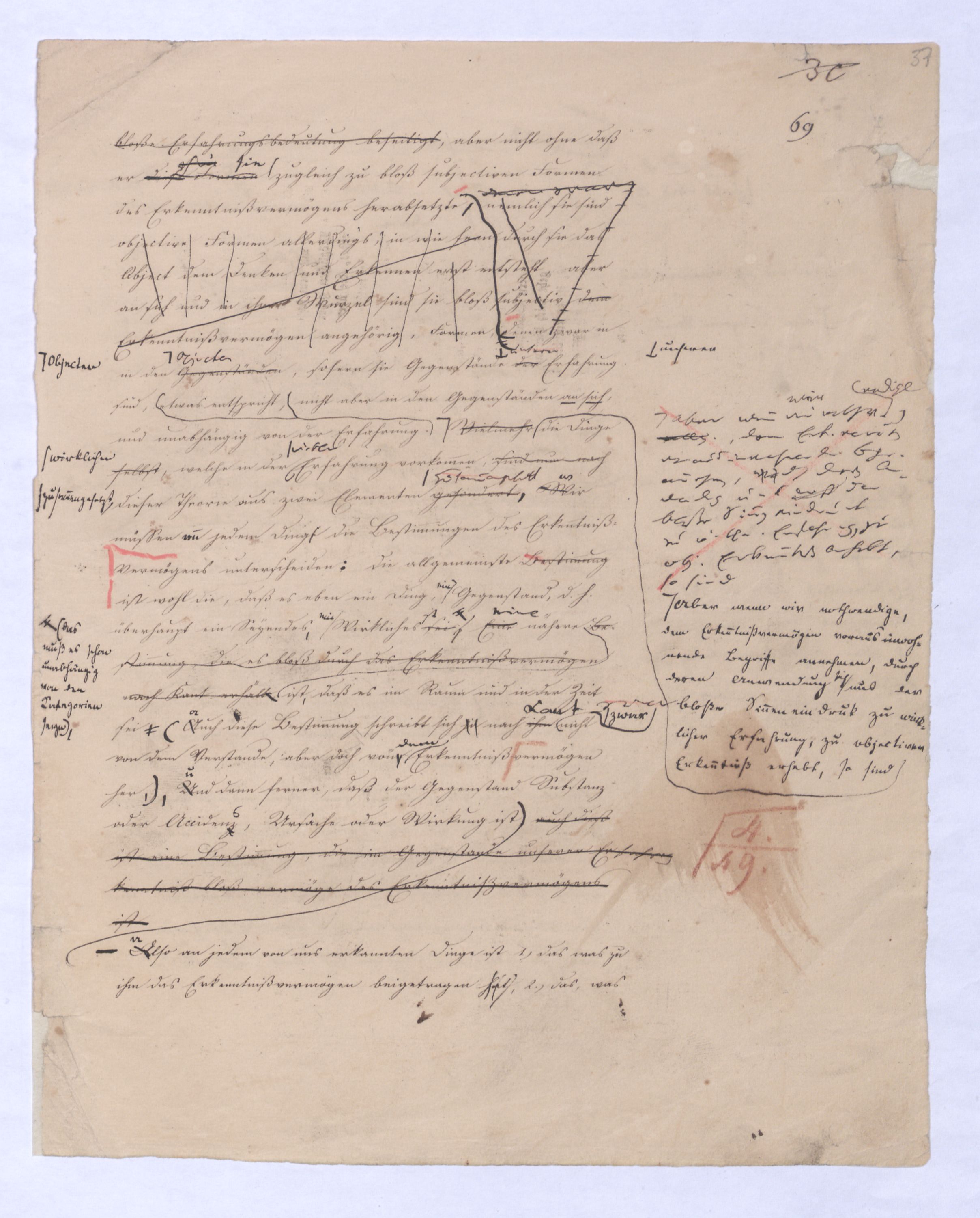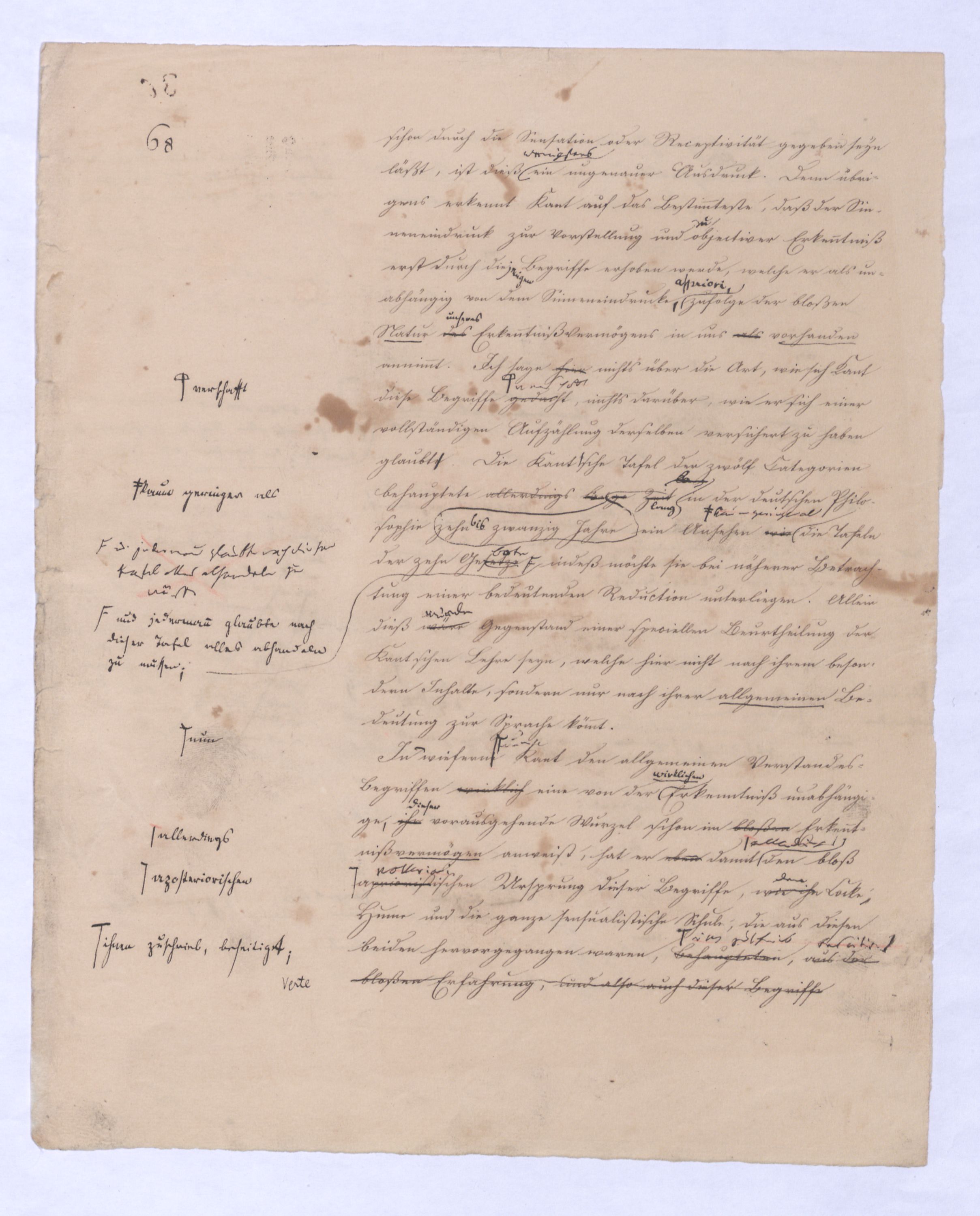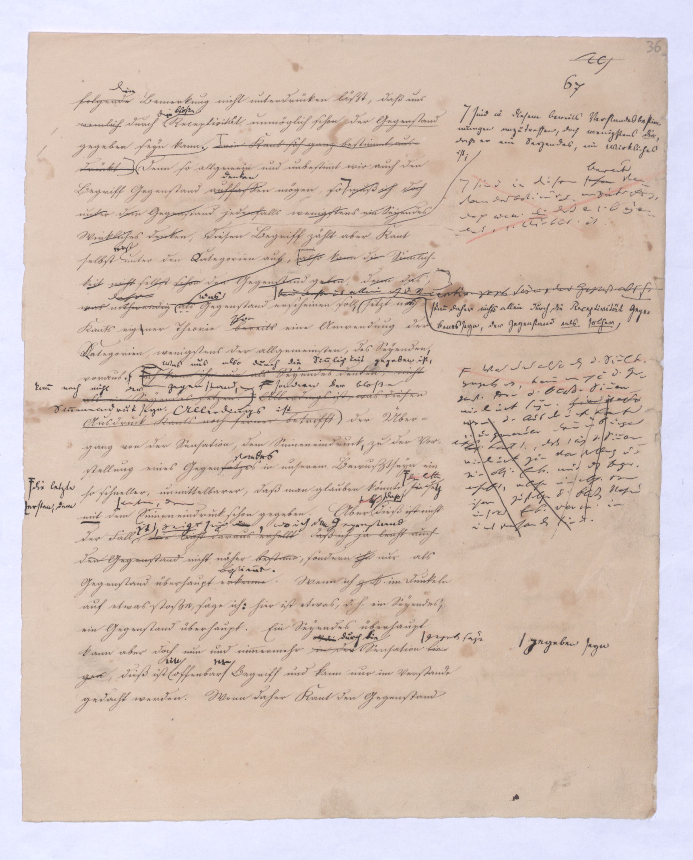 In wiefern nun Kant den allgemeinen Verstandesbegriffen wirklich eine von der Erkenntniß unabhängige ihr vorausgehende Wurzel schon im bloßen Erkenntnißvermögen anweist, hat er eben damit allerdings den bloß aprioristiposteriorischen Ursprung dieser Begriffe, wie ihnden Locke, Hume und die ganze sensualistische Schule, die aus diesen beiden hervorgegangen waren, behauptetenihnen zuschrieb, aus der bloßen Erfahrung, und also auch dieser Begriffe bloße Erfahrungsbedeutung beseitigtbeseitigt, aber nicht ohne daß er diese Formensie zugleich zu bloß subjectiven Formen des Erkenntnißvermögens herabsetzte, nemlich sie sind objective Formen allerdings, in wie fern durch sie das Object dem Denken und Erkennen erst entsteht, aber an sich und in ihrer Wurzel sind sie bloß subjectiv dem Erkenntnißvermögen angehörig, Formen, darin zwardenen zwar in in den GegenständenObjecten, sofern sie Gegenstände derunserer Erfahrung sind, etwas entspricht, nicht aber in den Gegenständen an sich, und unabhängig von der Erfahrung. VielmehrAber wenn wir nothw.endige allg., dem Erk.vermögen vorausinwohnende Begr. annehmen, wo durch deren Anwendung uns erst der bloße Sinneneindruck zu wirkl. Erfahrung, zu obj. Erkenntniß erhebt, so sind die Dinge selbst, welche in der wirklen Erfahrung vorkommen, sind nun nach dieser Theorie aus zwei Elementen gefordertzusammengesetzt. Wir müssen in jedem Dinge die Bestimmungen des Erkenntnißvermögens unterscheiden, die allgemeinste Bestimmung ist wohl die, daß es eben ein Ding, Gegenstand, d. h. überhaupt ein Seyendes Wirkliches sei. Eineist, eine nähere Bestimmung, die es bloß durch das Erkenntnißvermögen nach Kant erfährt, ist daß es im Raum und in der Zeit sei. Auch diese Bestimmung schreibt sich ja nach ihmKant zwar nicht von dem Verstande, aber doch vom Erkenntnißvermögen her. Und dann ferner, daß der Gegenstand Substanz oder Accidenz, Ursache oder Wirkung ist, auch dieß ist eine Bestimmung, die im Gegenstande unserer Erkenntnißfahrung bloß vermöge des Erkenntnißvermögens ist.