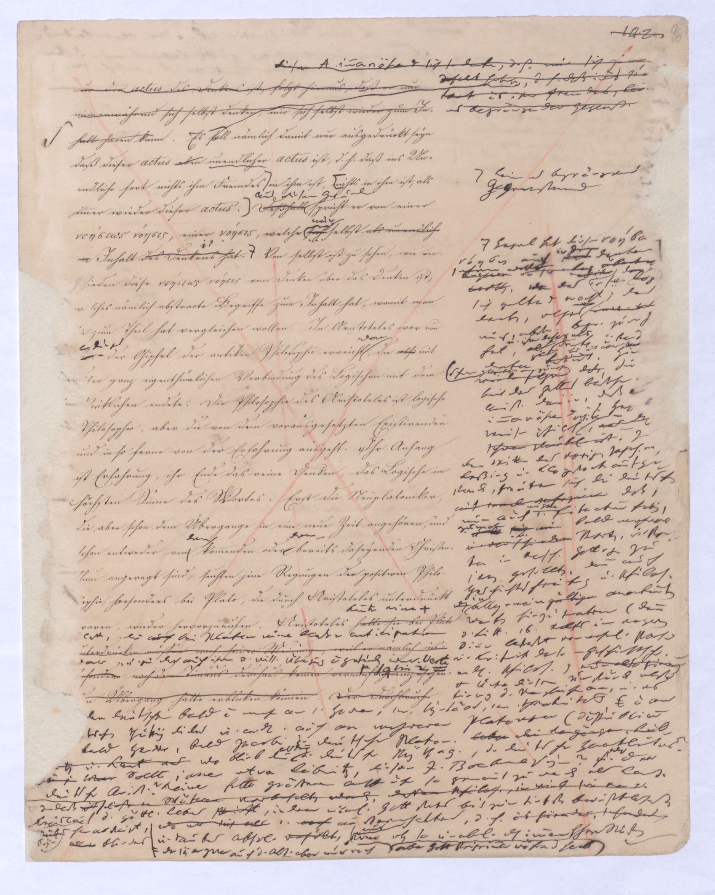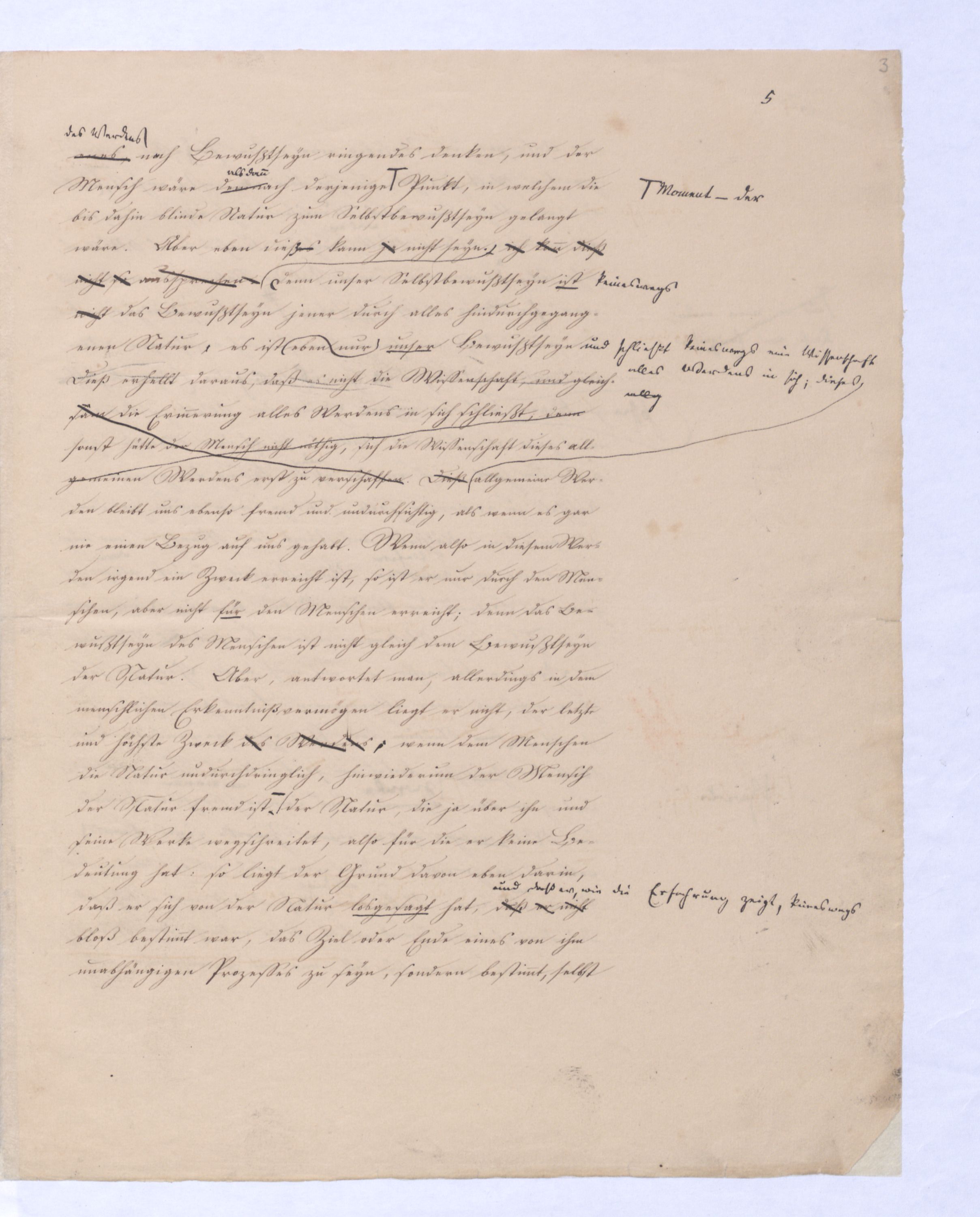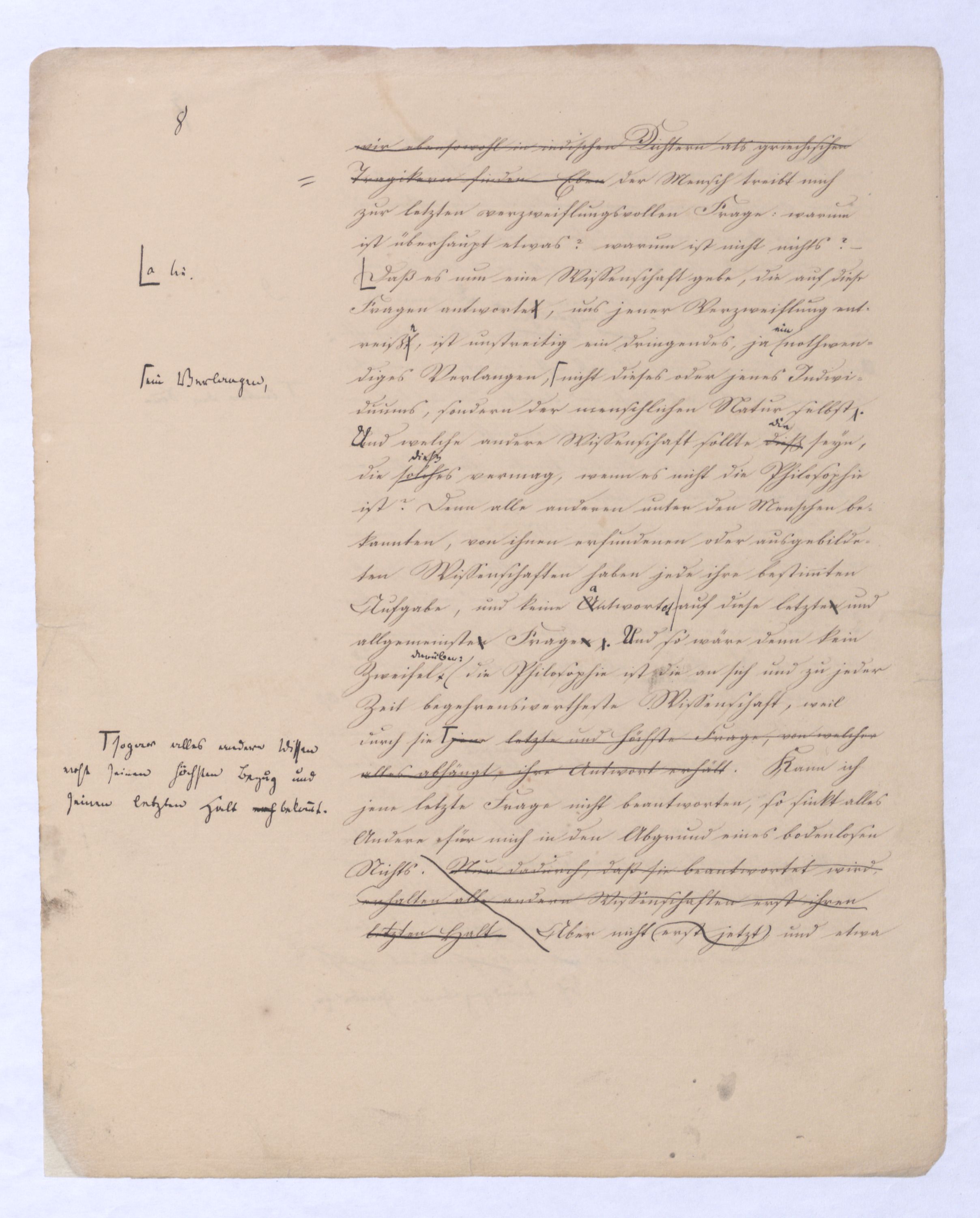 Wir wollen von diesem Argum. nur d. Obersatz betrachtenbeleuchten – – Nur d. Mensch weiß von G., d. Thier weiß nicht von G. Der Deutsche hat ein Sprichwort: Was ich nicht weiß, macht mich nicht heiß, d. h. es bewegt mich weder für noch gegen sich, weder es zu bejahen noch es zu verneinen. Entweder ist nur in dem ersten Glied des Obersatzes (»Nur d. Mensch weiß von Gott«) ein solches, indifferentes Wissen, ein Wissen, das für sich noch weder Bejahung noch Vern. erschließtist, sondern beides zuläßt – entw., sage ich, ist in dem Obersatz ein solches Wissen gemeint, so kann nach d. Regel daß in d. Conclus. nicht mehr seyn darf als in den Praemissen in dem Schluß die V. nicht d. Gott Offenb., d. h., wie d. Absicht d. Schlusses zeigt, d. Gott Bejahende seyn. Um dieß zu vermeiden, müßte also imder O.satz (Nur der Mensch ¿sn Wissen gemeint seyn. Nimmt man nun aber dieses an, so ist dann im O.satz d. Wort Wissen in zweierlei Sinn gebraucht. Denn: der Mensch weiß von Gott, heißt: d. Mensch bejaht Gott, d. Thier weiß nicht v. Gott, heißt: d. Thier bejaht weder noch verneint es Gott. Diese Doppelsinnigk. ist also wieder ein Fehler gegen die Form. Außerdem waere alsdann d. erste Theil des O.satzes falsch. Denn d. Wissen oder d. Bejahen Gs. soll d. generische Charakter d. Menschen, wie die V. seyn. Dieser aAllgemeinen Ahn.heit widerspricht aber, daß es nach Jacobis eigner Beh. (alle Philos. führe nothw. auf Ath.